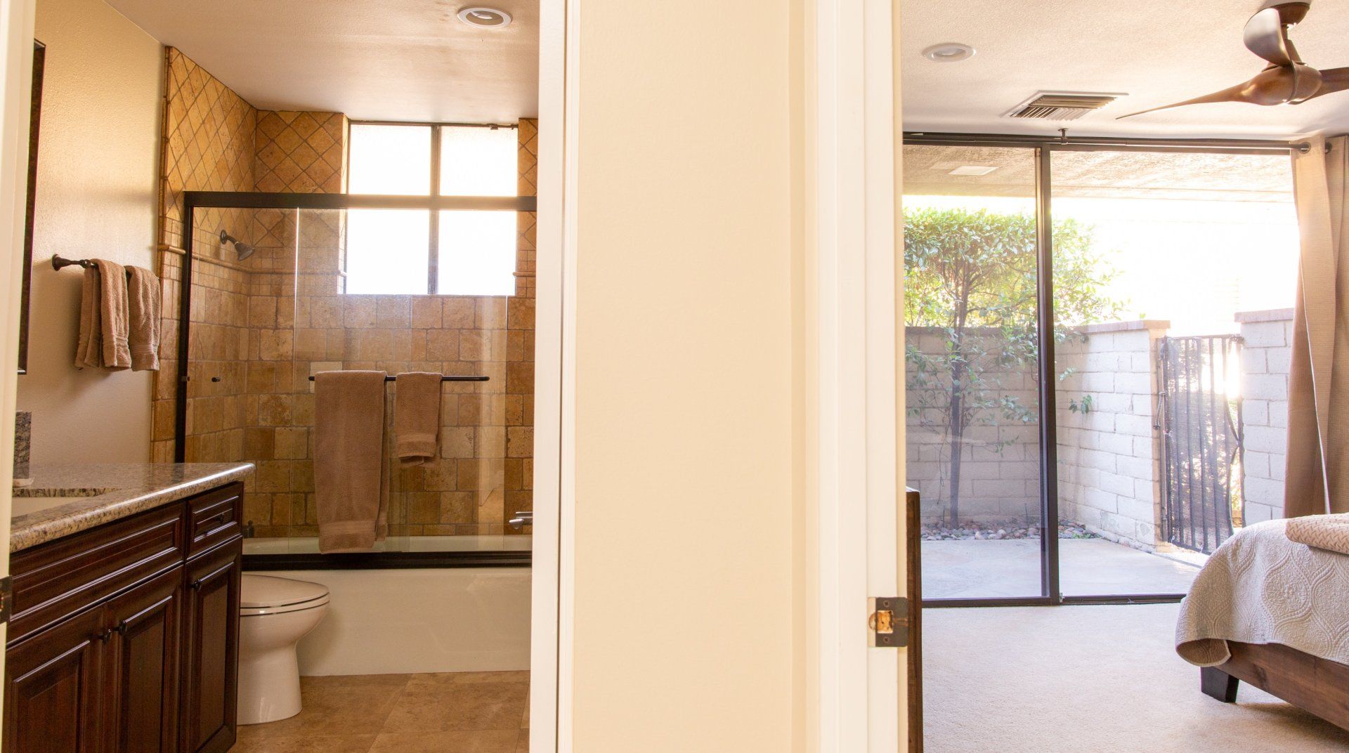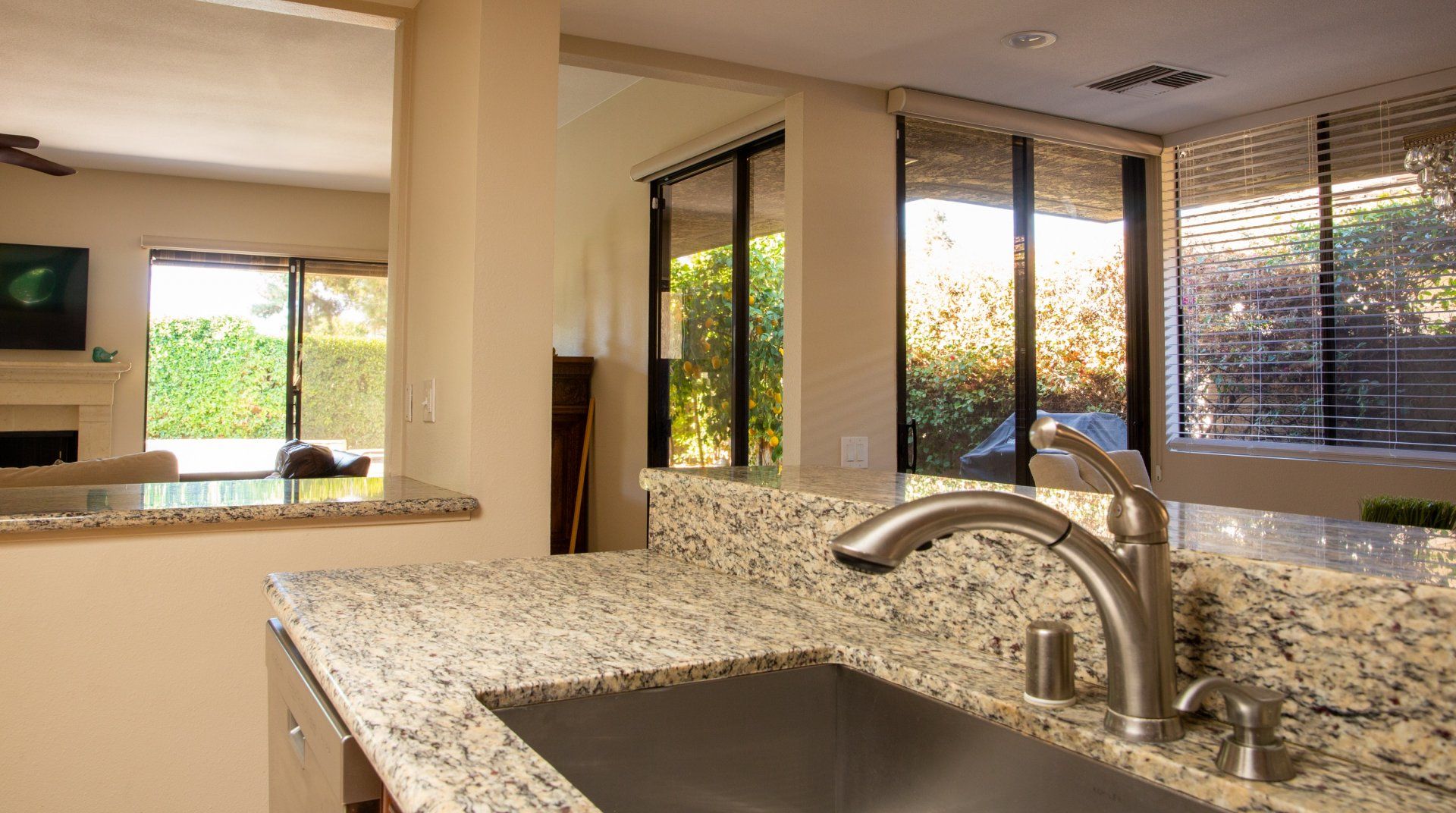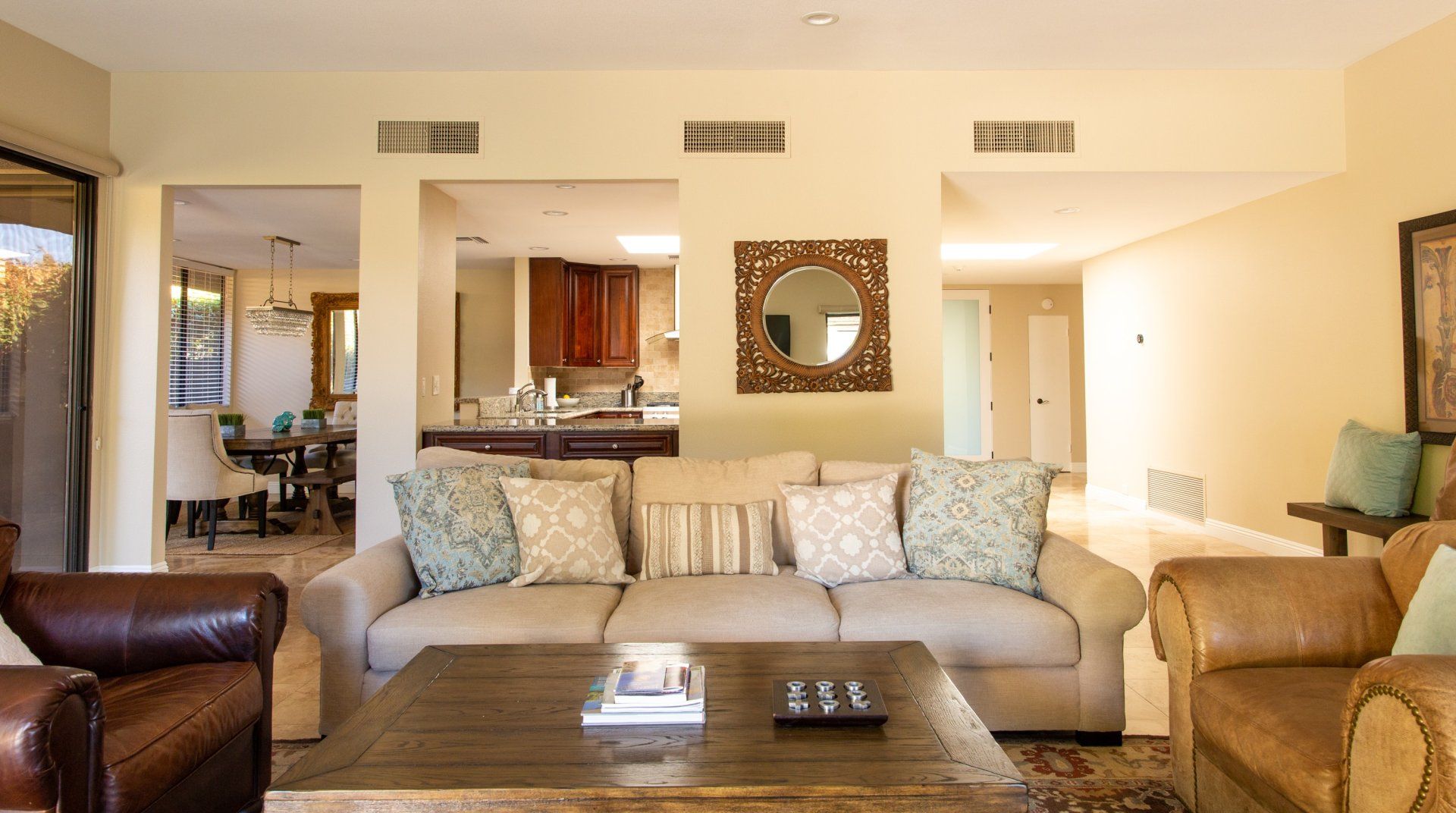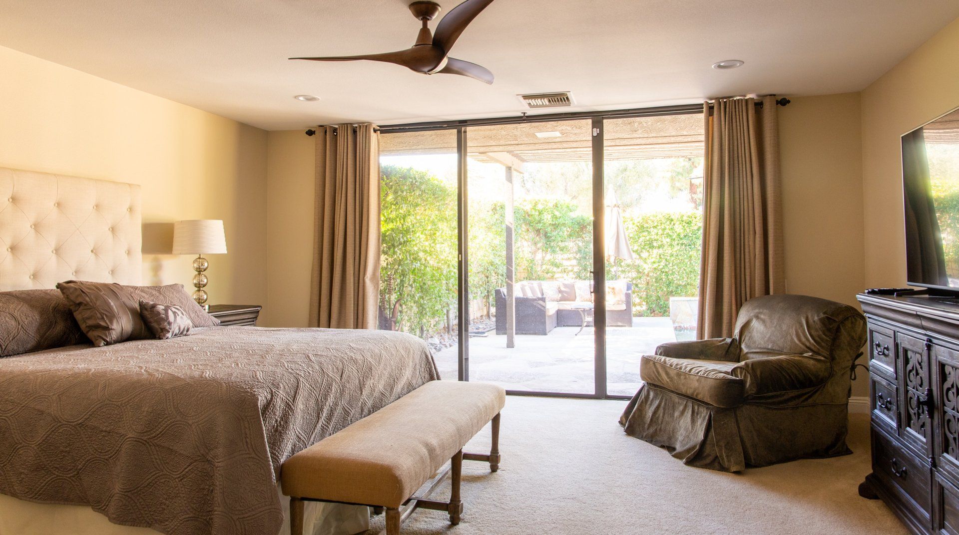 Located directly on the Springs golf course in Rancho Mirage, this three-bedroom home was professionally-decorated to suit all of your needs. A fully equipped kitchen, clever design and a fabulous, heated pool in the backyard make Outback Sunrise an excellent choice for an extended stay in the Coachella Valley. Offering an integrated hot tub, plenty of sun loungers, an outdoor dining table and lush landscaping, including citrus trees, we wouldn’t blame you if you spent the majority of your trip soaking up the sunshine in the garden. If you do want to head out though, you’re just a short way from plenty of restaurants and bars, and Joshua Tree National Park is just a forty-five-minute drive away, lending itself to a perfect day trip.
