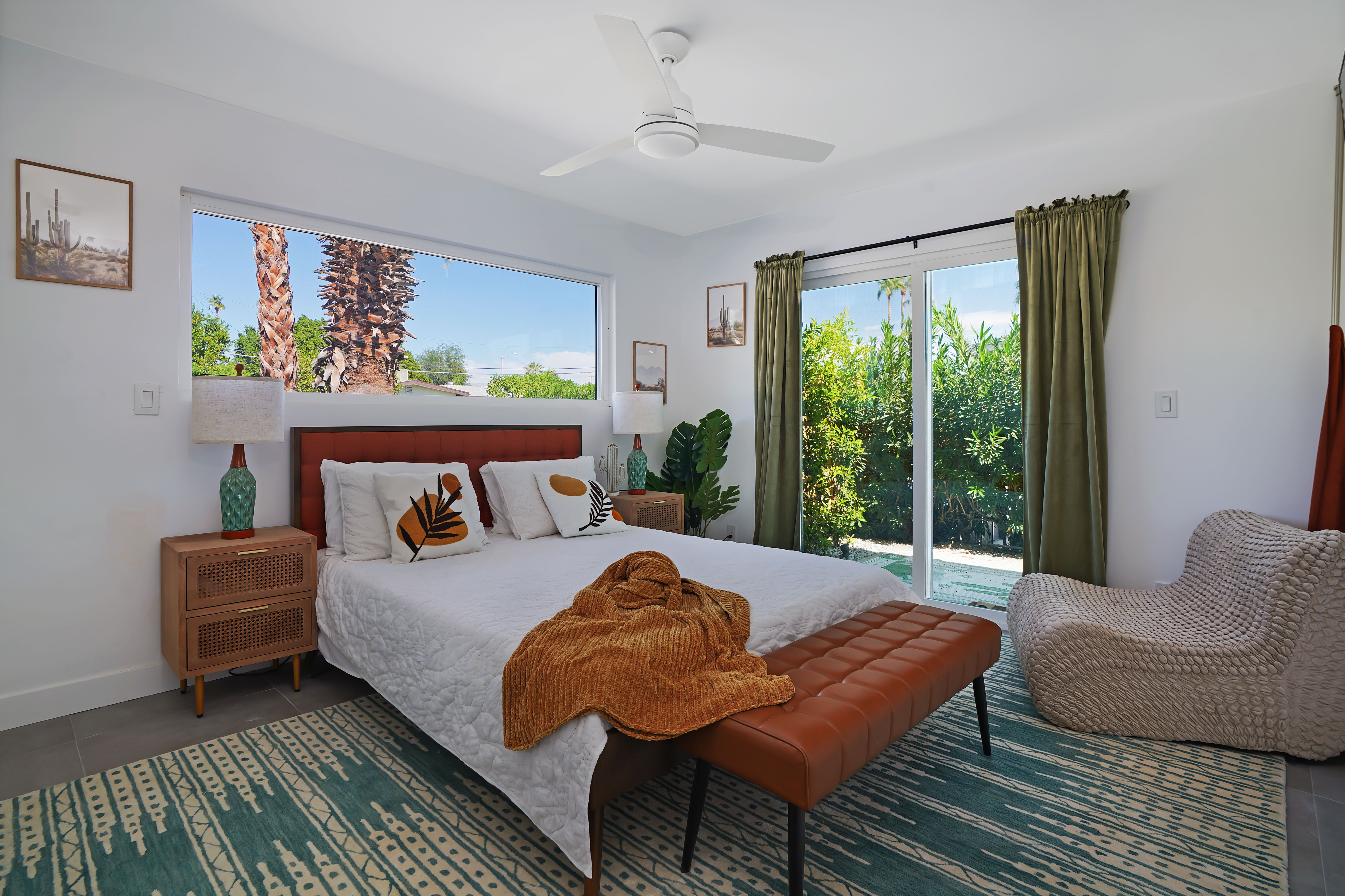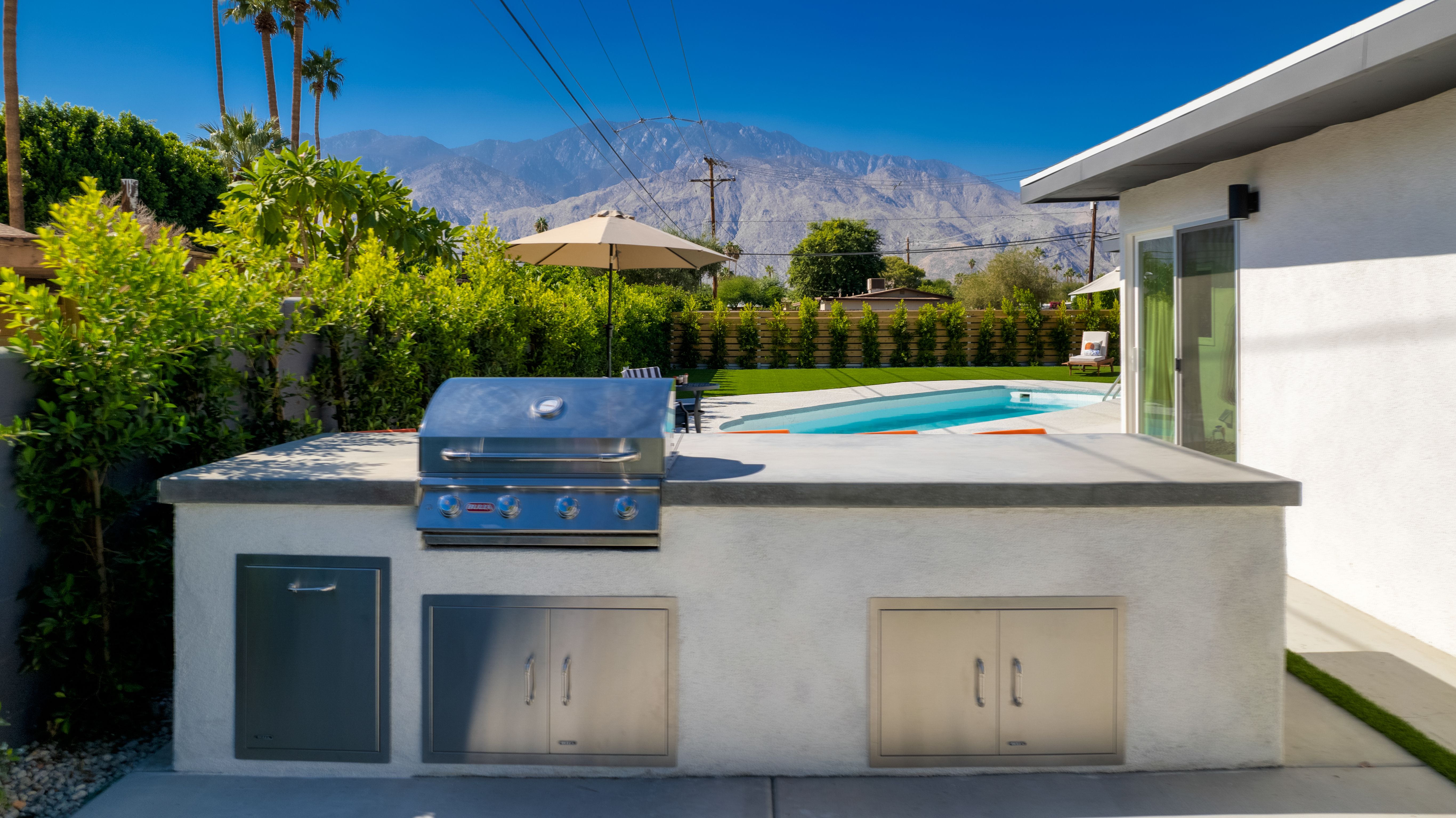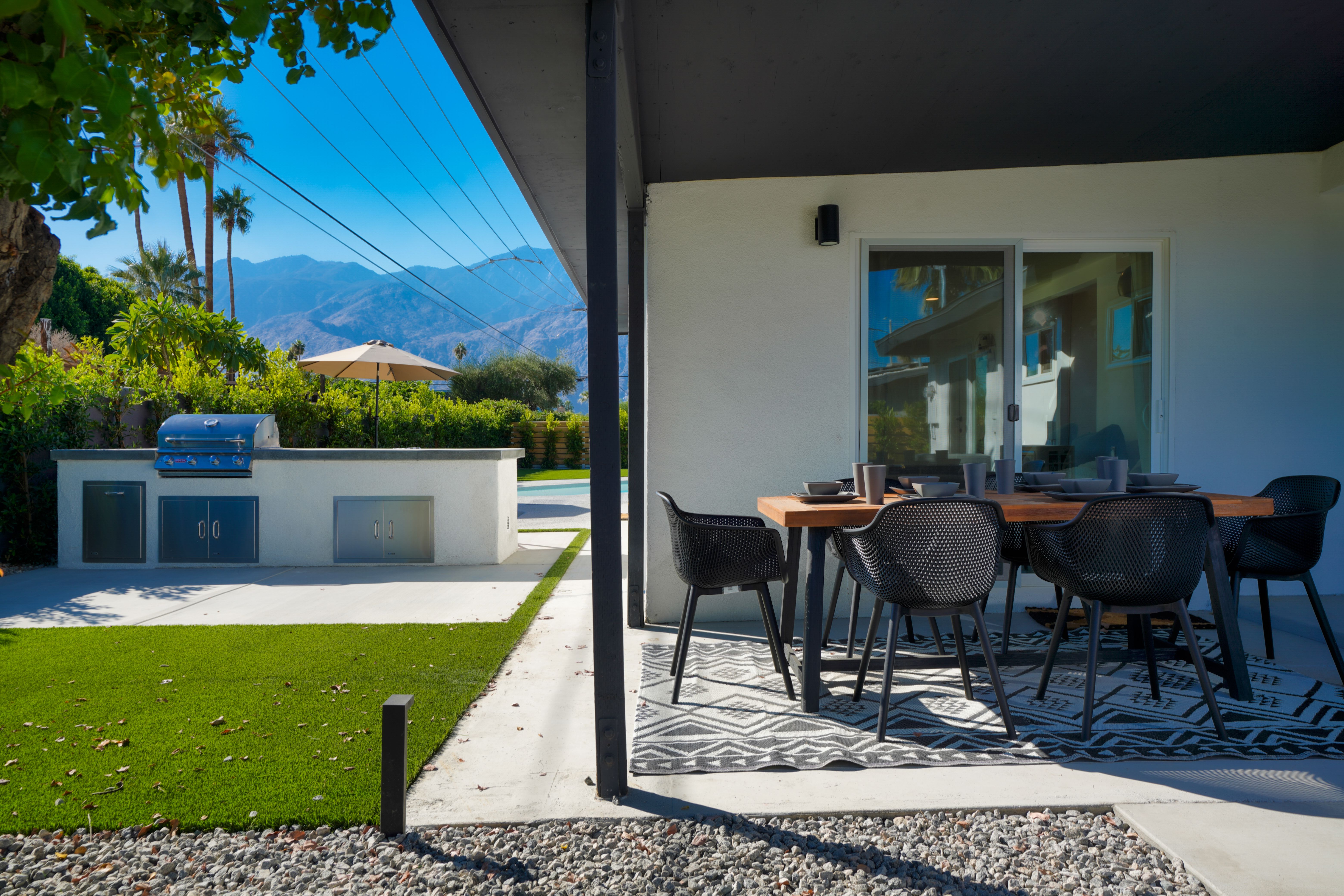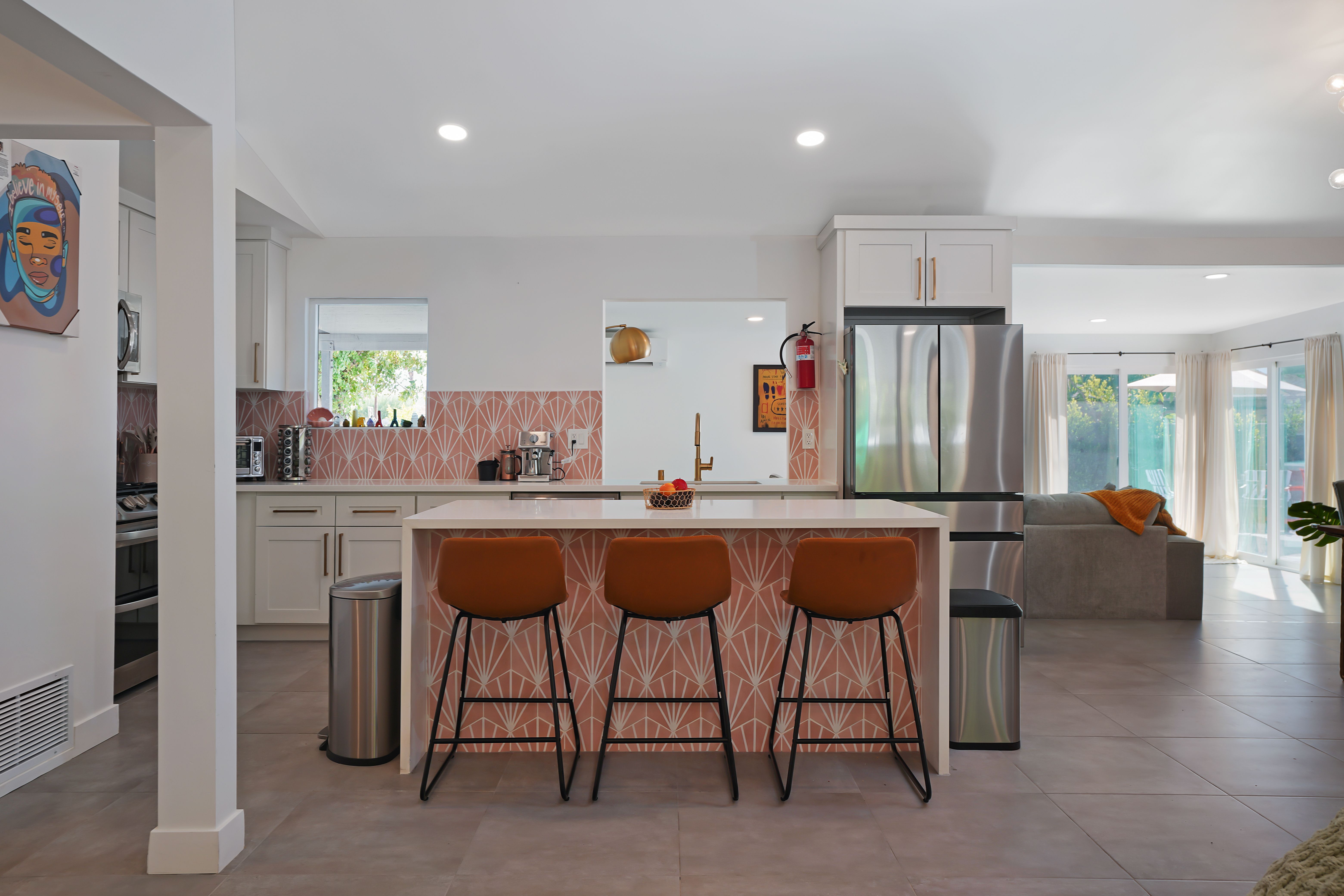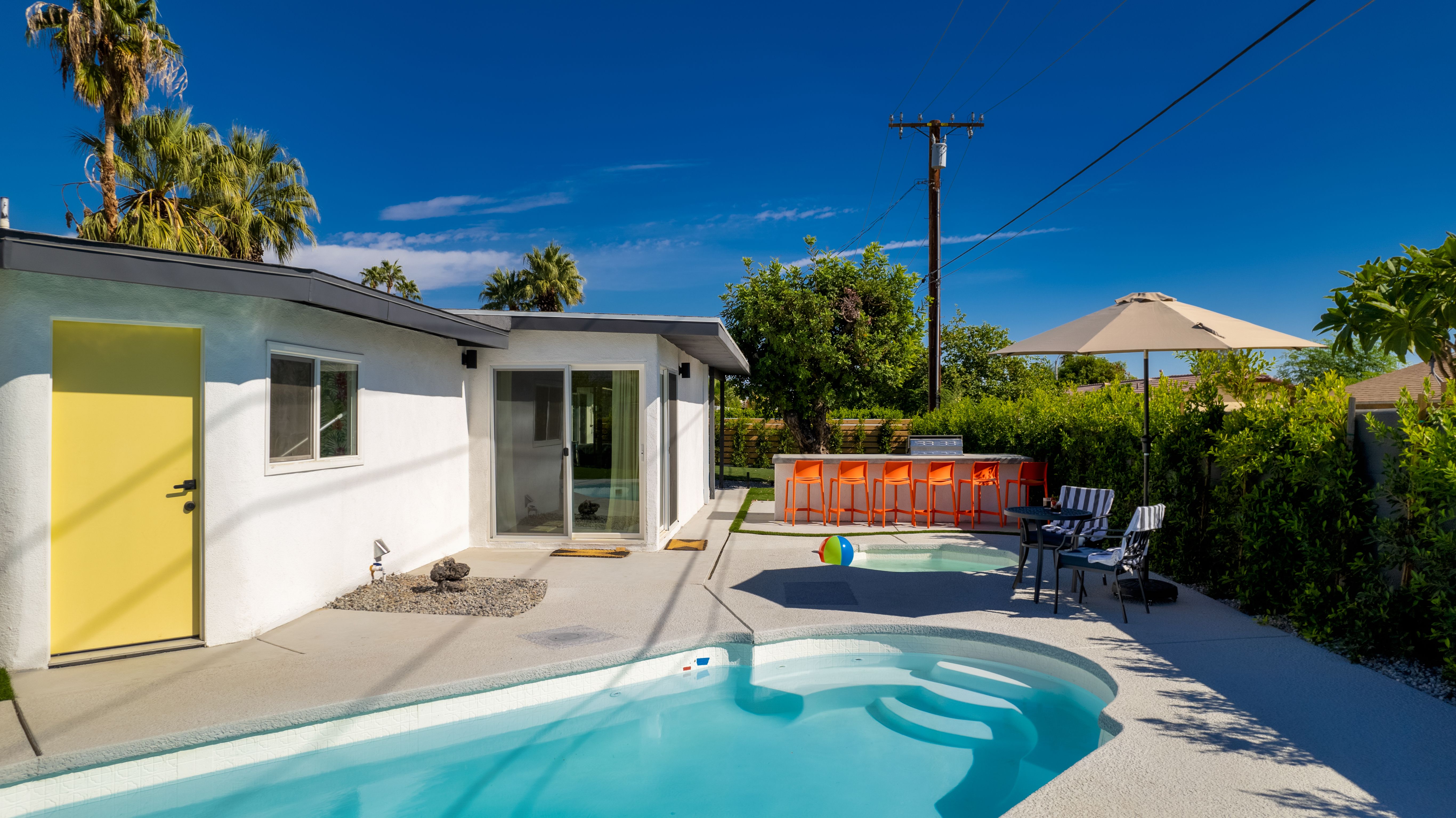 Nestled in the heart of the desert, this Palm Springs home boasts views of the surrounding mountains. The outdoor space is well set up for alfresco dining – there’s a built-in gas barbecue with bar-stool seating for casual bites as well as a dining table on the terrace – and you can cool off from the heat in the private pool. Inside, there’s plenty of space for everyone with two lounge areas to relax in and a sociable kitchen complete with breakfast bar. Location-wise, you’re just a short drive from downtown Palm Springs where you can catch some live music, grab a drink in one of the many bars, or enjoy a bite to eat.