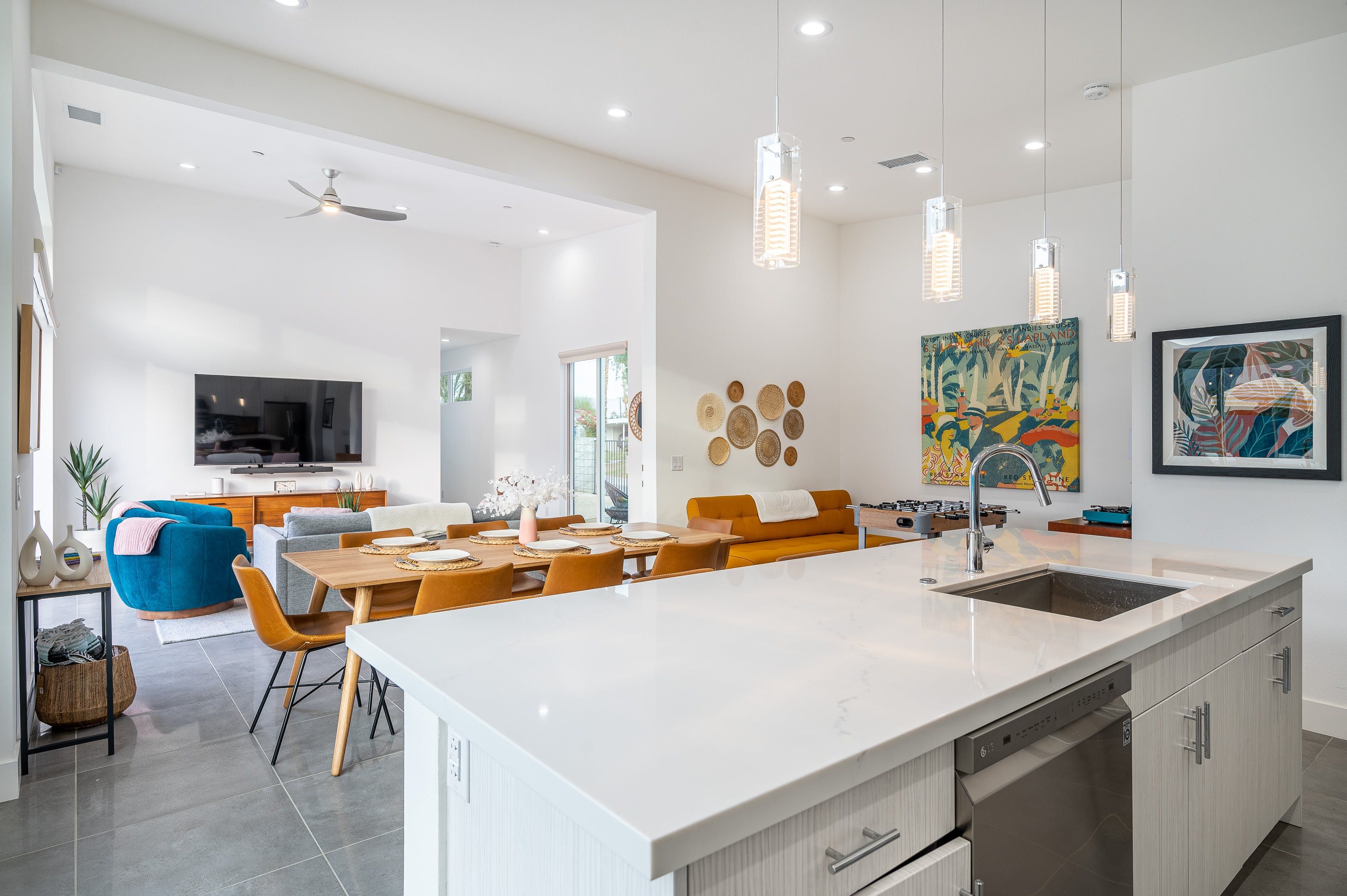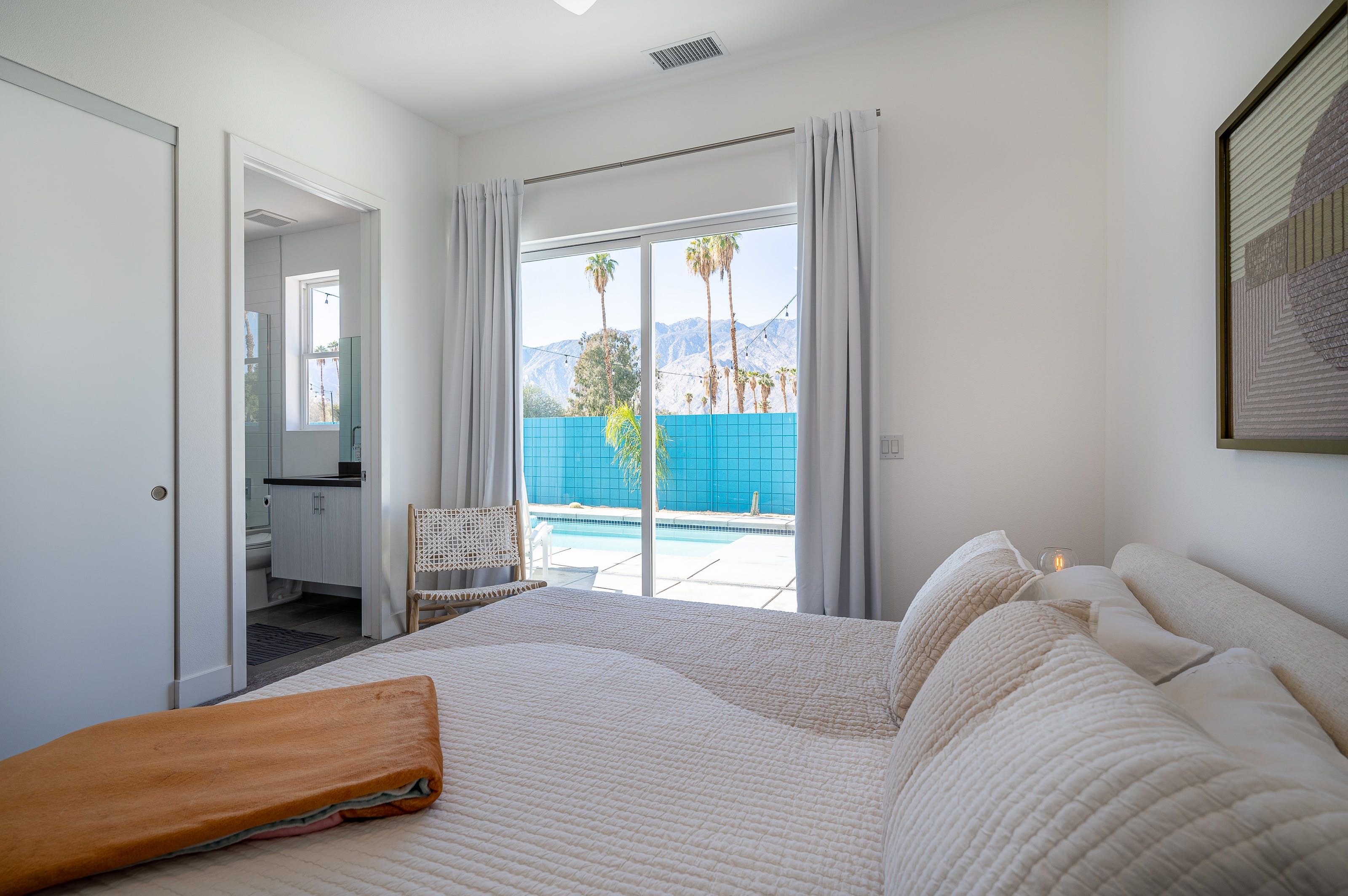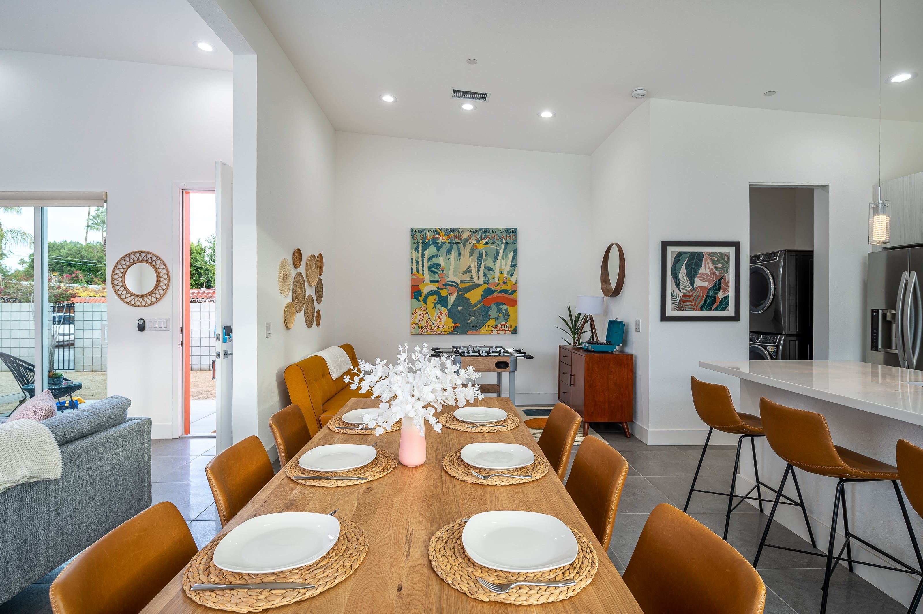 Revel in the mountain views from this stylish single-story home, complete with a private pool, spa, a fire pit, and space for alfresco dining. The home has three bedrooms and three full bathrooms with a sofa bed, making it perfect for couples with kids or a group of friends. Powered by Alexa, you'll be able to control the window shades, patio lights, music, and even the spa heat and jets with only your voice. Entertainment options abound with board games, a record player, cornhole, and a foosball table. The home is centrally located to all that Palm Springs has to offer including golf resorts, fantastic local restaurants, and art exhibits.