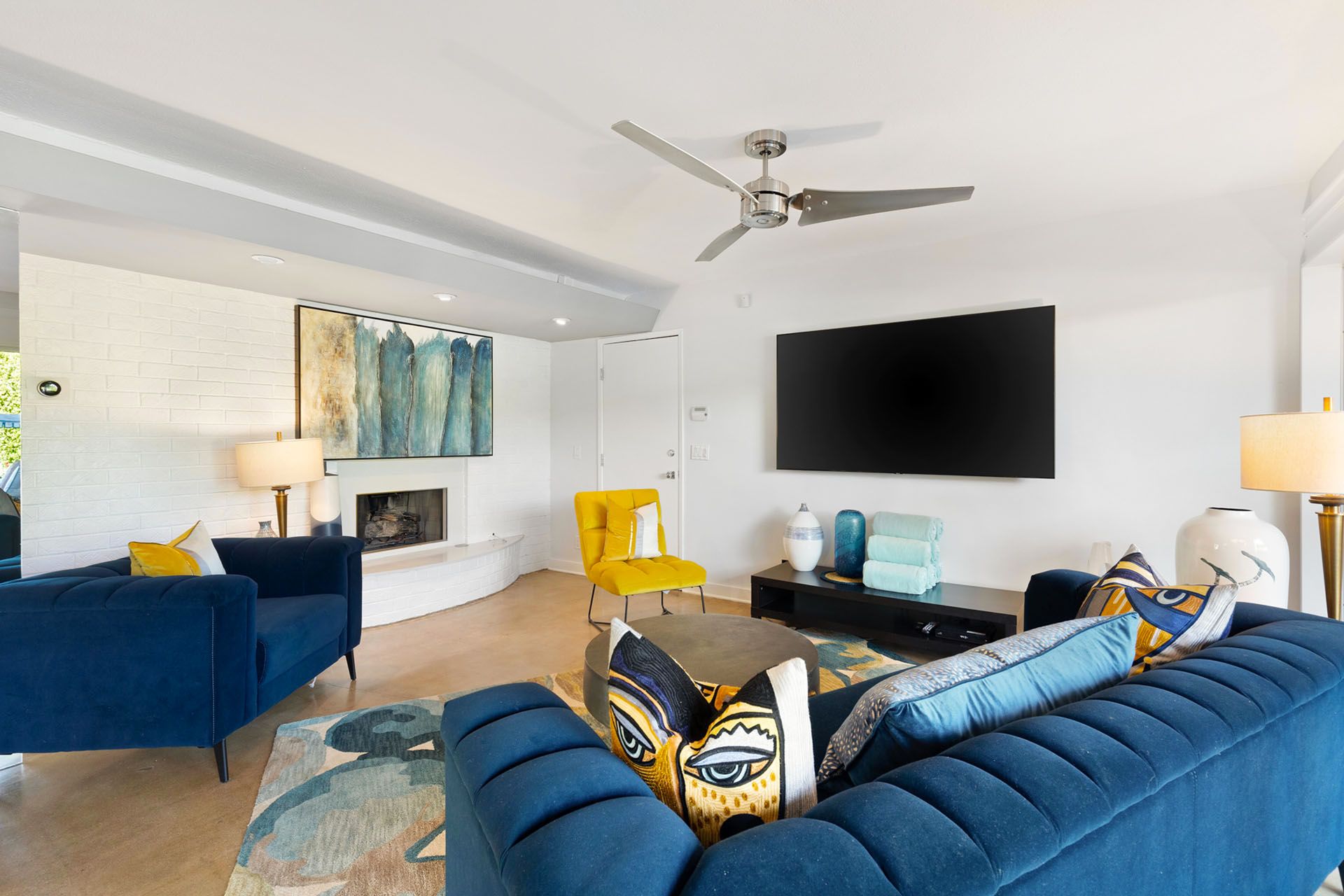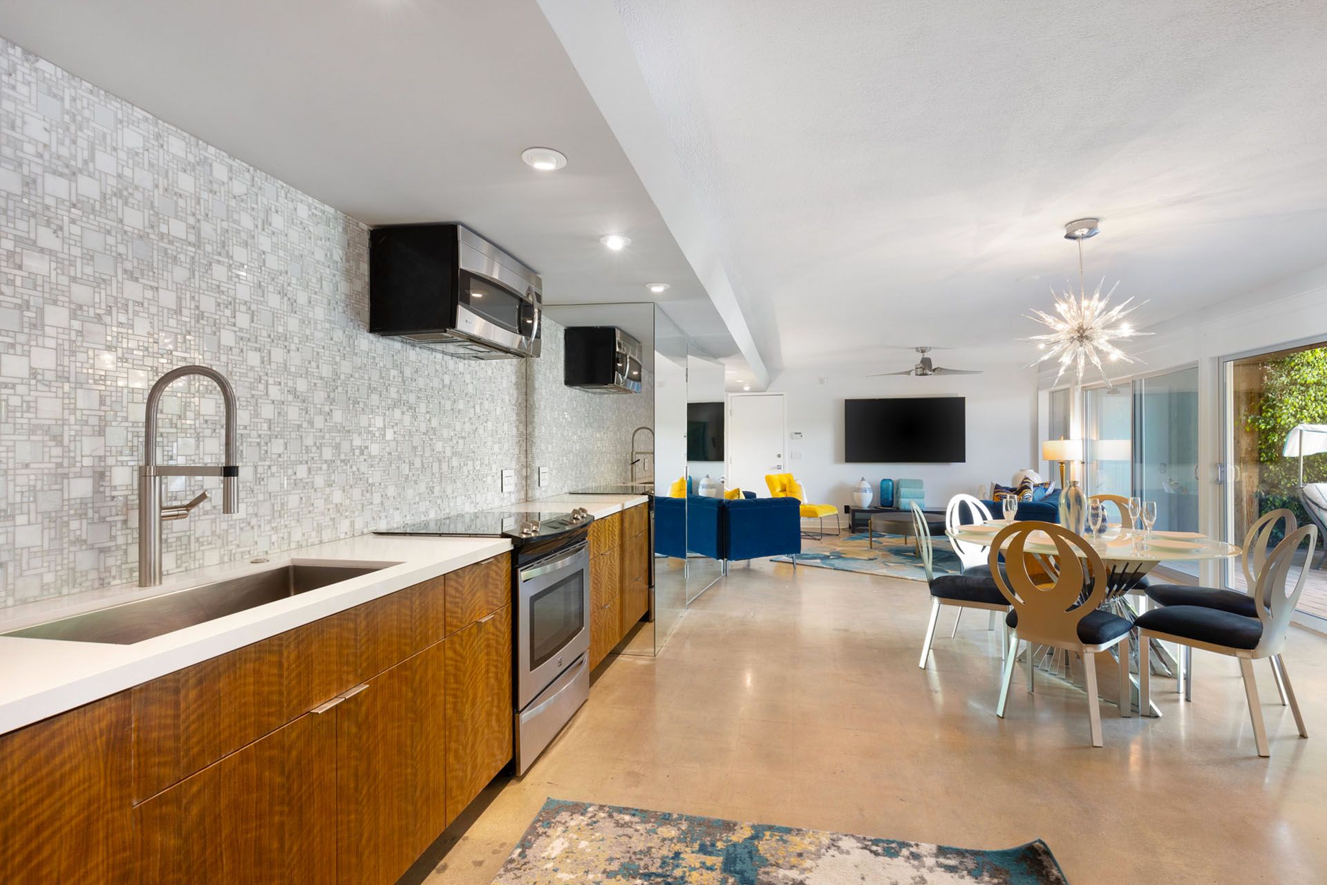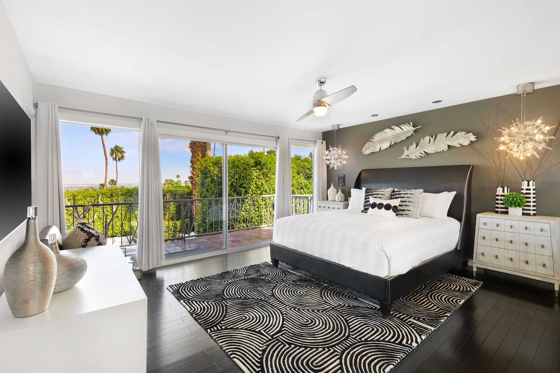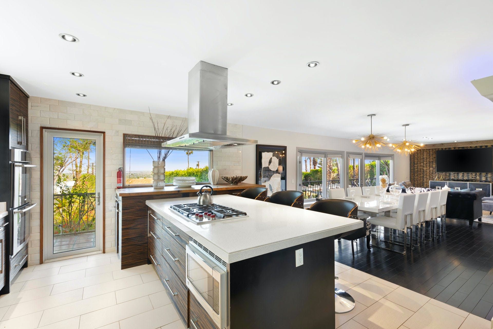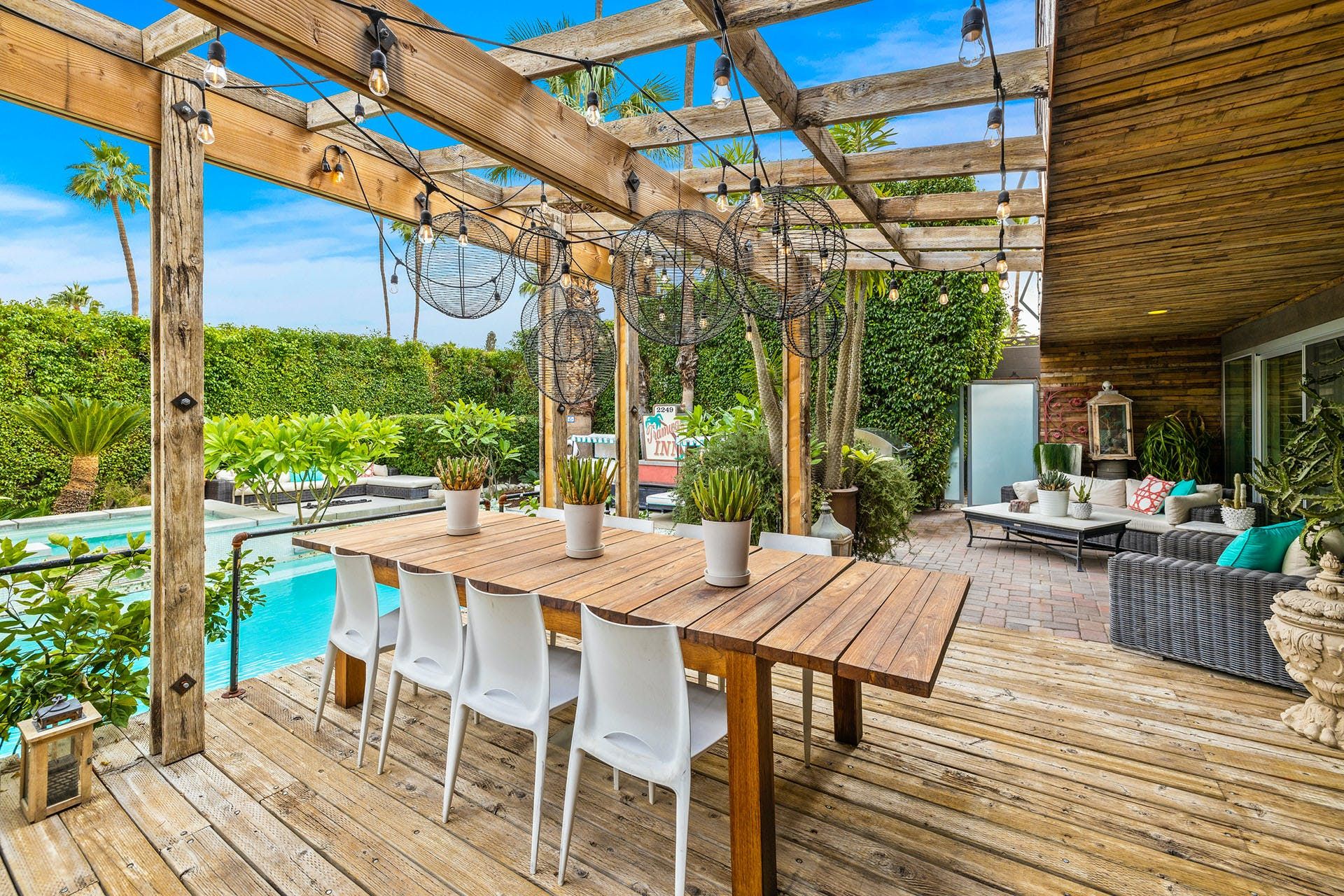This 60’s Palm Springs oasis makes a strong case for outdoor living. With two private pools, a Baja bar with loungers, a canopied daybed and a sofa area, it’s likely that most of the holiday will be spent poolside – thought it might be hard to choose which one you set up camp by. Take in the extraordinary view of the mountains during the day, and at night get the fire pit going and turn on the fairy lights for a dinner party under the stars. You’ll feel a tranquility and privacy here, thanks to the verdant hedges, but you’ll still see swaying palm trees overhead, whether you’re on the tanning deck or swimming laps. Inside, three kitchens and three living spaces give this home a compound feel perfect for large groups. The stylish design affords plenty of privacy thanks to the divided living areas, but when it’s time to come together, the large dining table is perfect for hosting meals all together – that is if you aren’t eating at the grogeous wooden table outside. And after a long day of sunshine, plush bedroom suites with beautiful views invite a good night of beauty rest. When you’re ready to pry yourself away from this magical compound, you’ll find yourself just a four-minute drive from the Uptown Design District of Downtown Palm Springs. Visit the Palm Springs Art Museum, hike at Indian and Tahquitz Canyons and frequent the many restaurants, coffee shops, golf courses and cabarets of this lovely desert resort town.