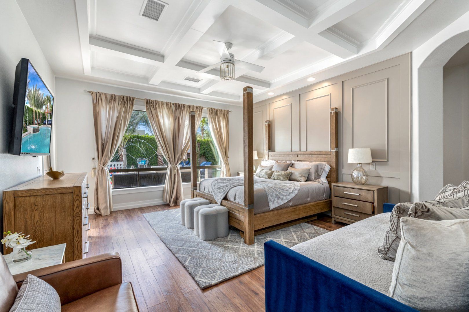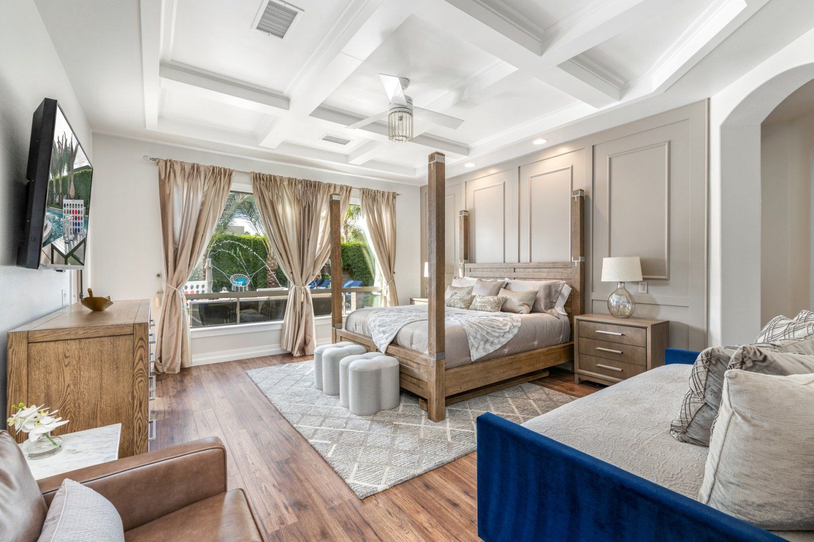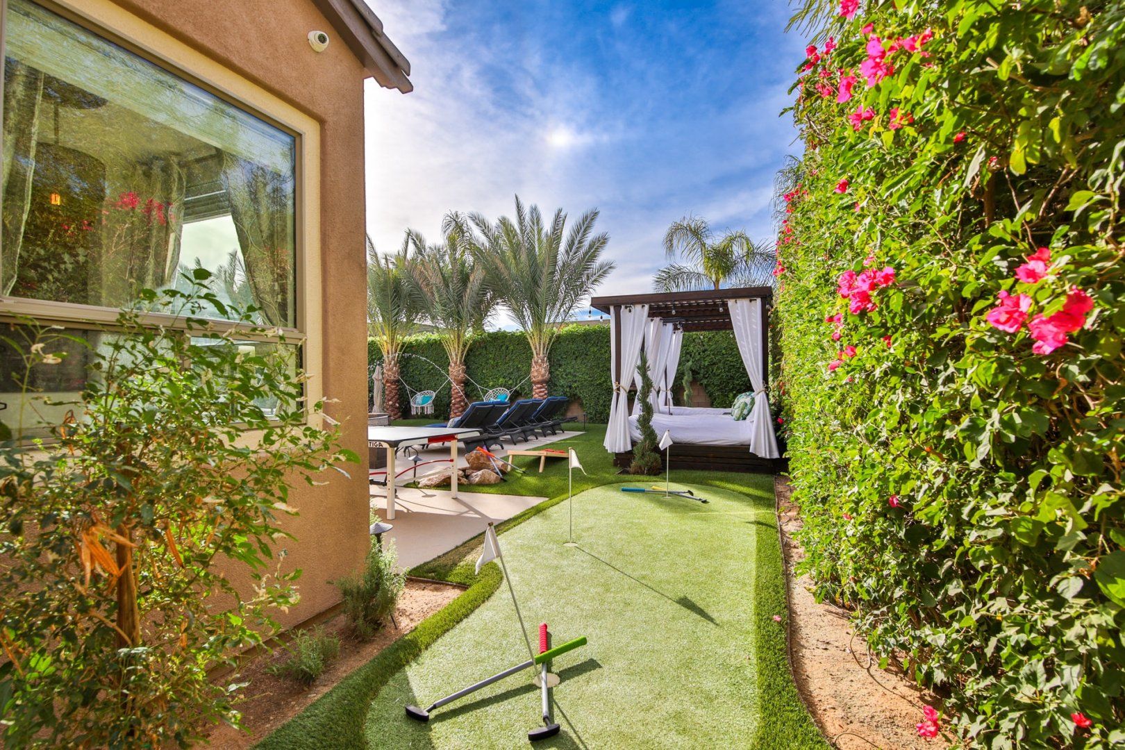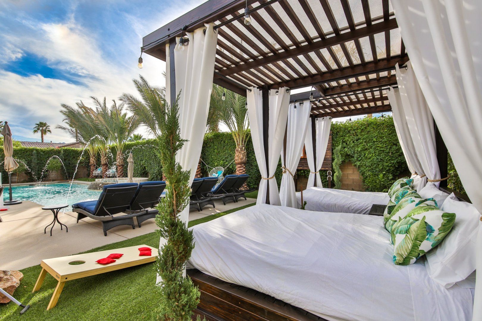 Given the region's glorious climate, this is an address that makes it easy to spend as much time outdoors as possible. The heated saltwater swimming pool in the middle of the garden features a circular bar and a separate spa pool. Just next to this, there's a sunken seating area arranged around a fire pit, as well as loungers, hammock chairs and cabanas in which to sneak in an afternoon nap. As if that wasn't enough, there's also an outdoor kitchen and an impressive selection of entertainment options, including darts, a putting green and oversized versions of board game favourites.