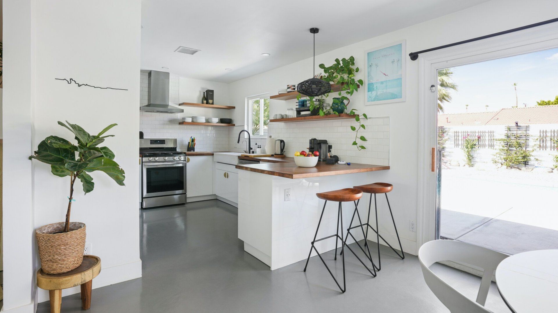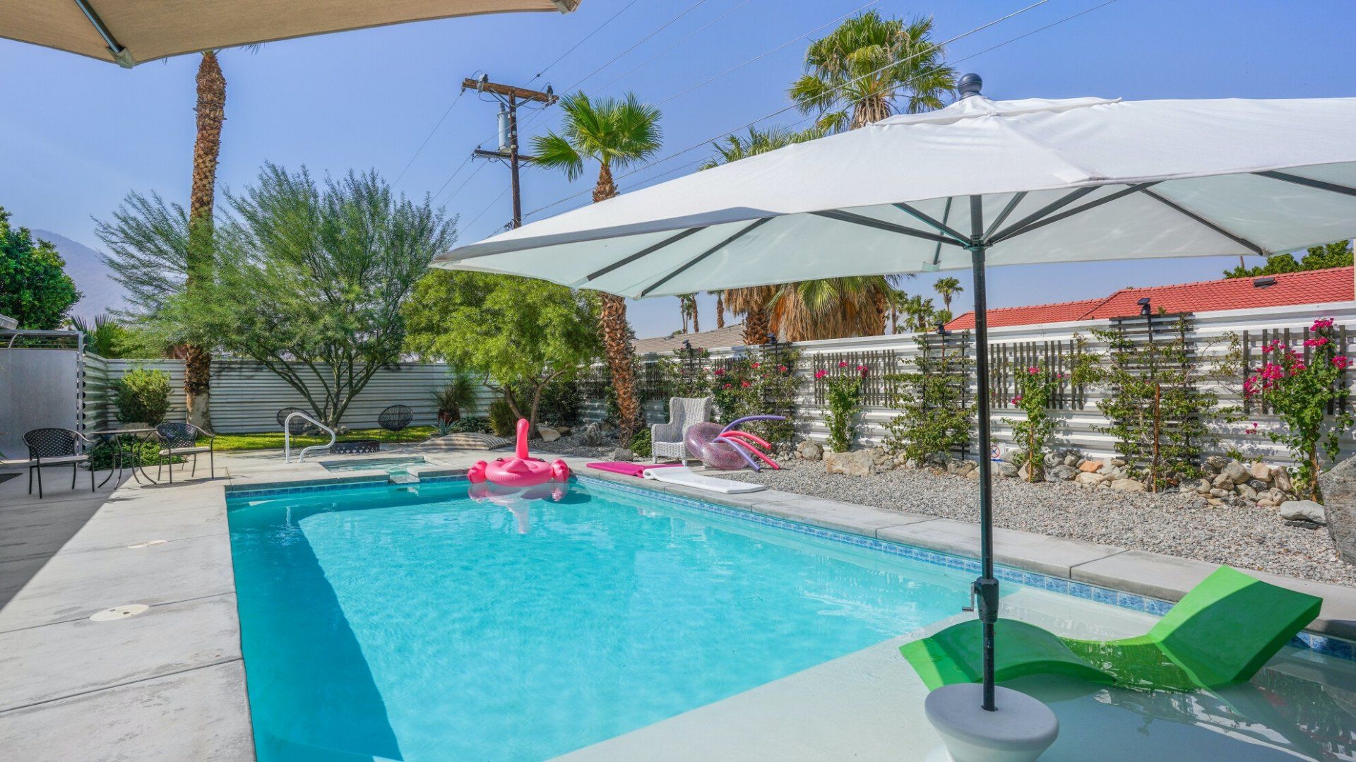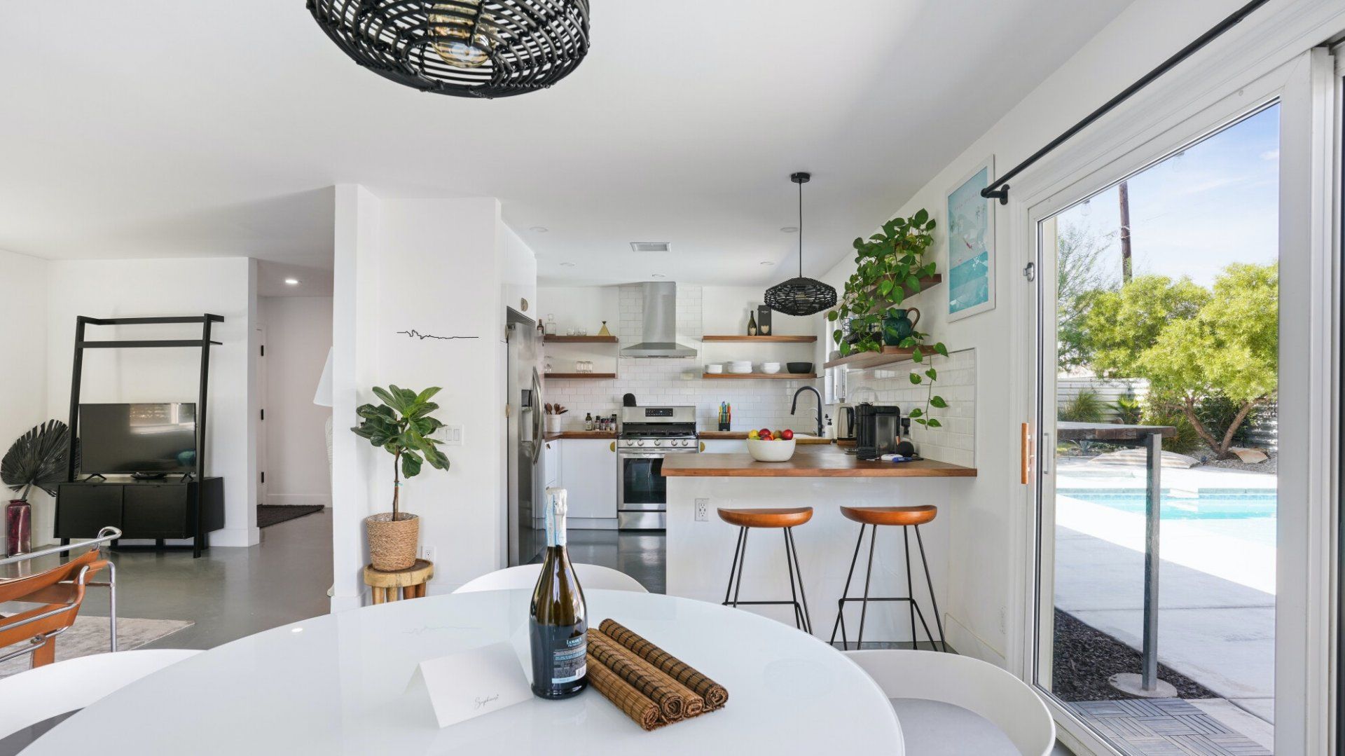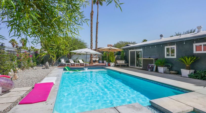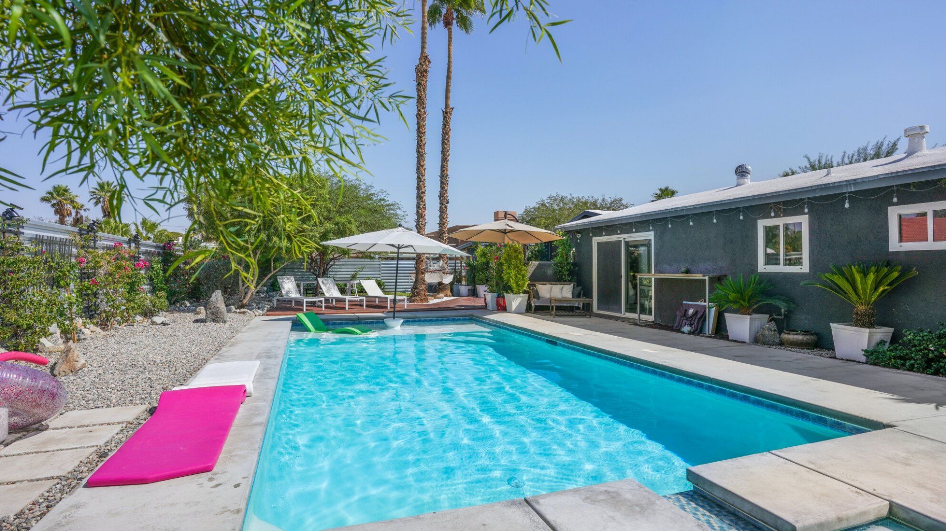 Surrounded by rugged desert mountains and towering palms, there’s no doubt you’re in Palm Springs here. There’s a festival vibe to the backyard, where stringed lights illuminate the trees at twilight, and a double hammock awaits for sunny days. A turquoise rectangle of swimming pool with a Jacuzzi and Baja shelf sits in the centre and a shaded seating area provides an escape from the midday heat. Inside, it’s sleek, white and modern with retro touches in true Palm Springs style. A mid-century pine-green sofa draws the eye in the living room, there are a couple of retro arcade games in the second bedroom, and the main bathroom fully embraces retro-chic with the marshmallow-pink shower tiles. There’s sleek modernity just where you want it – in the kitchen with its hardwood countertops and big Belfast sink. If you don’t fancy cooking at home (even on the gas grill outside), it’s a five-minute drive to the endless shops, restaurants and cafés of Palm Canyon Drive.
