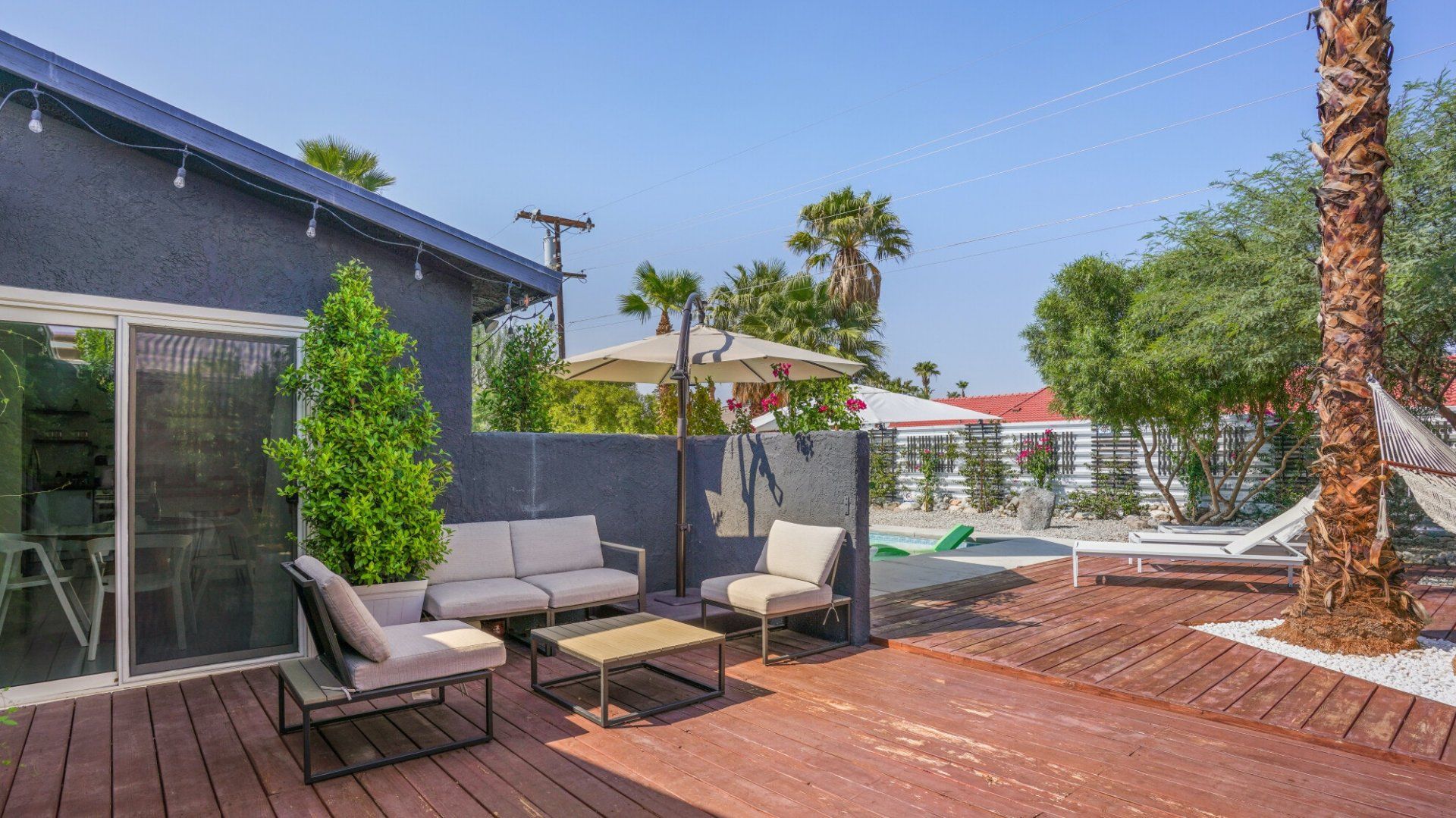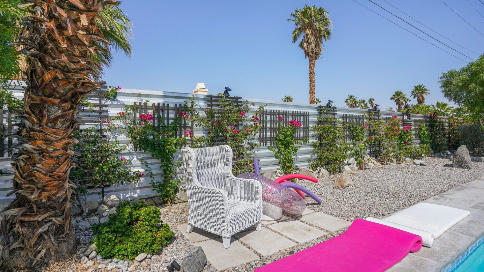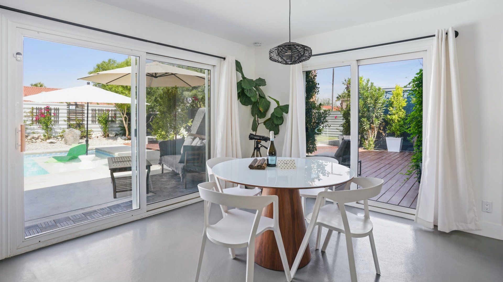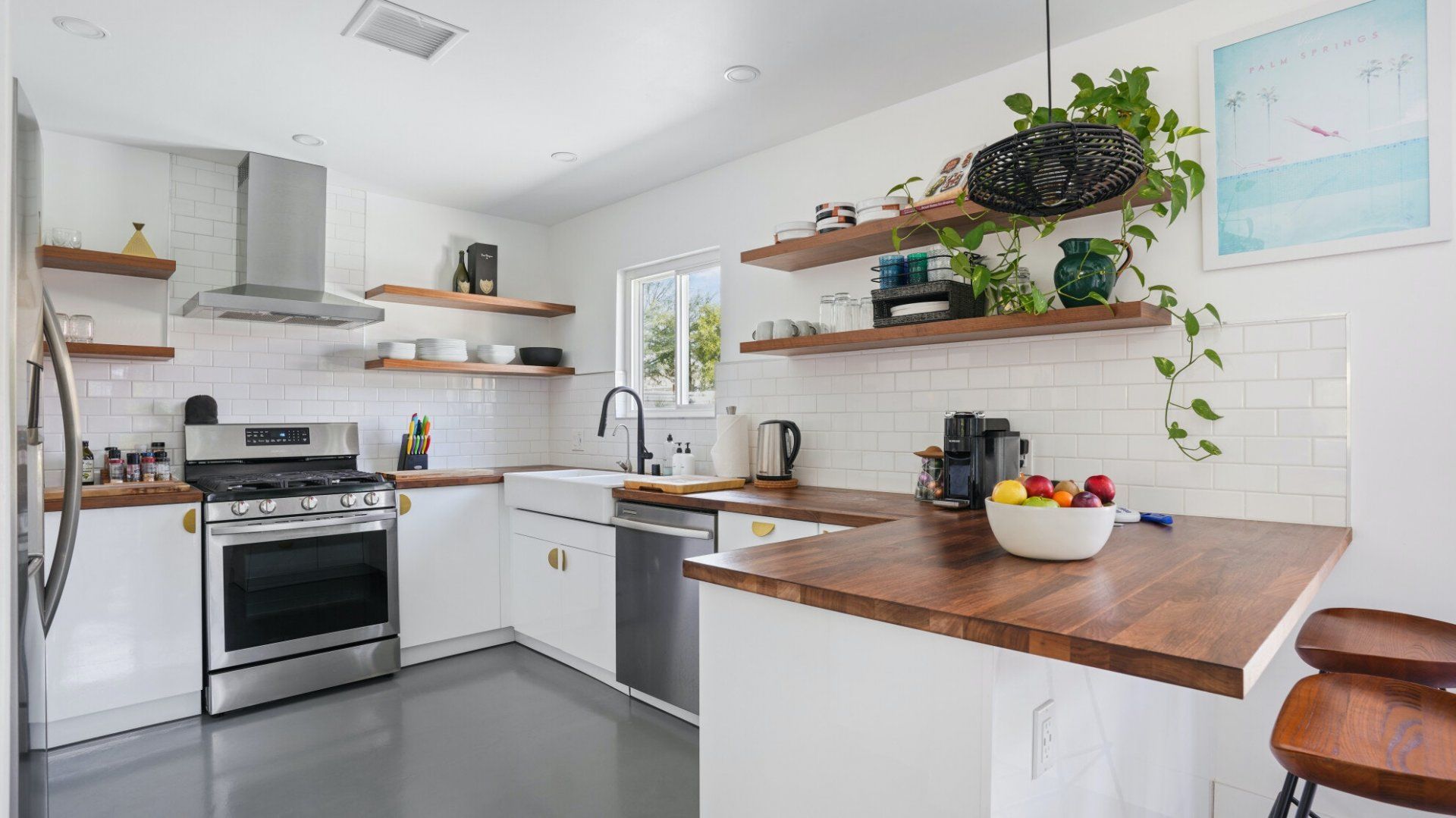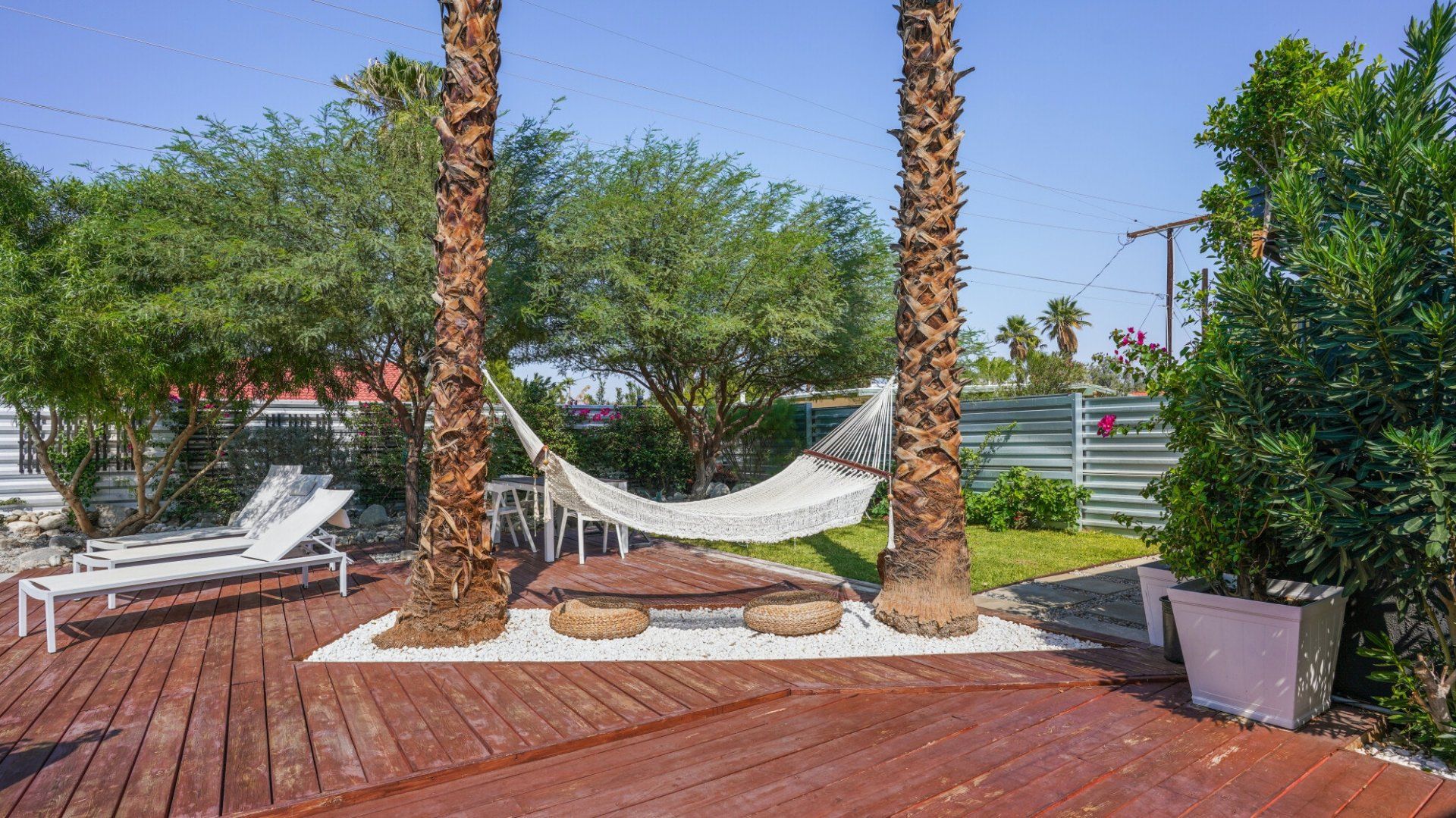 Surrounded by rugged desert mountains and towering palms, there’s no doubt you’re in Palm Springs here. There’s a festival vibe to the backyard, where stringed lights illuminate the trees at twilight, and a double hammock awaits for sunny days. A turquoise rectangle of swimming pool with a Jacuzzi and Baja shelf sits in the centre and a shaded seating area provides an escape from the midday heat. Inside, it’s sleek, white and modern with retro touches in true Palm Springs style. A mid-century pine-green sofa draws the eye in the living room, there are a couple of retro arcade games in the second bedroom, and the main bathroom fully embraces retro-chic with the marshmallow-pink shower tiles. There’s sleek modernity just where you want it – in the kitchen with its hardwood countertops and big Belfast sink. If you don’t fancy cooking at home (even on the gas grill outside), it’s a five-minute drive to the endless shops, restaurants and cafés of Palm Canyon Drive.