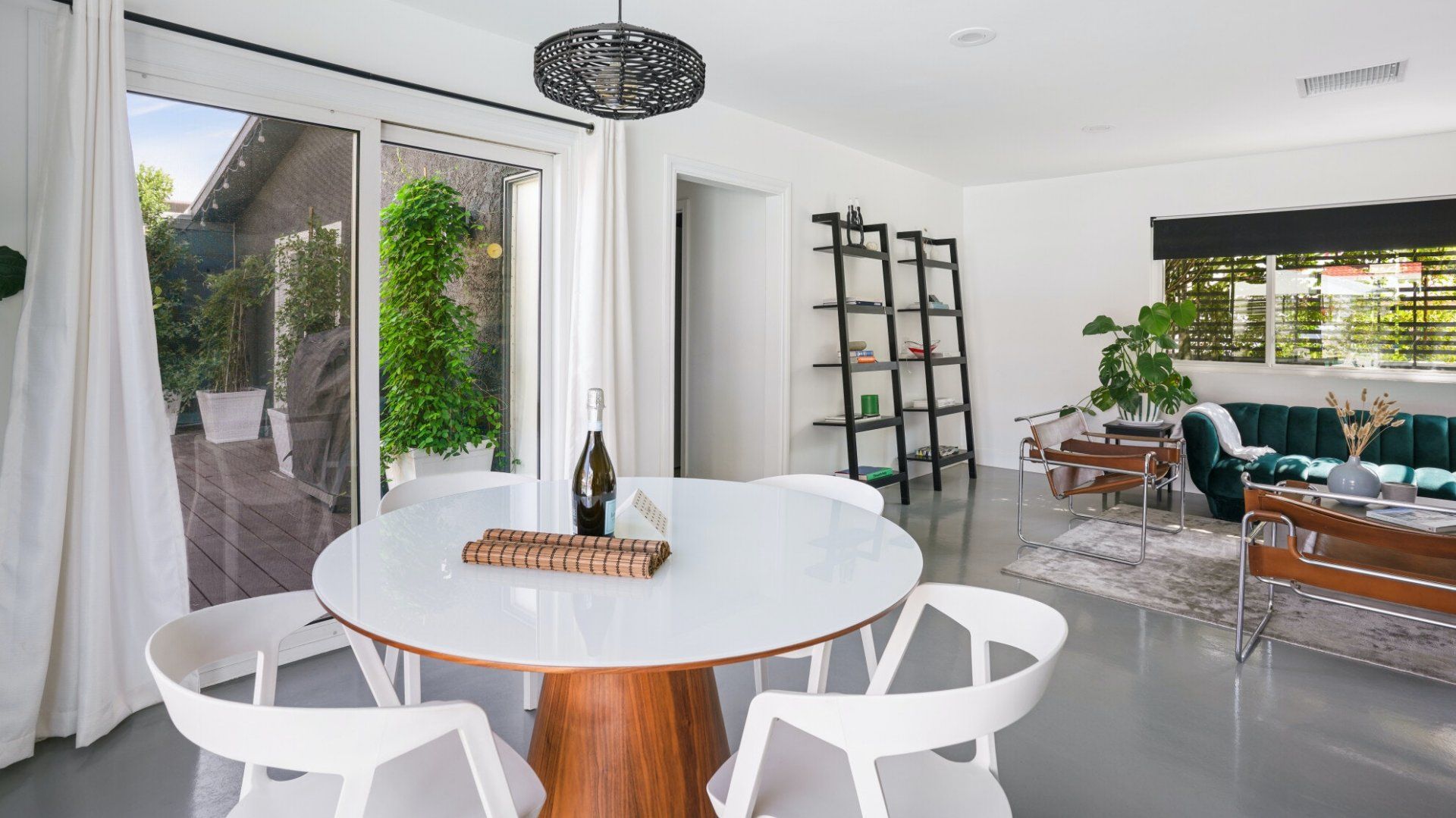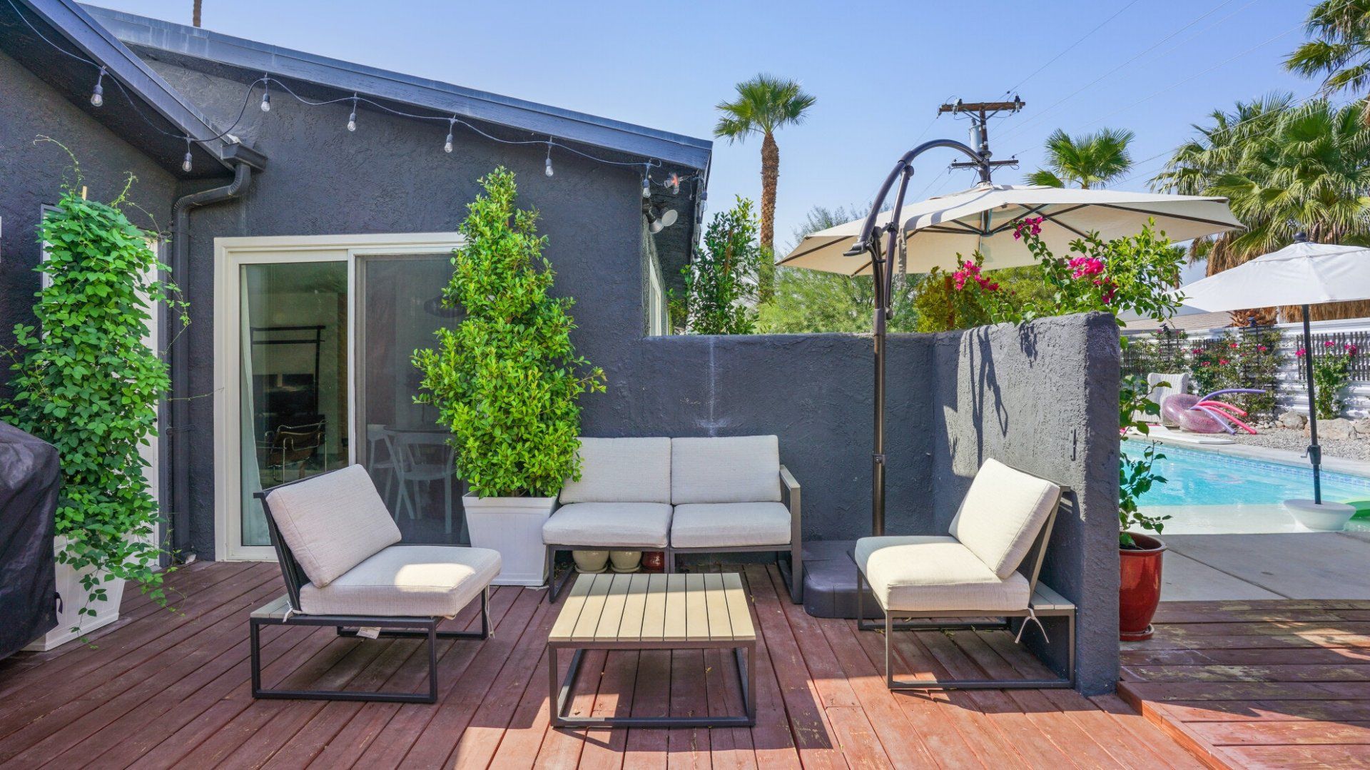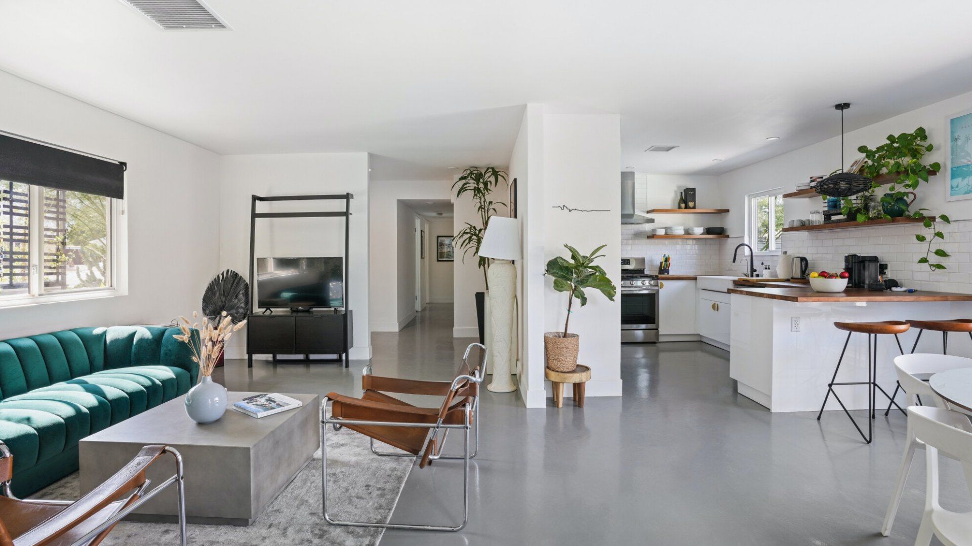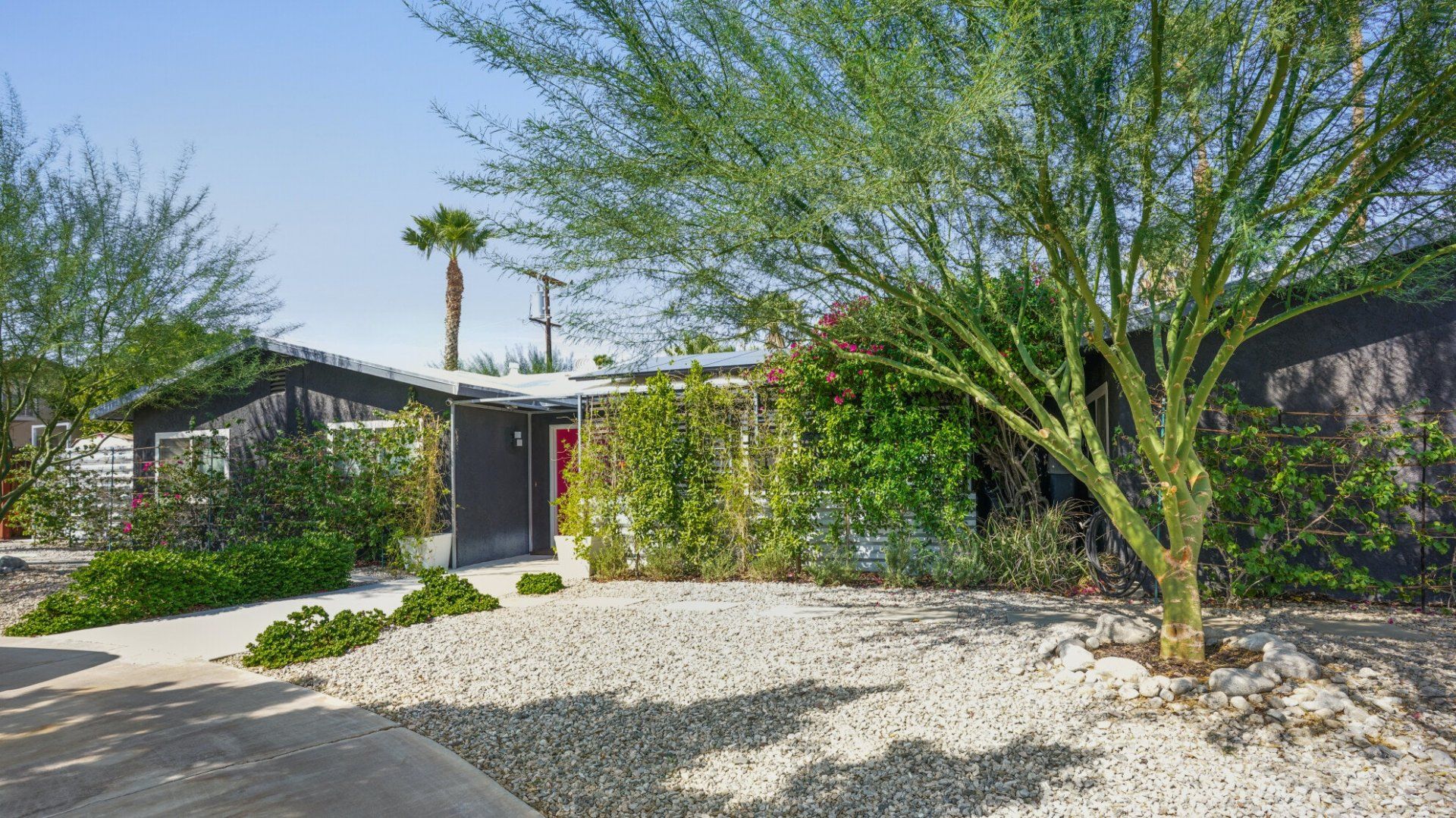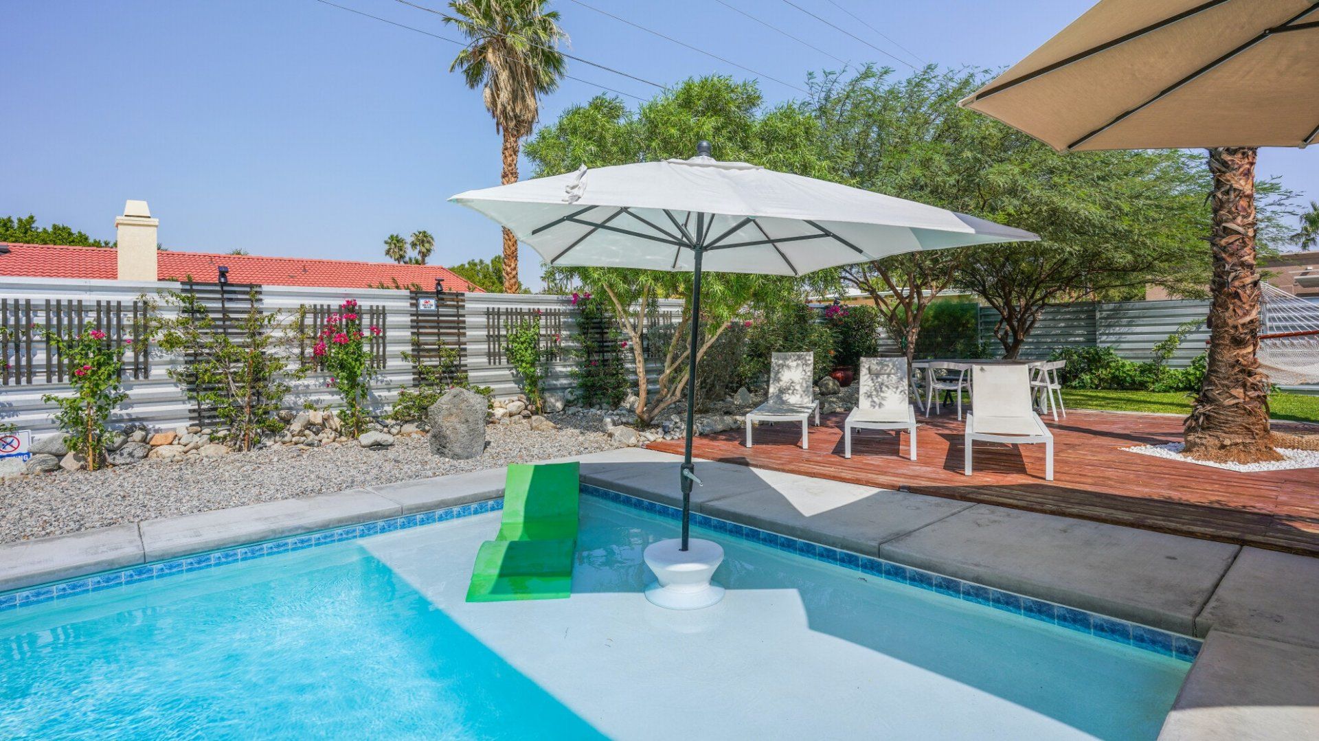 Surrounded by rugged desert mountains and towering palms, there’s no doubt you’re in Palm Springs here. There’s a festival vibe to the backyard, where stringed lights illuminate the trees at twilight, and a double hammock awaits for sunny days. A turquoise rectangle of swimming pool with a Jacuzzi and Baja shelf sits in the centre and a shaded seating area provides an escape from the midday heat. Inside, it’s sleek, white and modern with retro touches in true Palm Springs style. A mid-century pine-green sofa draws the eye in the living room, there are a couple of retro arcade games in the second bedroom, and the main bathroom fully embraces retro-chic with the marshmallow-pink shower tiles. There’s sleek modernity just where you want it – in the kitchen with its hardwood countertops and big Belfast sink. If you don’t fancy cooking at home (even on the gas grill outside), it’s a five-minute drive to the endless shops, restaurants and cafés of Palm Canyon Drive.