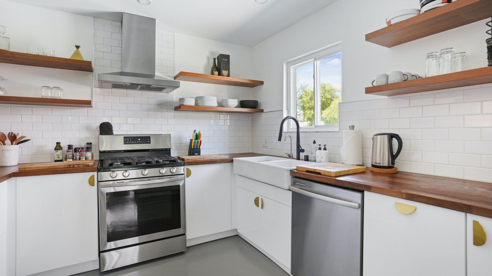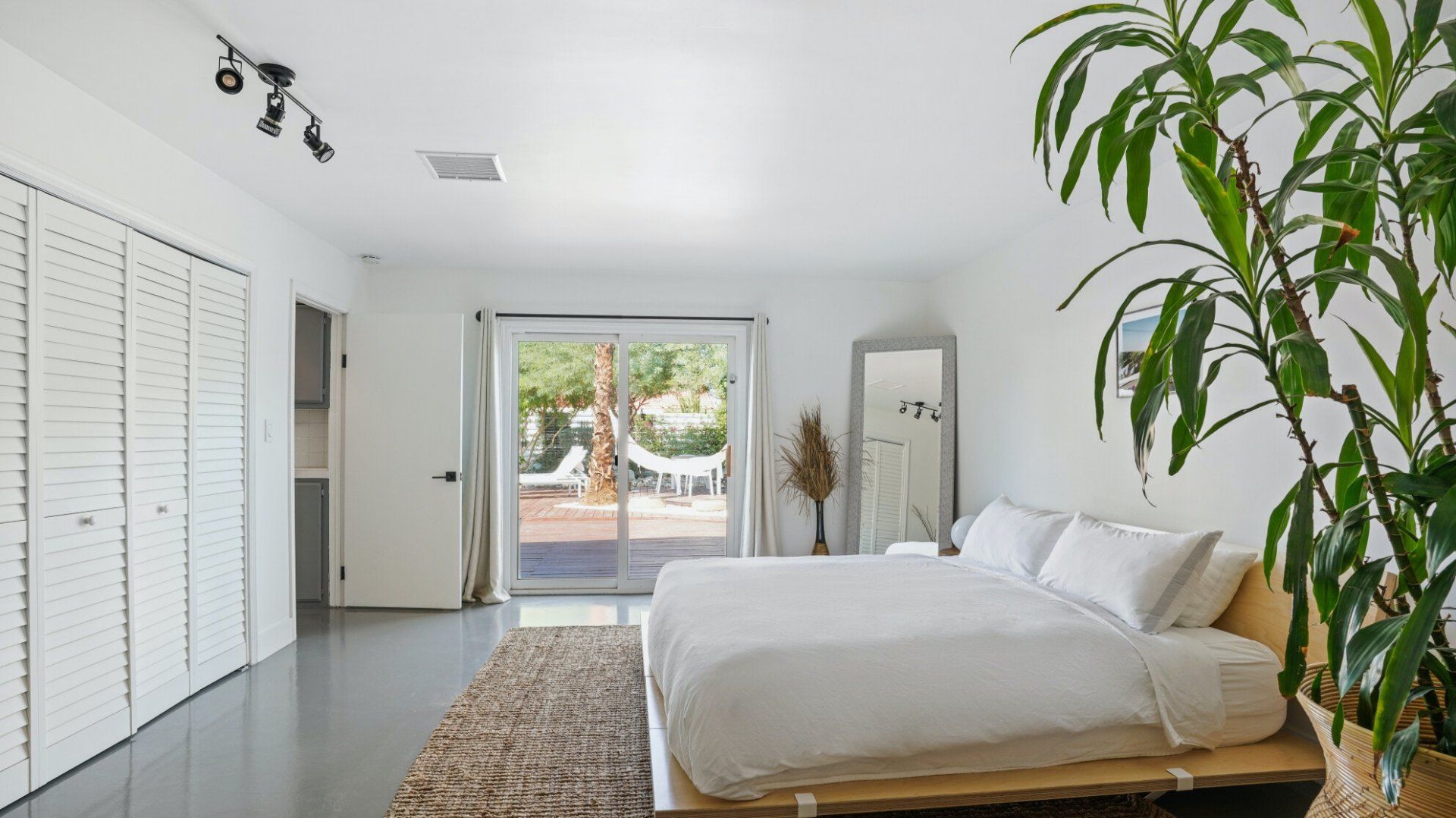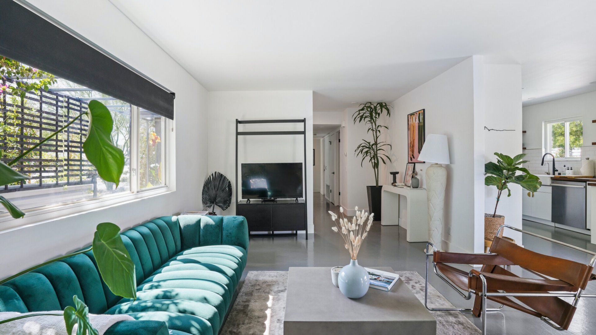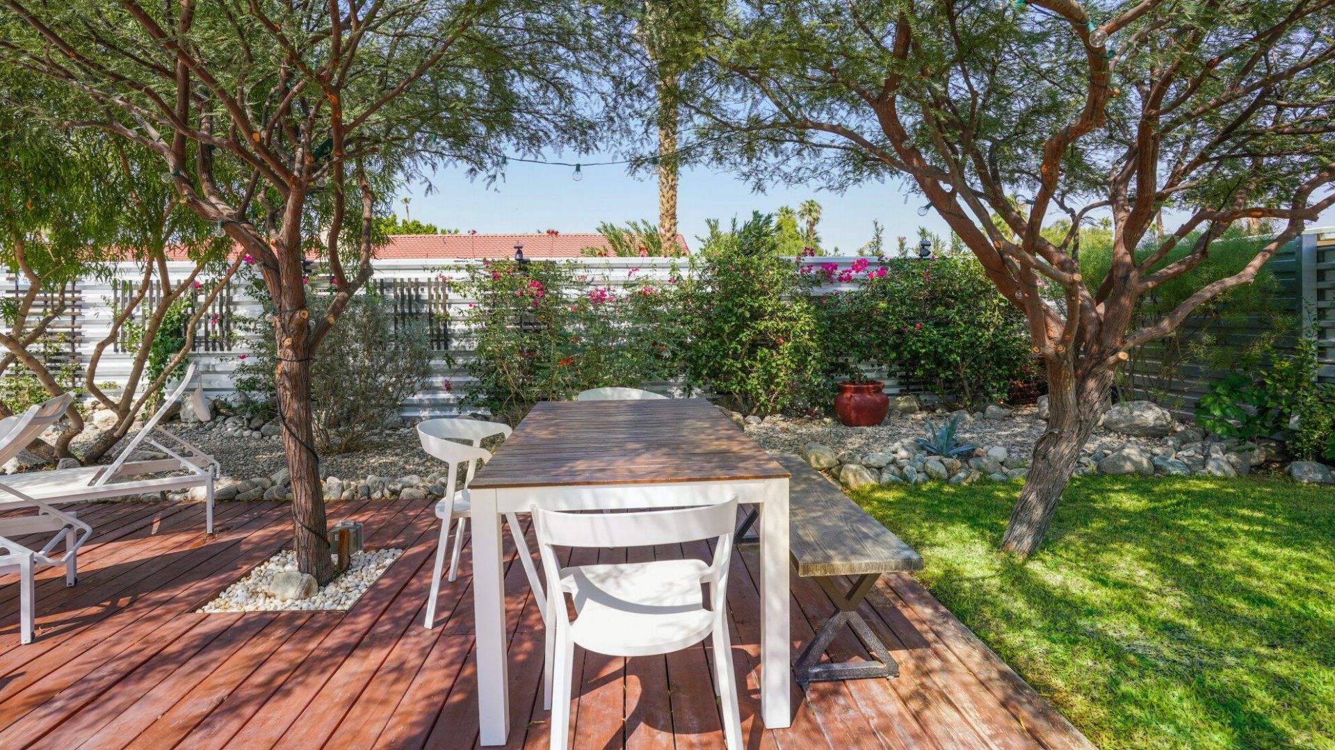 Surrounded by rugged desert mountains and towering palms, there’s no doubt you’re in Palm Springs here. There’s a festival vibe to the backyard, where stringed lights illuminate the trees at twilight, and a double hammock awaits for sunny days. A turquoise rectangle of swimming pool with a Jacuzzi and Baja shelf sits in the centre and a shaded seating area provides an escape from the midday heat. Inside, it’s sleek, white and modern with retro touches in true Palm Springs style. A mid-century pine-green sofa draws the eye in the living room, there are a couple of retro arcade games in the second bedroom, and the main bathroom fully embraces retro-chic with the marshmallow-pink shower tiles. There’s sleek modernity just where you want it – in the kitchen with its hardwood countertops and big Belfast sink. If you don’t fancy cooking at home (even on the gas grill outside), it’s a five-minute drive to the endless shops, restaurants and cafés of Palm Canyon Drive.