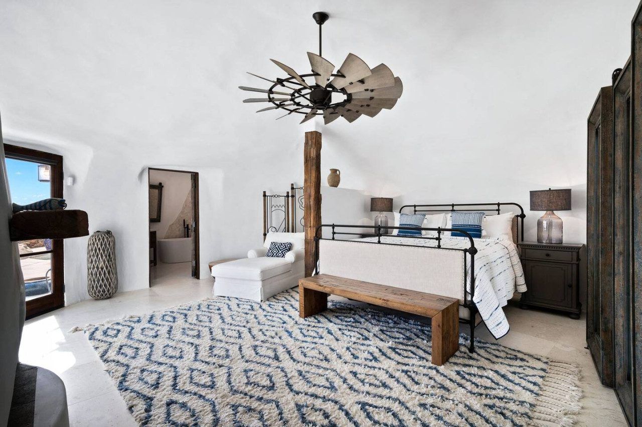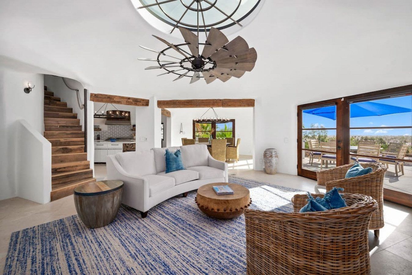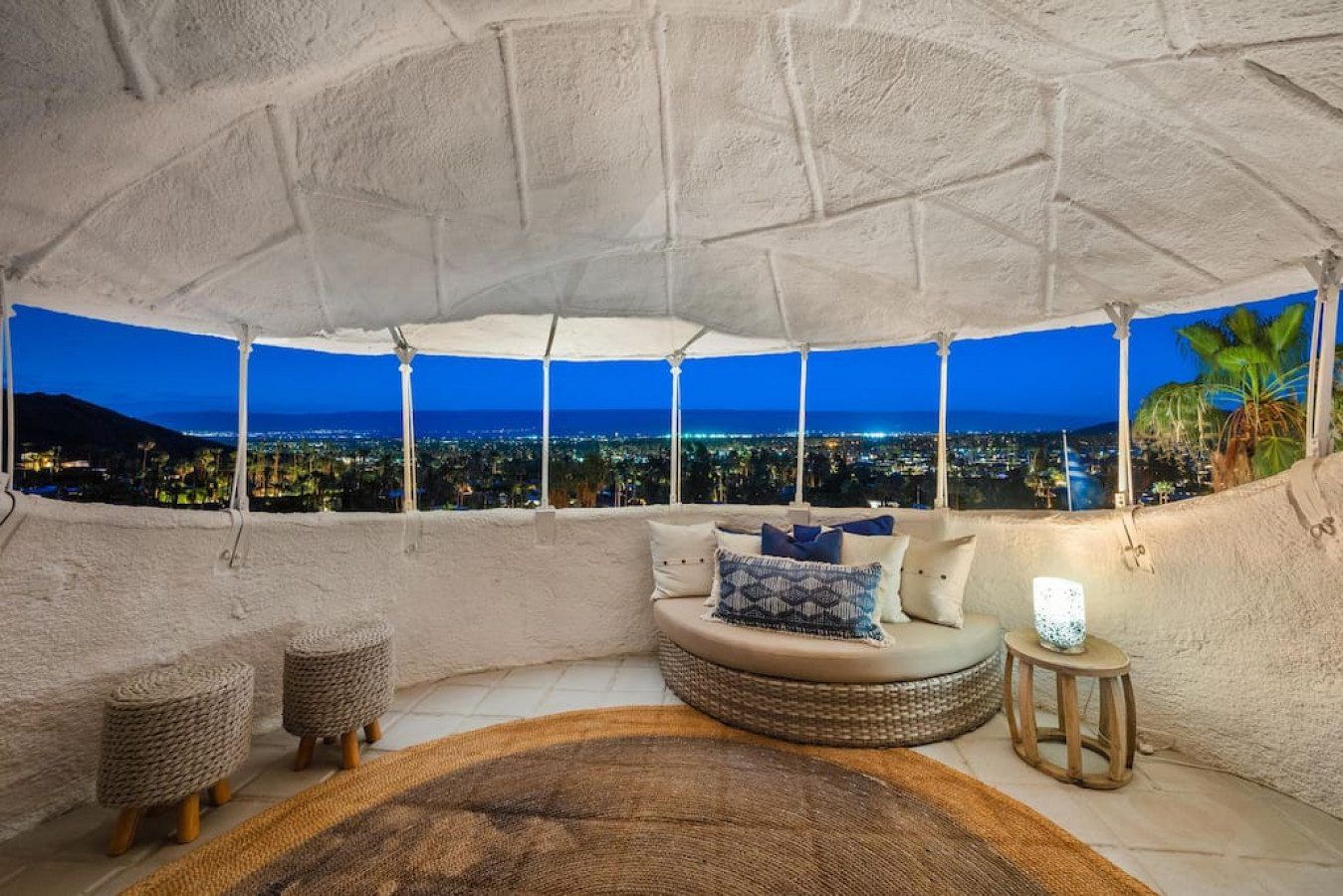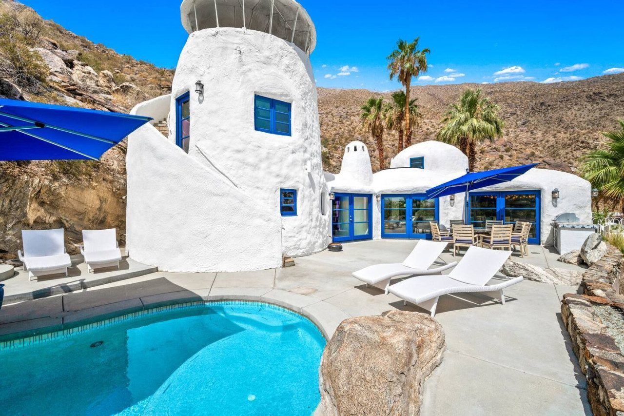 The architect who designed and built this Palm Springs abode was inspired by Santorini β this home is truly unique for its desert setting. You'll be greeted by the curved walls of Cycladic design, a private pool and hot tub, and a resort-style garden. Or, you can ascend the tower to find an observation deck that looks out over the desert β the perfect perch for cocktails. It's spread over a main house and a smaller casita and features century-old beams from a 120-year-old farmhouse and marble imported from Greece. Itβs a magnificent home.