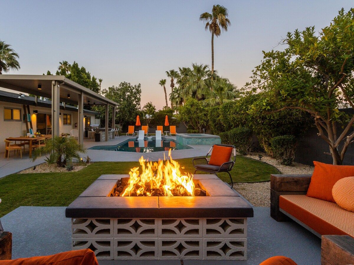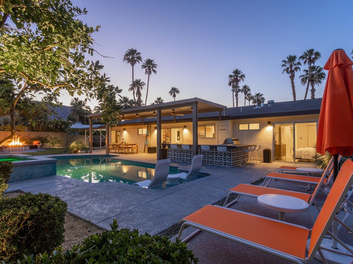 The pool, for example, features a sun shelf for an opportunity to work on the perfect tan, while the kitchen is fully equipped and decked out with all modern appliances. From the backyard, you can enjoy sweeping mountain views. We highly recommend whipping up some cocktails in the outdoor bar and watching the sunset over the San Jacinto Mountains, especially from the fabulous fire pit area.