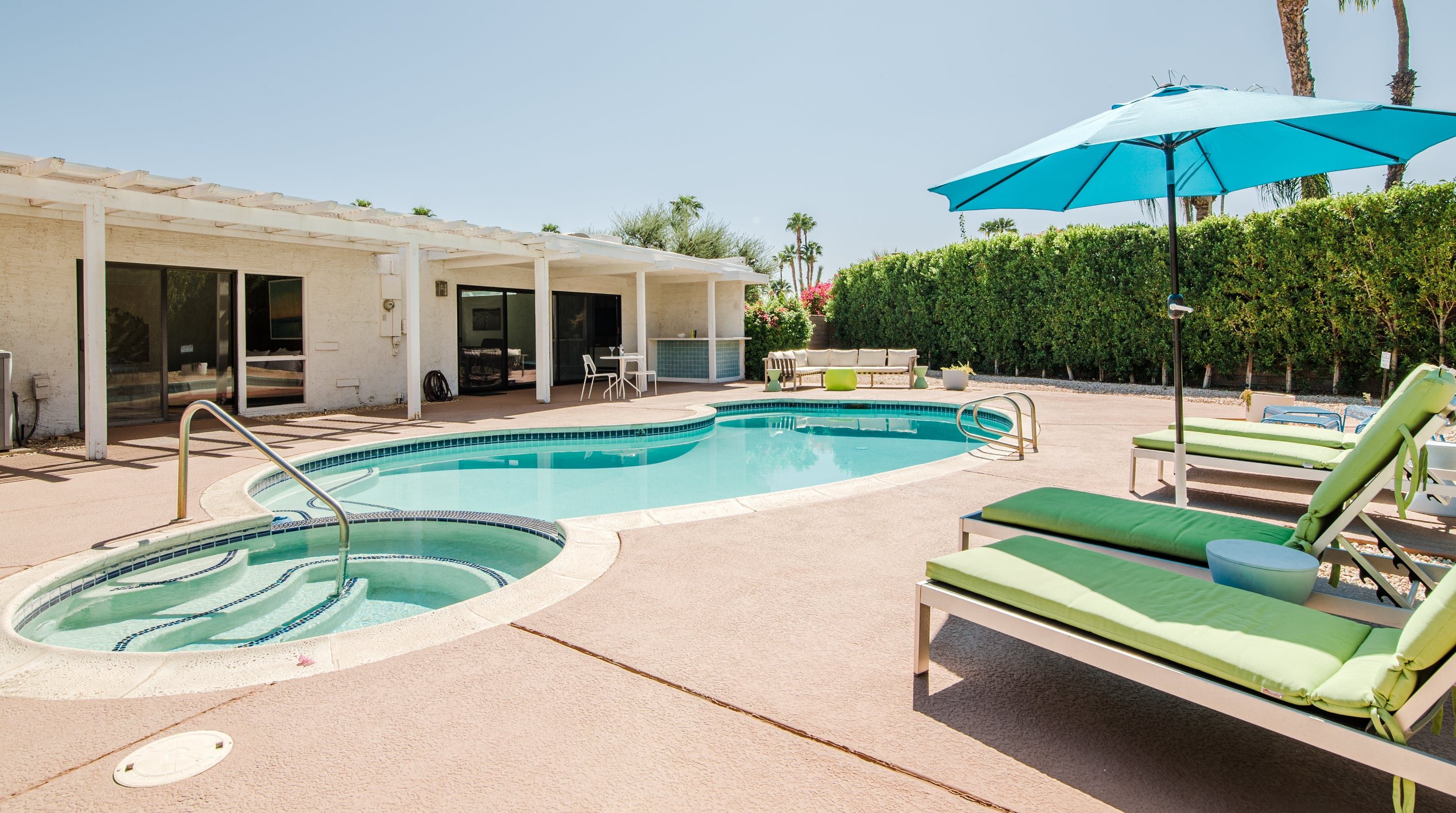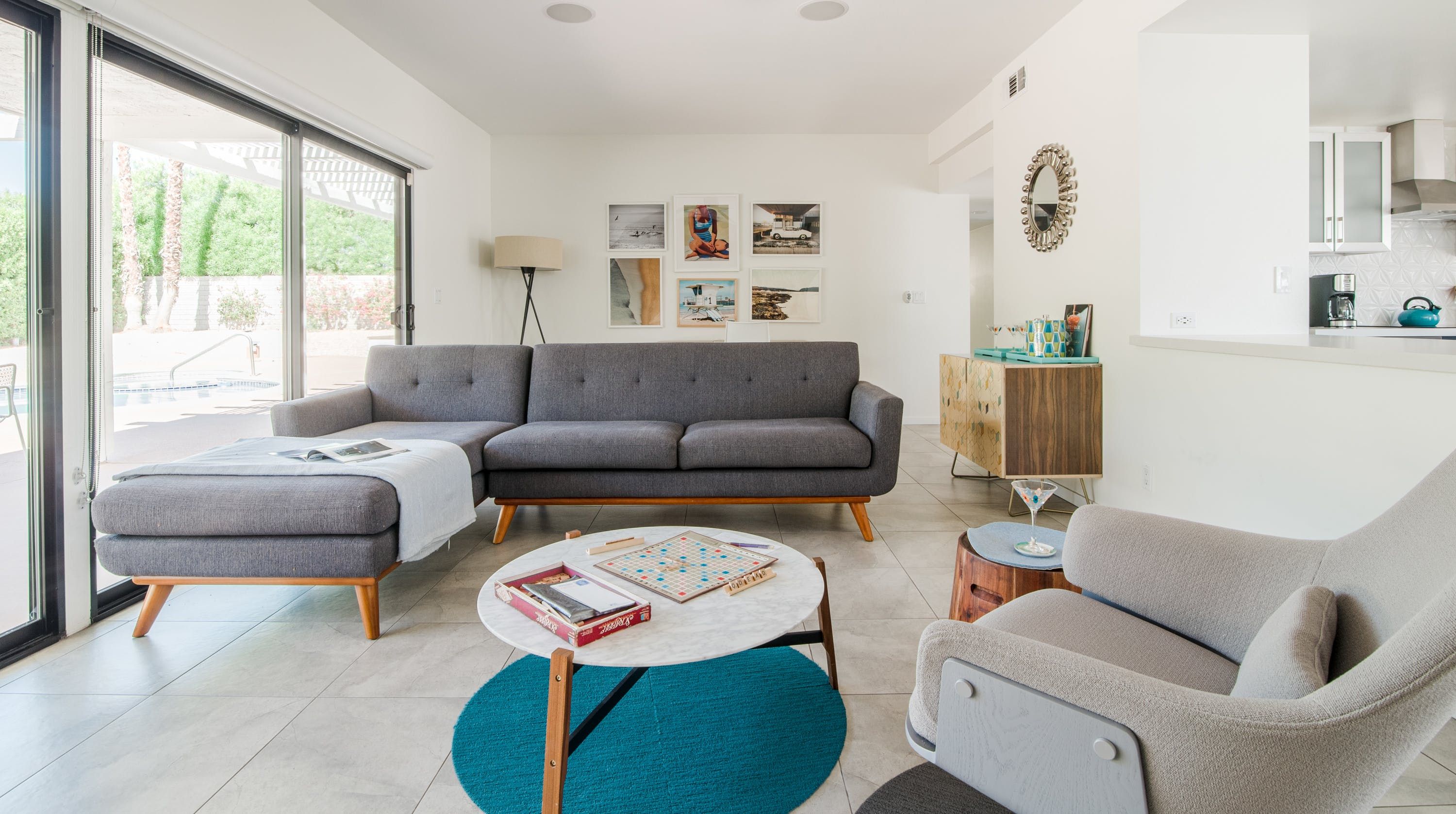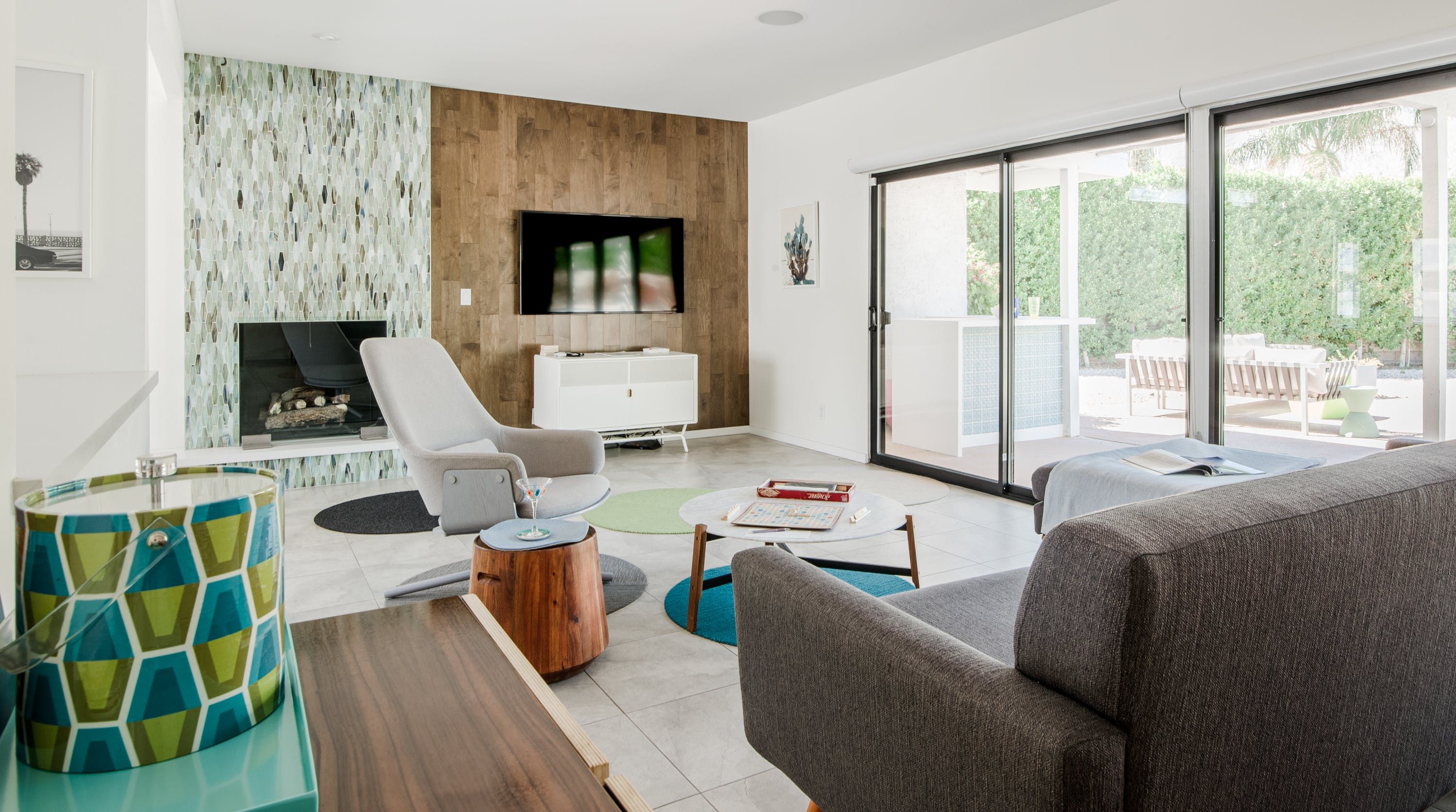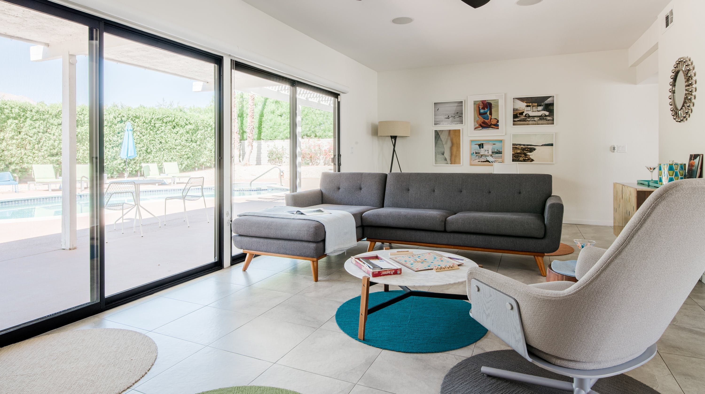 Vast sliding walls of glass blur the lines between indoors and out in this spacious, mid-century home, where glorious Palm Springs sunshine and gorgeous mountain views steal the show.