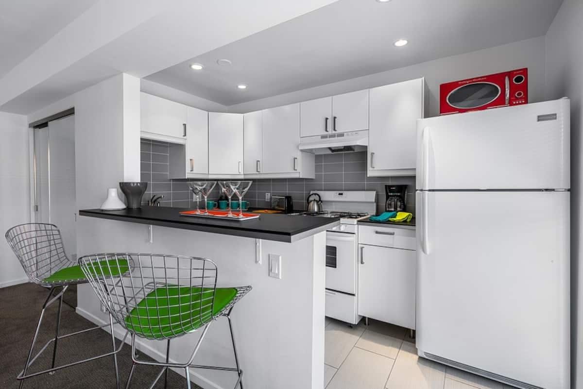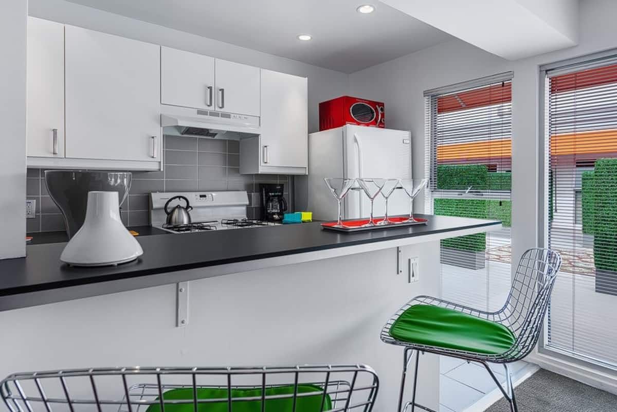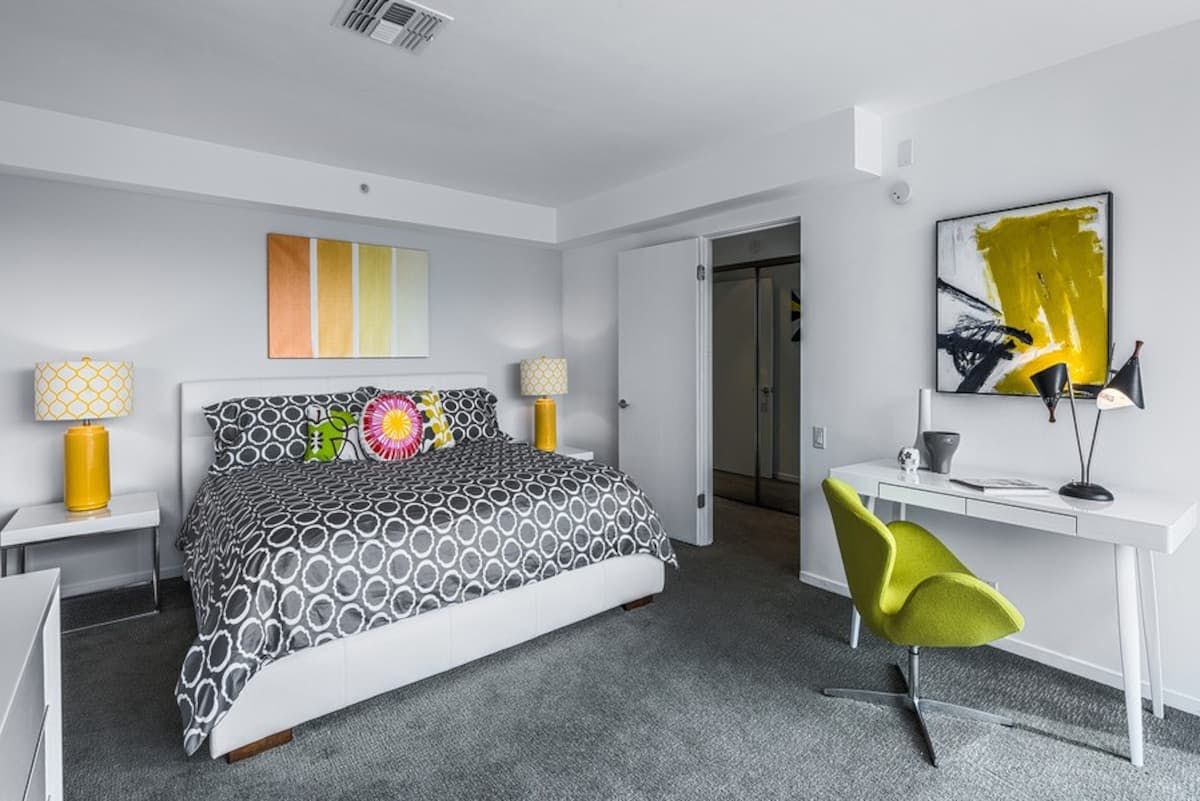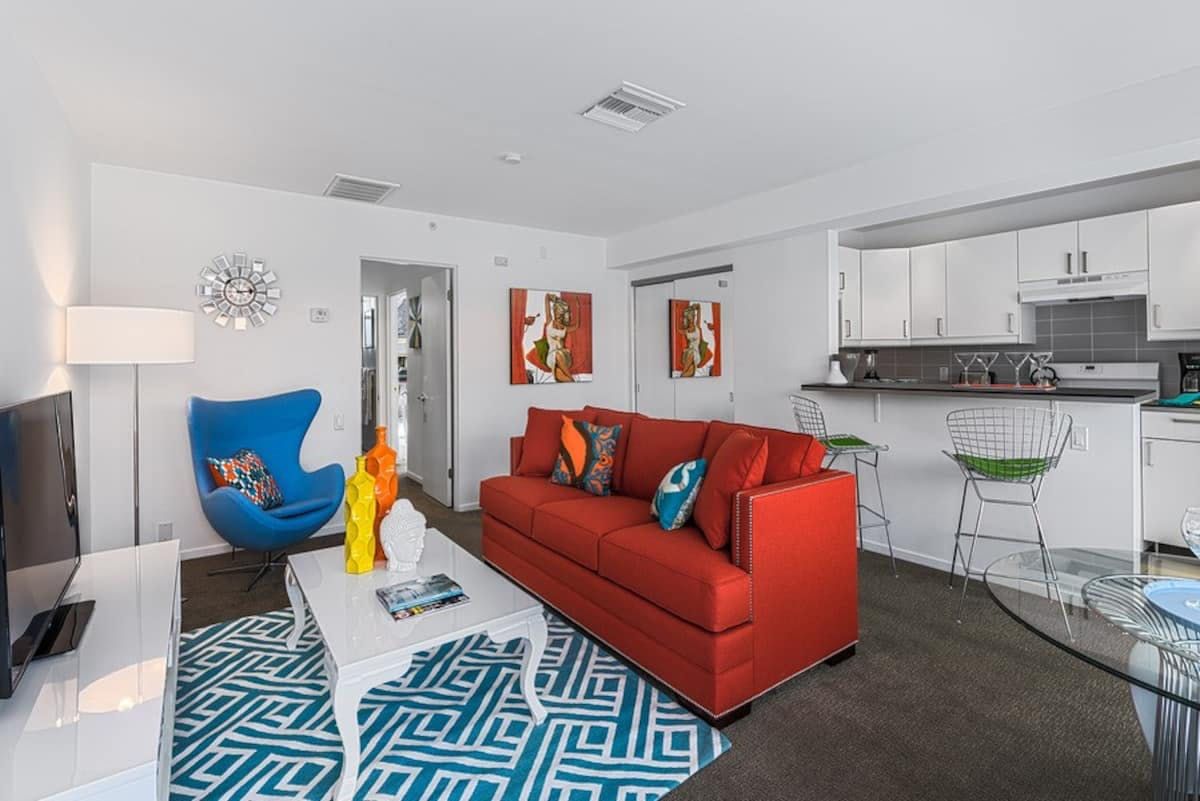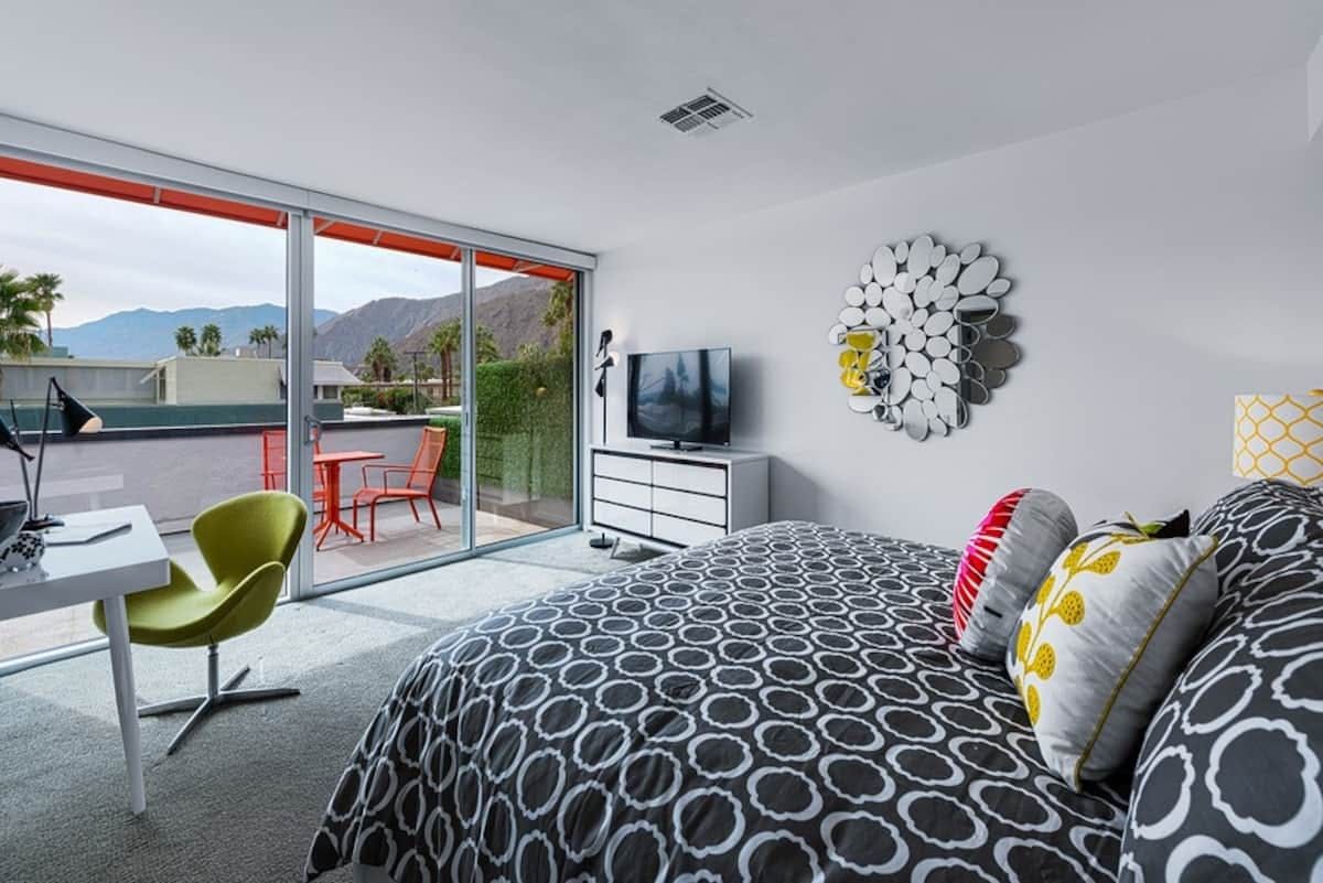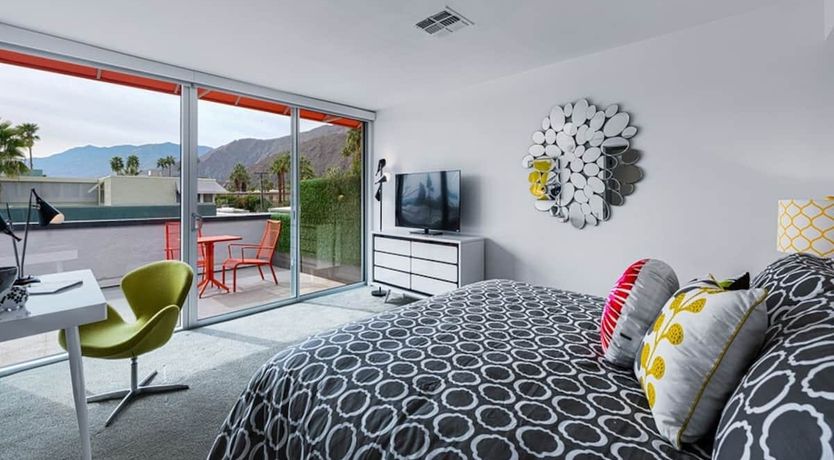 With bold pops of colour, mid-century stylings and a fantastic location in the heart of the Uptown Design District, this bright apartment is the perfect base for a Palm Springs break. It's been created with fun in mind – we love the oversized private balcony for sundowners – and did we mention the spectacular mountain views? Spend sunny days lounging by the pool, playing rounds of mini-golf, soaking in the jacuzzi or having a drink in the bar area. Freshen up back at the apartment before hitting Palm Springs' retro diners, chic bars and pool parties. Everything's within walking distance – Downtown Palm Springs is a twenty-minute stroll, but if you don't fancy walking – there's a free trolley called the Buzz that picks up and stops along the main route. Or ride your complimentary beach cruiser to the Old Las Palmas neighbourhood – this was a Hollywood stars' playground in the 1920s. Today you'll find stylish galleries, design stores, and tiki bars aplenty. On top of all this, Palm Springs International Airport is a mere six-minute drive away.