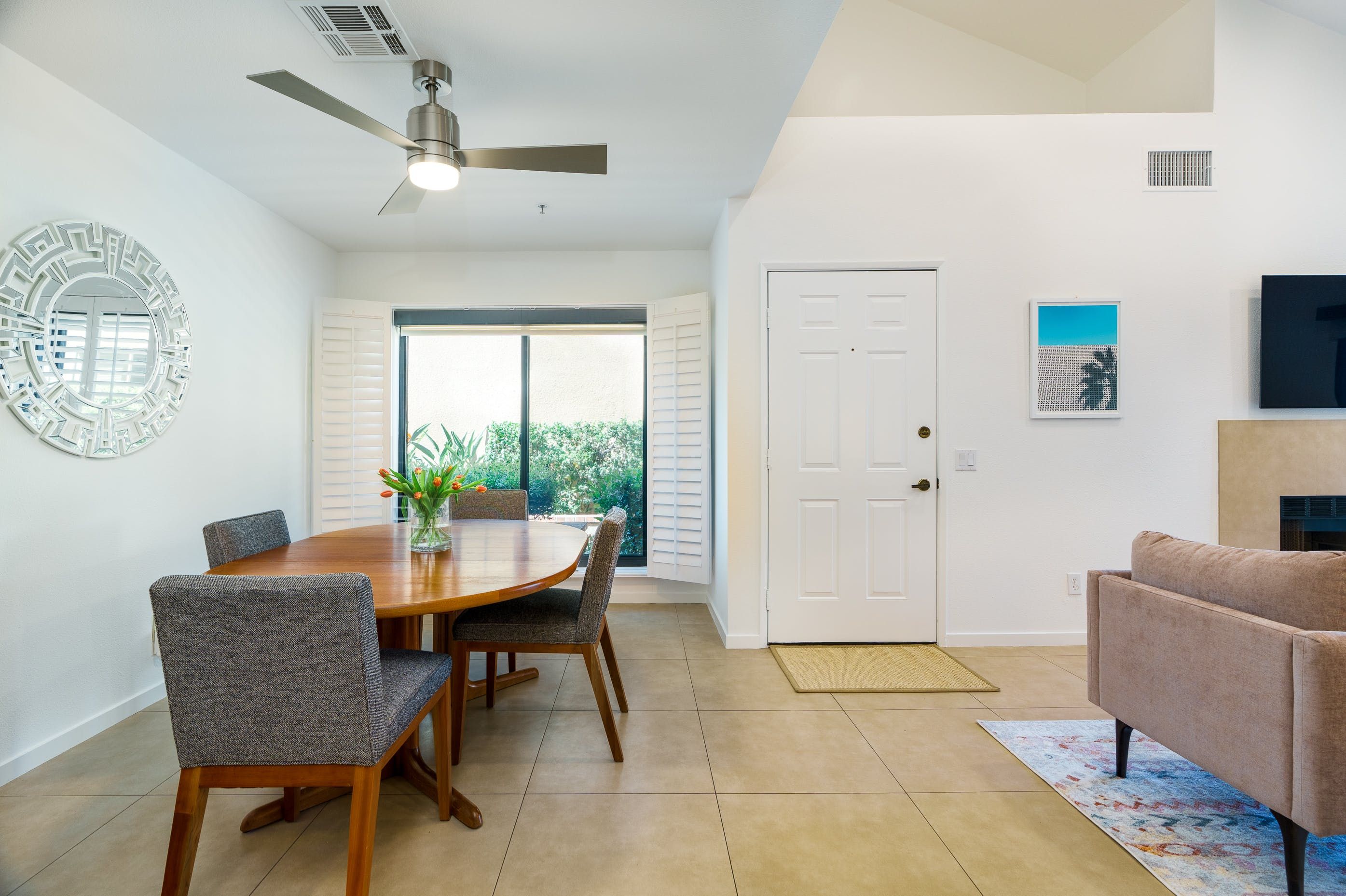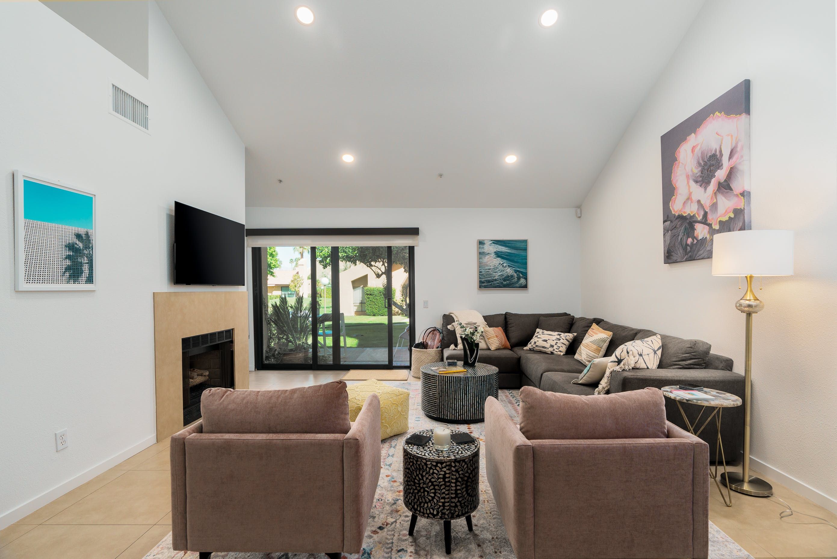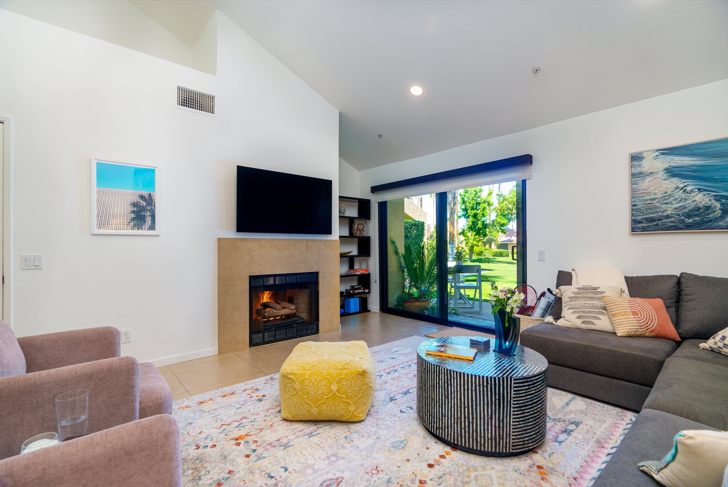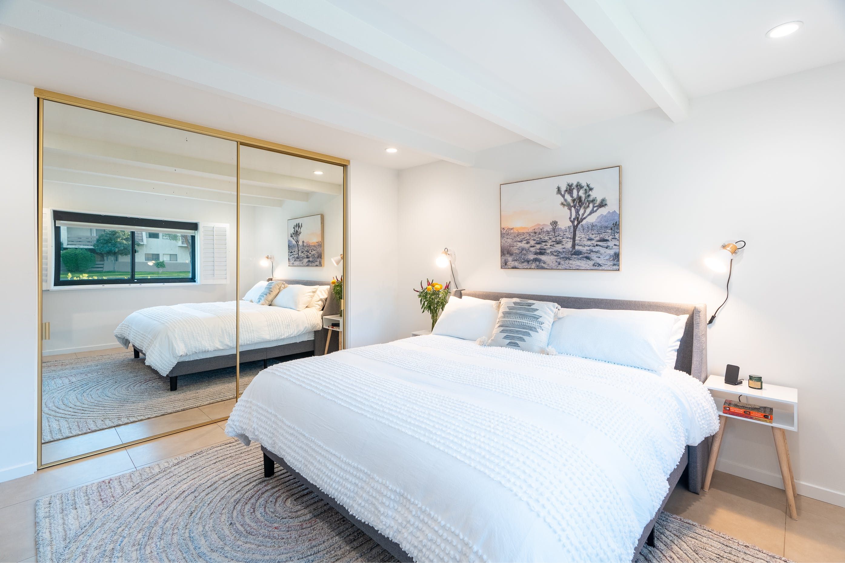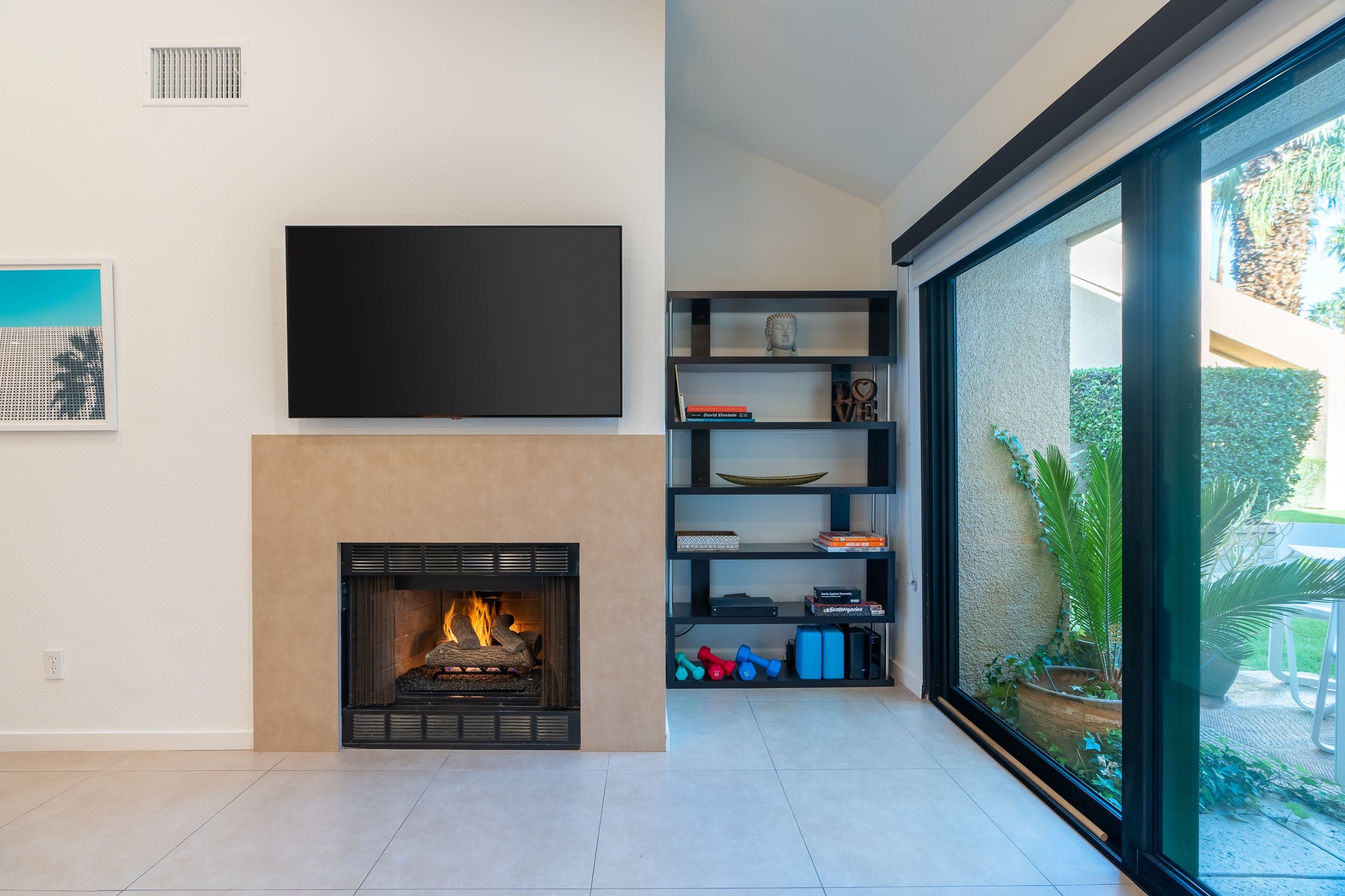 Sitting on the outer edges of Palm Springs, this condo is relatively humble, especially when compared to a lot of the lavish addresses found in the local area. The design is minimalist and inoffensive, with white walls, wooden surfaces and a few pieces of artwork peppered about the walls – although we have to concede that the fireplace adds a degree of much-welcomed hygge.