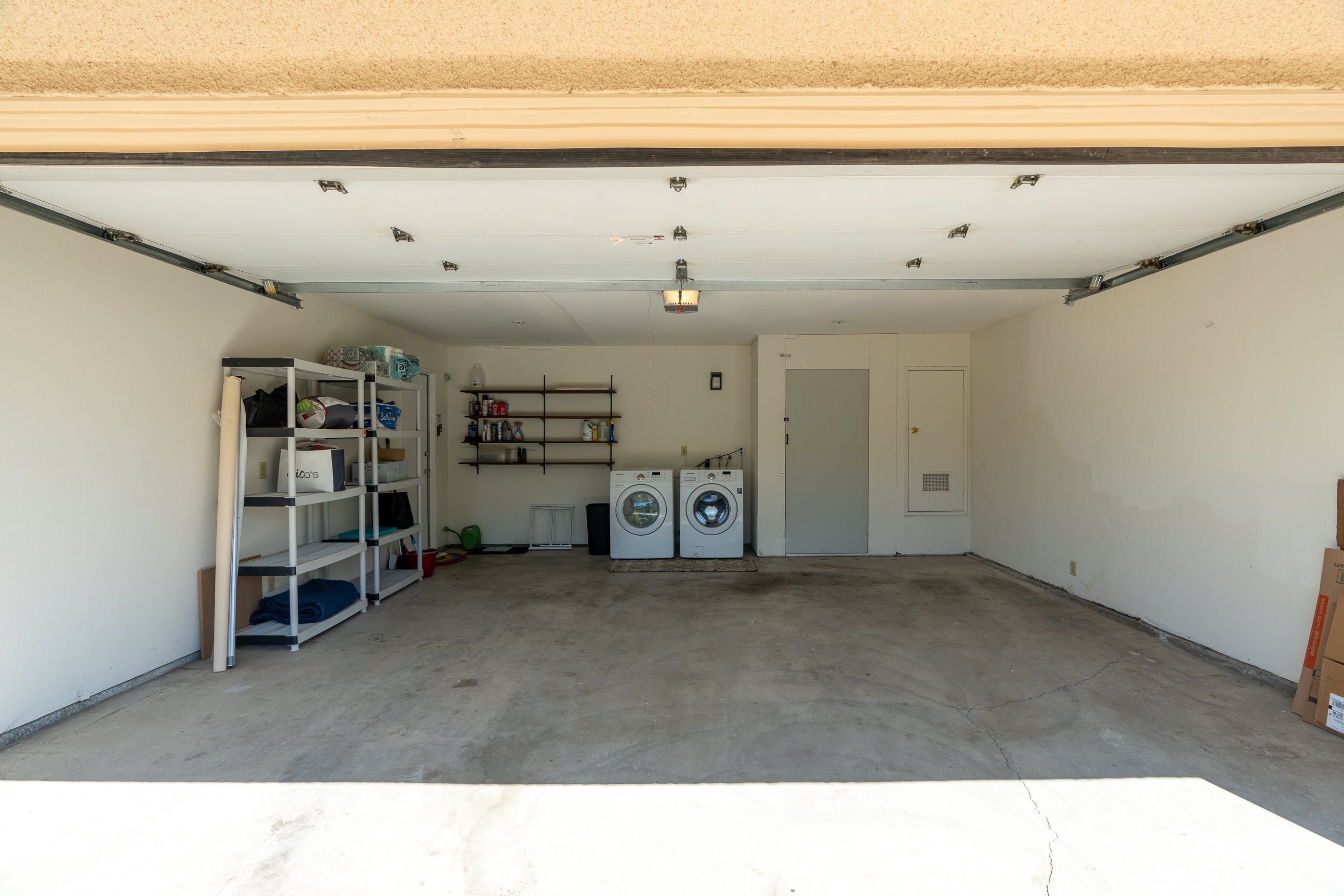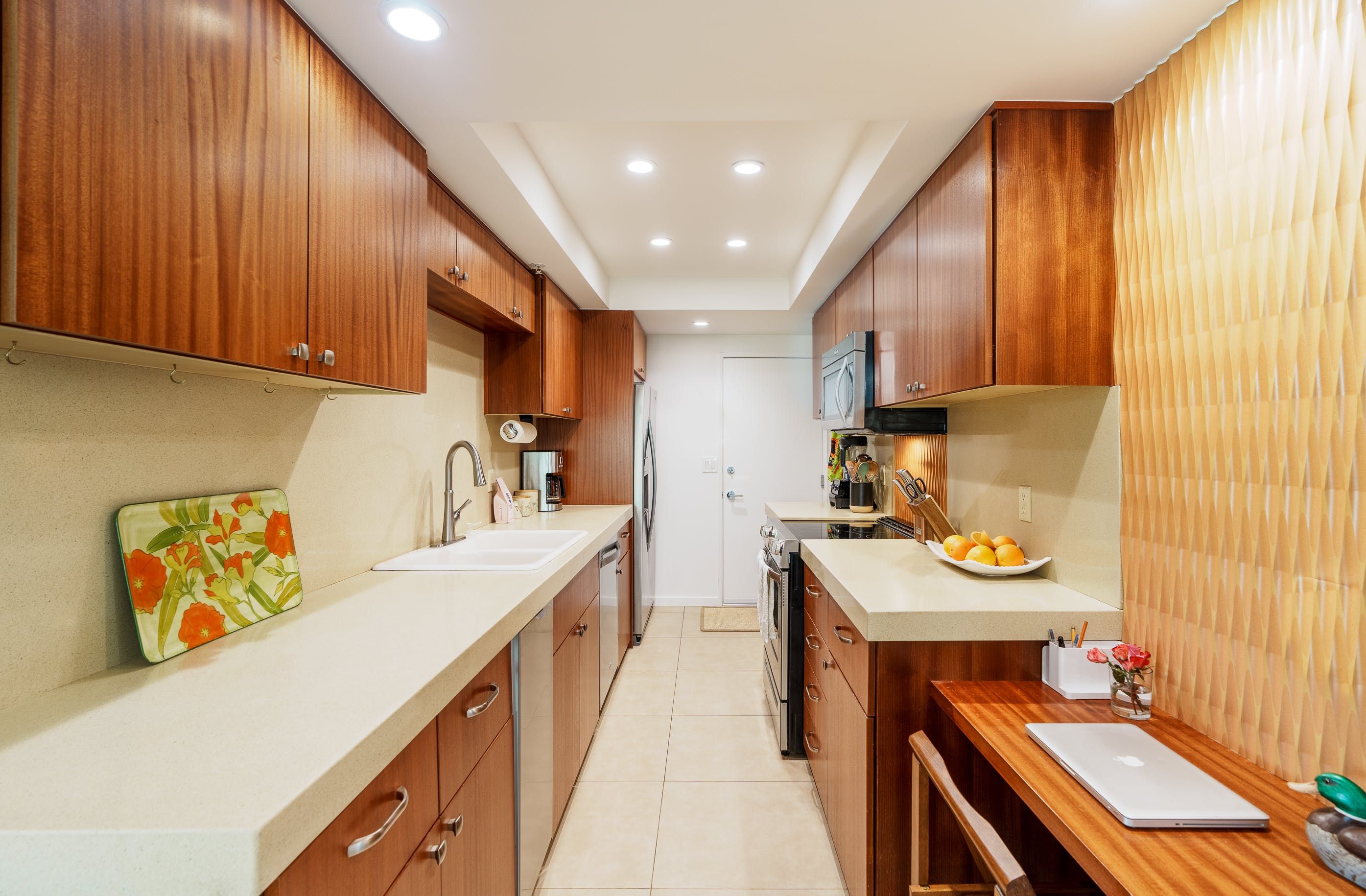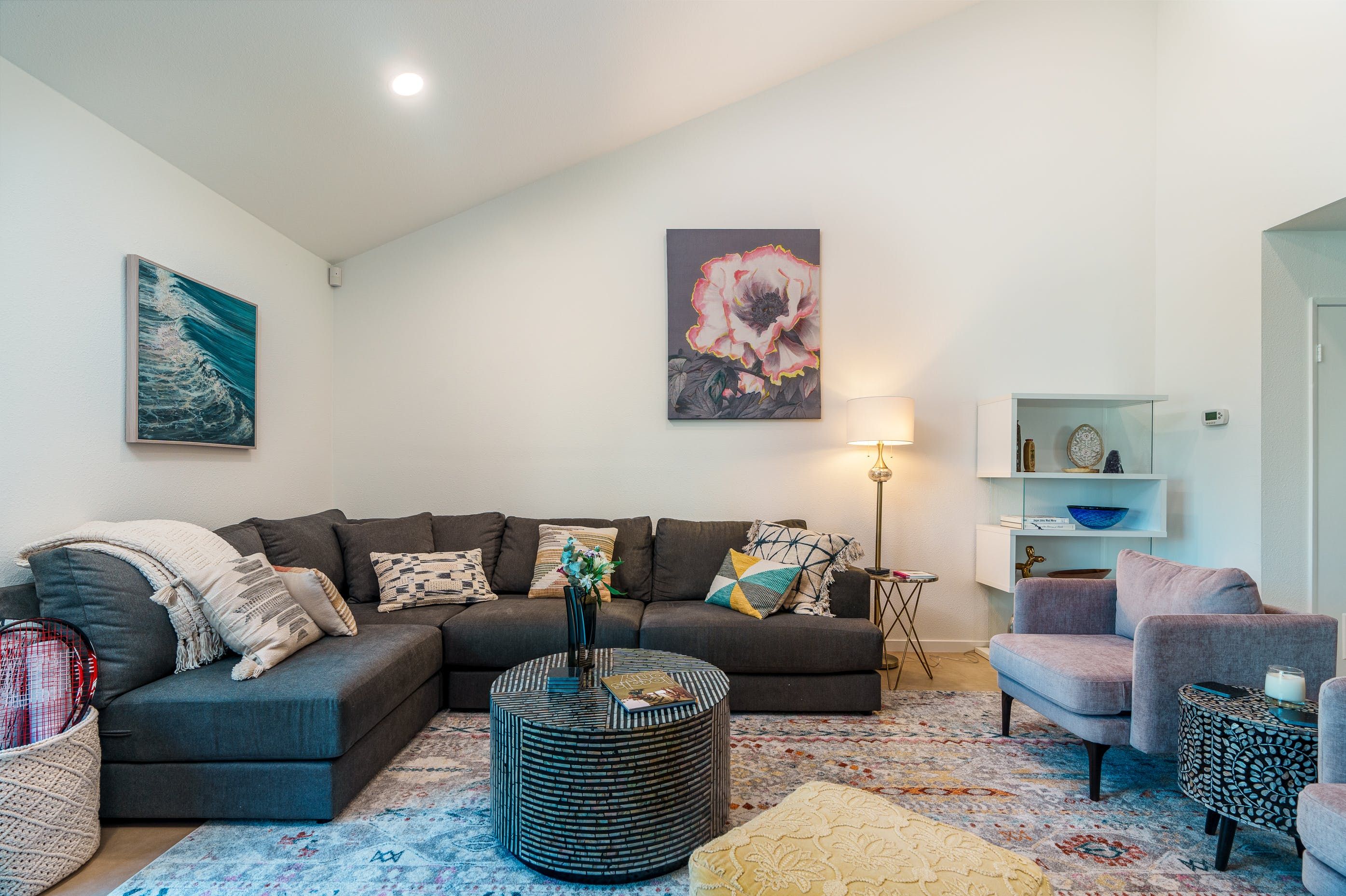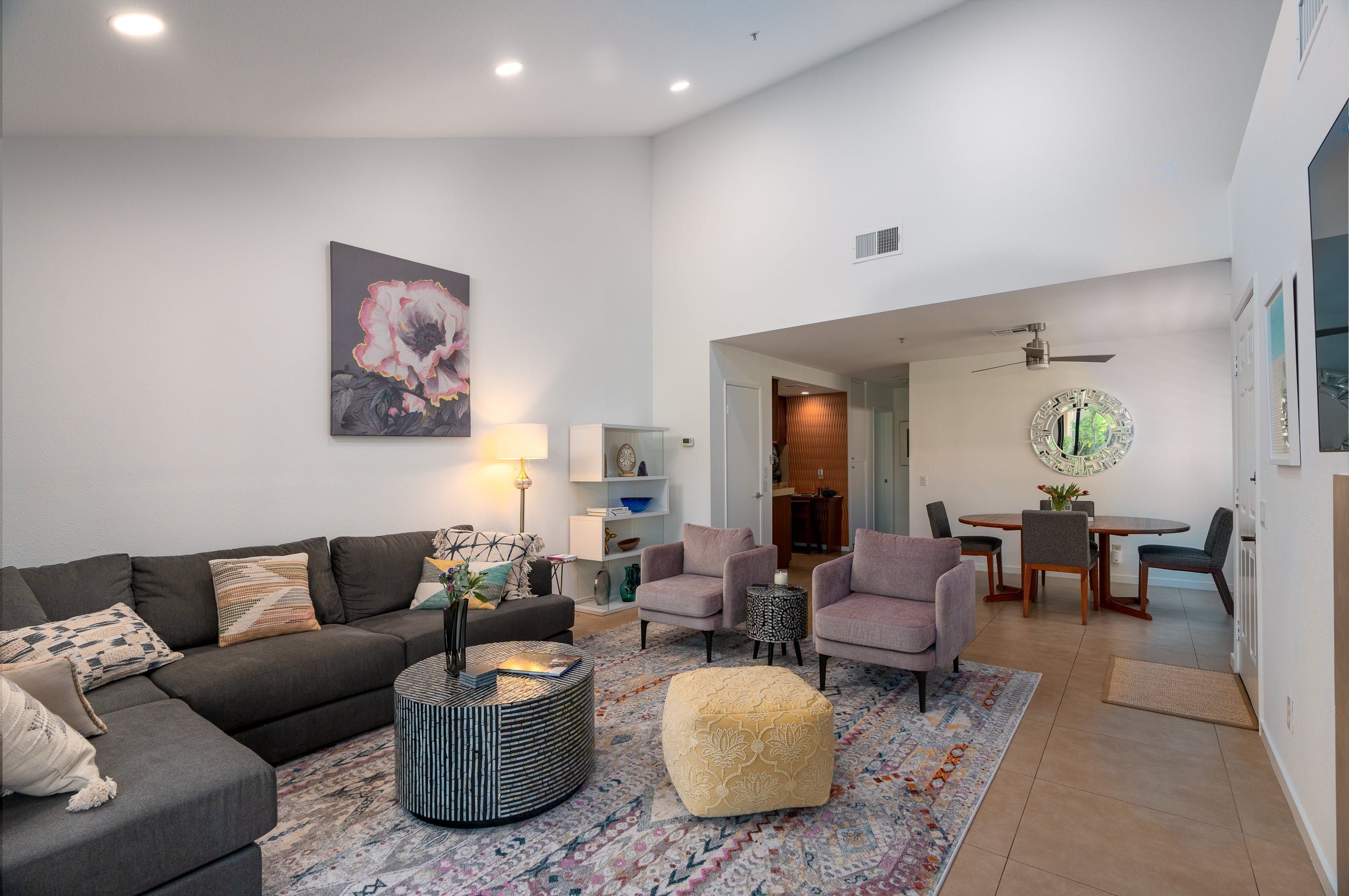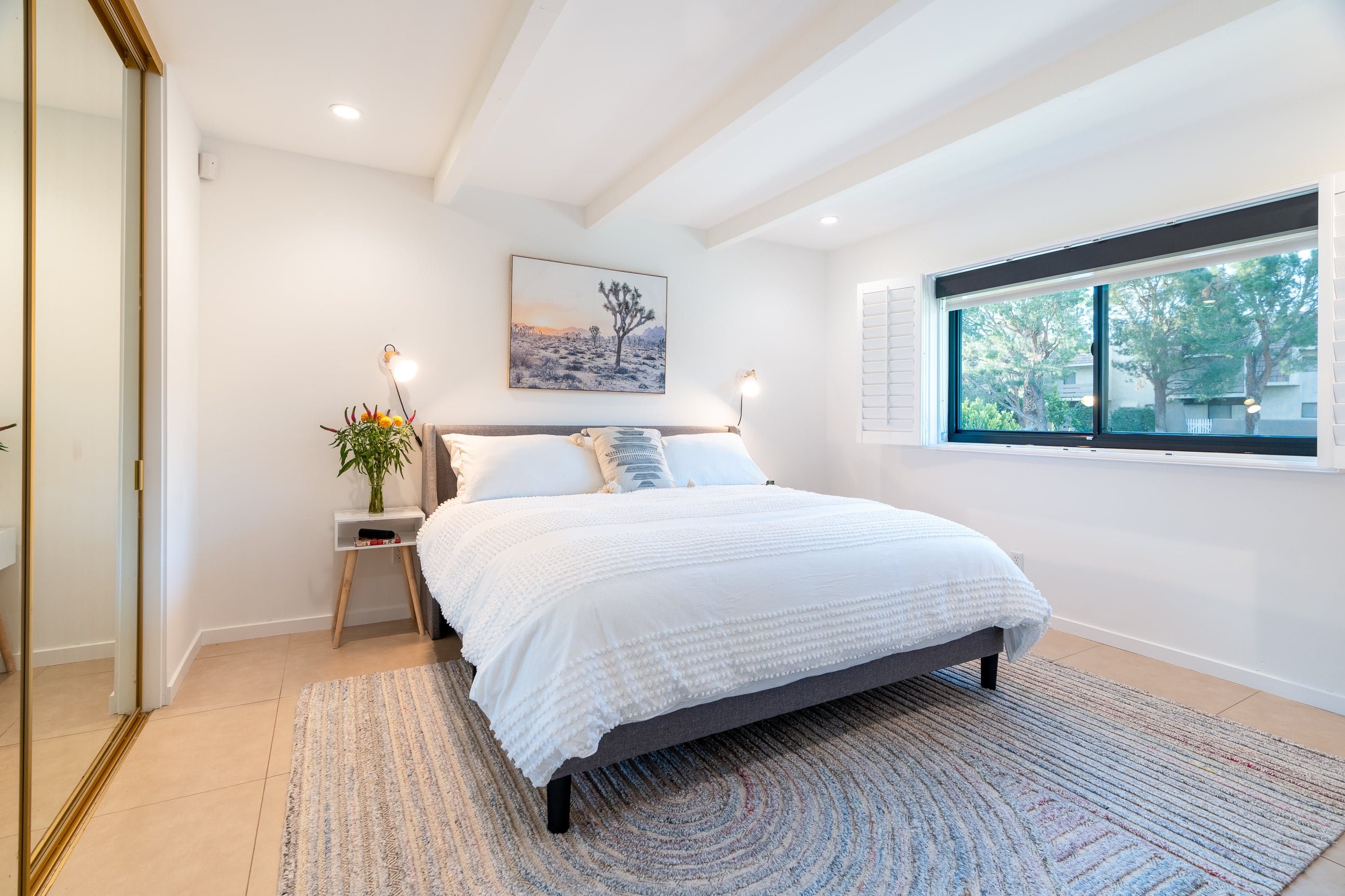 Sitting on the outer edges of Palm Springs, this condo is relatively humble, especially when compared to a lot of the lavish addresses found in the local area. The design is minimalist and inoffensive, with white walls, wooden surfaces and a few pieces of artwork peppered about the walls – although we have to concede that the fireplace adds a degree of much-welcomed hygge.