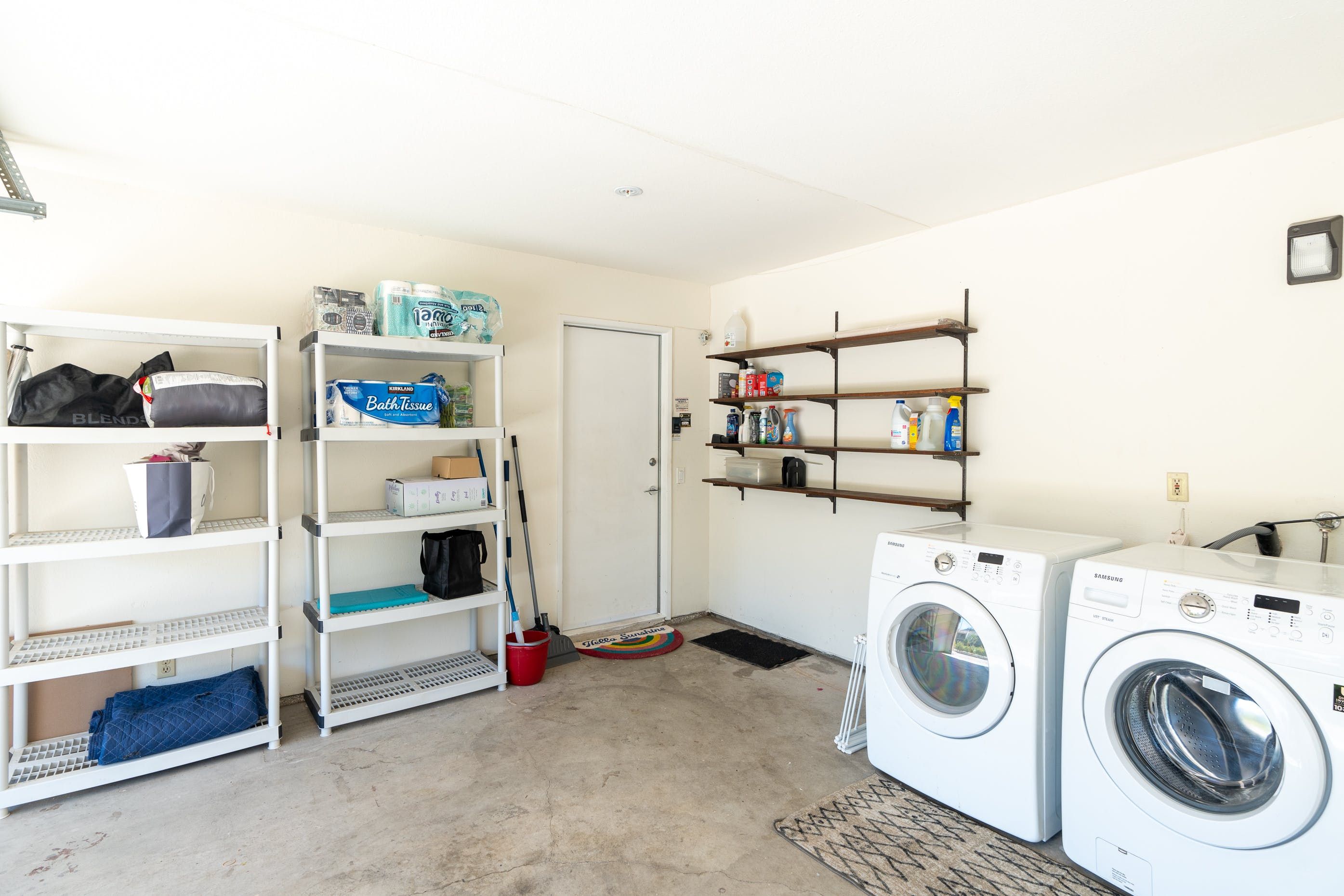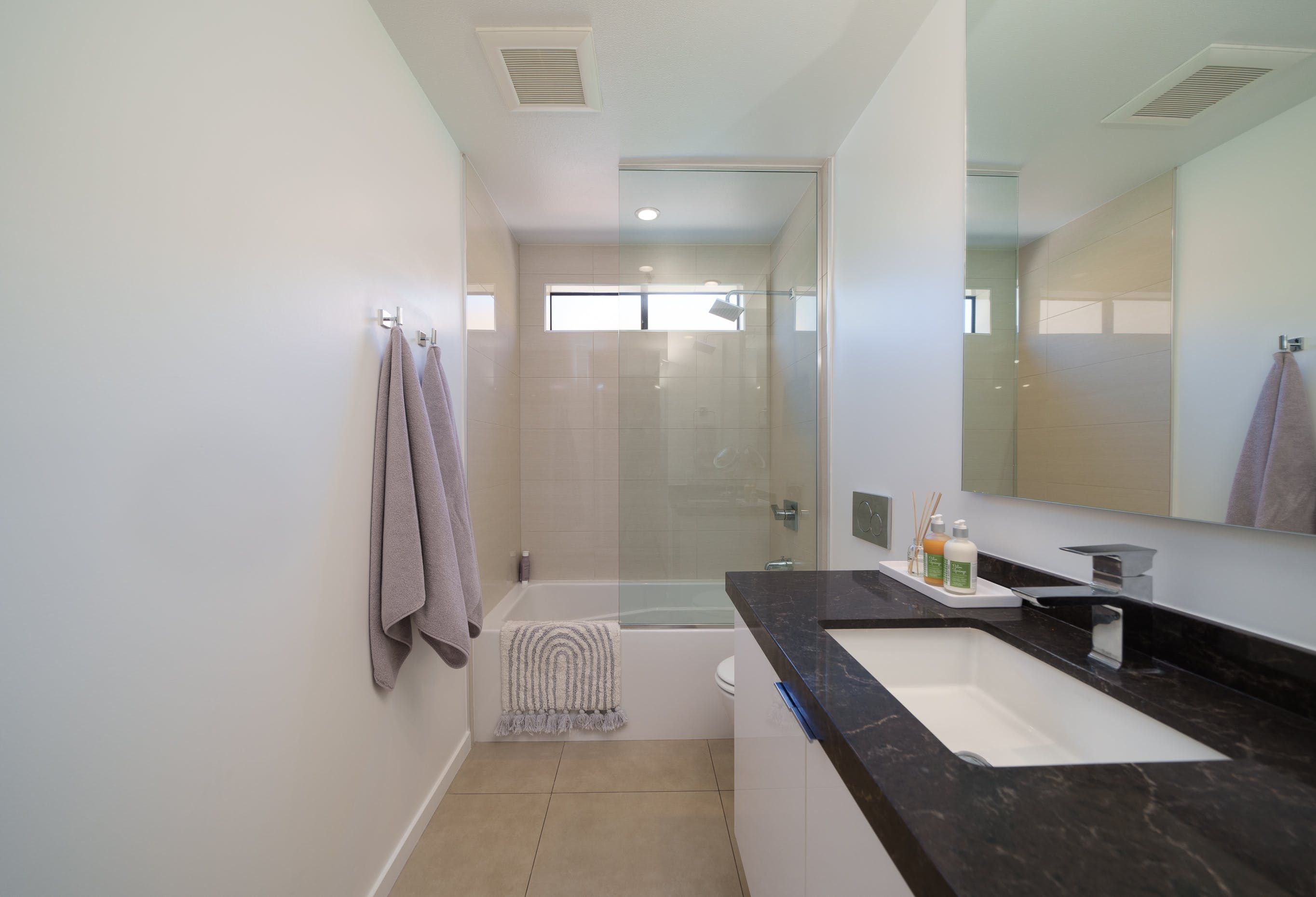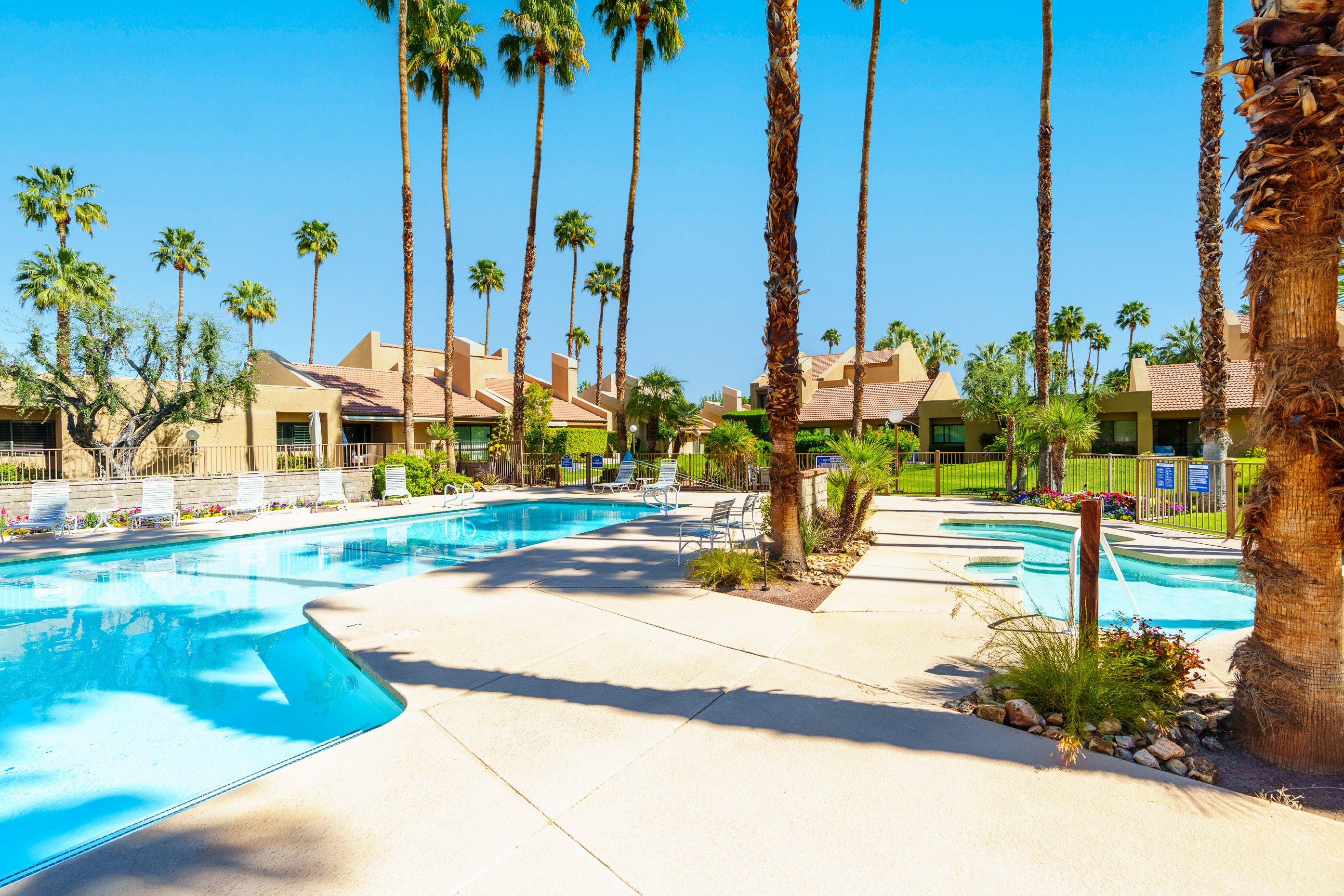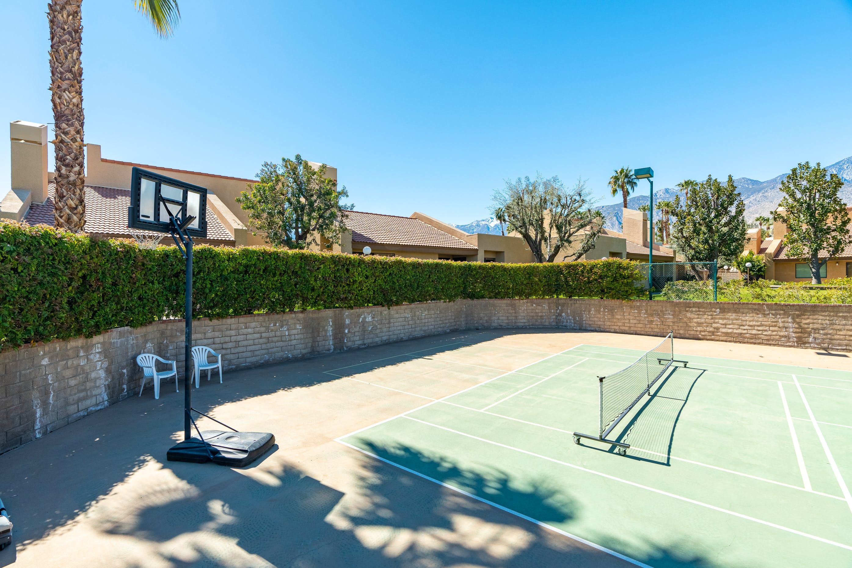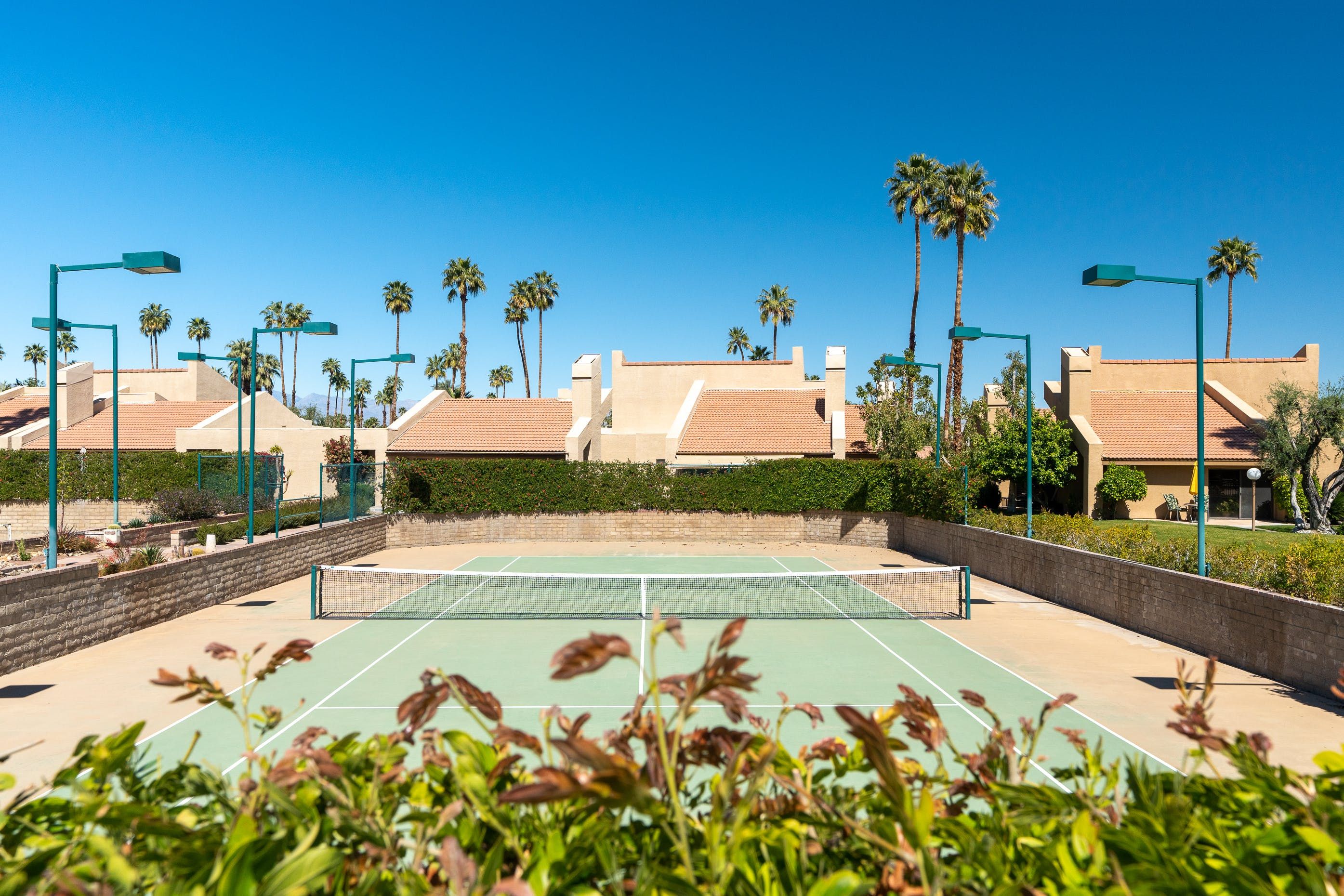 What really elevates the home, however, is the communal amenities to which guests enjoy access. Just thirty yards from the glass doors, there's an invitingly blue swimming pool and neighbouring hot tub, all surrounded by loungers and Hockney-esque palm trees. If that all sounds a little too sedate, you may also be happy to hear that there are also a pair of tennis courts and a pickle ball court, with racquets available to borrow in the home.