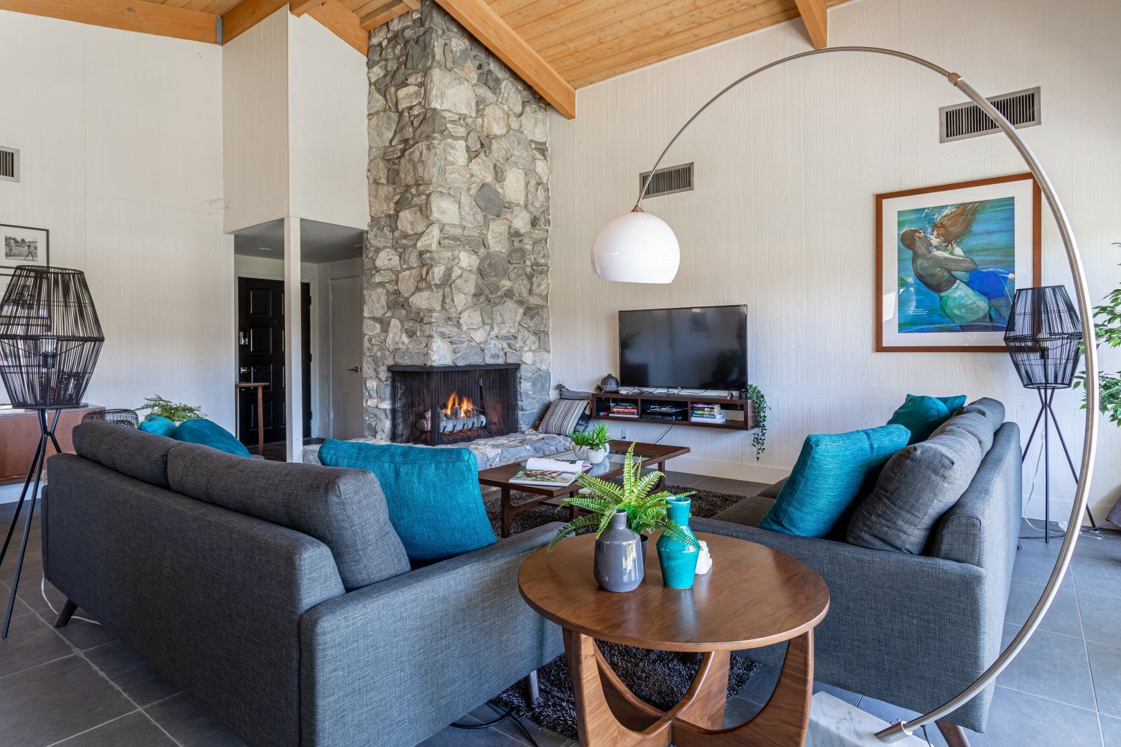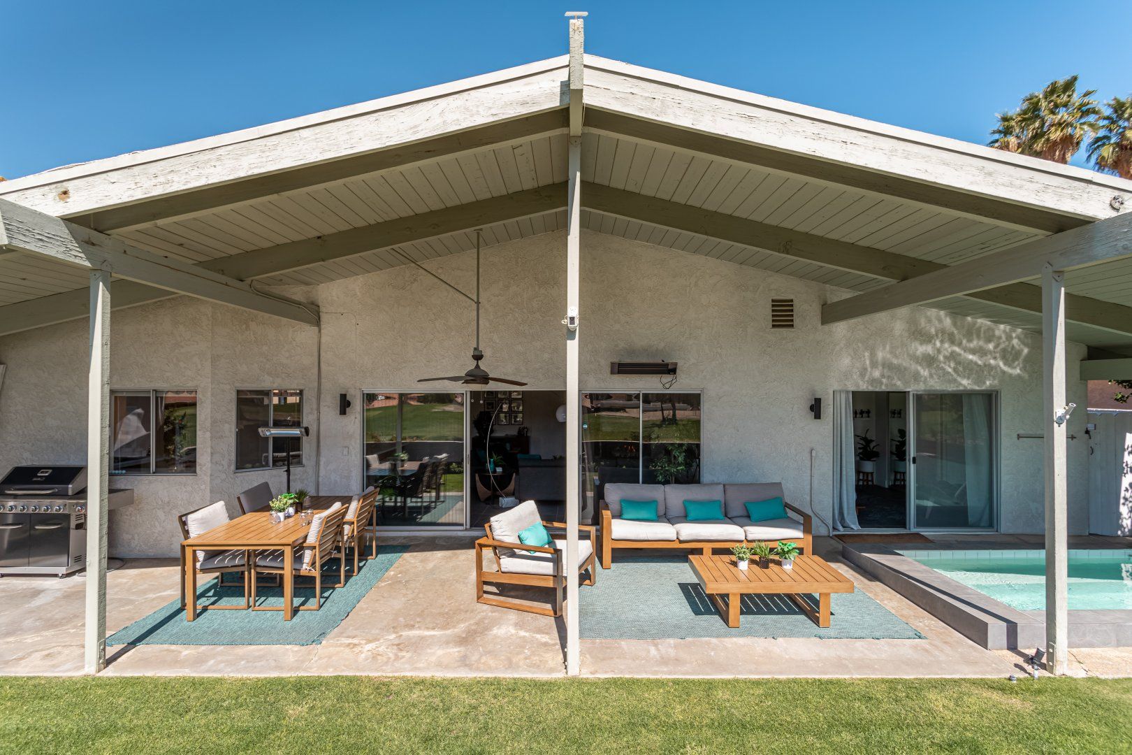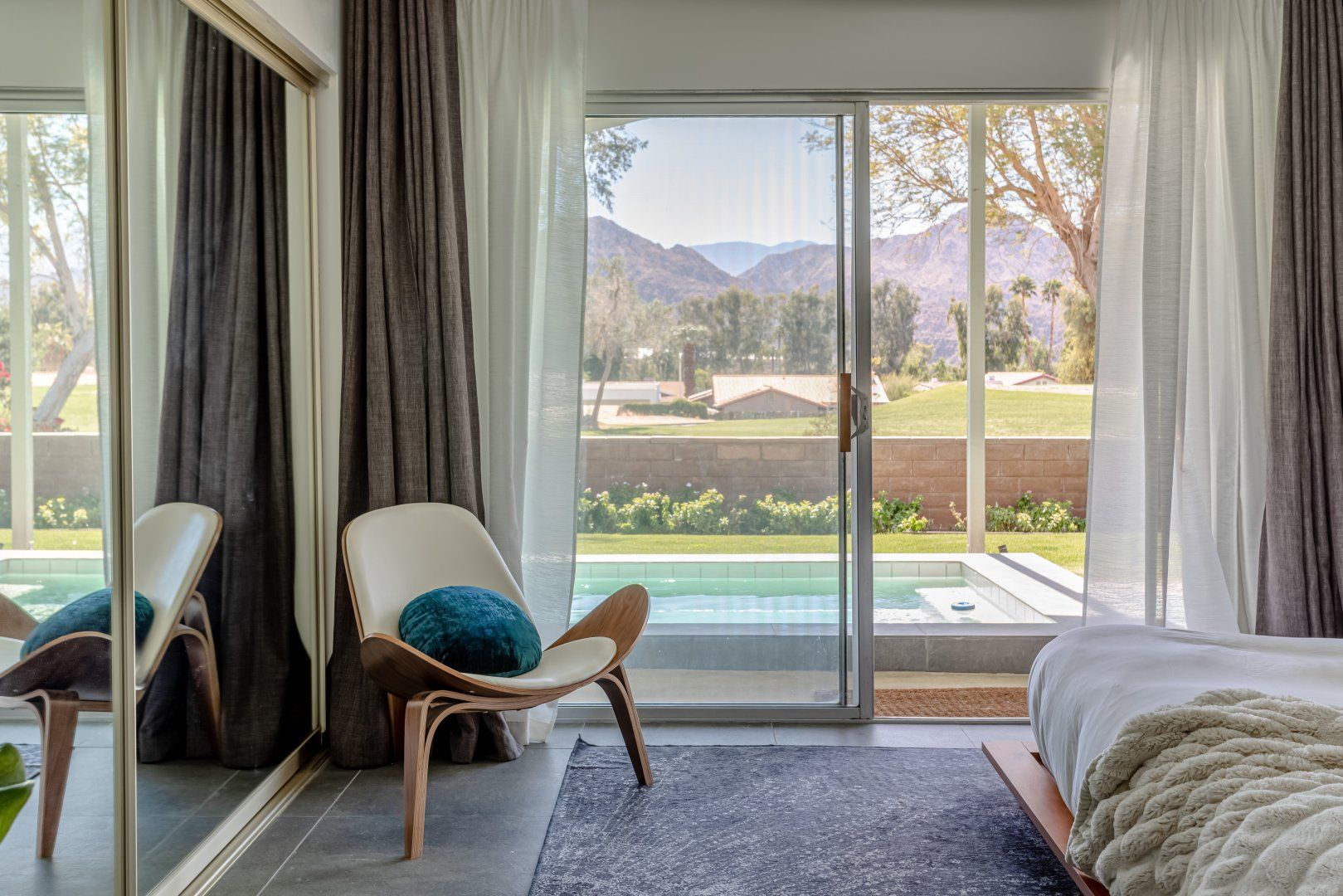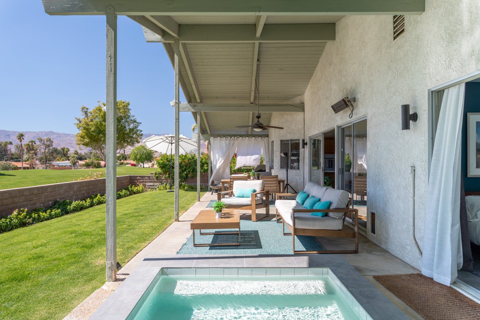 Set between the 13th and 14th holes of the Palm Desert Country Club (redesigned by maestro Gary Bickler in 2006), this spectacular home is worthy of becoming any discerning golfer's ultimate Palm Springs oasis. Built in 1972, the inside of this rad pad adopts a contemporary twist on mid-century style. In the living room, there are low slung pendants, grey sofas jazzed up with turquoise cushions and funky watercolour artwork on the walls.