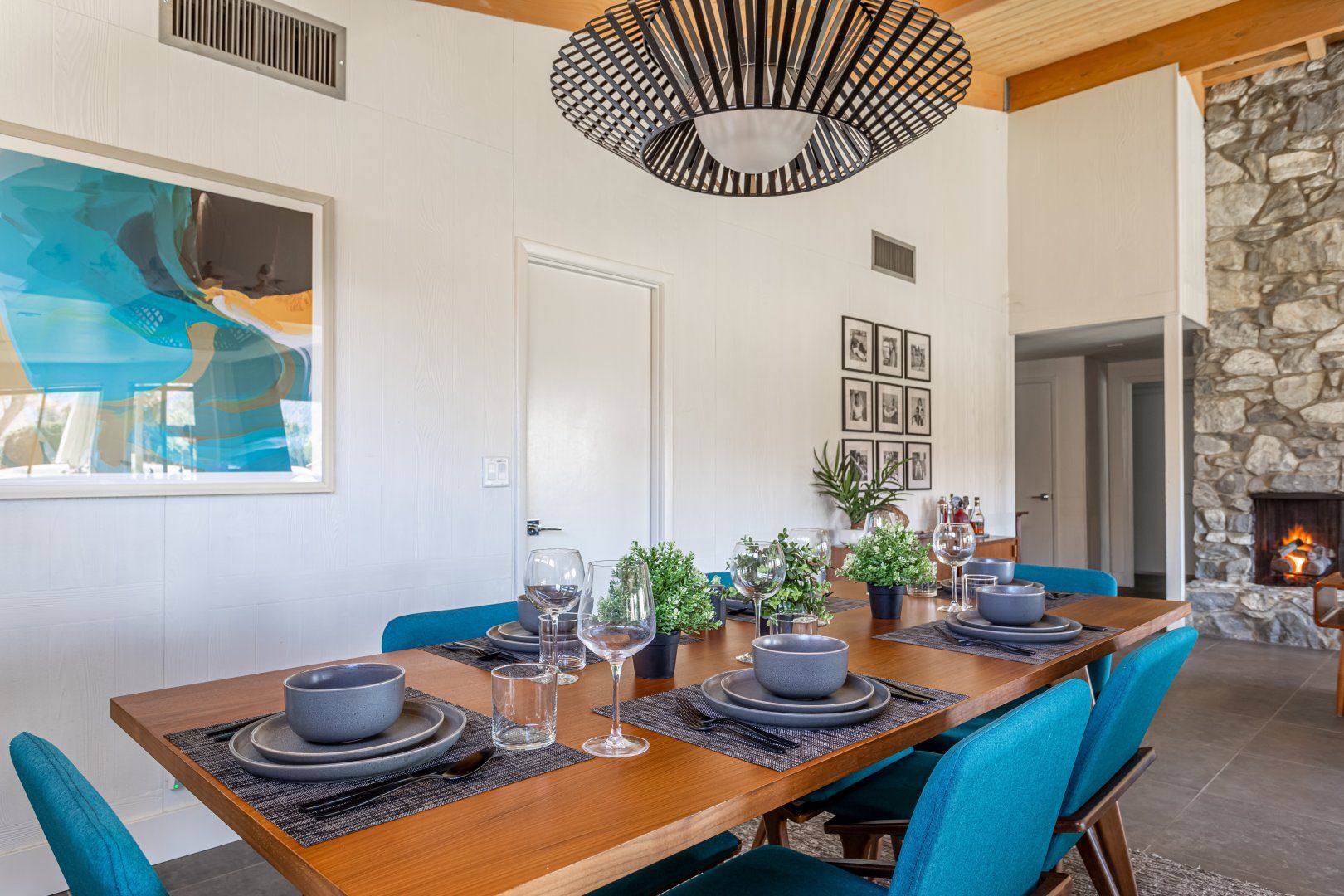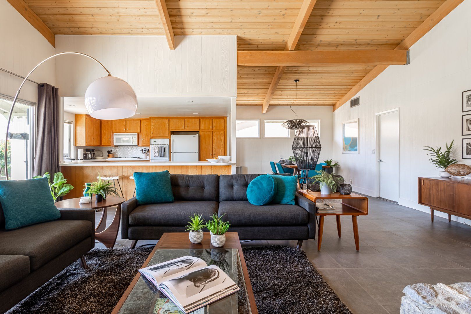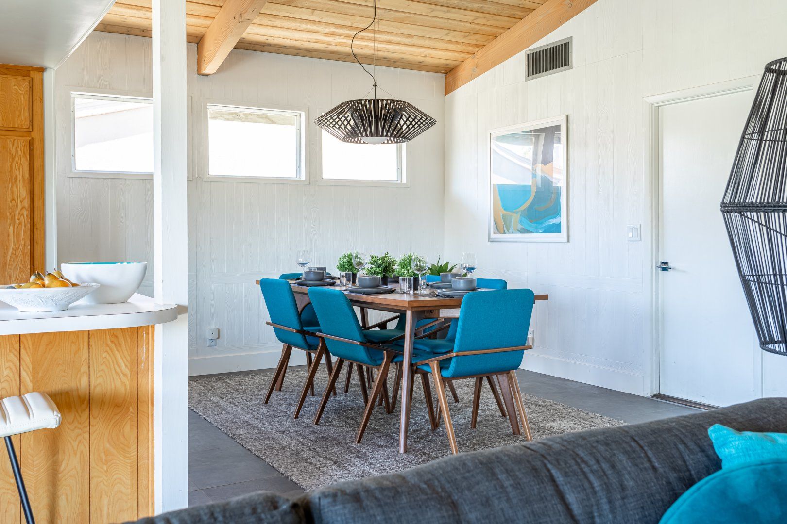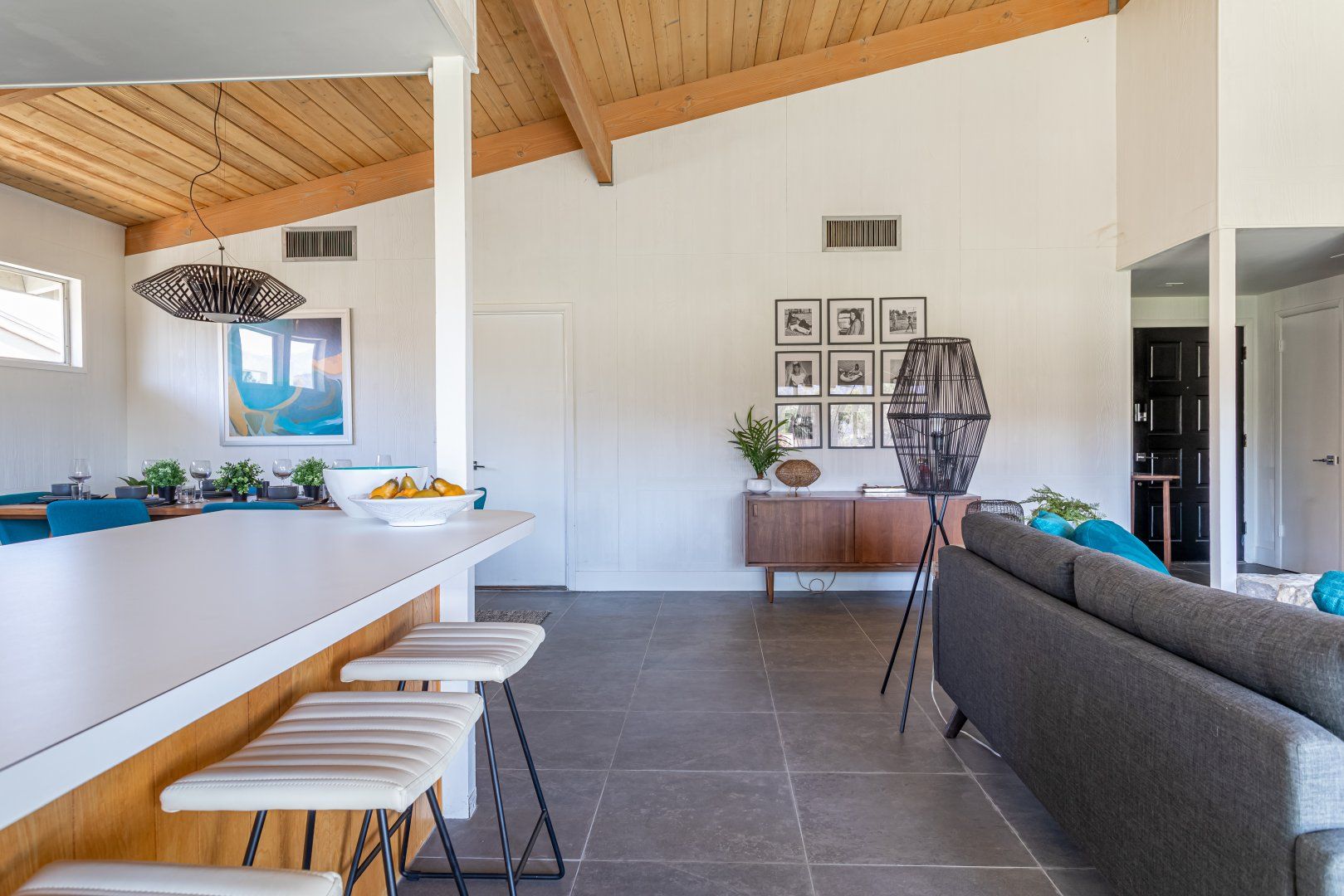 Set between the 13th and 14th holes of the Palm Desert Country Club (redesigned by maestro Gary Bickler in 2006), this spectacular home is worthy of becoming any discerning golfer's ultimate Palm Springs oasis. Built in 1972, the inside of this rad pad adopts a contemporary twist on mid-century style. In the living room, there are low slung pendants, grey sofas jazzed up with turquoise cushions and funky watercolour artwork on the walls.