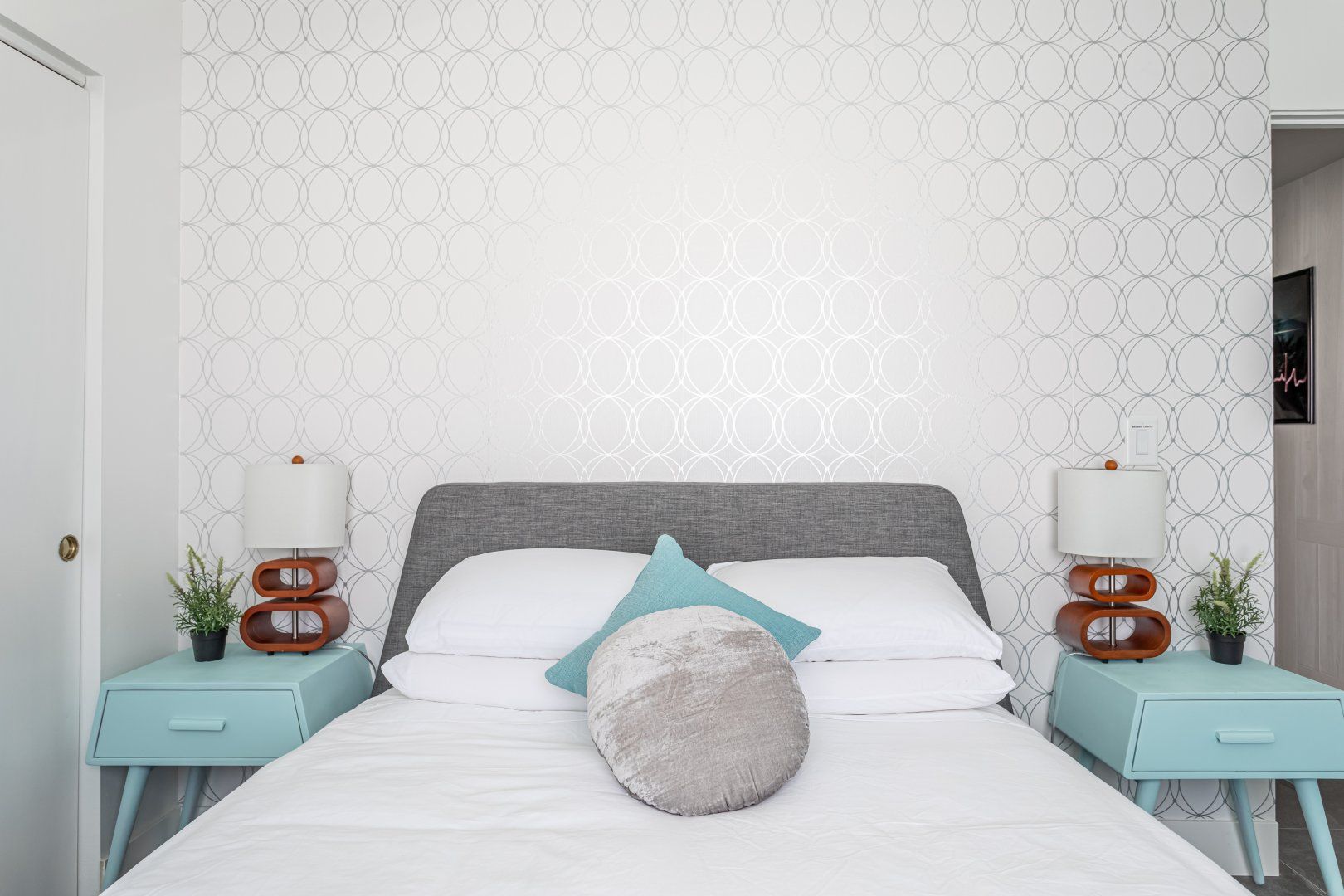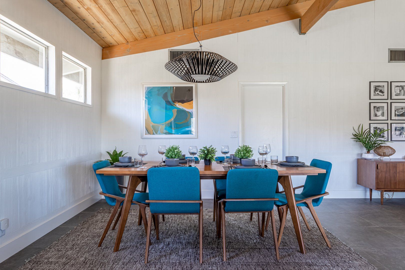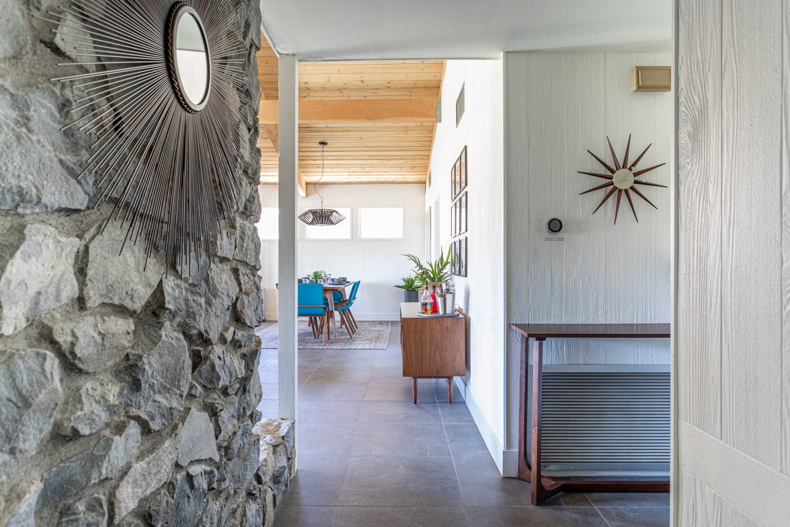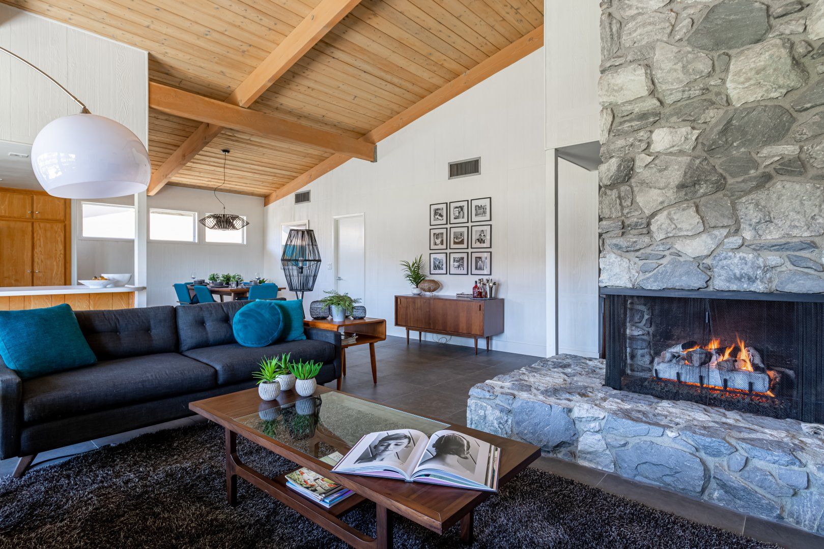 Set between the 13th and 14th holes of the Palm Desert Country Club (redesigned by maestro Gary Bickler in 2006), this spectacular home is worthy of becoming any discerning golfer's ultimate Palm Springs oasis. Built in 1972, the inside of this rad pad adopts a contemporary twist on mid-century style. In the living room, there are low slung pendants, grey sofas jazzed up with turquoise cushions and funky watercolour artwork on the walls.