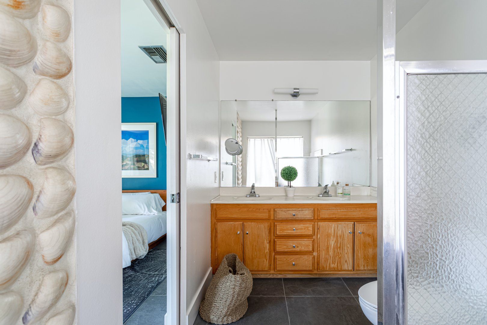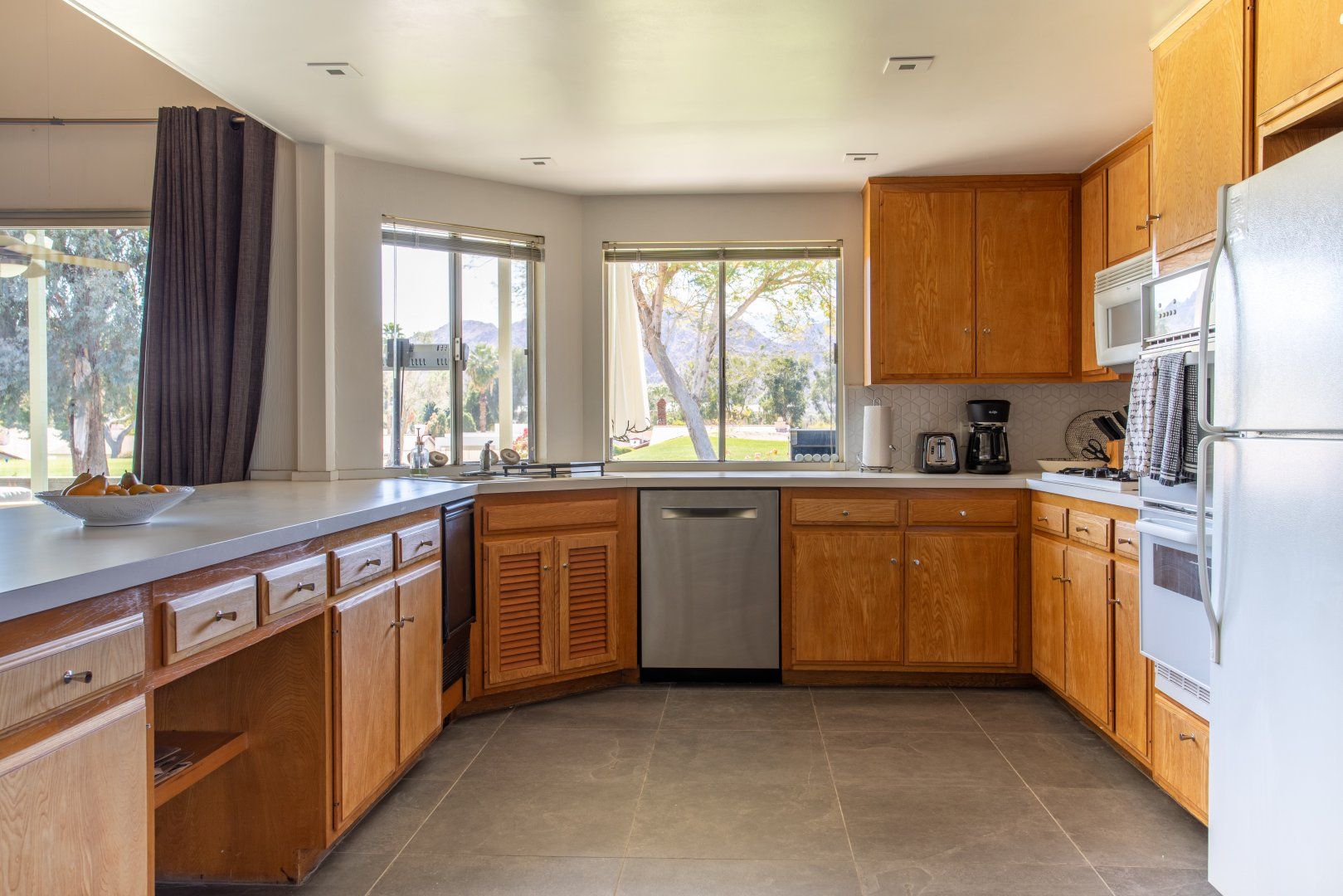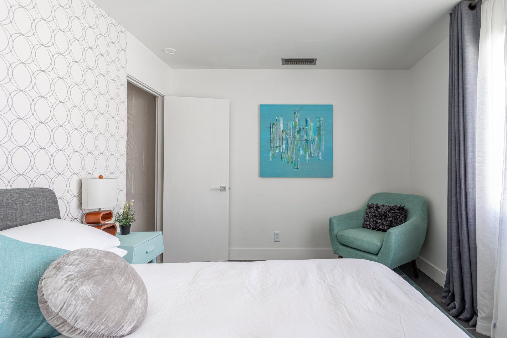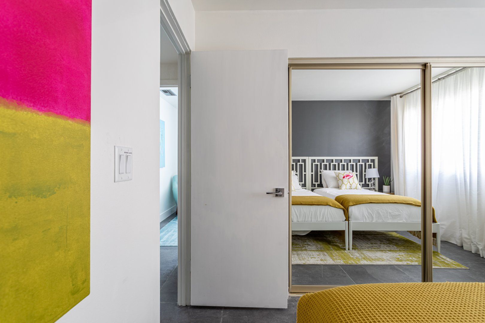 Set between the 13th and 14th holes of the Palm Desert Country Club (redesigned by maestro Gary Bickler in 2006), this spectacular home is worthy of becoming any discerning golfer's ultimate Palm Springs oasis. Built in 1972, the inside of this rad pad adopts a contemporary twist on mid-century style. In the living room, there are low slung pendants, grey sofas jazzed up with turquoise cushions and funky watercolour artwork on the walls.