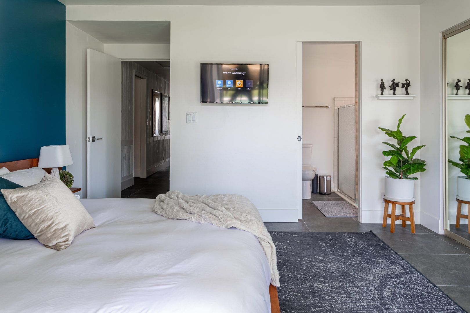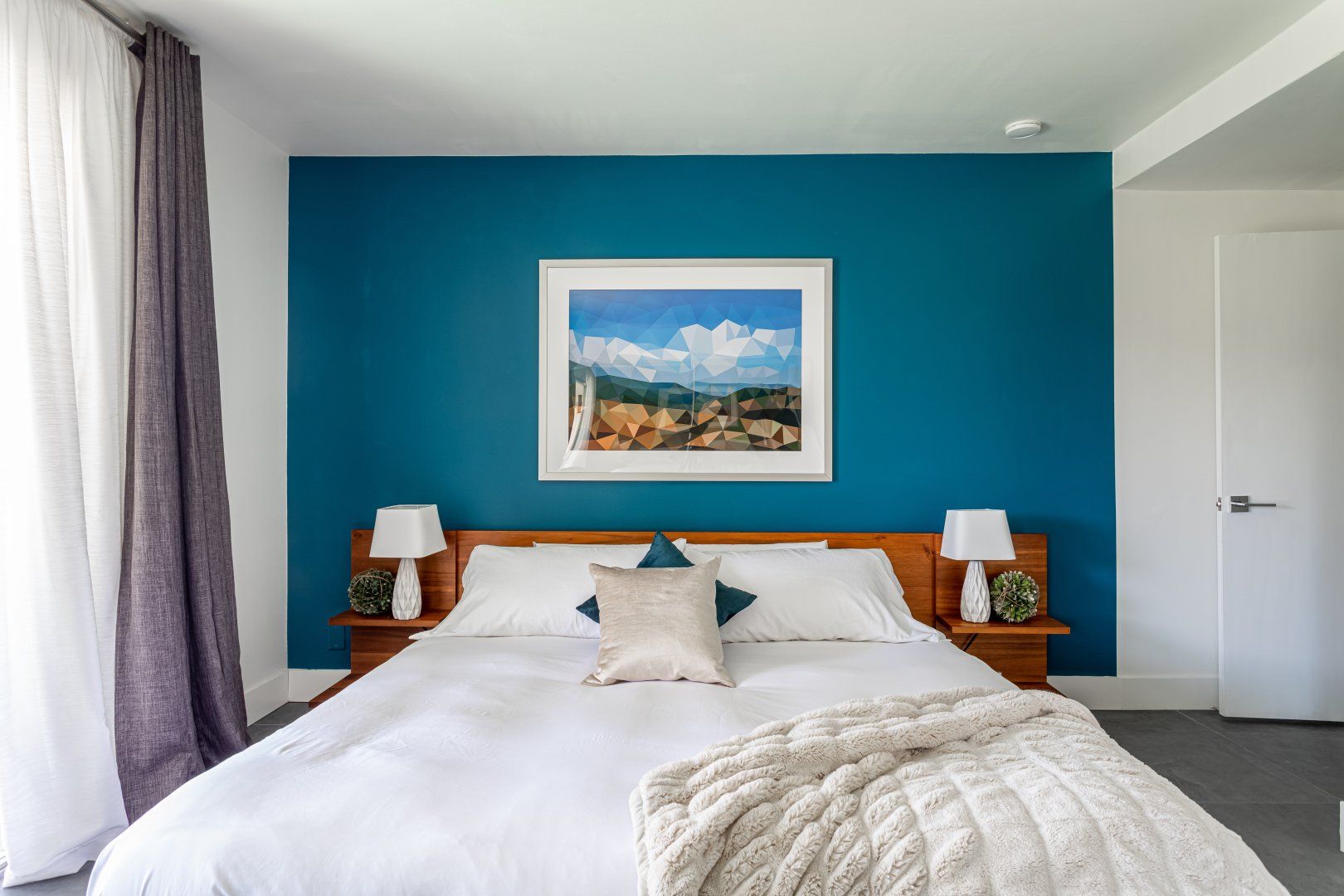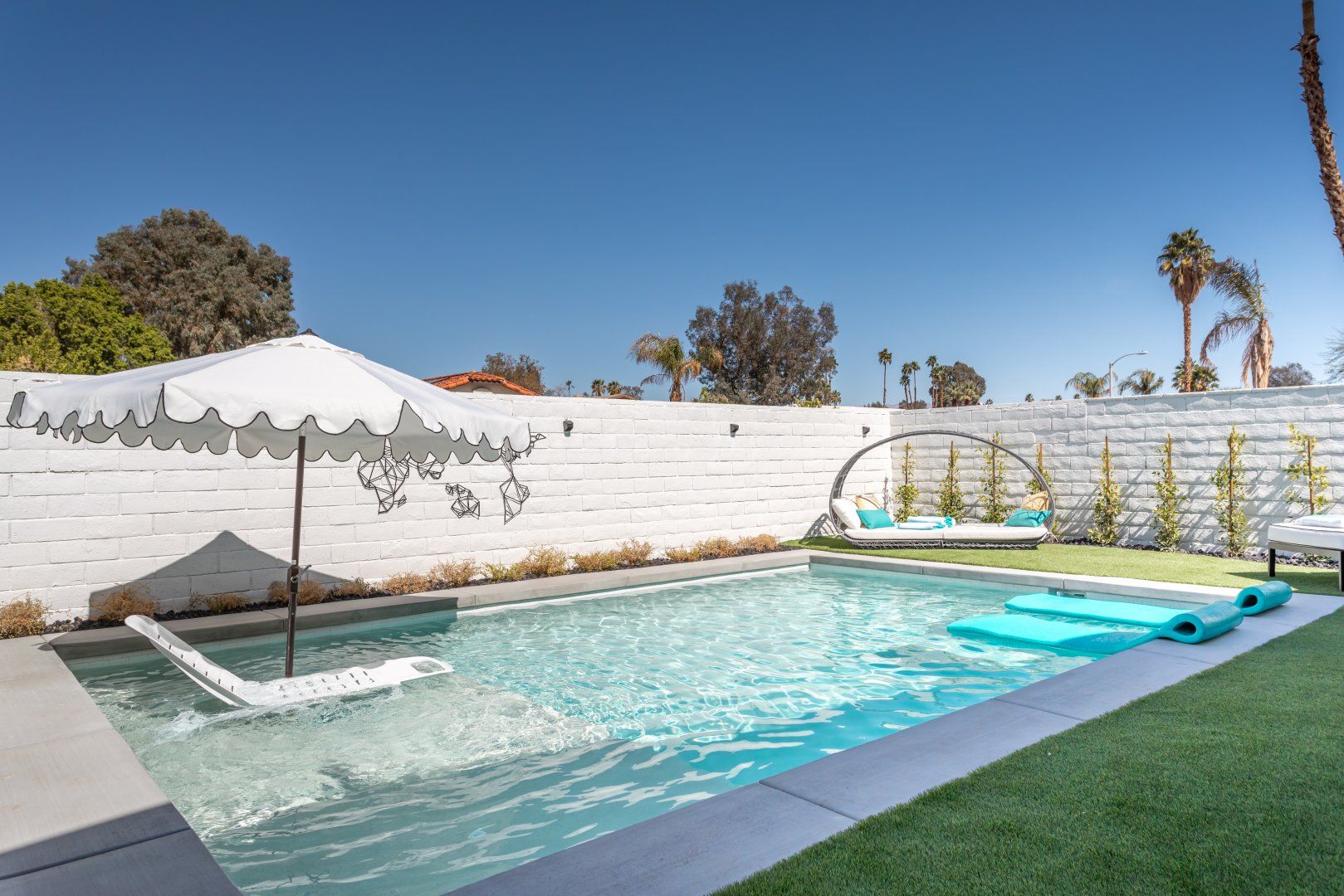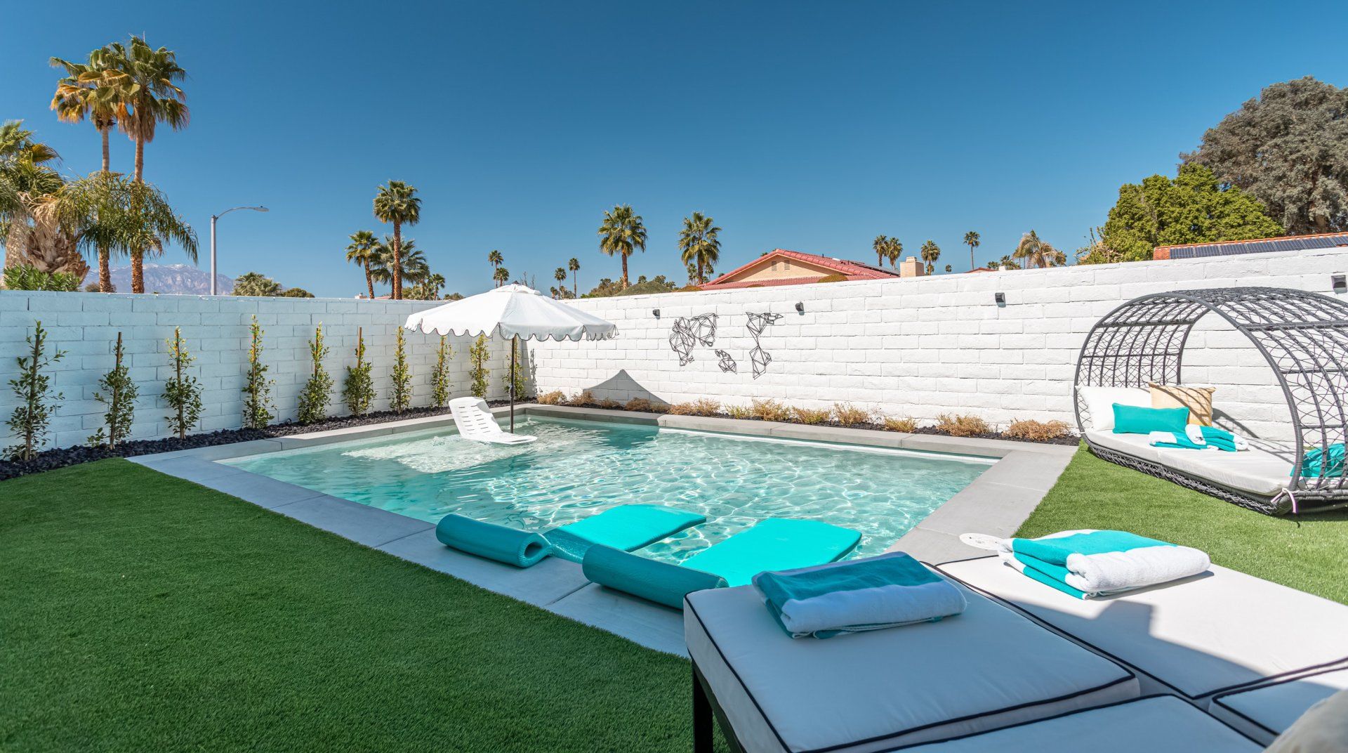 The bedrooms are all playfully styled, with flamingo print bedding and luxurious faux fur throws. There's an abundance of light in most rooms thanks to generous windows and sliding glass doors, and we love how you can walk straight from the master bedroom into the bubbling jacuzzi. The glittering swimming pool is the ideal spot to stretch out and cool down, and at nightfall, we can't think of anywhere better to be than sitting next to the flickering fire pit while nursing a tumbler of whisky.
