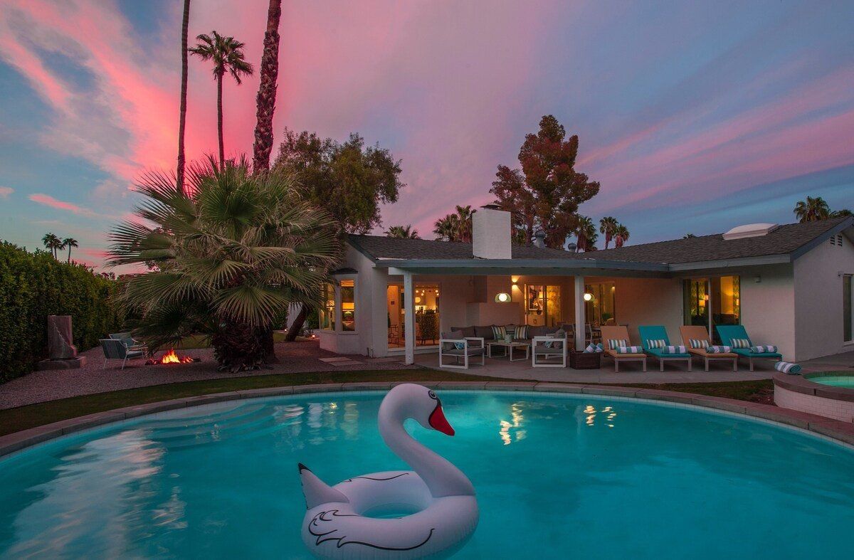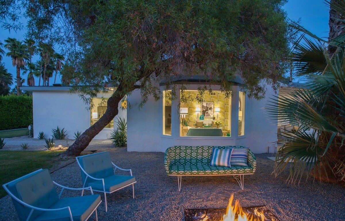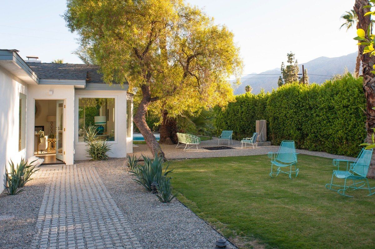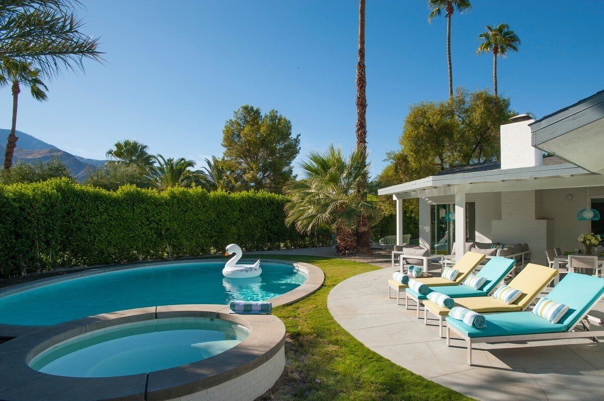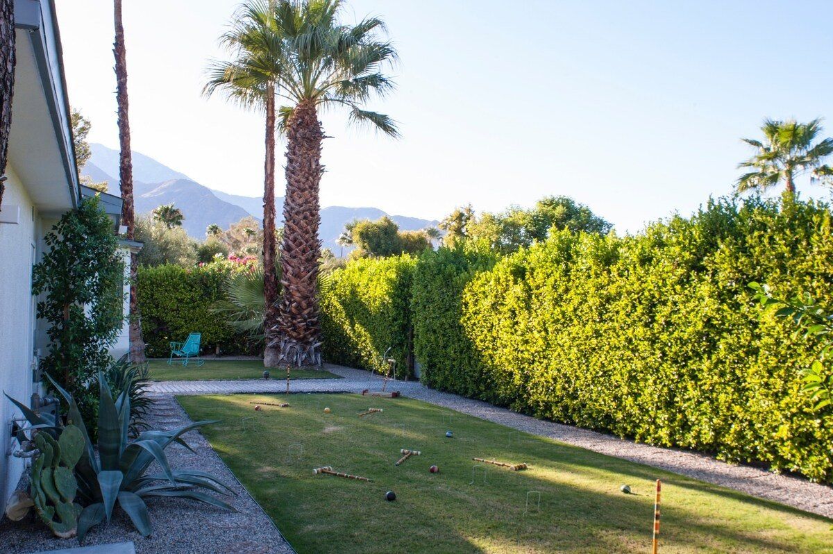On a corner spot surrounded by high hedges, this Palm Springs home feels private and peaceful. Inside, mid-century style mixes with tropical colours and patterns, which makes for quite a playful atmosphere. There's nothing shy about it, but we love the whimsical wallpaper choices and bold pops of colour. But the real draw here is the garden. As well as the oval-shaped pool, there’s a gas fire pit built into the ground, a croquet lawn and a barbecue, all with views of the San Jacinto Mountains. It's your own little oasis — you can easily spend all day cooling off in the pool and lounging in the sun. If you feel up for an adventure, downtown Palm Springs is just a twenty-minute walk away, and there are plenty of nature trails and hiking spots close by, too.