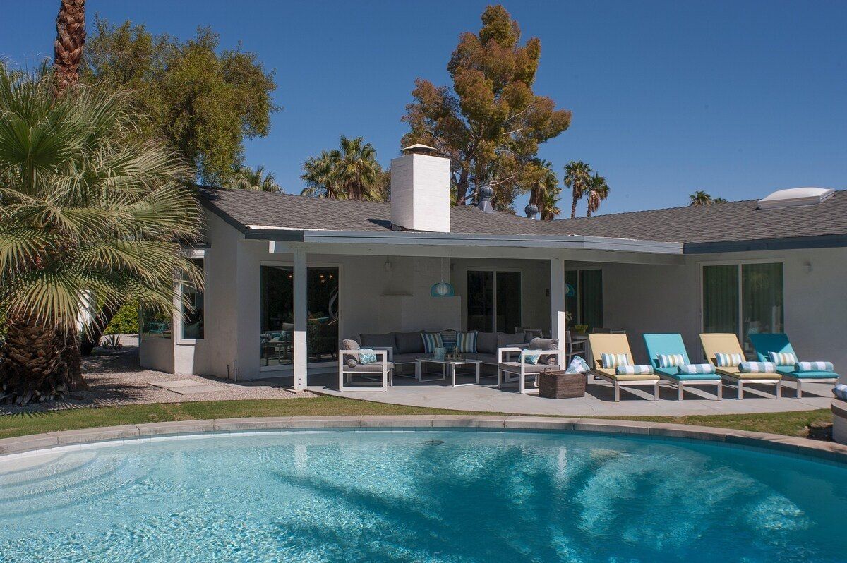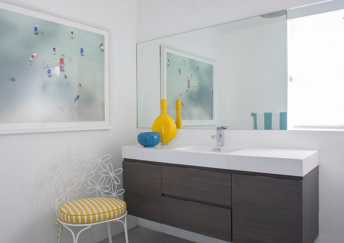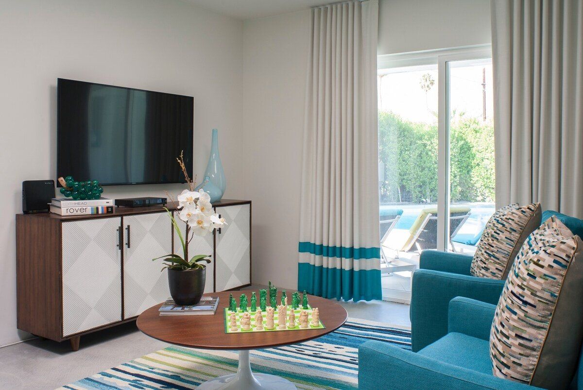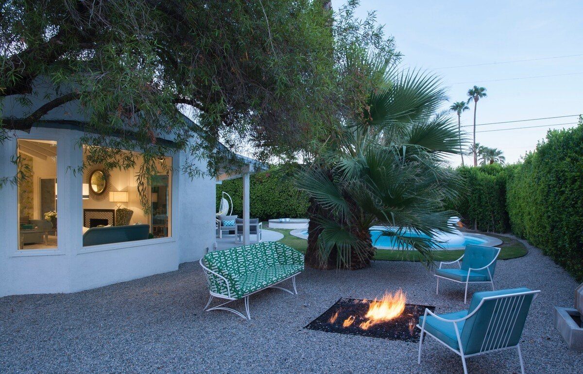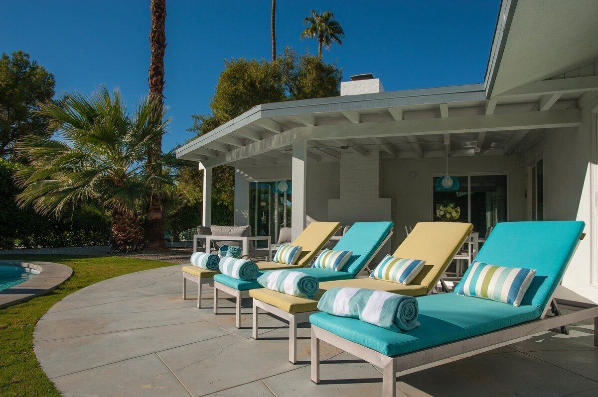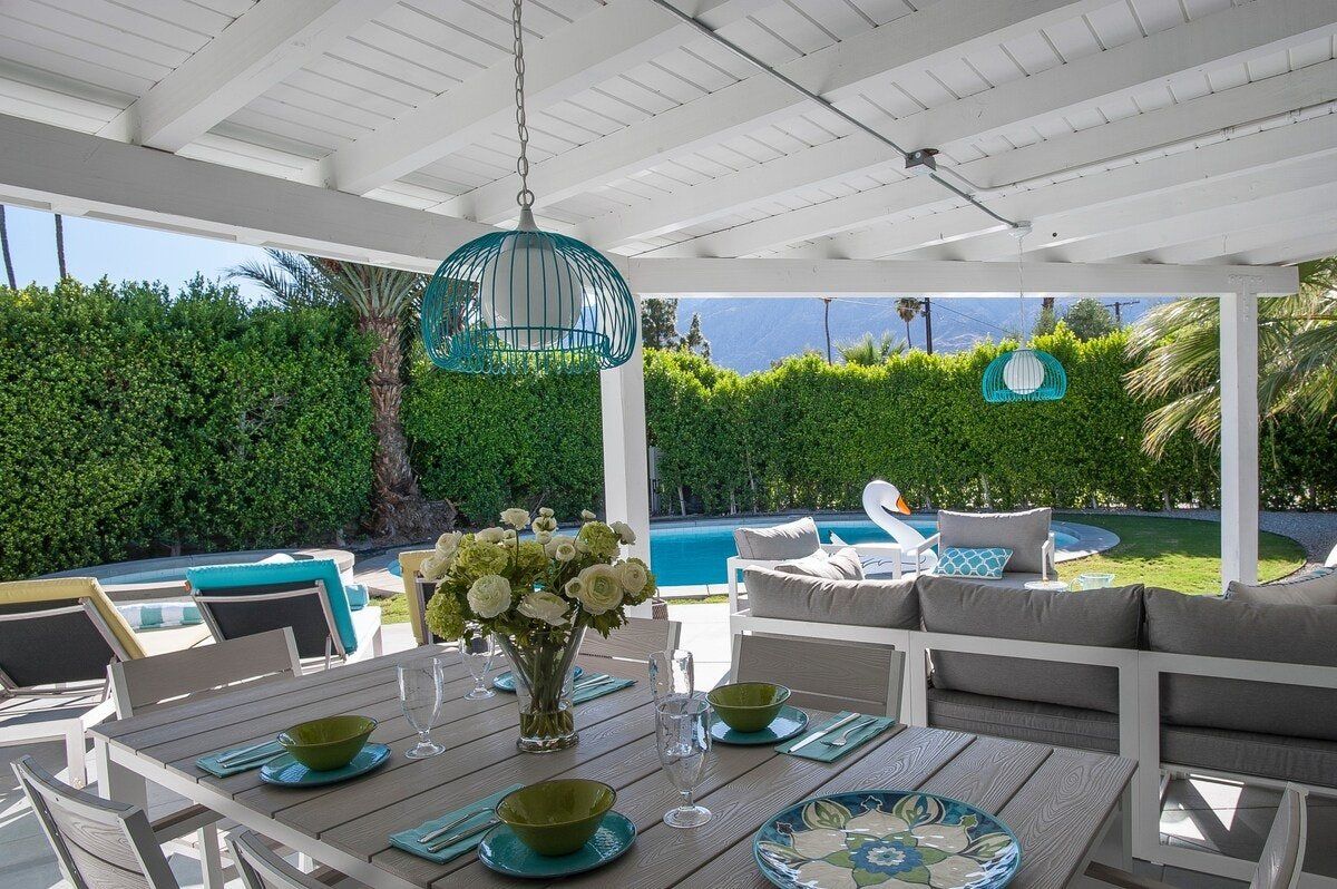 On a corner spot surrounded by high hedges, this Palm Springs home feels private and peaceful. Inside, mid-century style mixes with tropical colours and patterns, which makes for quite a playful atmosphere. There's nothing shy about it, but we love the whimsical wallpaper choices and bold pops of colour. But the real draw here is the garden. As well as the oval-shaped pool, there’s a gas fire pit built into the ground, a croquet lawn and a barbecue, all with views of the San Jacinto Mountains. It's your own little oasis — you can easily spend all day cooling off in the pool and lounging in the sun. If you feel up for an adventure, downtown Palm Springs is just a twenty-minute walk away, and there are plenty of nature trails and hiking spots close by, too.