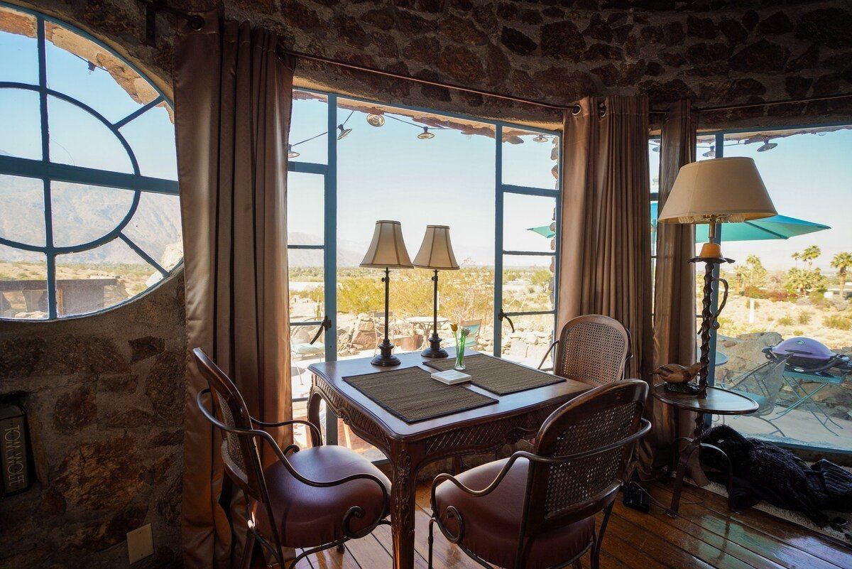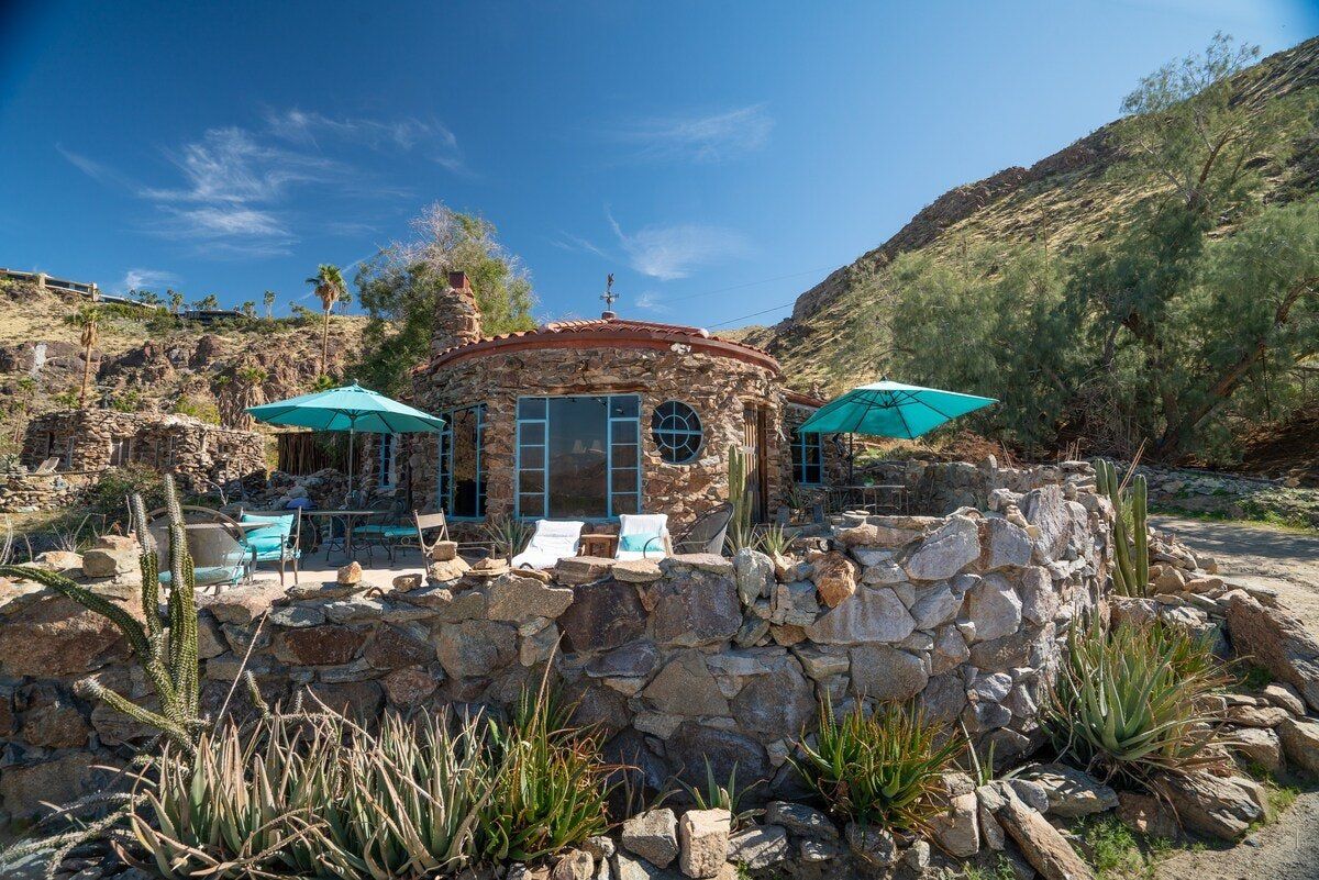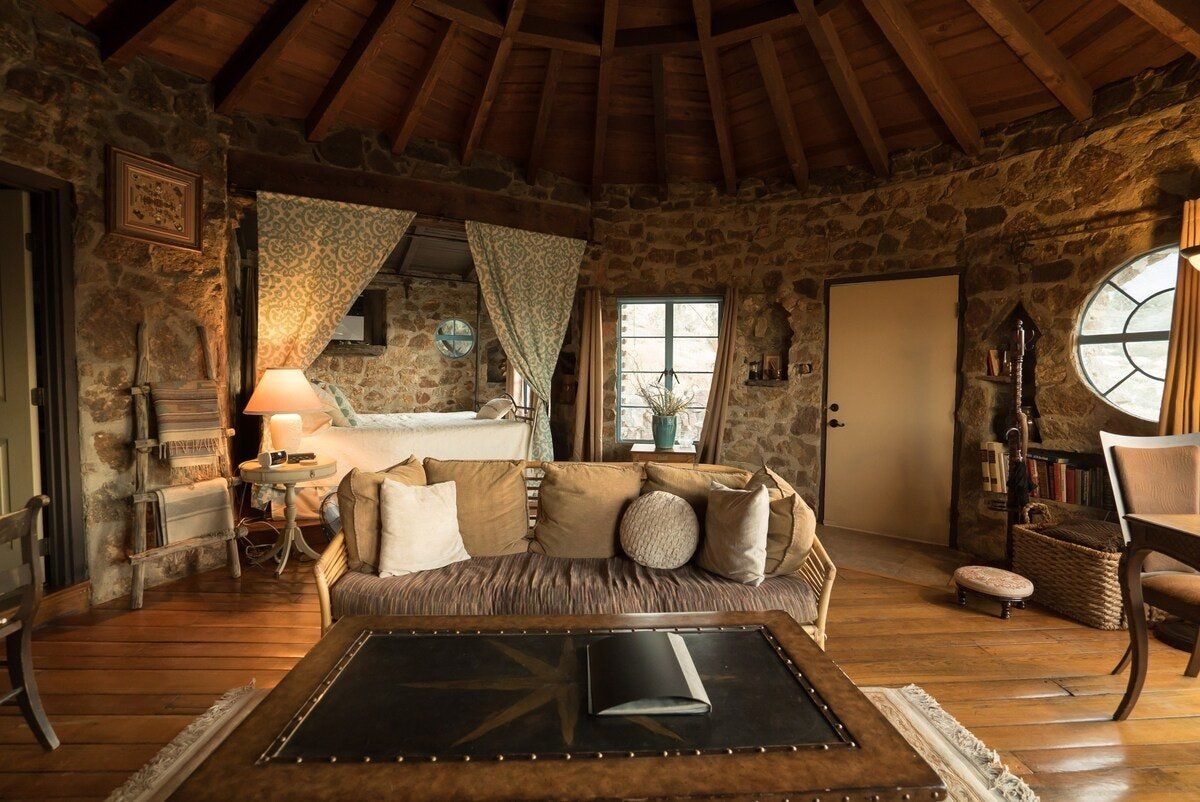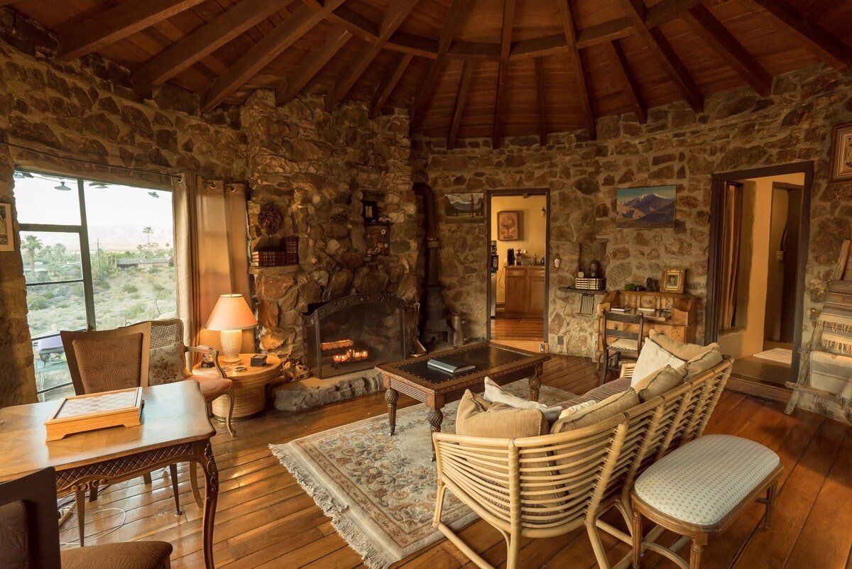 In the dramatic desert landscape of Araby Cove, this little rustic gem could almost be mistaken for part of the rocky hillside. But is that a chimney we spy? And aren’t those sun loungers? A round cottage, built from stone, it’s cosy and cute. Perched on a hilltop, the views from the yard and the huge picture-frame window at the heart of the living space are simply breathtaking. Inside, the stone walls and circular wooden ceiling ooze boho chic. The four-poster bed, tucked into one side, provides a luxurious sleeping nook and candles in the stone fireplace add a touch of romance. The cottage-style kitchen is compact but has everything you could need. Besides, there's a barbecue and dining area on the patio for meals under the desert stars. The area is said to be a ‘wind free zone’, with great hiking and mountain bike trails on the doorstep, and Palm Springs is just a short drive away.