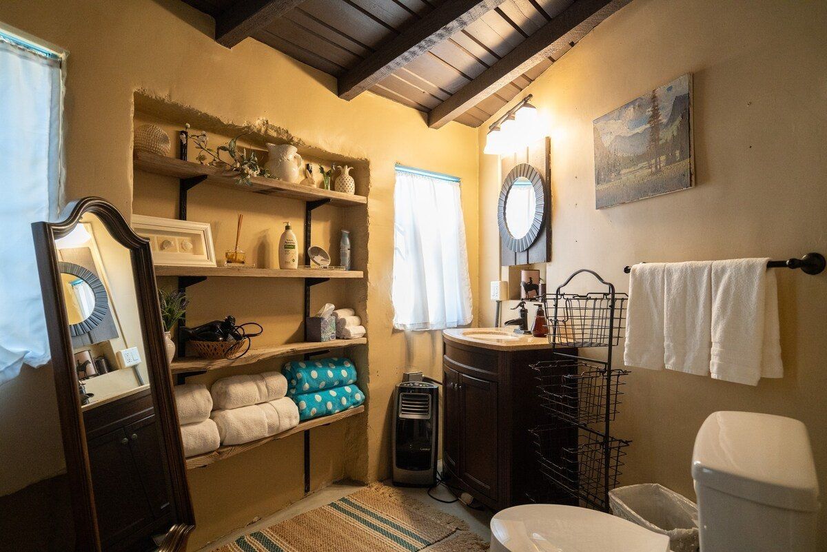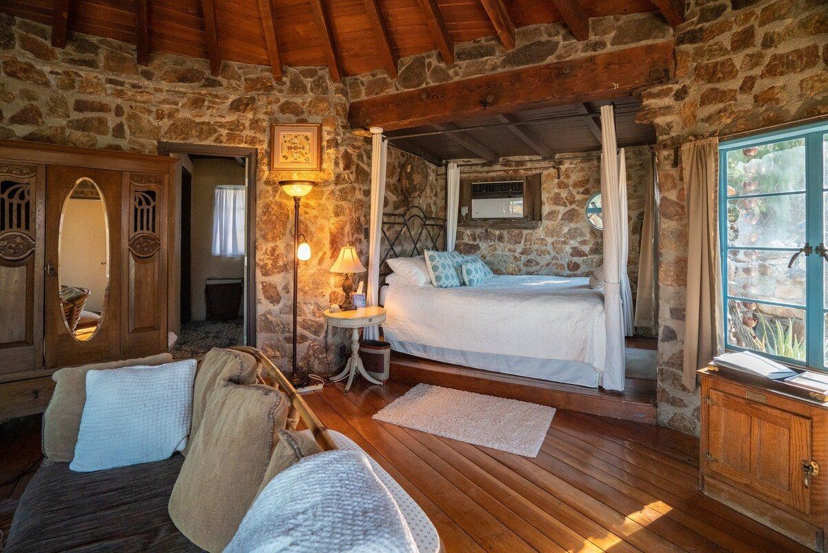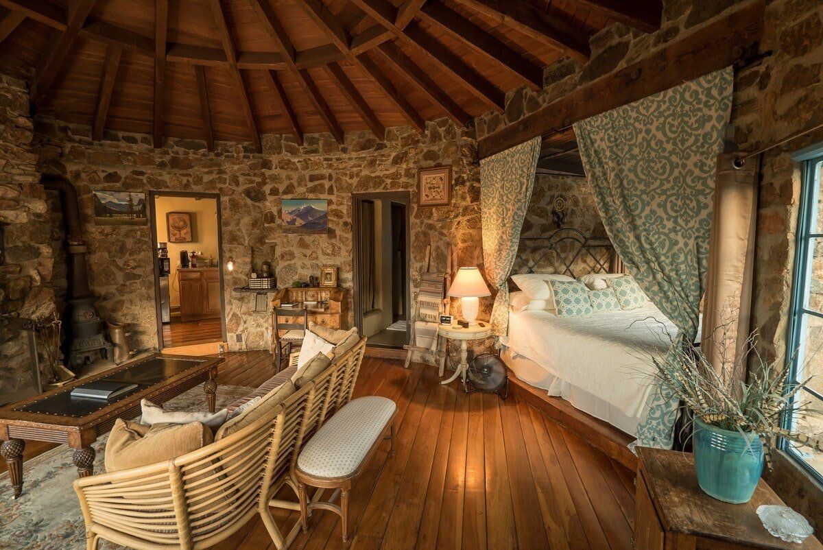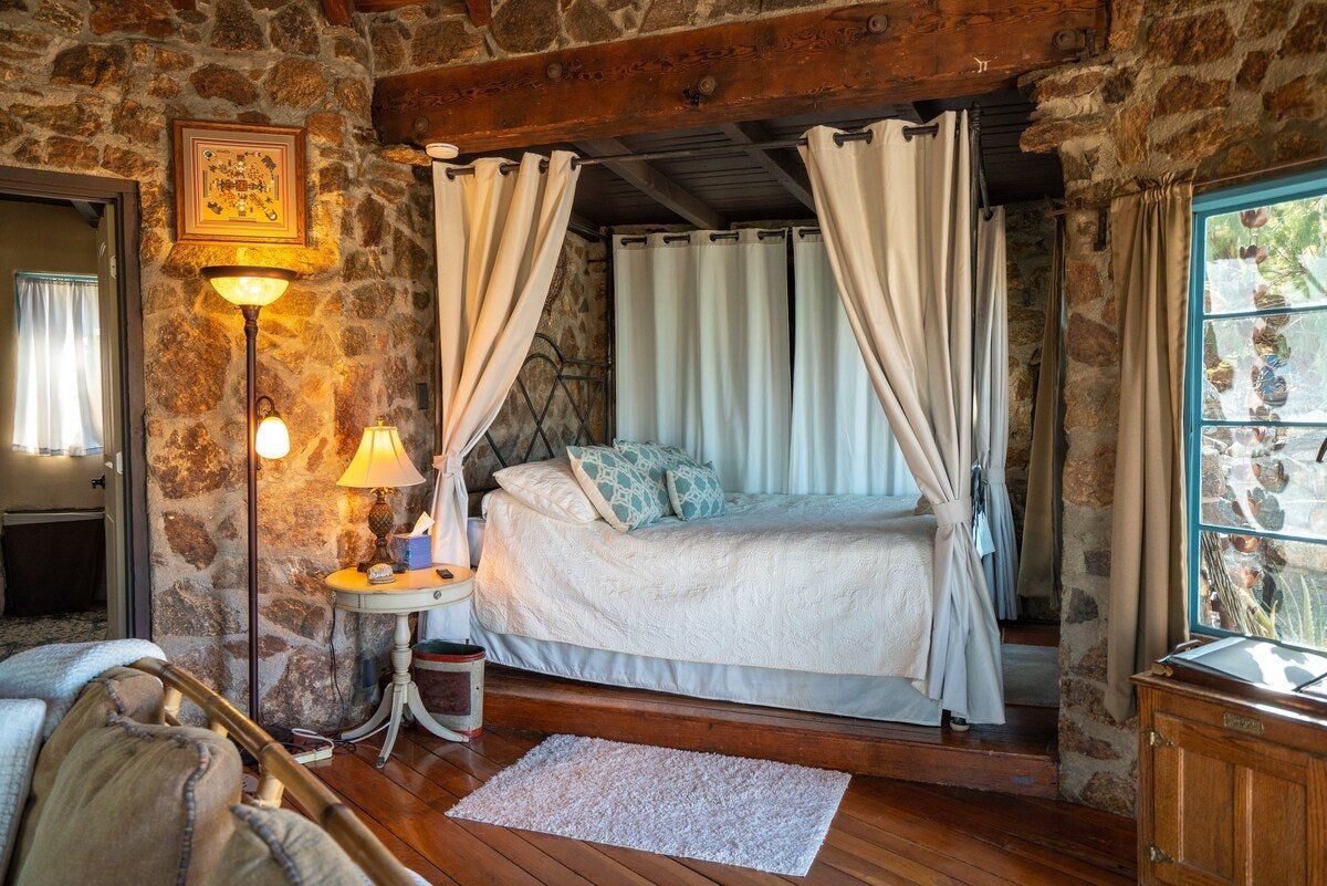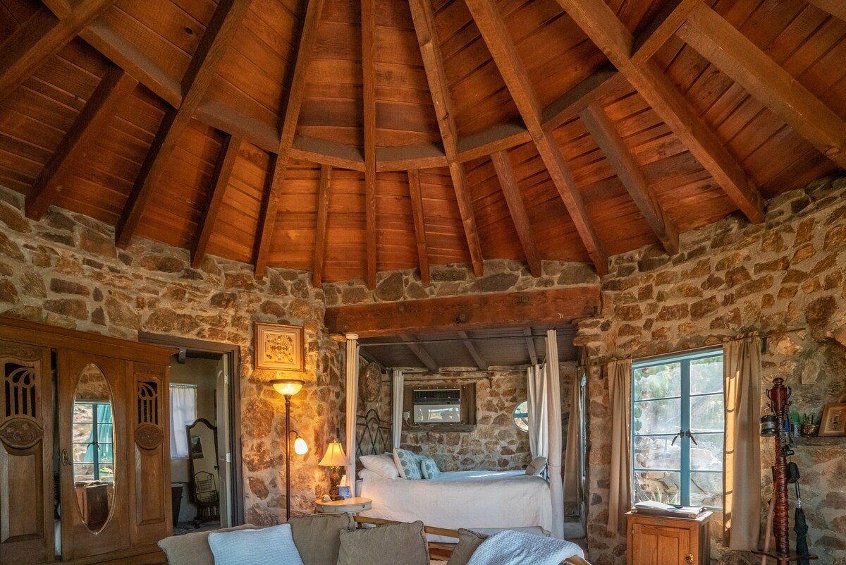 In the dramatic desert landscape of Araby Cove, this little rustic gem could almost be mistaken for part of the rocky hillside. But is that a chimney we spy? And aren’t those sun loungers? A round cottage, built from stone, it’s cosy and cute. Perched on a hilltop, the views from the yard and the huge picture-frame window at the heart of the living space are simply breathtaking. Inside, the stone walls and circular wooden ceiling ooze boho chic. The four-poster bed, tucked into one side, provides a luxurious sleeping nook and candles in the stone fireplace add a touch of romance. The cottage-style kitchen is compact but has everything you could need. Besides, there's a barbecue and dining area on the patio for meals under the desert stars. The area is said to be a ‘wind free zone’, with great hiking and mountain bike trails on the doorstep, and Palm Springs is just a short drive away.