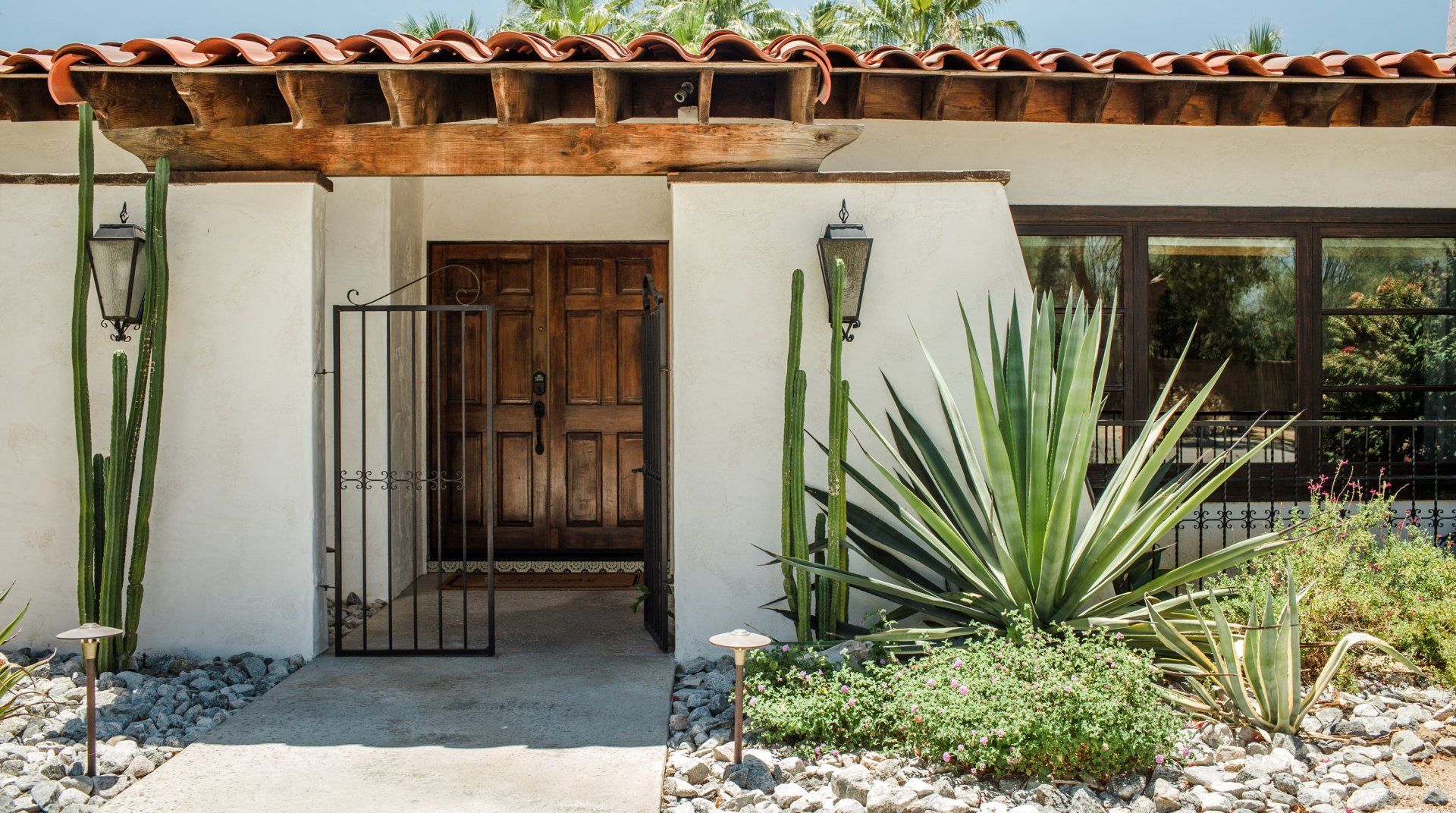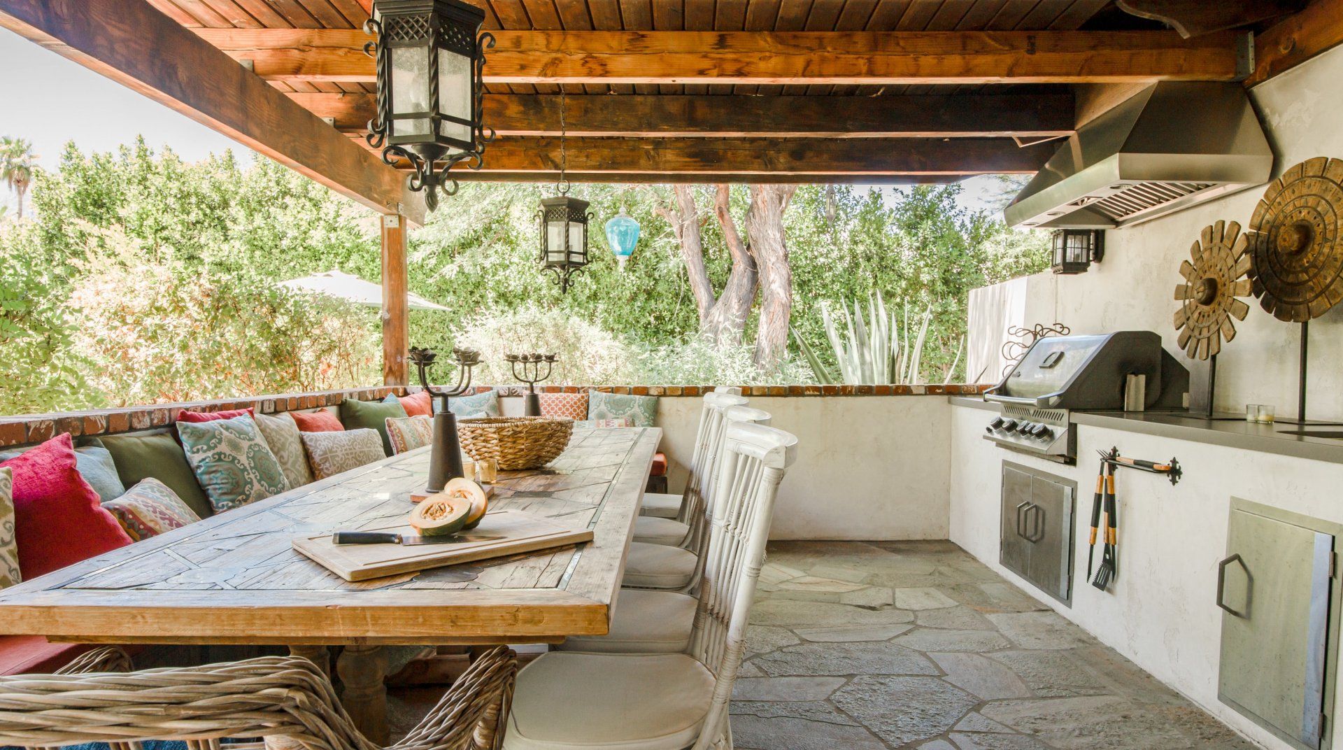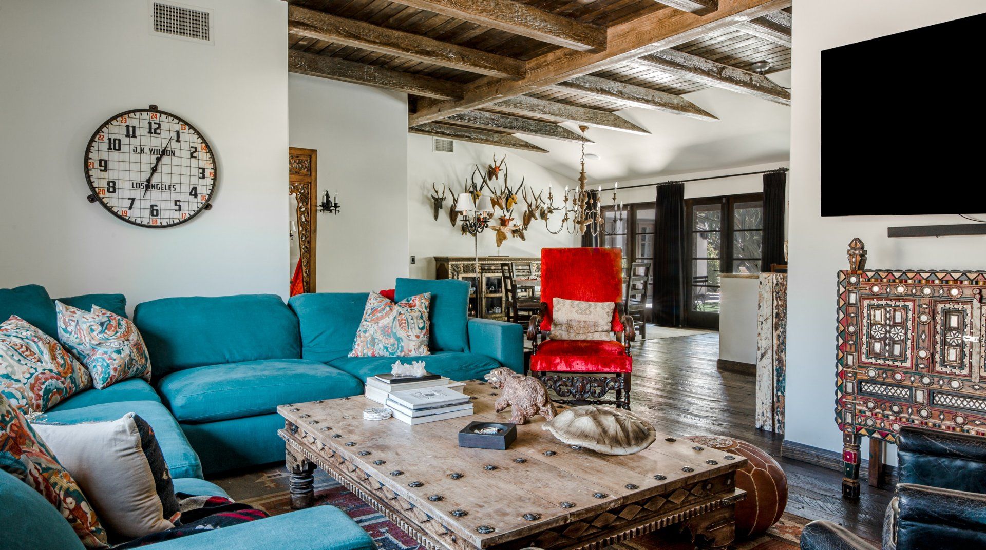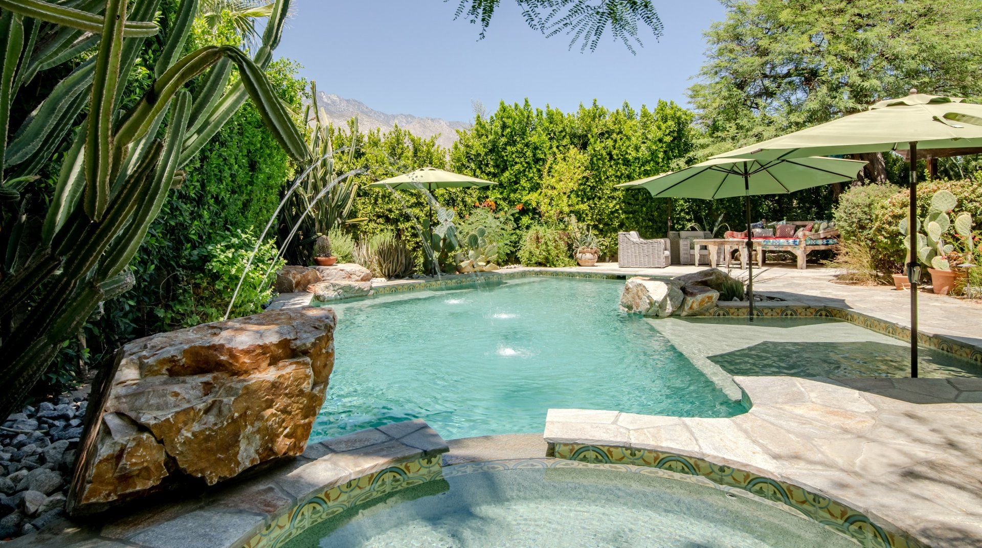 Adorned with colourful tiling, vintage furnishings and fountains, this characterful home is influenced by Spanish haciendas. Differing from some of the more minimal homes in the surrounding area, the stylish pad celebrates colour and creativity, with unique artworks and custom sinks. Families and groups of friends can host dinner parties in the outdoor kitchen, relax indoors with the Sonos sound system or take a short trip to downtown Palm Springs.