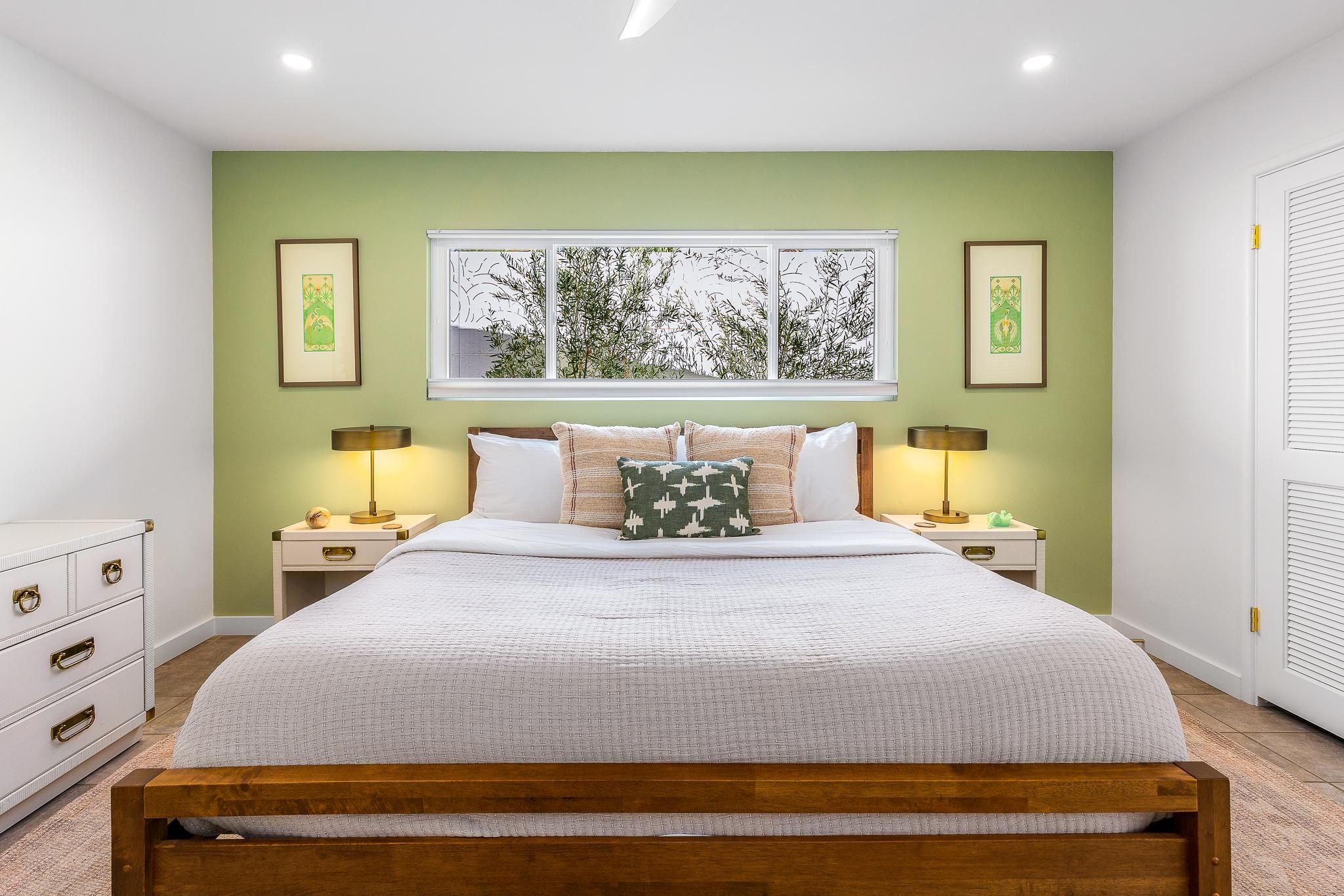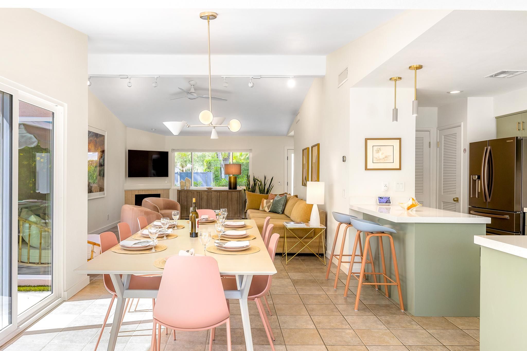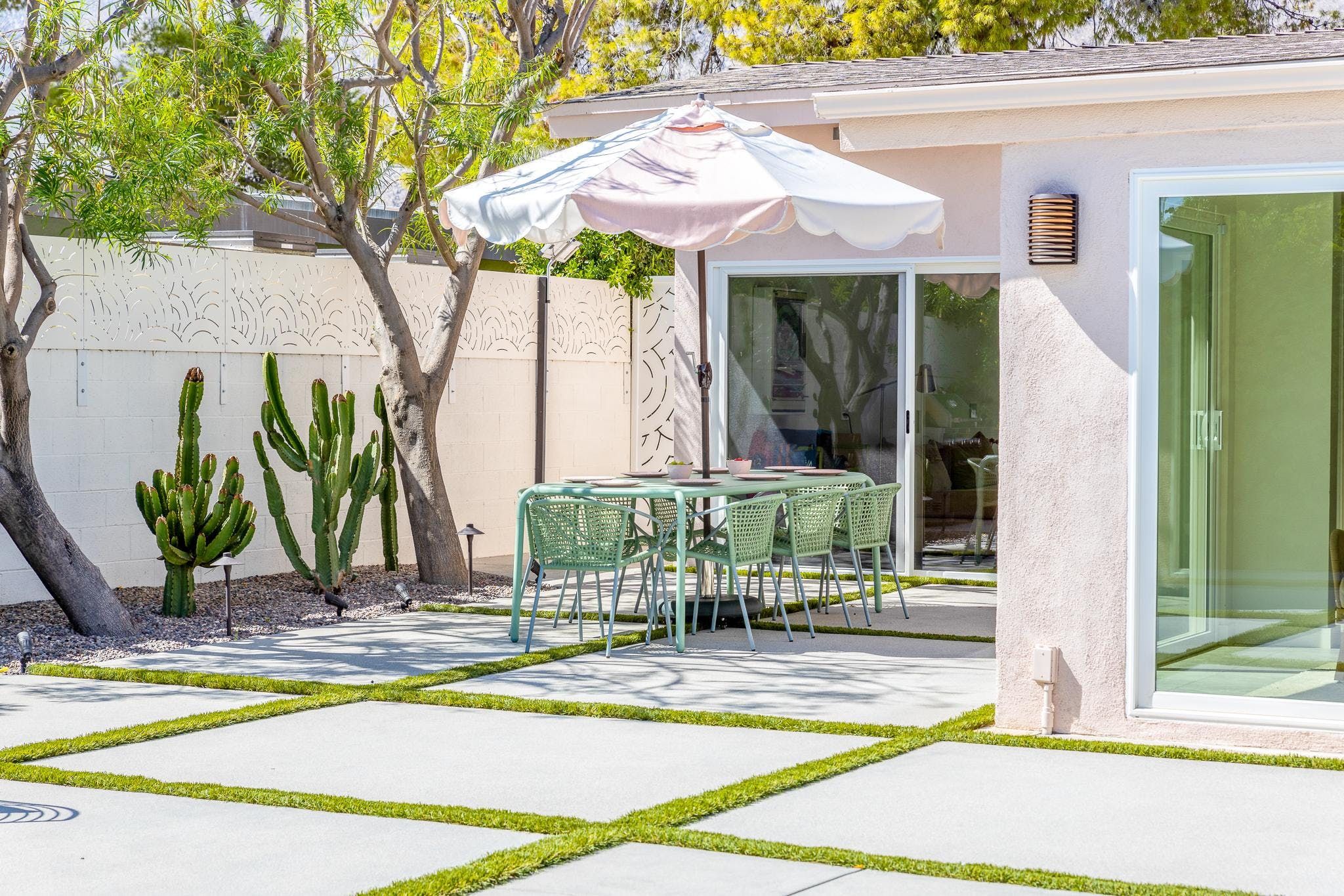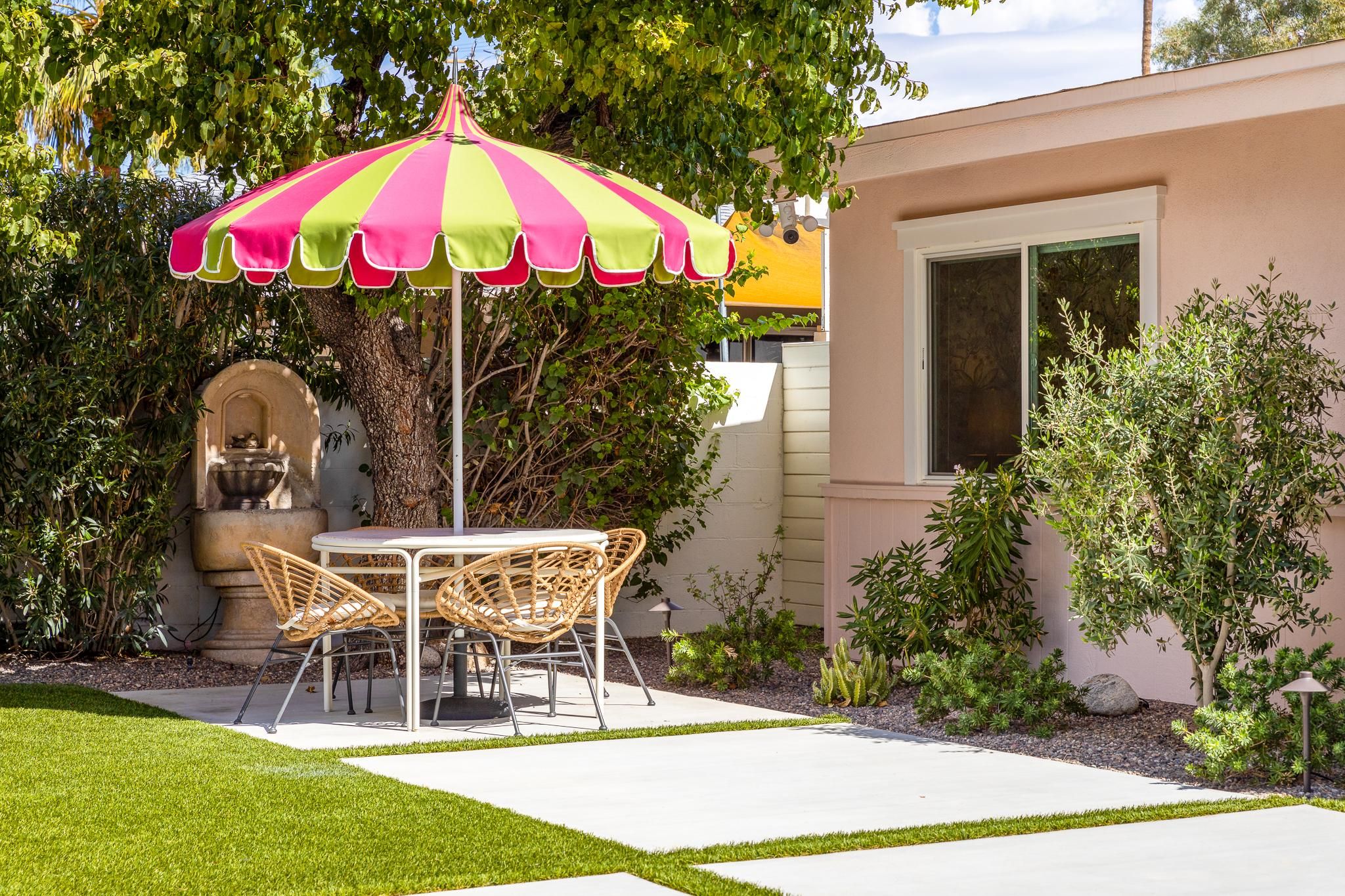 Flamingo-pink and turquoise are the themes of this renovated mid-century bungalow in Palm Springs. The exterior is a dusky peach while bright pink parasols shade the line of loungers by the turquoise swimming pool. Choose between cooling laps in the pool or simply sitting in the integrated jetted Jacuzzi. As the sunset silhouettes the surrounding palm trees against a glowing sky, it’s time to get the fire pit going on the terrace. There’s also a barbecue out here and plenty of room for the group to dine.