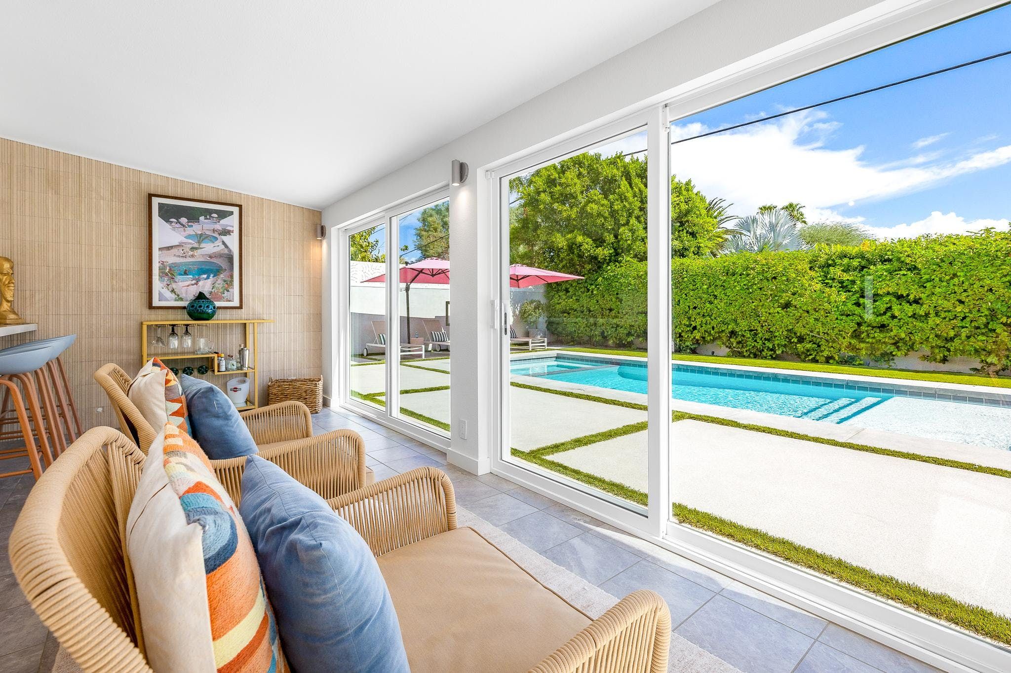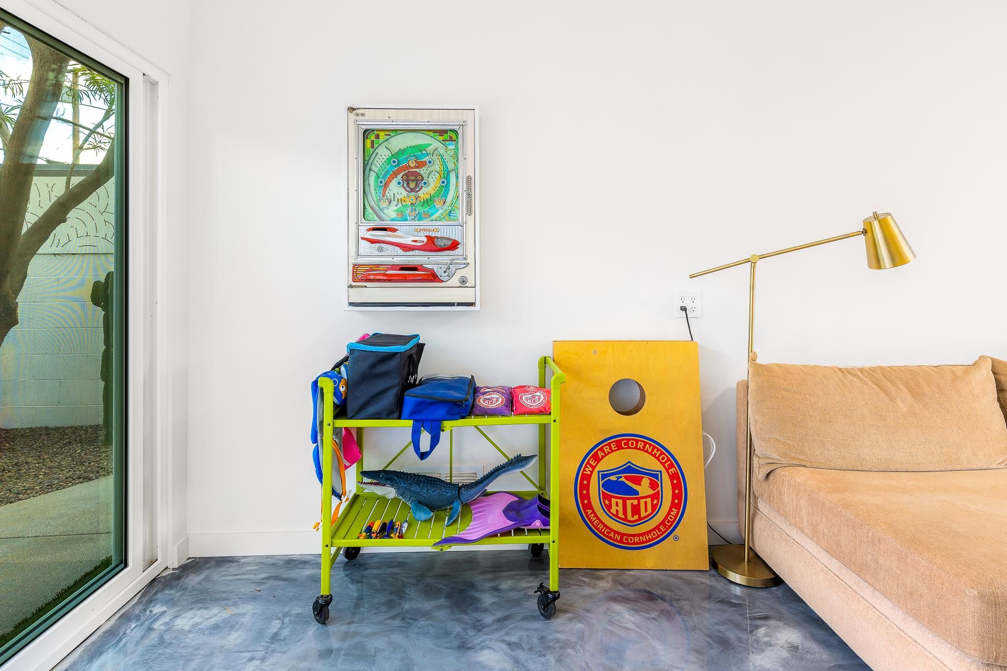 In typical Palm Springs style, floor-to-ceiling glass doors lead from the living area to the terrace, blurring the line between indoors and outdoors. Plush velvet armchairs and a sofa are a nod to the 1960s and the living, dining room and kitchen are open-plan and sociable. We love the wicker chairs facing the terrace that feel as though you’re in a solarium. The added bonus is a garage converted into a separate games room so the kids can have their own space.