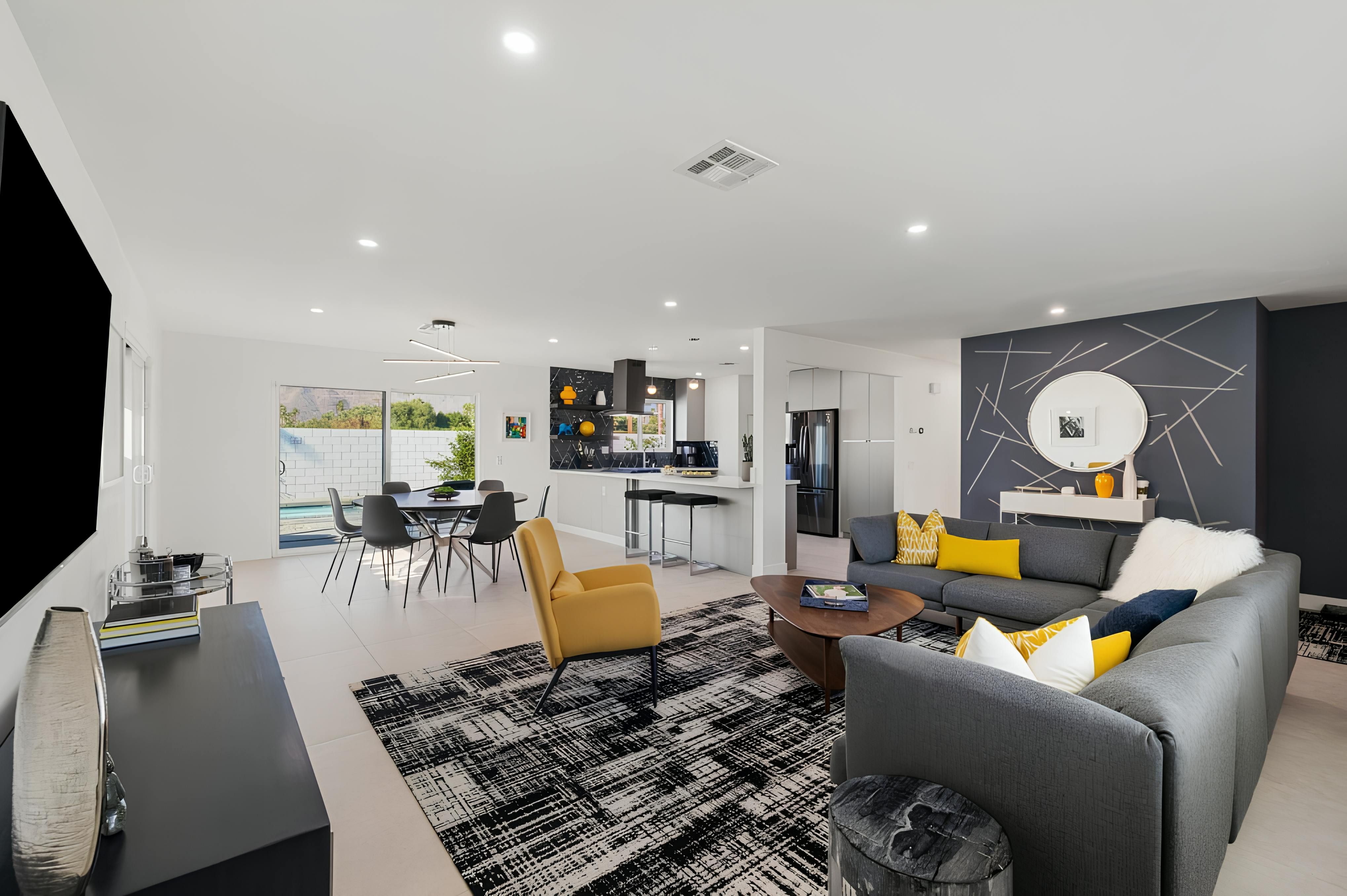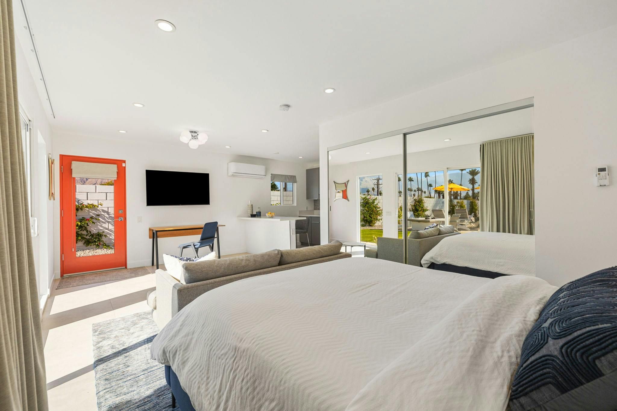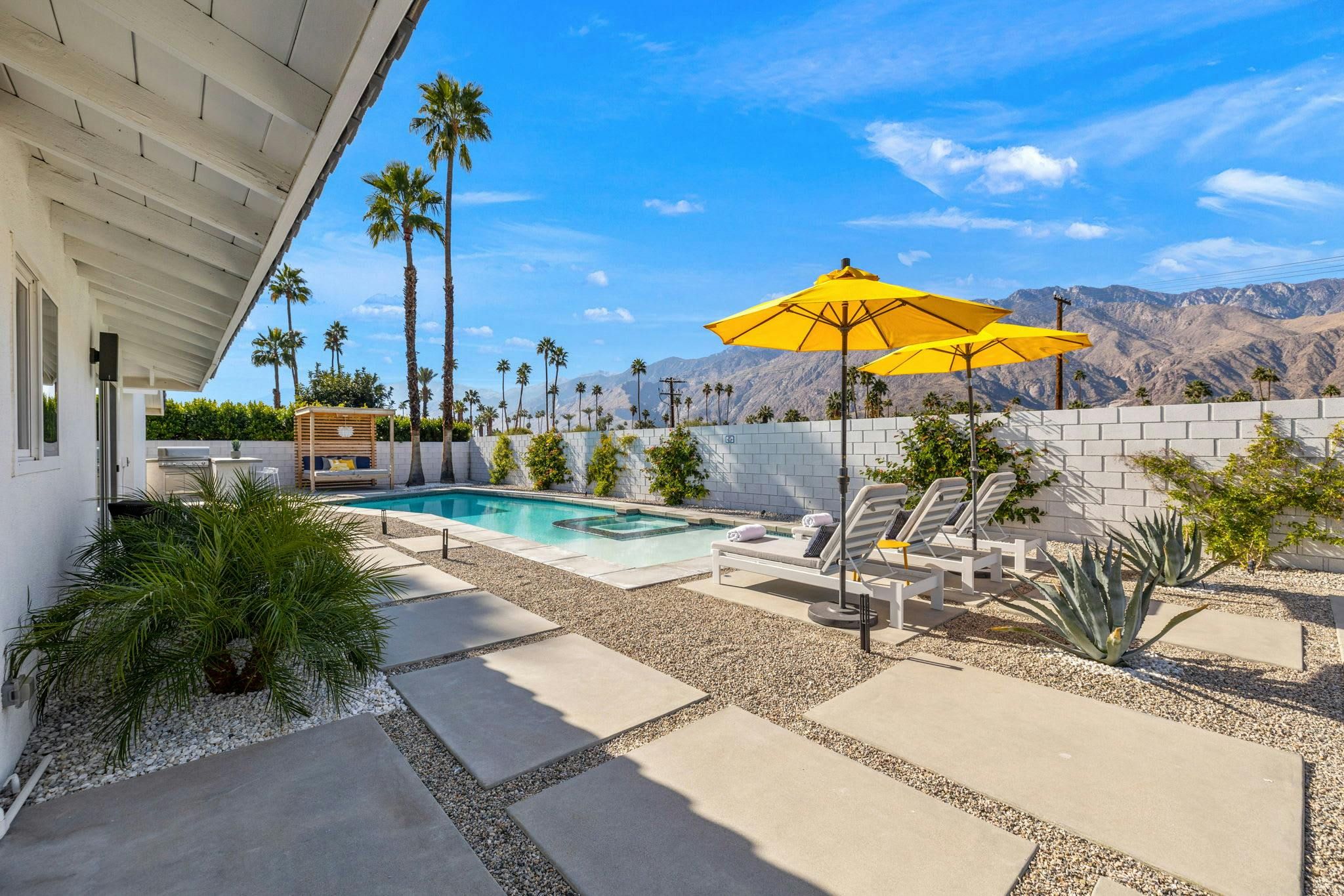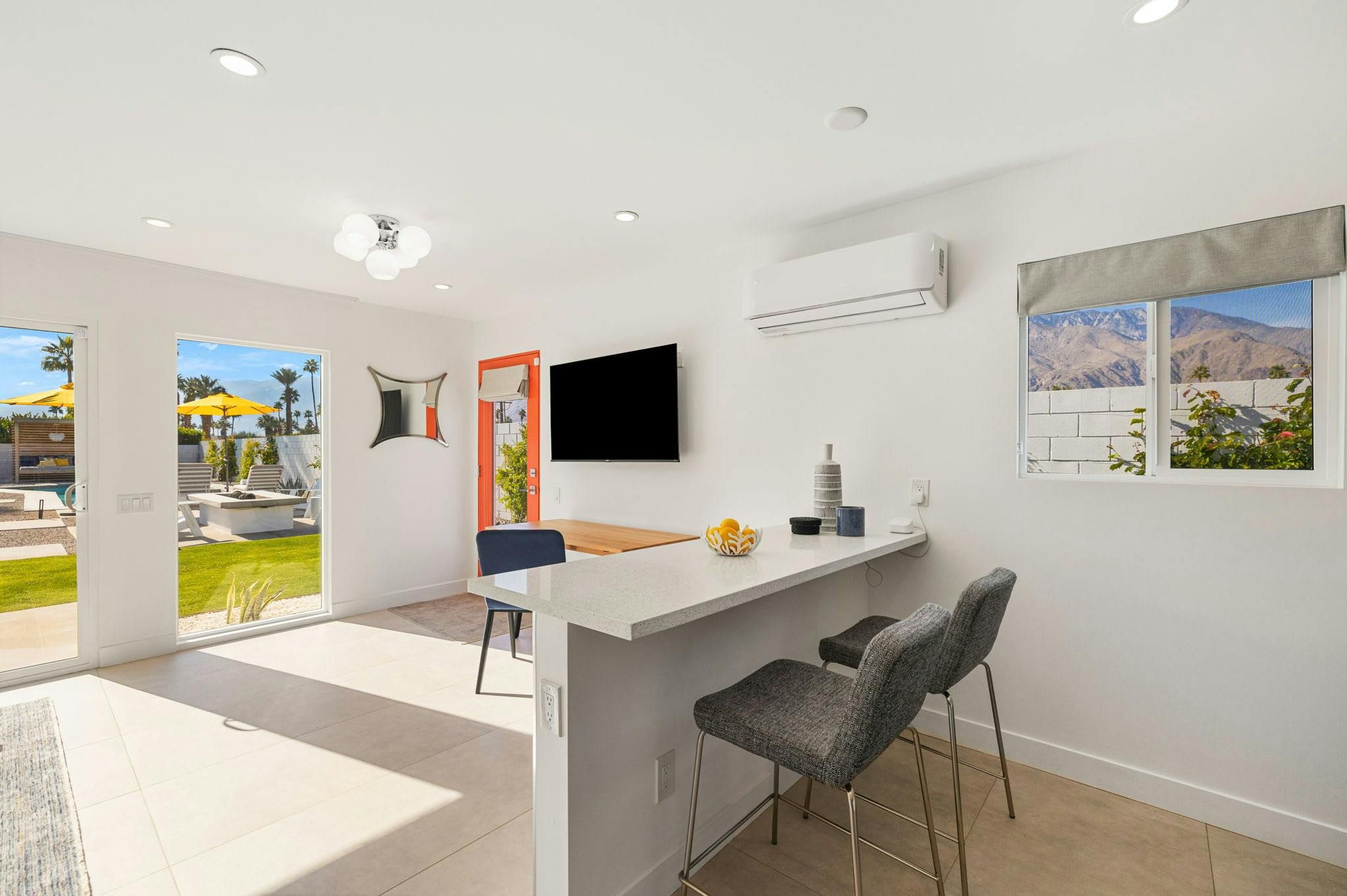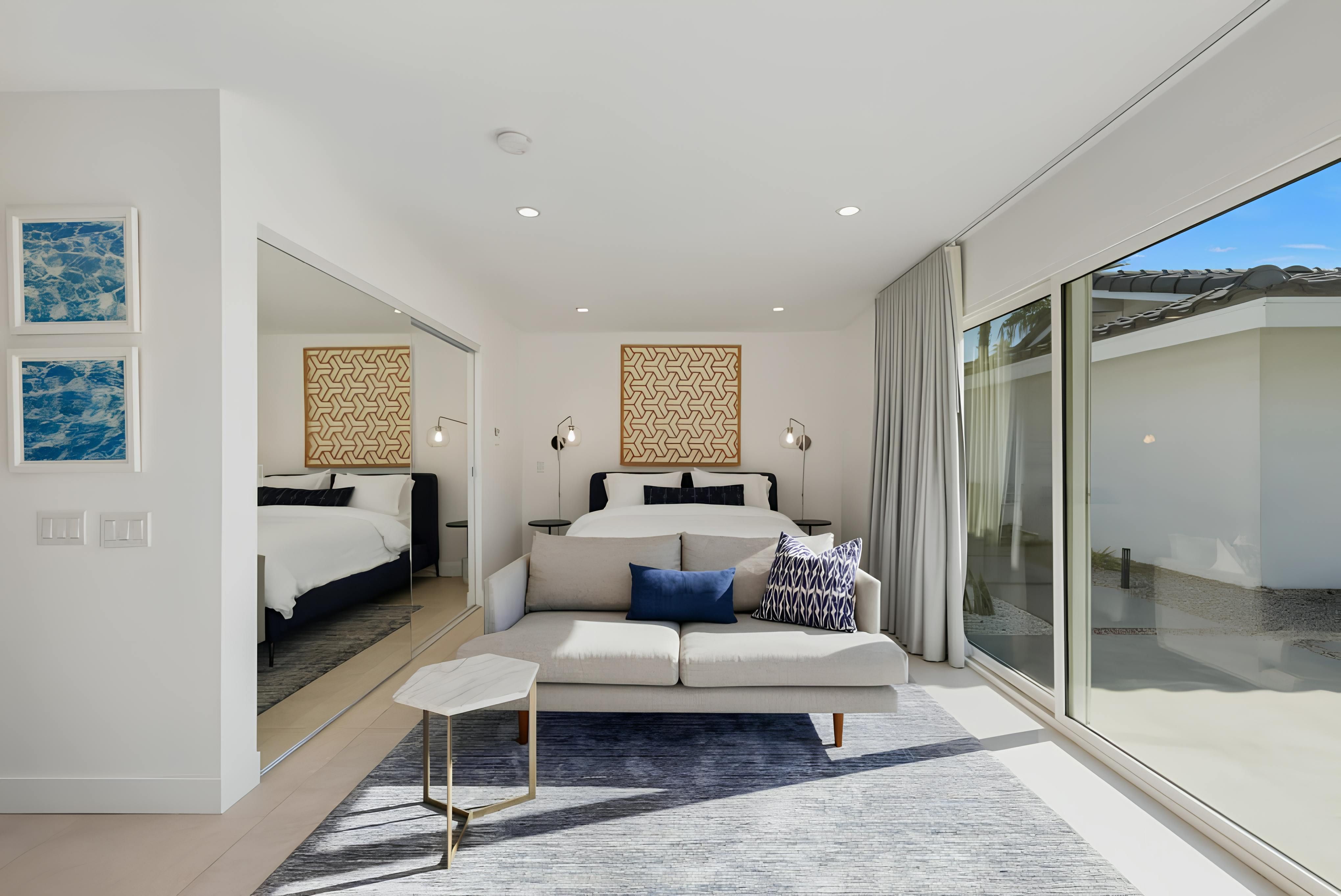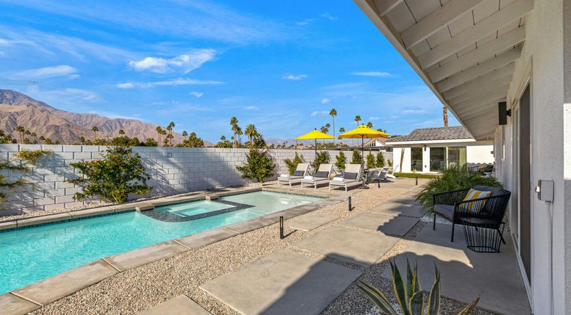 Big blue skies and mountain views make this home in Palm Springs an especially scenic place to stay. The outdoor area is instantly inviting, with its sun-kissed swimming pool, luxurious firepit, and shaded daybed that’s ideal for a siesta. Moving inside, you’ll find ample room to get comfy – the space is spread over the main house and a separate annexe, offering flexibility for families or a group getaway. And with downtown eateries and entertainment within easy walking distance, you won’t need to go far to discover more of this desert city.