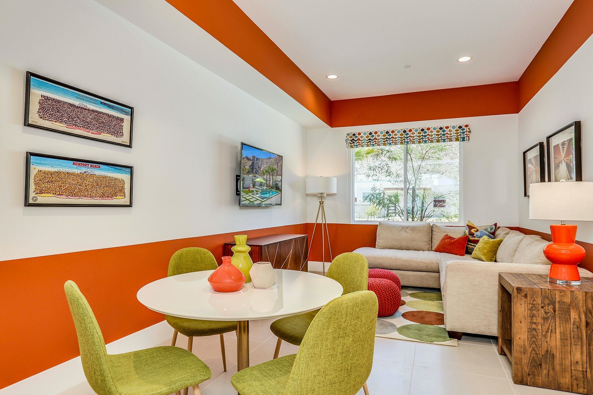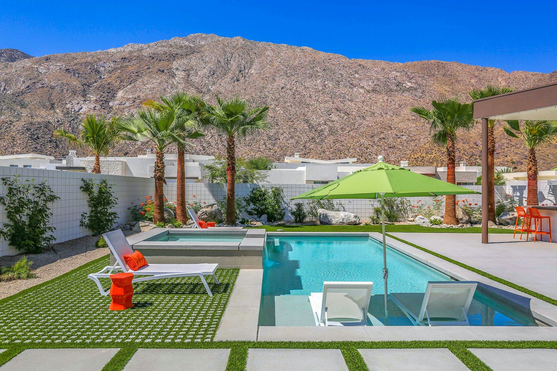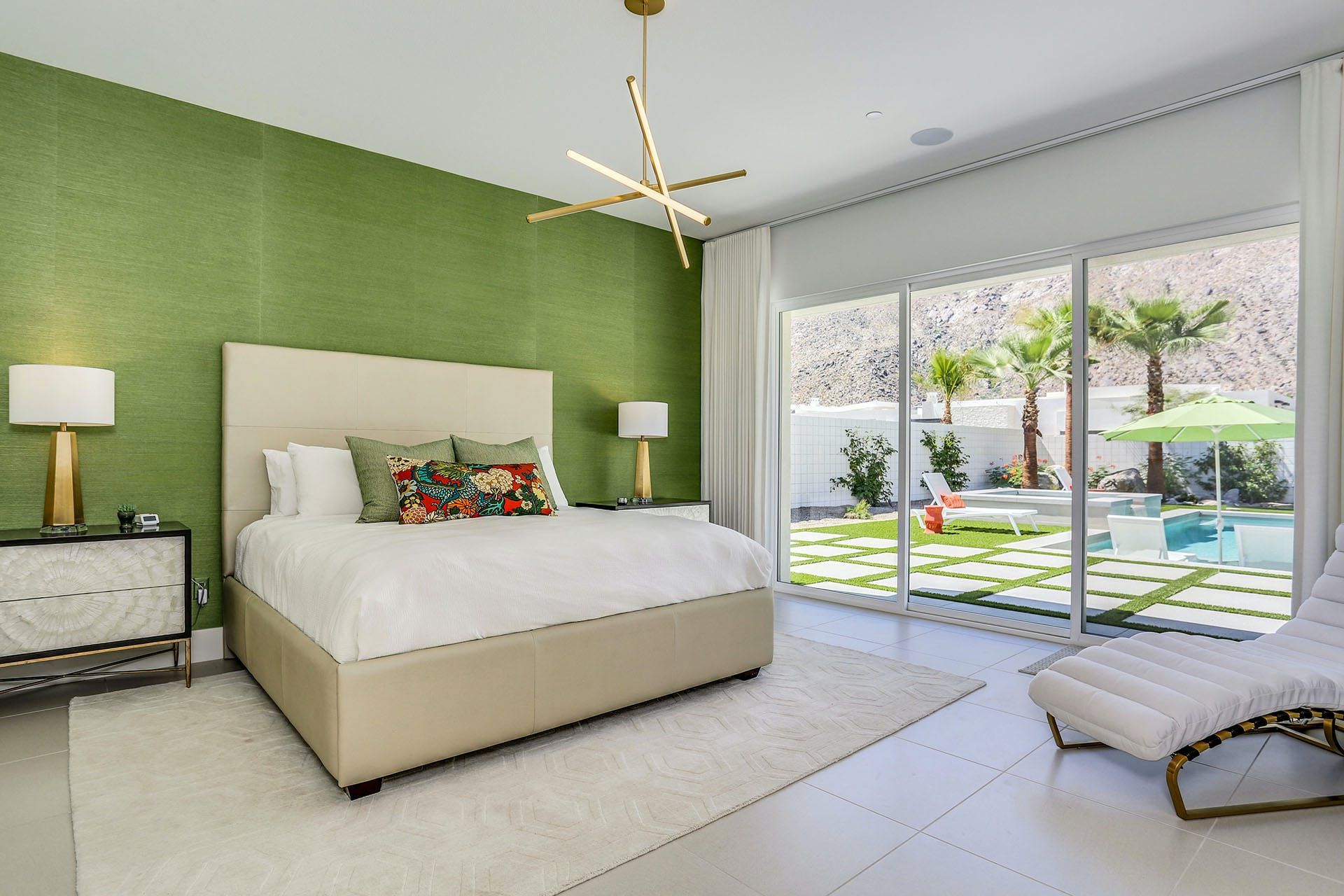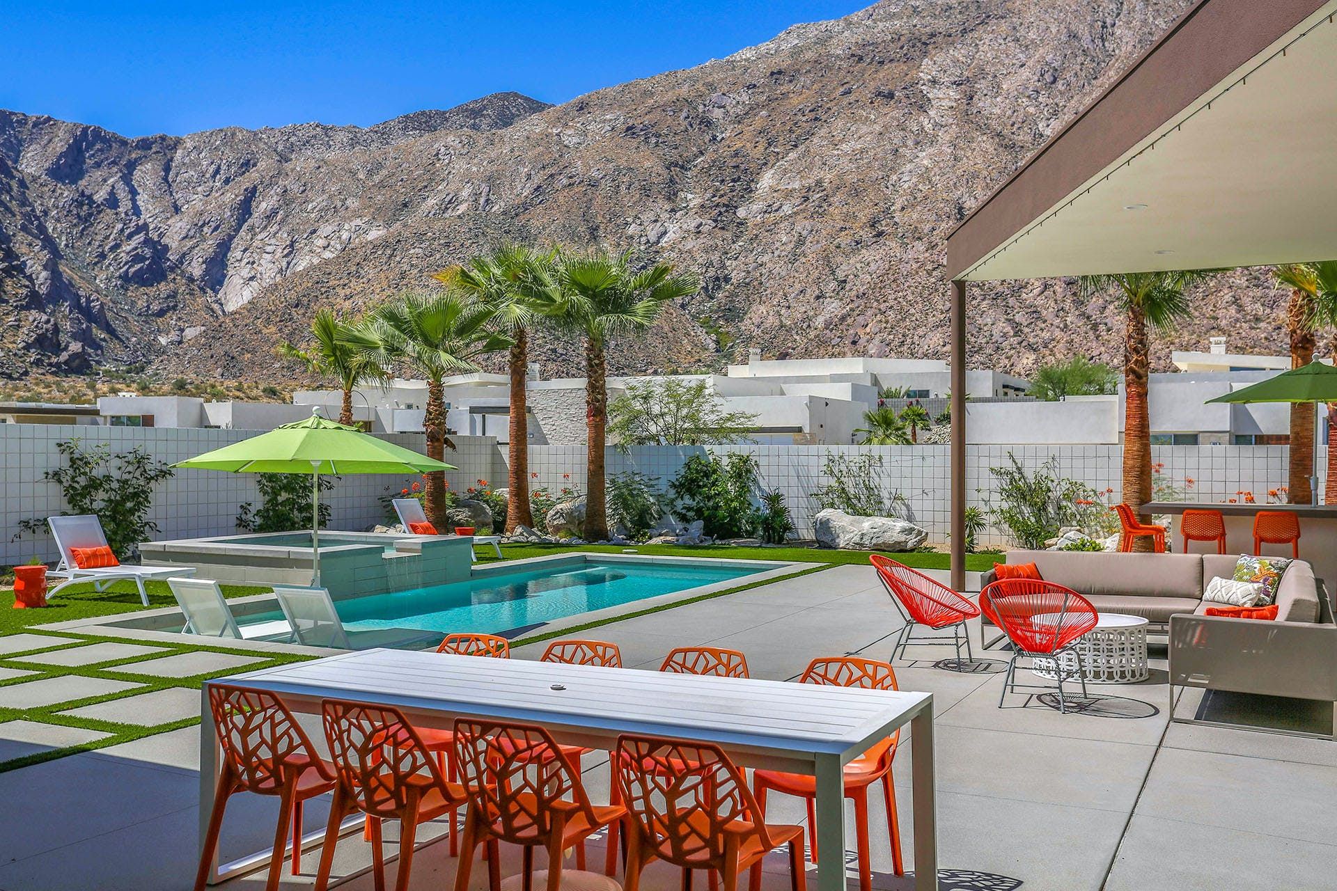 Beautifully appointed in the shades of the San Jacinto Mountains, this glamorous home captures the new-age modernist vibe of the LA desert. Stepping out to look around the garden, you'll notice tall swaying palms, vibrant red chairs and a sparking saline swimming pool with an integrated waterfall spa. Here, you'll also find a barbecue island bar with chic stools to perch on while sipping cocktails – we certainly know where we'd spend our time. Sliding glass doors welcome you into the living space, blurring the boundaries between outside and in, so you can gaze into the picturesque mountain silhouettes whether you are. Inside, there's a modern look with high vaulted ceilings, polished marble floors and a swanky chef's kitchen – enjoy a quick cup of coffee around the curved breakfast bar. Bright and roomy, all the bedrooms have their own personalities and open up to an outside area. They're also accompanied by some seriously stunning en-suite bathrooms – we could think of nothing better than taking a long soak in the freestanding bathtub to wash that chlorine off. In a historic tennis club neighbourhood, you're surrounded by great walking trails as well as the Palm Canyon Drive that will take just a six-minute car ride to reach. Flourishing with upscale shops, indie coffee houses and some excellent restaurants, there's plenty to explore. A sixteen-minute stroll north will find you in Downtown Palm Springs, boasting fancy boulevards and the glitz and glam of Hollywood. With so much around you, we think this mid-century pool pad is as convenient as it is stylish.