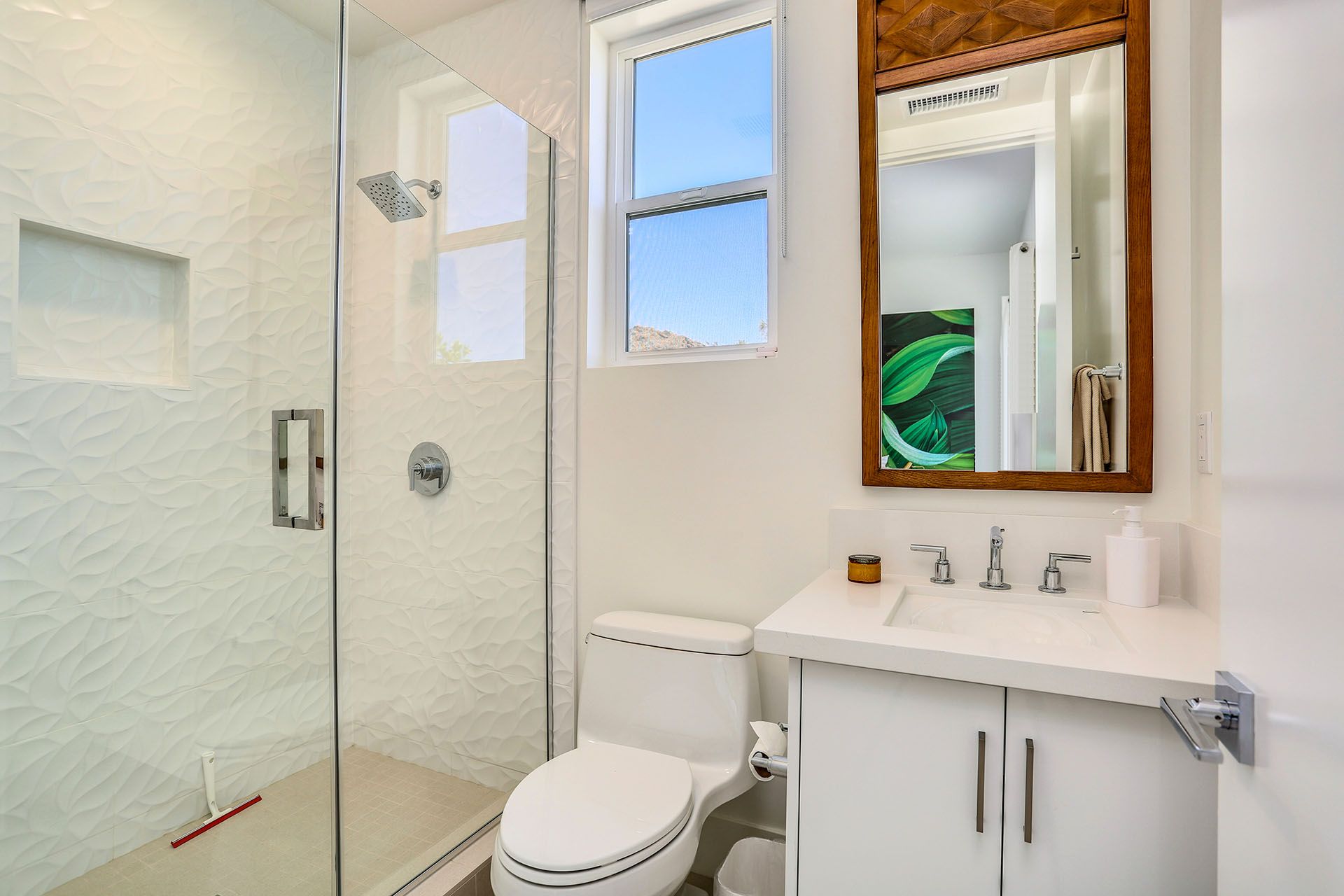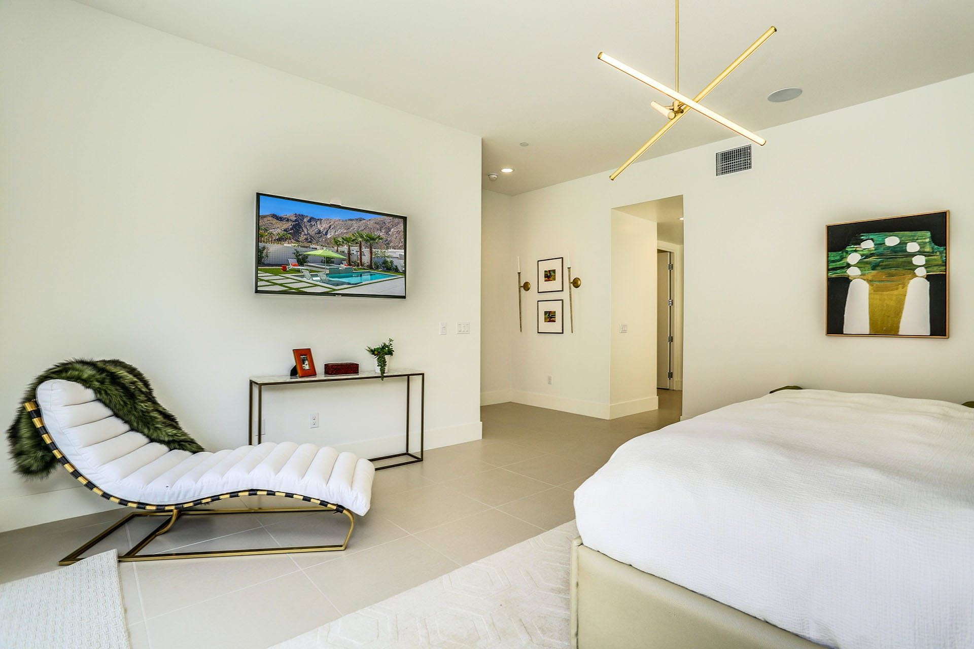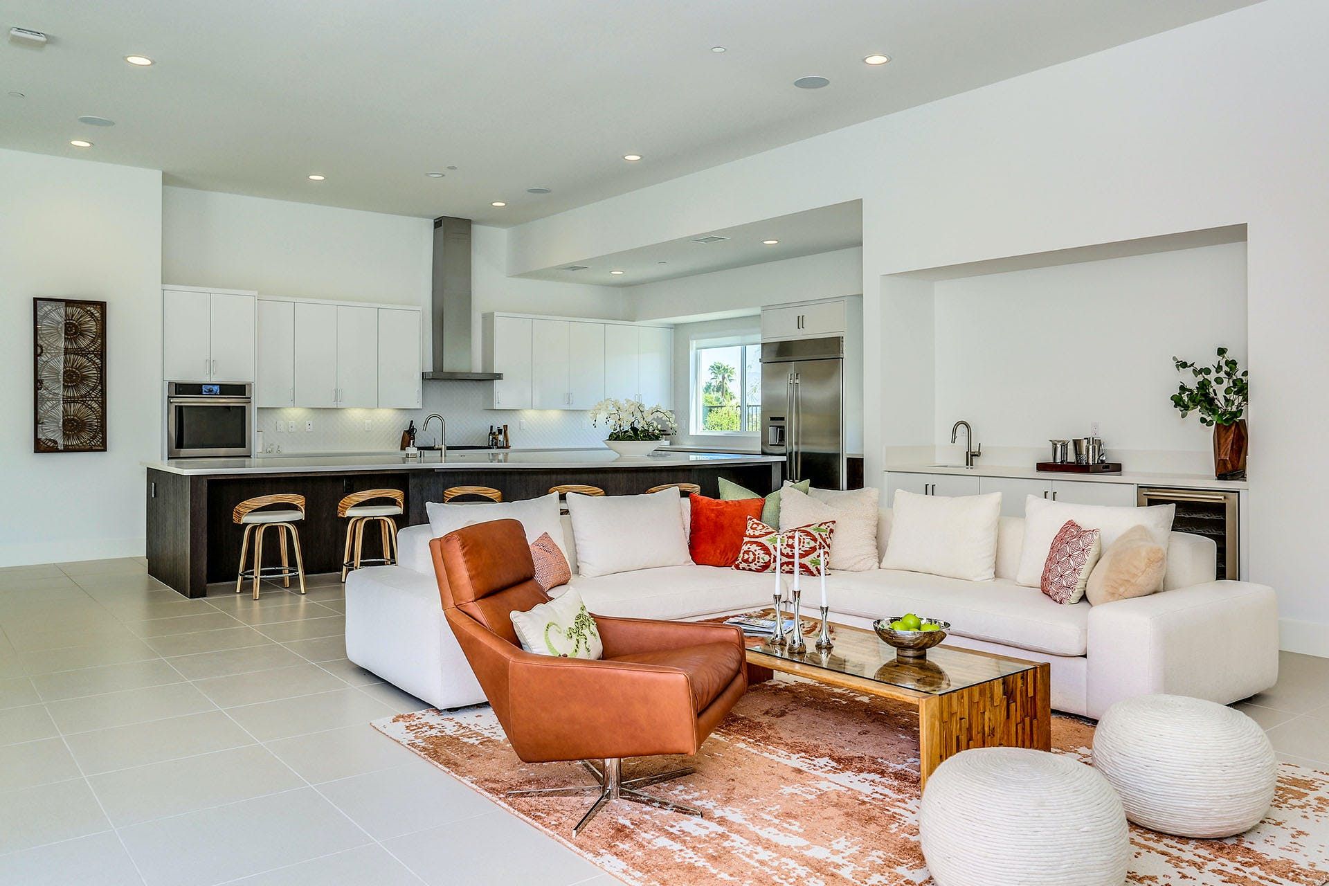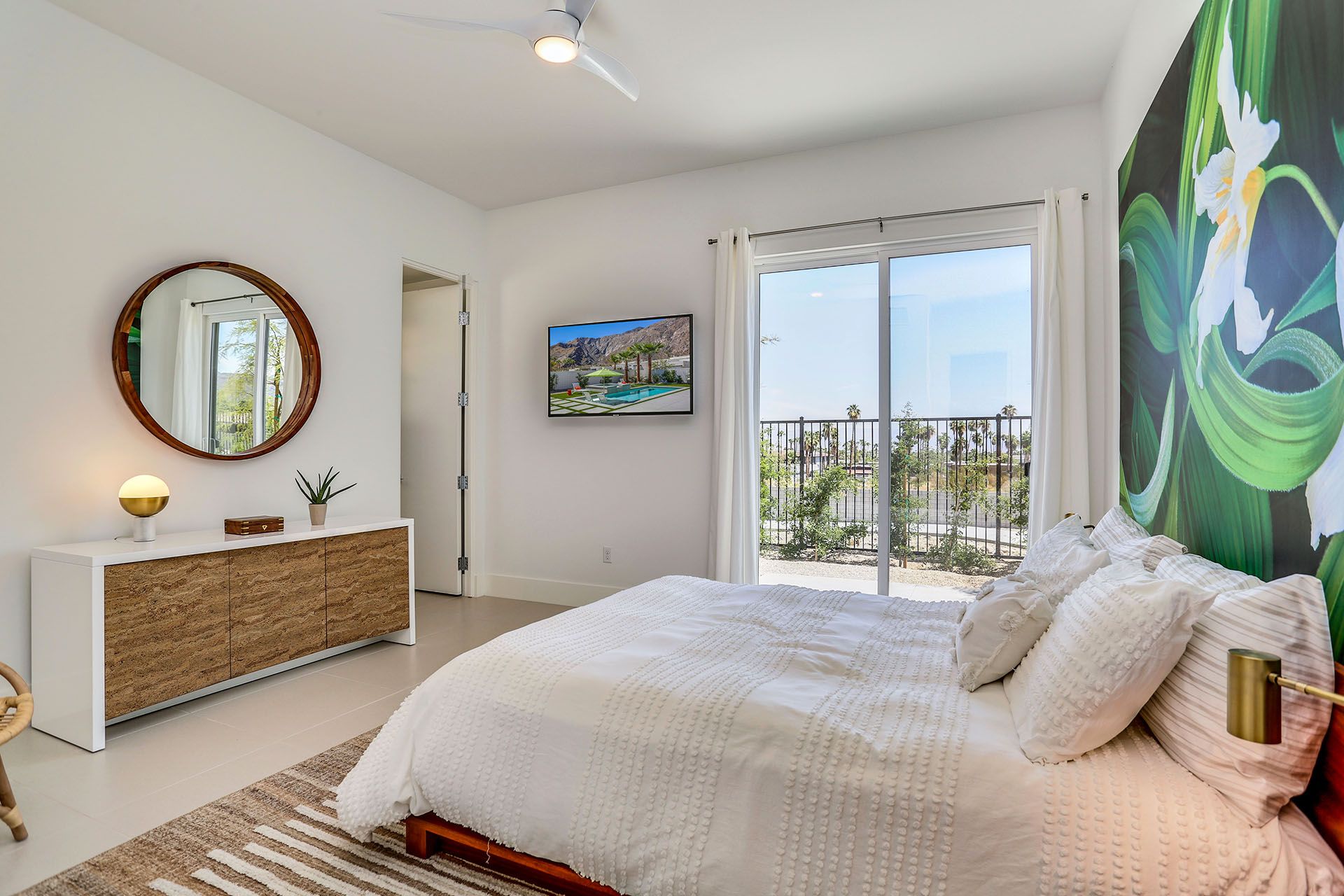 Beautifully appointed in the shades of the San Jacinto Mountains, this glamorous home captures the new-age modernist vibe of the LA desert. Stepping out to look around the garden, you'll notice tall swaying palms, vibrant red chairs and a sparking saline swimming pool with an integrated waterfall spa. Here, you'll also find a barbecue island bar with chic stools to perch on while sipping cocktails – we certainly know where we'd spend our time. Sliding glass doors welcome you into the living space, blurring the boundaries between outside and in, so you can gaze into the picturesque mountain silhouettes whether you are. Inside, there's a modern look with high vaulted ceilings, polished marble floors and a swanky chef's kitchen – enjoy a quick cup of coffee around the curved breakfast bar. Bright and roomy, all the bedrooms have their own personalities and open up to an outside area. They're also accompanied by some seriously stunning en-suite bathrooms – we could think of nothing better than taking a long soak in the freestanding bathtub to wash that chlorine off. In a historic tennis club neighbourhood, you're surrounded by great walking trails as well as the Palm Canyon Drive that will take just a six-minute car ride to reach. Flourishing with upscale shops, indie coffee houses and some excellent restaurants, there's plenty to explore. A sixteen-minute stroll north will find you in Downtown Palm Springs, boasting fancy boulevards and the glitz and glam of Hollywood. With so much around you, we think this mid-century pool pad is as convenient as it is stylish.
