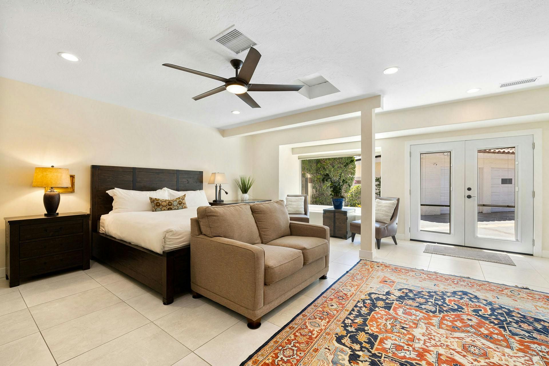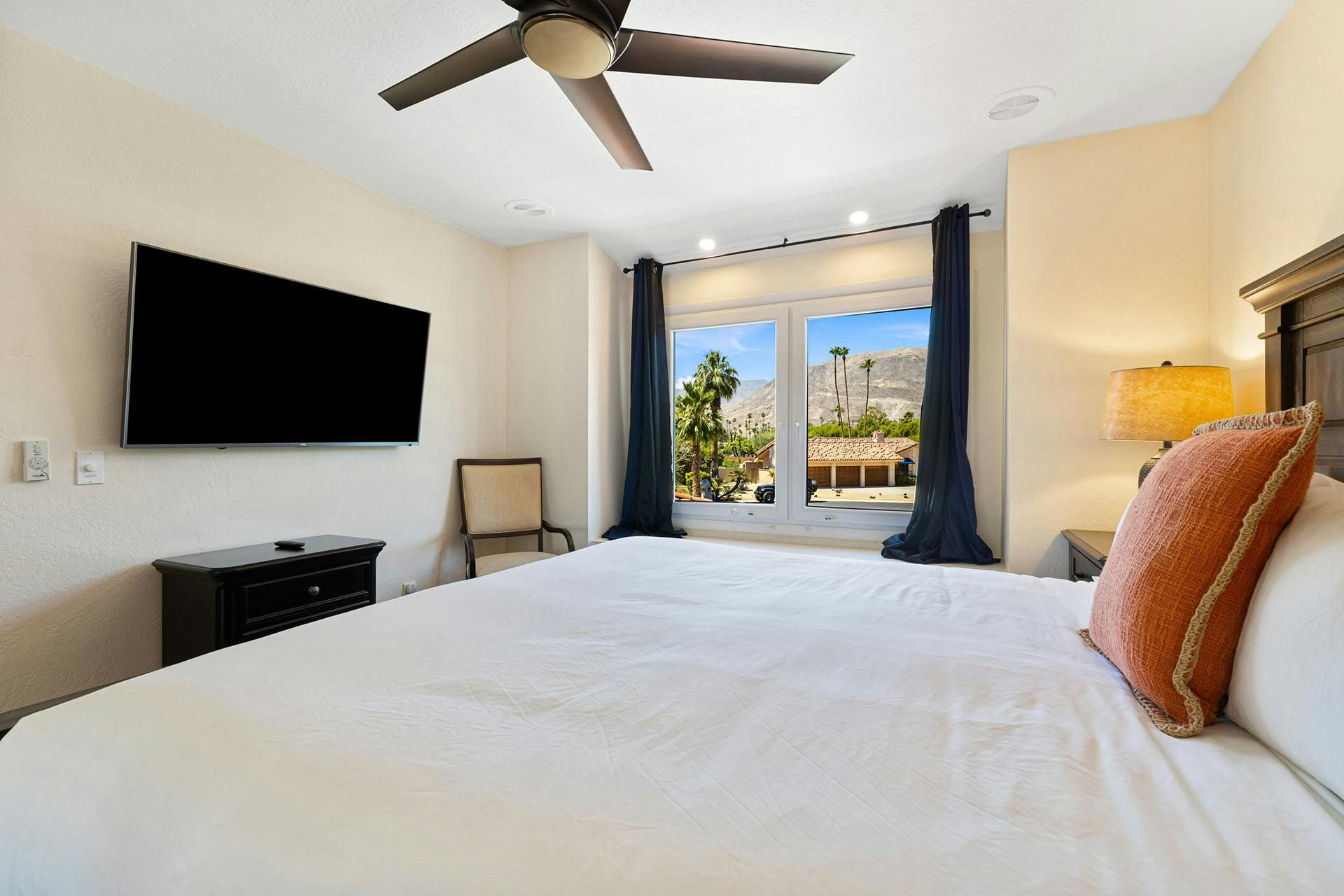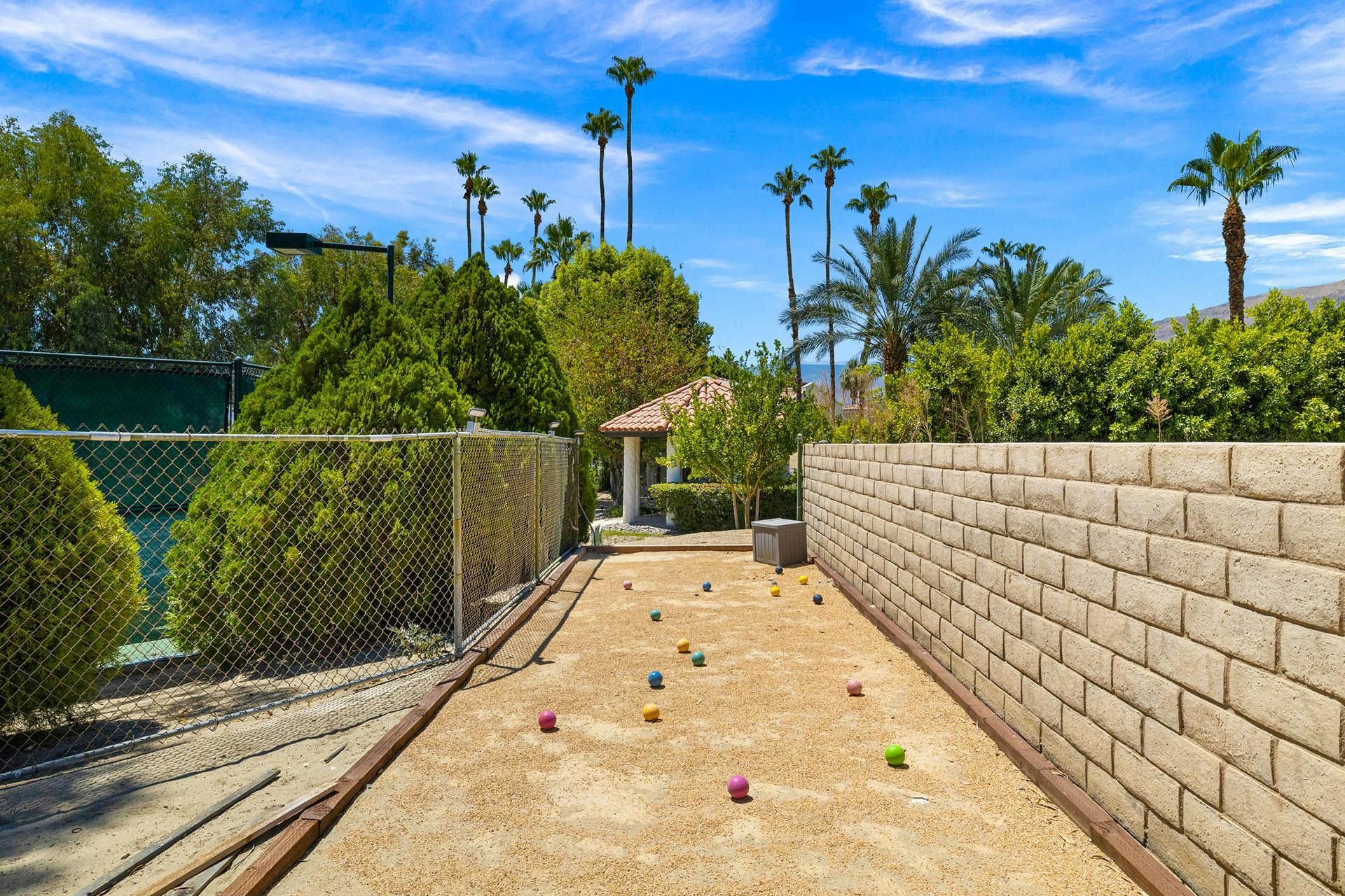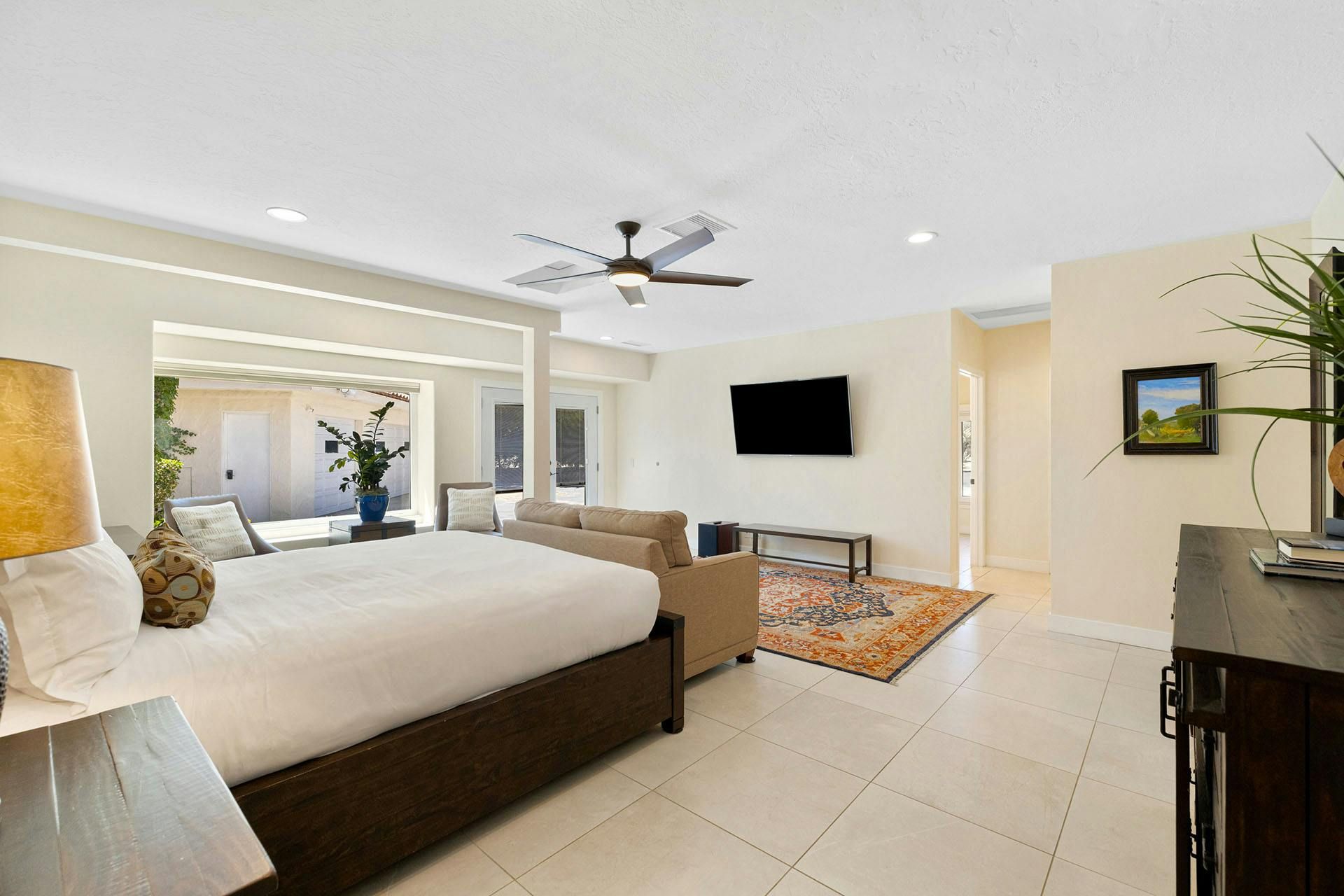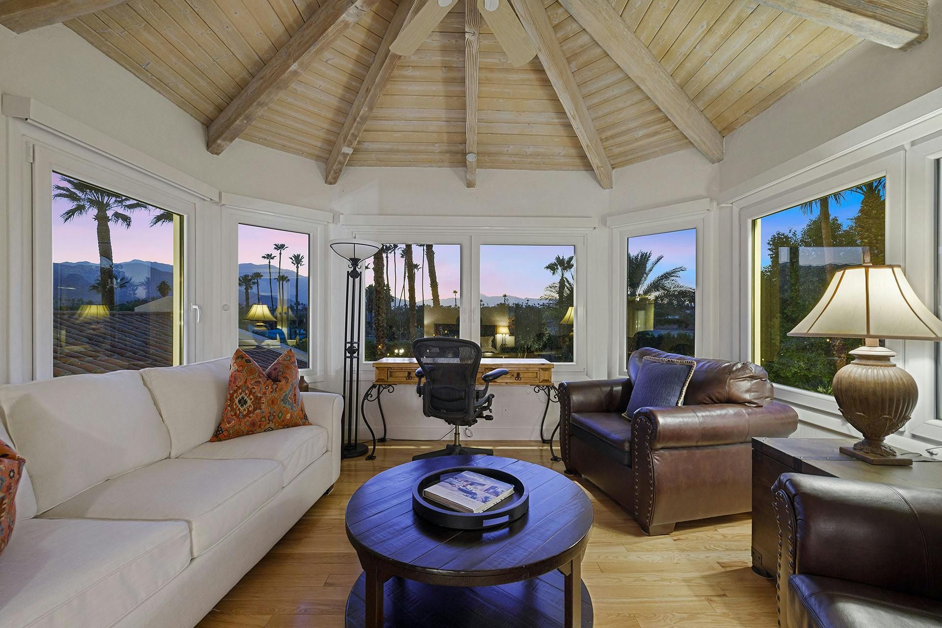 With two swimming pools, a floodlit tennis court, boules court, outdoor kitchen, fire pit lounge, and a children’s playground, this villa feels more like a private resort than a rental home. The vibe is relaxed desert living, with bright, welcoming interiors featuring fireplaces and large windows that frame stunning views of the surrounding mountains. It sits right in the heart of the Coachella Valley, with the shops, restaurants, and boutiques of El Paseo just a five-minute drive away, and Palm Springs only twenty minutes down the road.