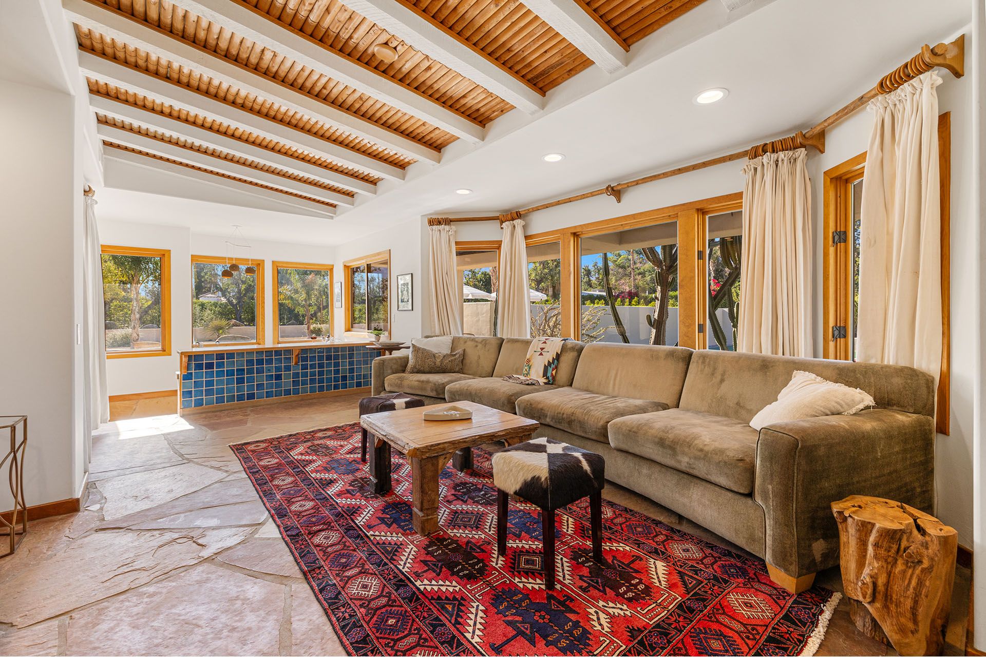 Set within 2.5 sunny acres, this home in Rancho Mirage is a real oasis. Morning dips in the pool, afternoons on the tennis court, evenings around the firepit under starry skies – life here is good. Along with the generous grounds, there’s ample space inside for a group getaway, with rooms spread across the main building, two separate guest houses, and a converted barn. And every corner has been designed to provide plush comfort and plenty of character – offering a welcome as warm as the desert sun.