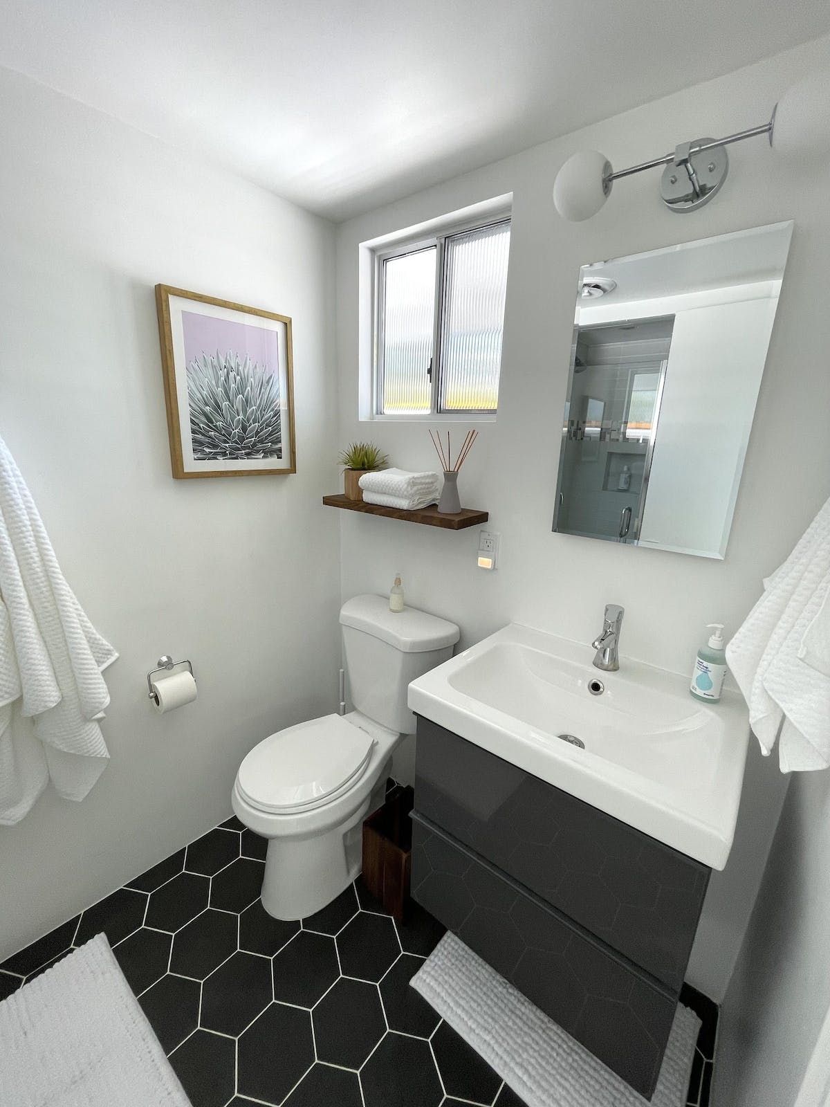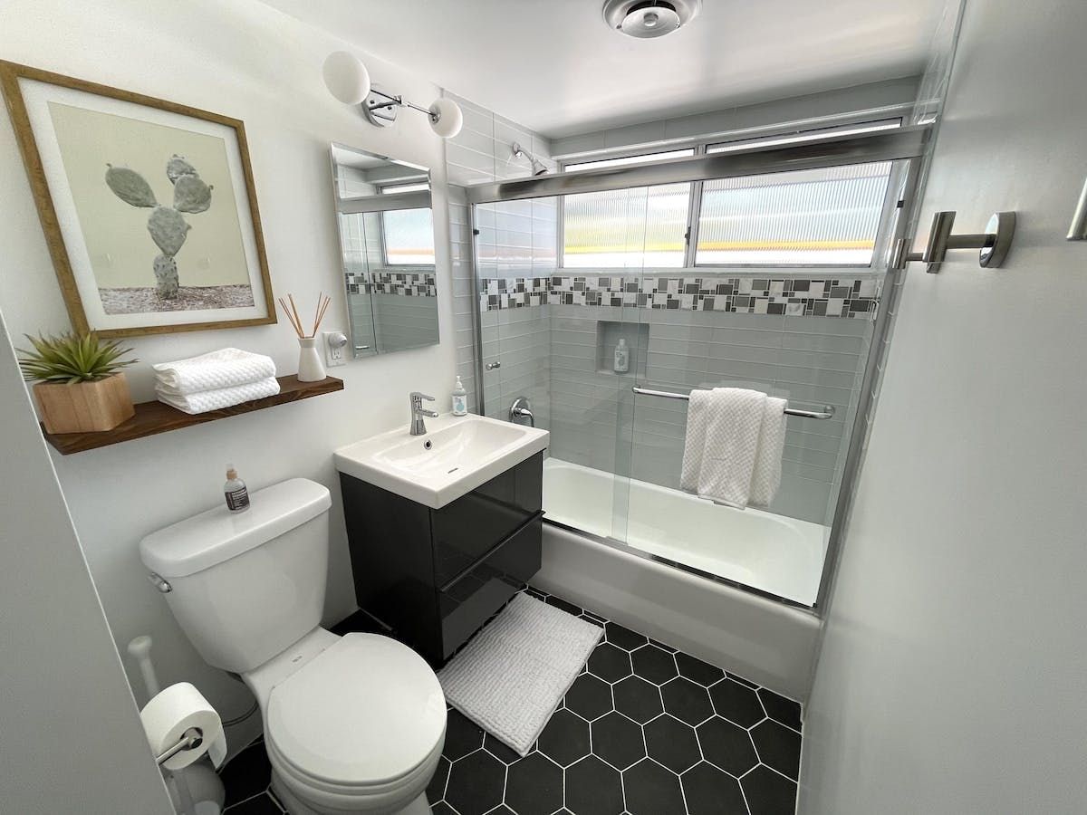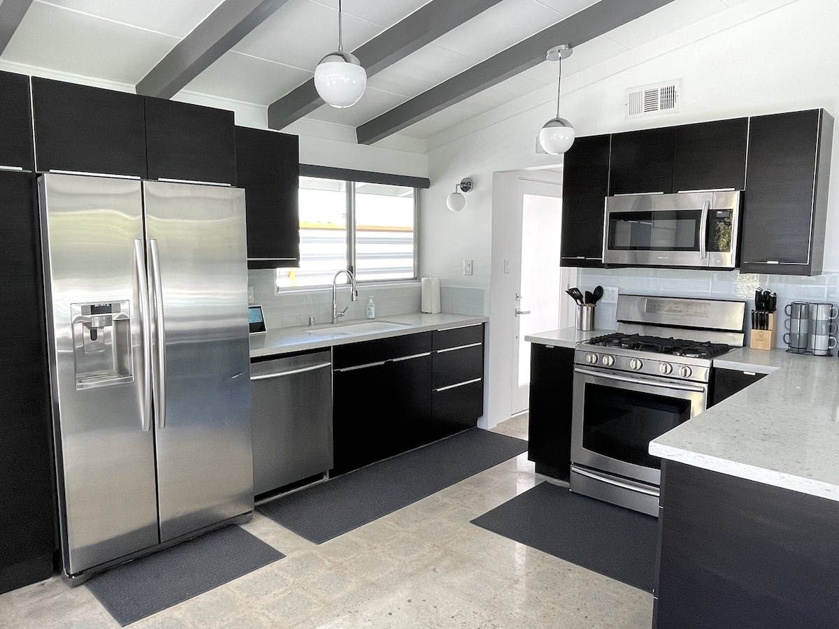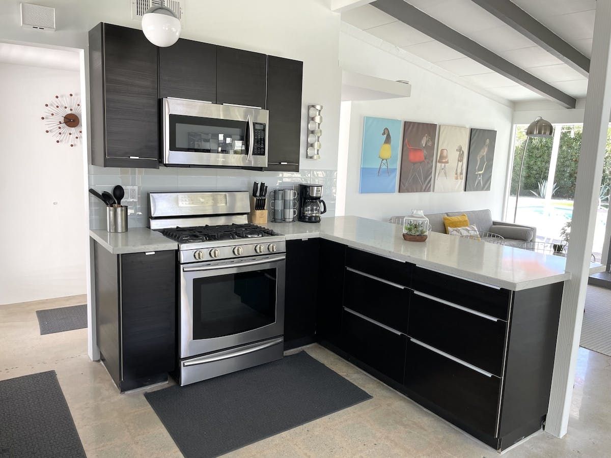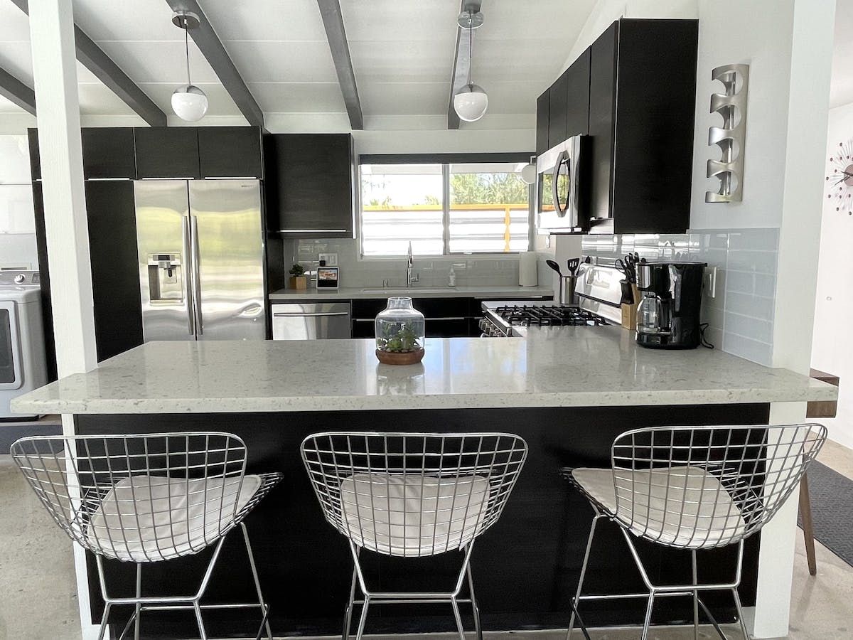 Inside, retro design seamlessly blends with 21st-century comforts to create a contemporary ode to the swinging 1950s and 1960s. Sprawl out on the cushy sofa and catch up on your favourite Prime, Netflix or HBO Max shows. Rustle up tasty meals in the gourmet kitchen while listening to your favourite playlists on the Bluetooth sound system, then gather around the dining table for a delicious dinner.