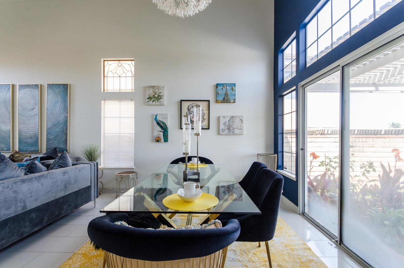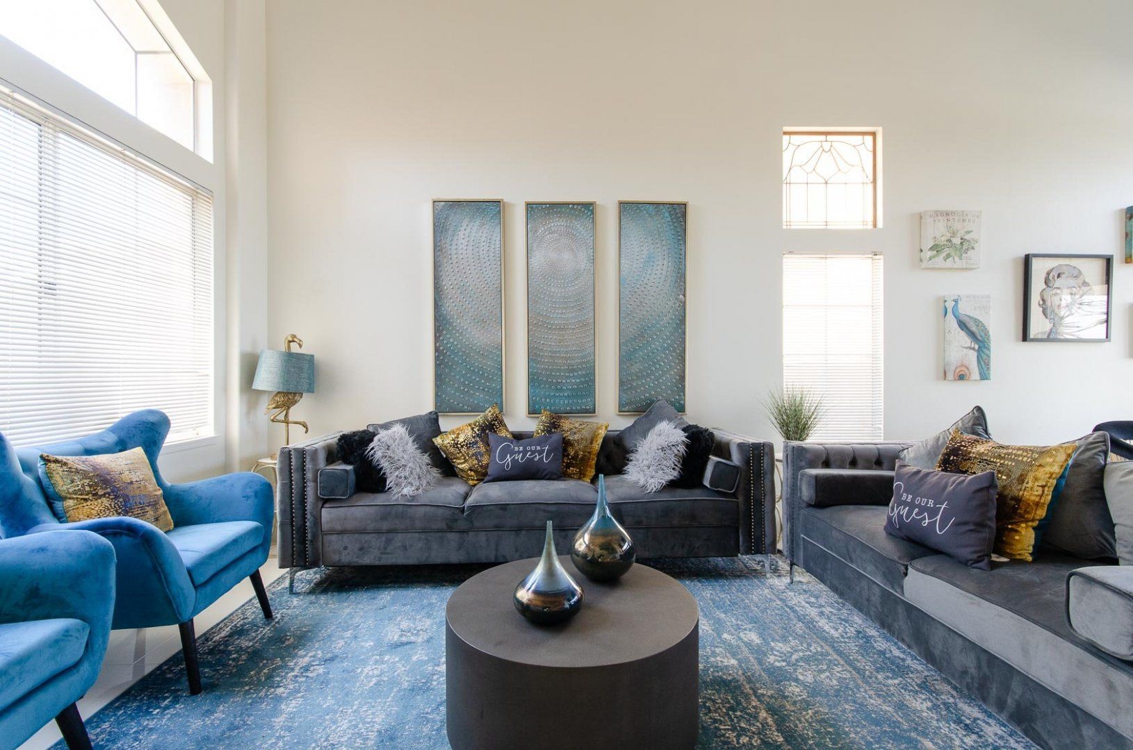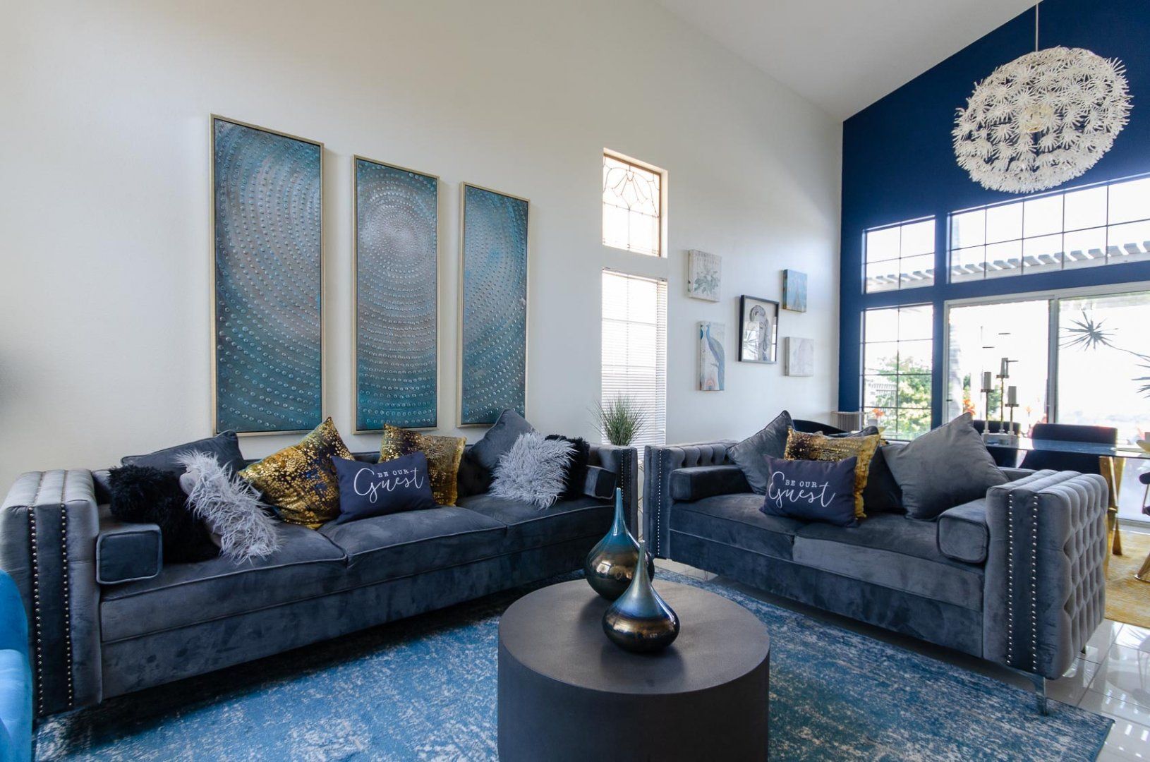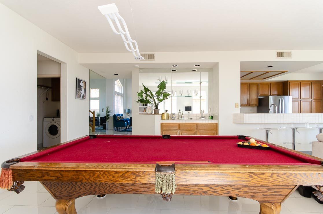 Inside, the main living space is a calm sea of aquamarine, blue and turquoise. From watery, ripple-effect artworks to the soft velveteen greys and turquoise of the plush sofas. High ceilings and large windows make the whole space feel spacious and relaxing. We love the church-style arch window at one end, which is echoed in some of the bedrooms. The other end of the living area is for dining, with the table looking out onto the patio, the lush garden and those wide-open views beyond. There’s an entertaining family room off the kitchen, complete with a pool table and large TV – perfect to plant the kid's in front of as they come down off the high of their visit to Disneyland.