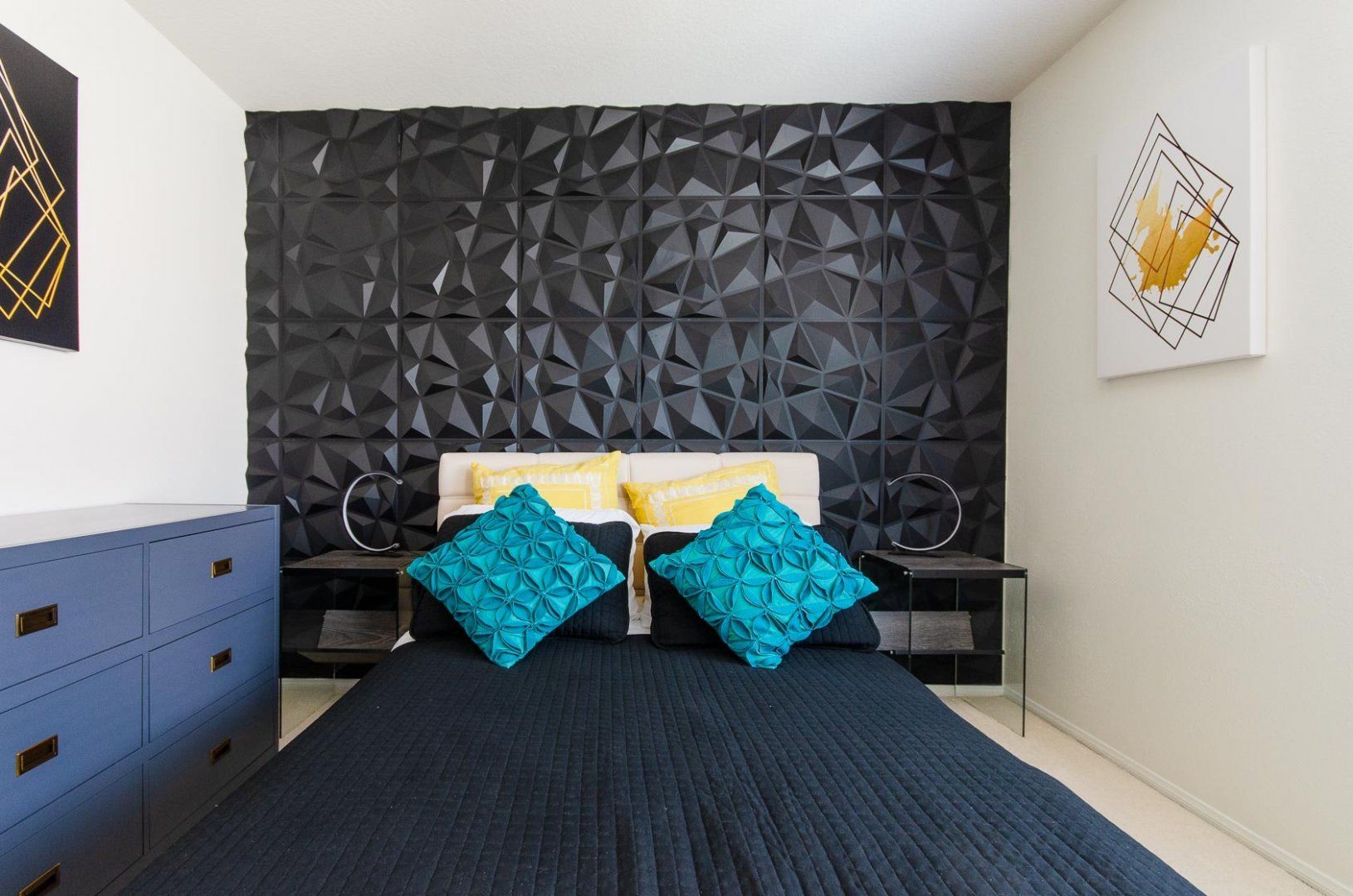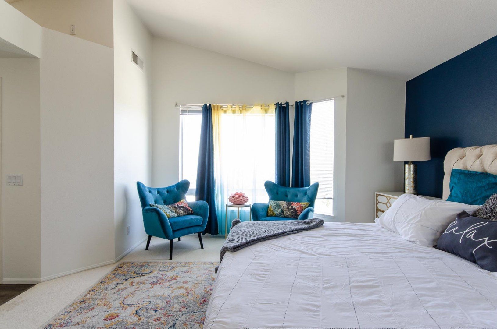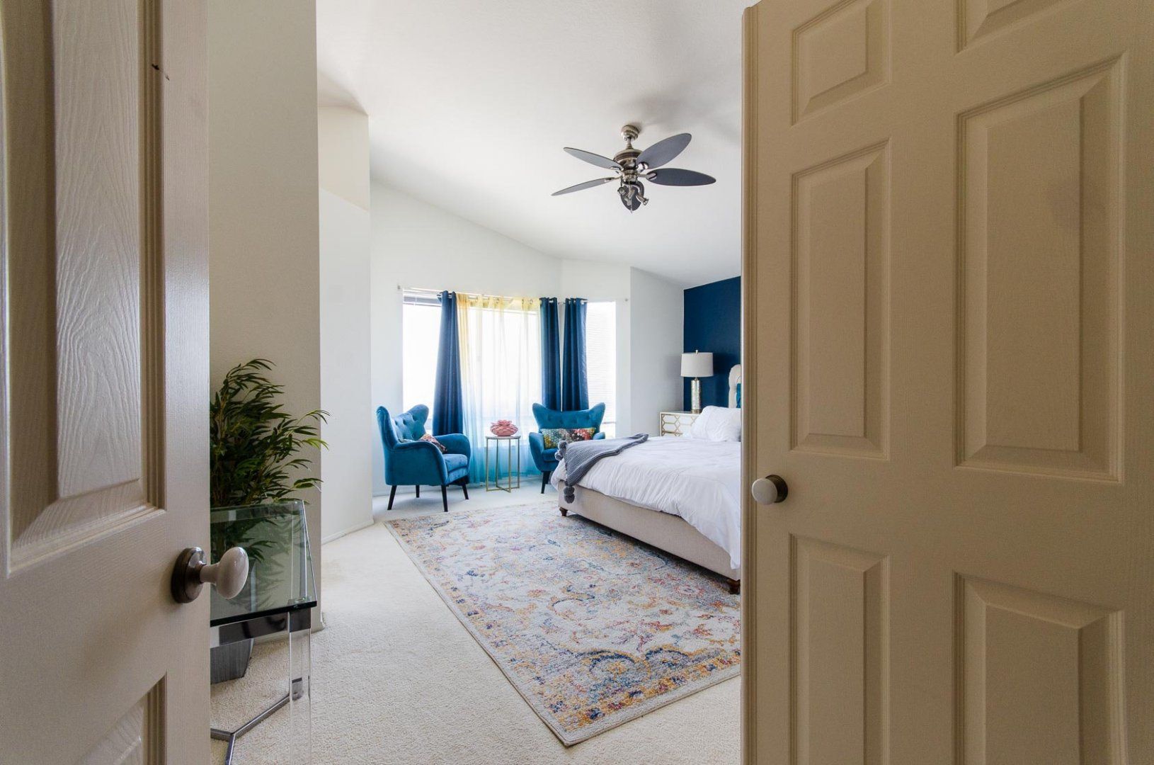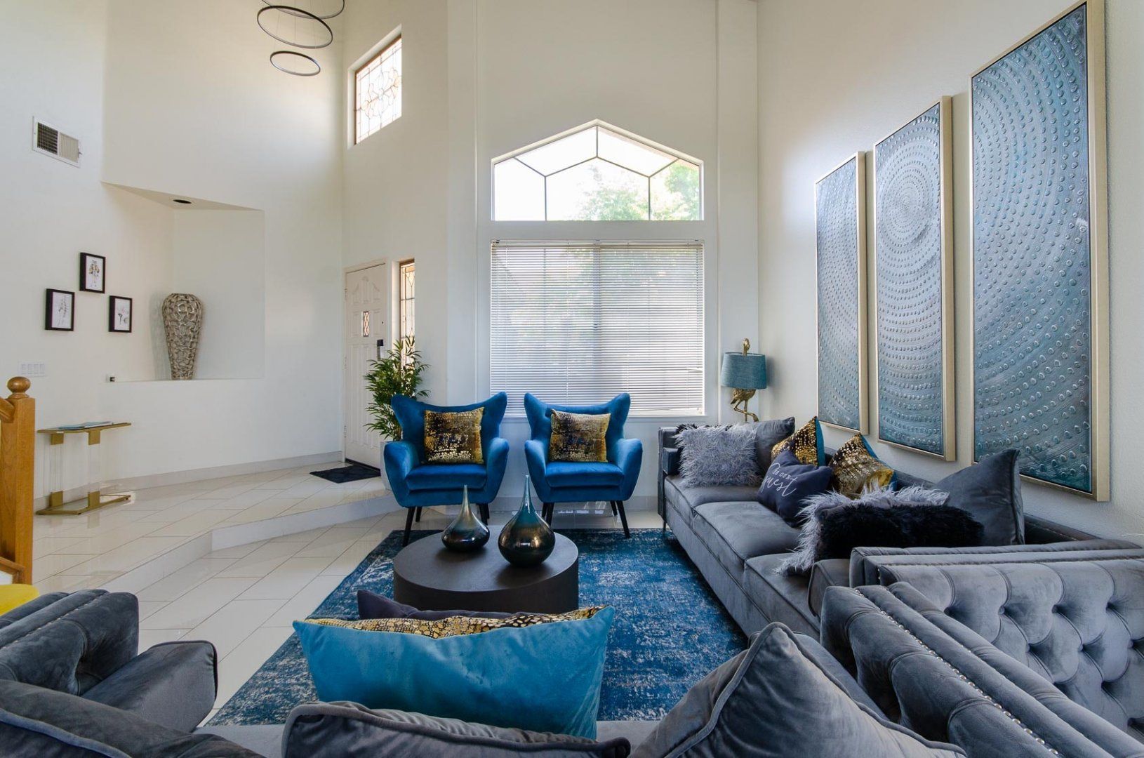 Inside, the main living space is a calm sea of aquamarine, blue and turquoise. From watery, ripple-effect artworks to the soft velveteen greys and turquoise of the plush sofas. High ceilings and large windows make the whole space feel spacious and relaxing. We love the church-style arch window at one end, which is echoed in some of the bedrooms. The other end of the living area is for dining, with the table looking out onto the patio, the lush garden and those wide-open views beyond. There’s an entertaining family room off the kitchen, complete with a pool table and large TV – perfect to plant the kid's in front of as they come down off the high of their visit to Disneyland.