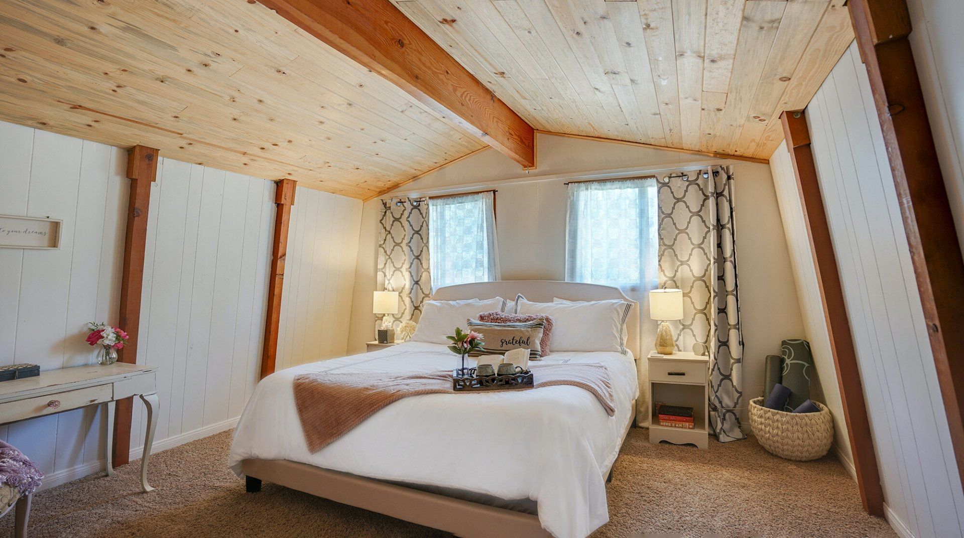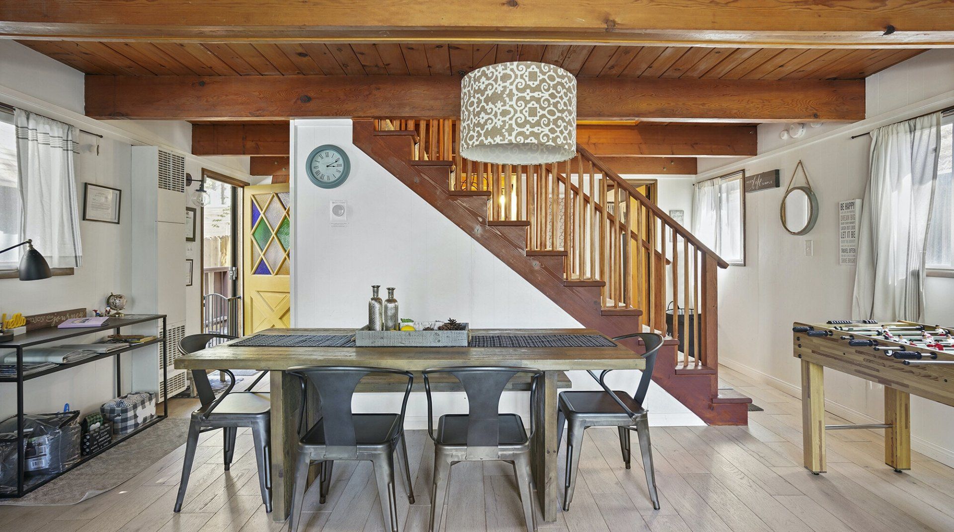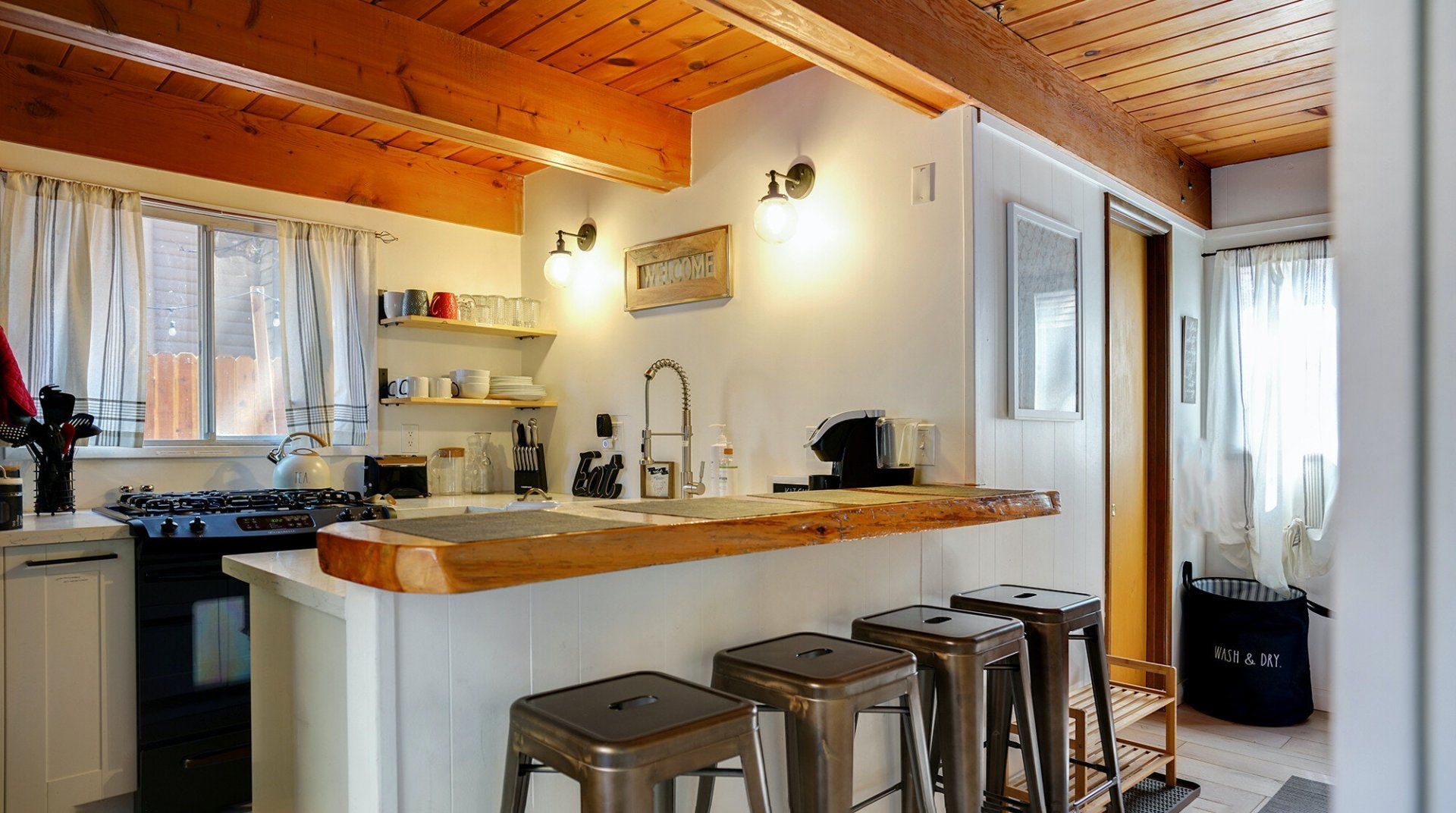 Retreat to this snug and stylish cabin after a day on the slopes at Bear Mountain. Sequestered in the forest and close to Big Bear Lake, this two-bedroom home is perfect for those families looking to get outside in both snow and shine. It’s not just the gambrel-style architecture that gives this 1970s home its charm, but the rustic and industrial interior. Pull back the bench at the dinner table and warm your snow-covered toes in front of a roaring red brick fireplace. We especially love the farmhouse-style combination of wood and white-panelled walls. Entertaining the children is easy in this home, with board games, foosball, a BBQ and hot tub. Though, we think adults may prefer to make a beeline for the tub first and steal a moment of peace. Don’t forget to bring along your pampered-pooch, this home is dog friendly.