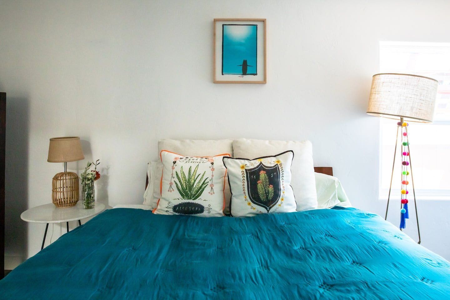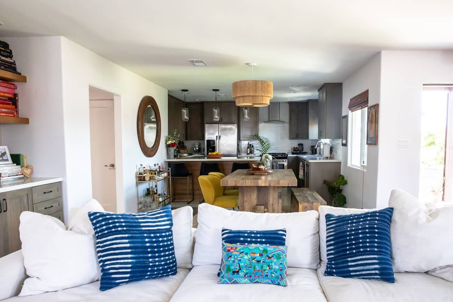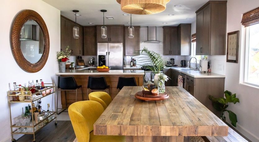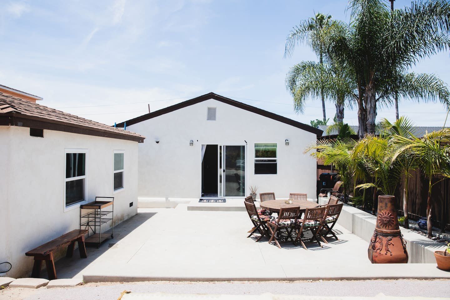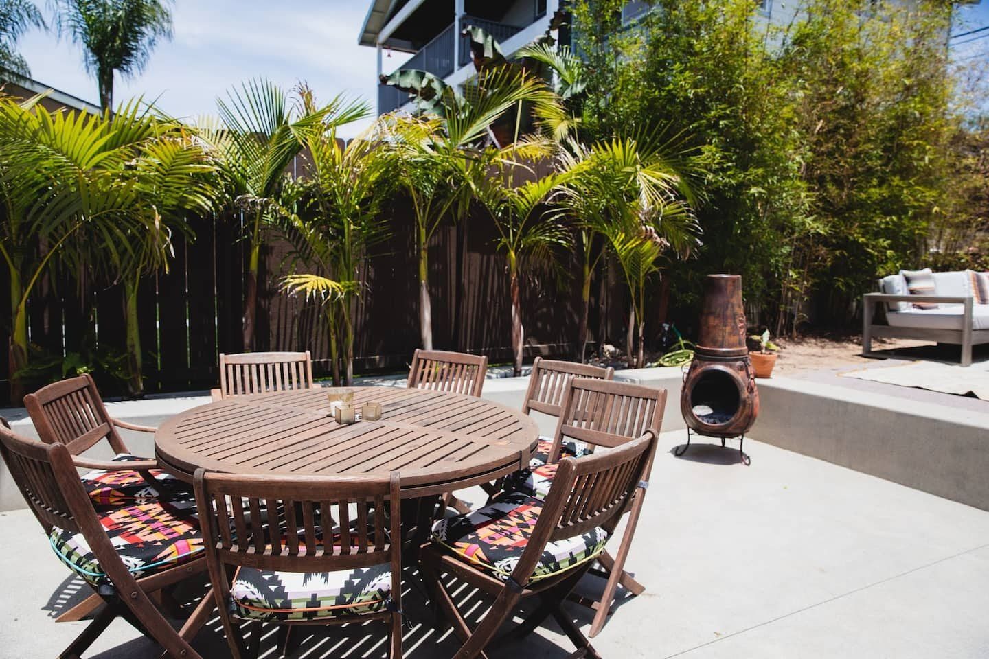 In a tranquil San Deigo neighbourhood, this beautiful home is a five-minute drive from the waterside activities of Mission Bay Park and seven minutes from Sea World. A traditional, Spanish-style exterior hides a distinctly boho-luxe vibe inside. The white of the living room is brought to life with a small jungle of house plants, and the dining table made from reclaimed wood is an ideal place to gather for a group meal. Your host is a nutritionist and chef (she provides a fabulous list of restaurant recommendations), so rest assured the kitchen comes fully stocked with everything you need, including a bar trolley with all the necessities for mixing up a cocktail or two. Outside, the back terrace is a real sun trap. A gas grill awaits for long, sunny lunches outside and a big L-shaped sofa catches the afternoon rays. Come evening, a chiminea can be lit to keep the cold at bay.