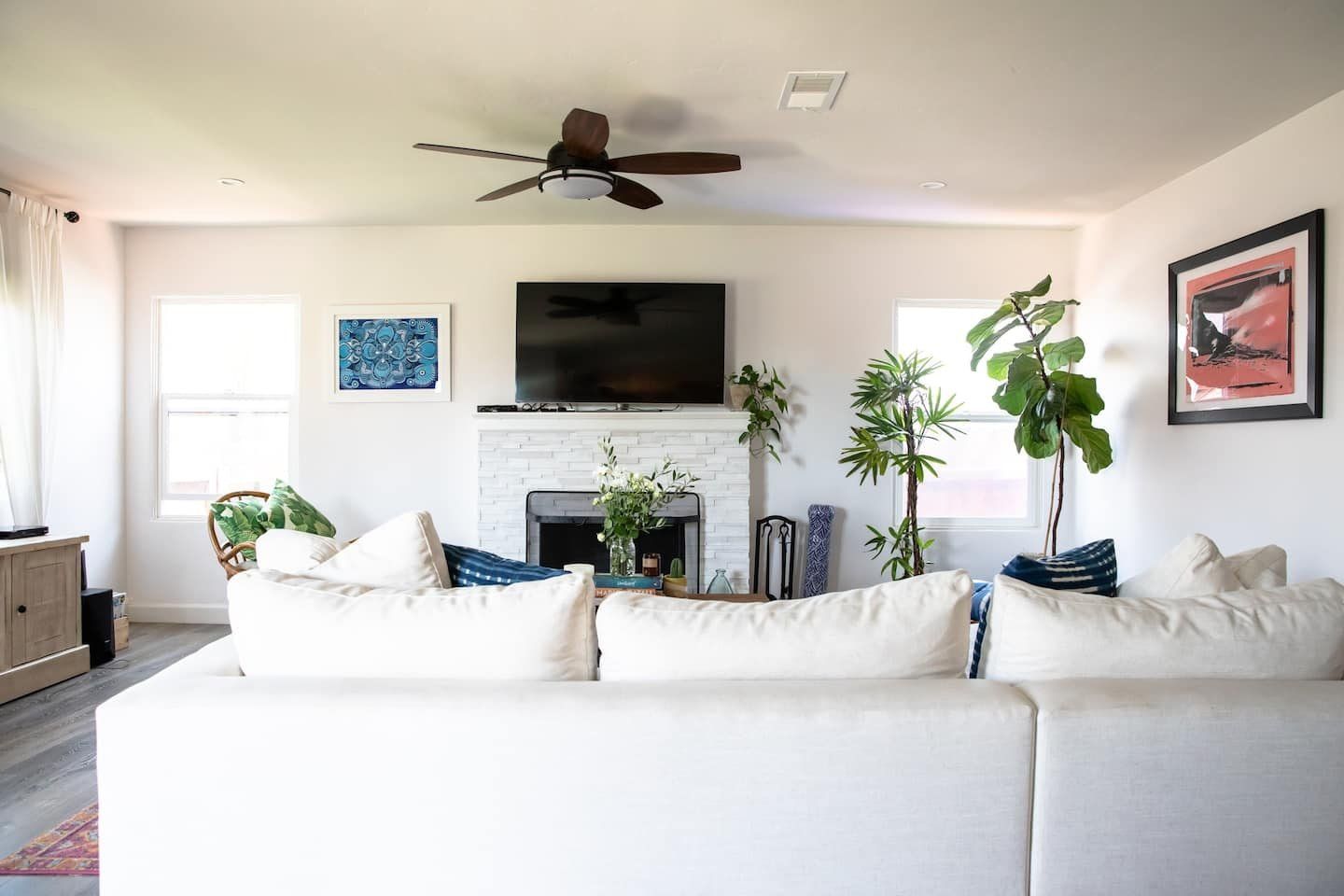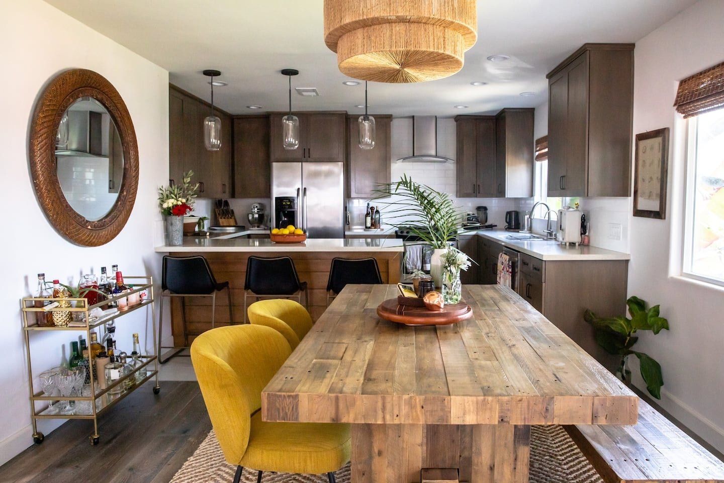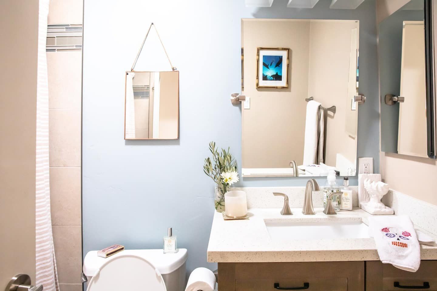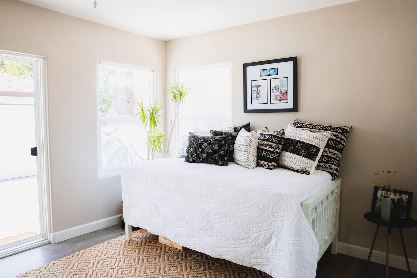 In a tranquil San Deigo neighbourhood, this beautiful home is a five-minute drive from the waterside activities of Mission Bay Park and seven minutes from Sea World. A traditional, Spanish-style exterior hides a distinctly boho-luxe vibe inside. The white of the living room is brought to life with a small jungle of house plants, and the dining table made from reclaimed wood is an ideal place to gather for a group meal. Your host is a nutritionist and chef (she provides a fabulous list of restaurant recommendations), so rest assured the kitchen comes fully stocked with everything you need, including a bar trolley with all the necessities for mixing up a cocktail or two. Outside, the back terrace is a real sun trap. A gas grill awaits for long, sunny lunches outside and a big L-shaped sofa catches the afternoon rays. Come evening, a chiminea can be lit to keep the cold at bay.