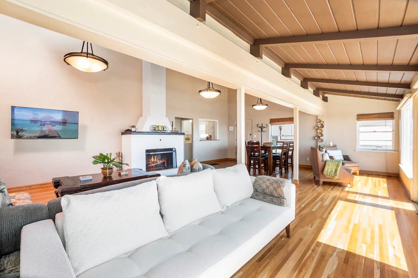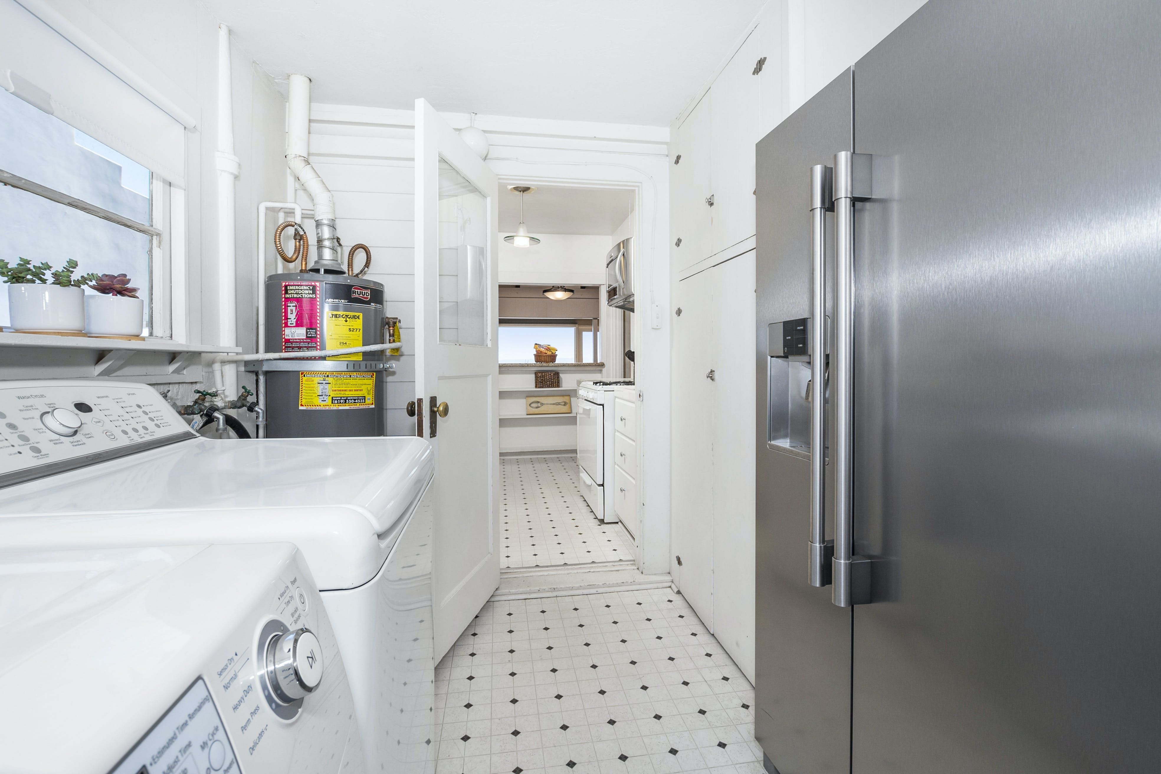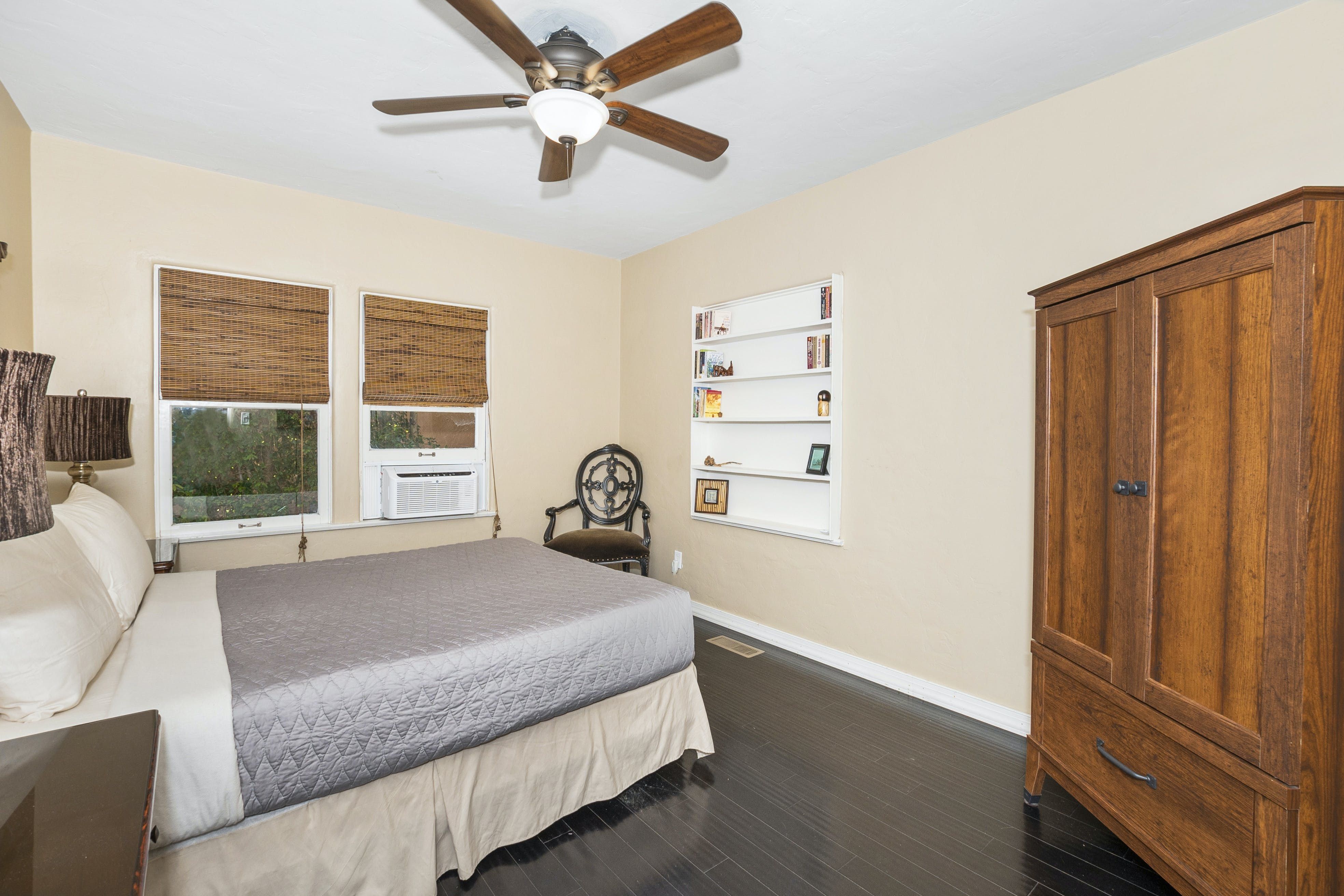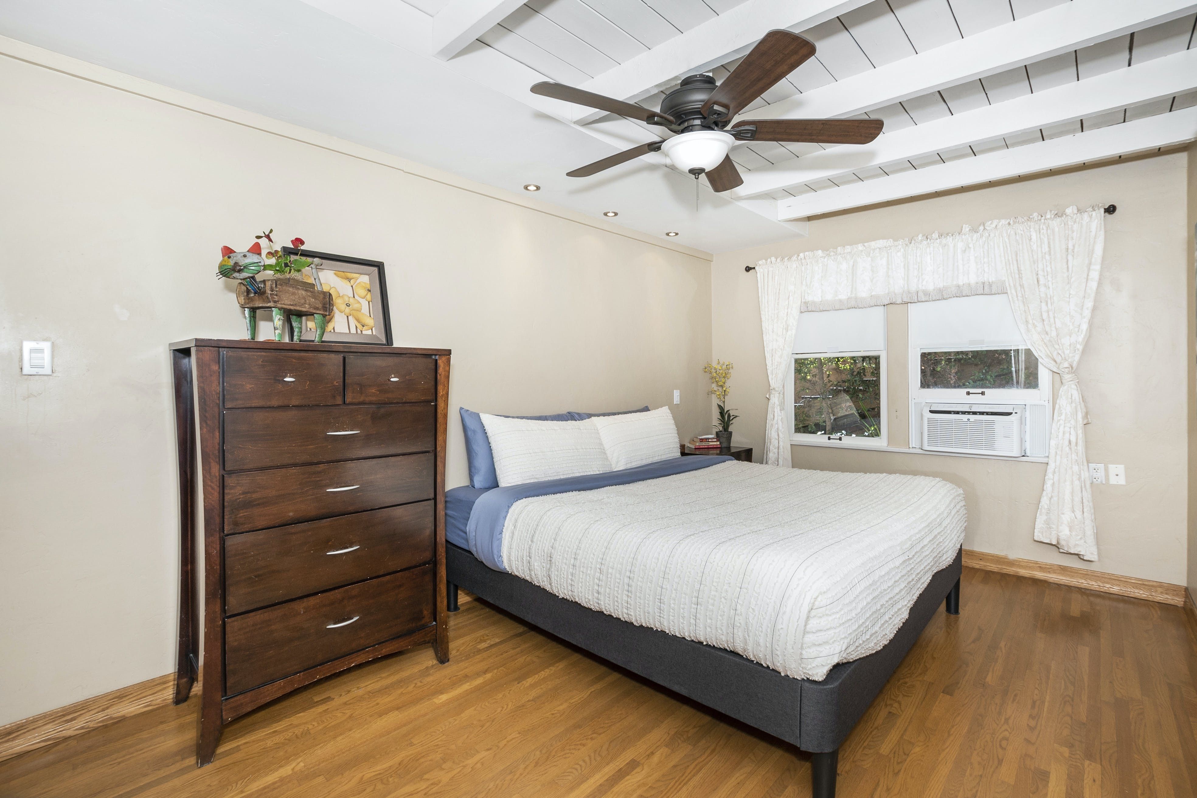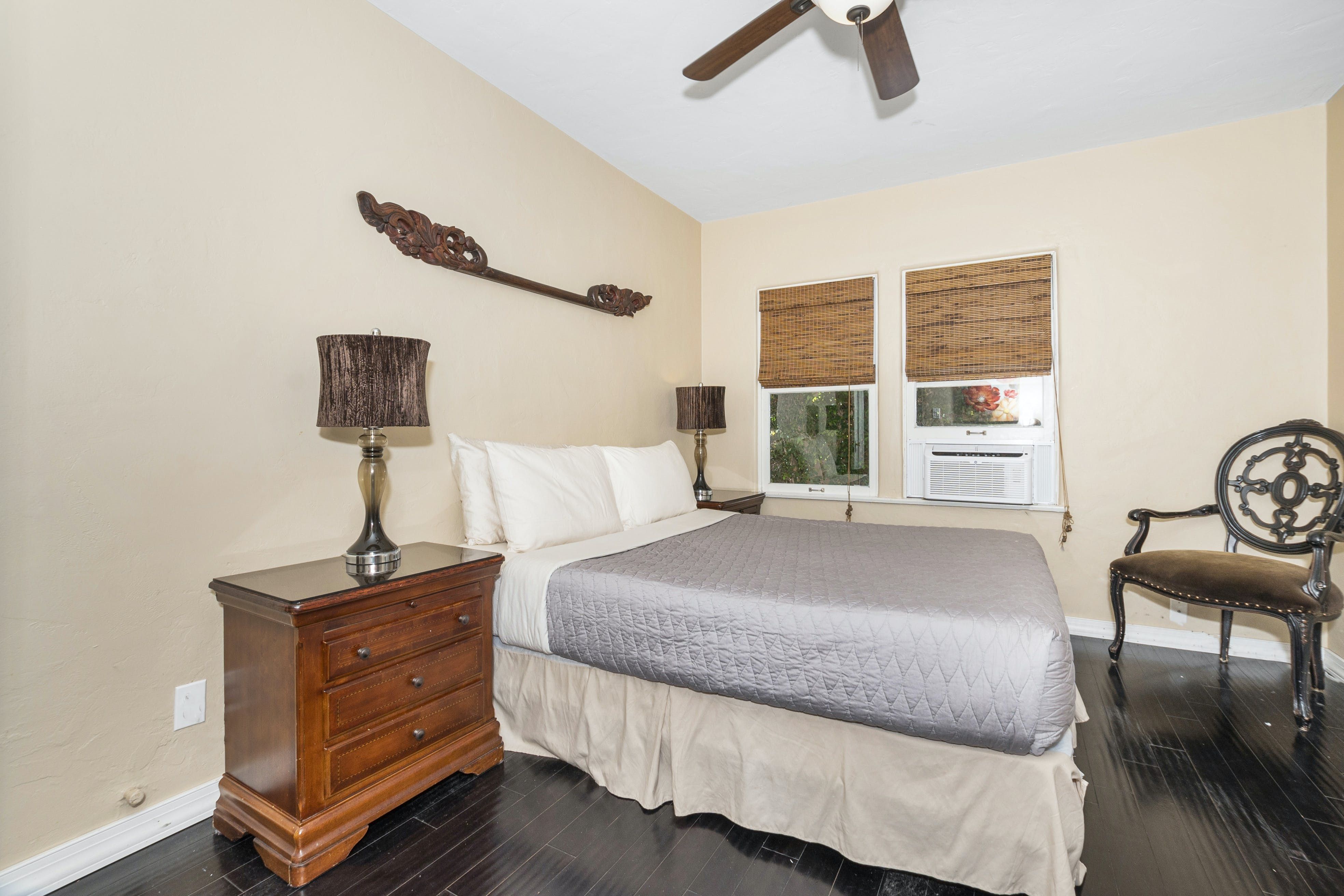 With breathtaking views of Coronado and San Diego harbour, this charming 1920s California-style bungalow sits atop a west-facing hillside in an affluent part of town. Climb the stairs from street level and step into the main open-plan living area and kitchen. Here, you'll find a space blessed with high ceilings and a wall of glass with breathtaking views that leads directly onto a vast twenty-six-foot balcony running the length of the house. Pour yourself a welcome glass of Prosecco from the fridge and relax as you gaze out at the ocean and the planes coming in to land at the airport. Whether you're in town for work or play, location is key, and you couldn't be better placed here – just minutes from San Diego International Airport, Little Italy, Downtown Gaslamp, and the area's beaches. That said, there are plenty of wonderful cafes and historic neighbourhoods within walking distance, so you don't have to rely on four wheels all the time. And even when you're looking to travel further afield, it's a short stroll to the trolley stop, which can whisk you to the Gaslamp Quarter. Alternatively, take the COASTER train north to chic beach towns like Solana Beach, Encinitas and Carlsbad. At the end of a packed day, head through to the soothing bedrooms, which are decorated in neutral tones that contrast nicely with the dark wooden furnishings, while the comfortable beds make getting up in the morning a struggle.