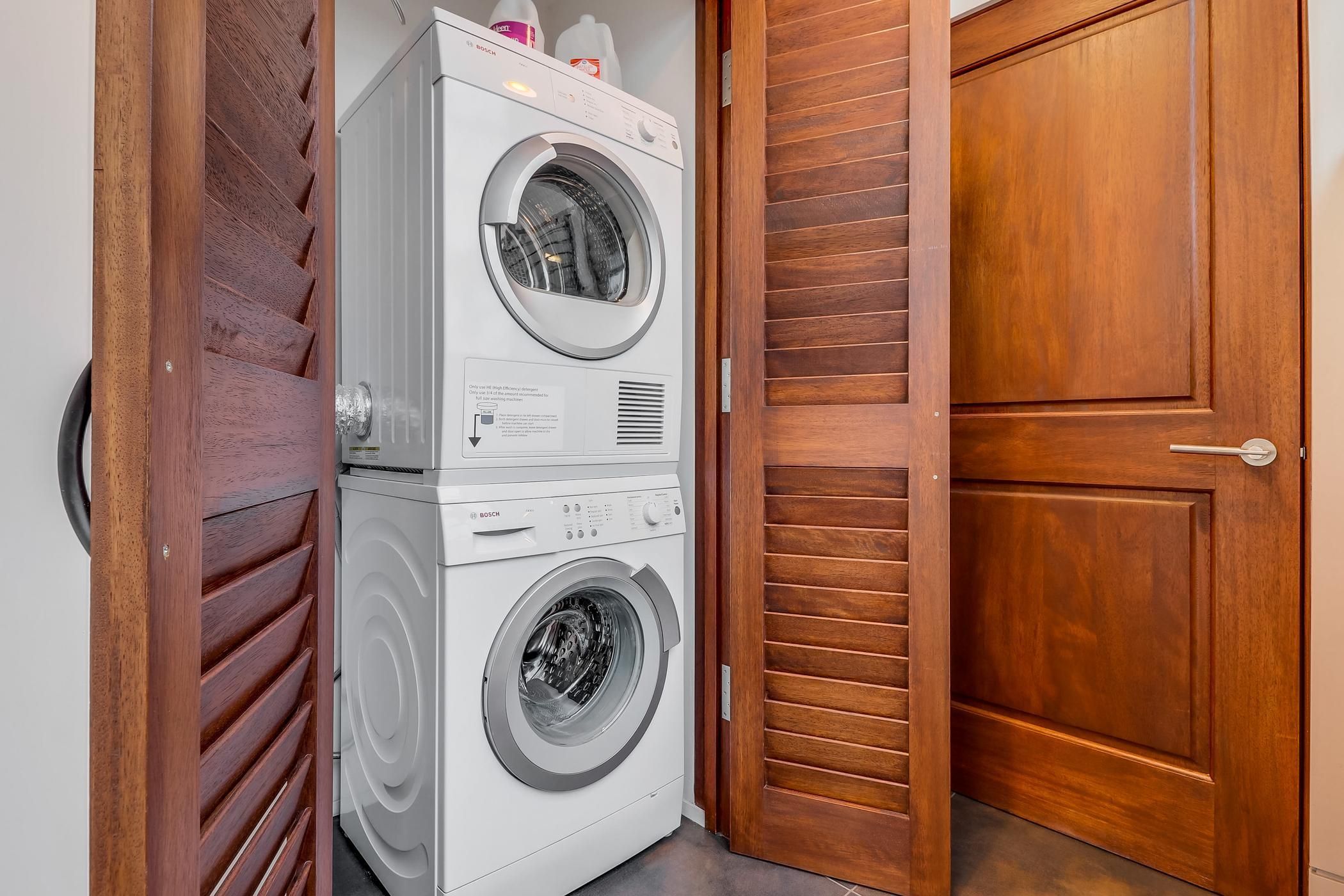 This home impresses from the outset with its multi-tiered concrete facade. The chic, free-flowing interior exudes calm, cloaked in rich, earthy tones and bursts of colour. Large windows usher in floods of sunlight, and we love the open-plan living space, primed for entertaining with plush upholstery, a spacious breakfast bar and a fully-equipped kitchen. Though, the real highlight is the outdoor space. Positioned across three levels, a balcony, barbecue patio, and furnished sundeck offer sweeping views of the bay and the Pacific Ocean's endless blue. After a day of adventure, rustle up an alfresco feast on the grill or enjoy a glass of wine on the rooftop patio as the sun dips below the horizon.