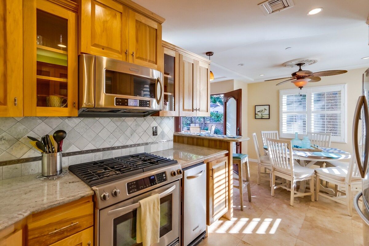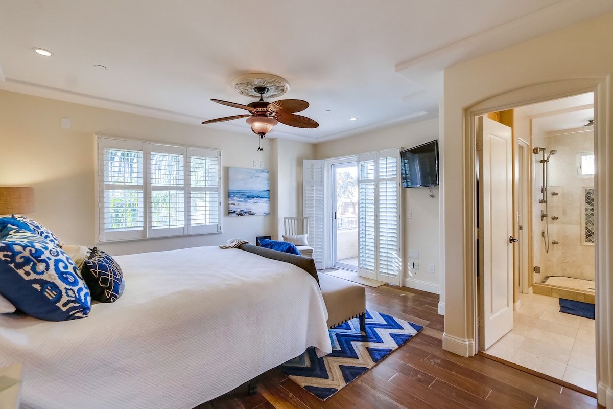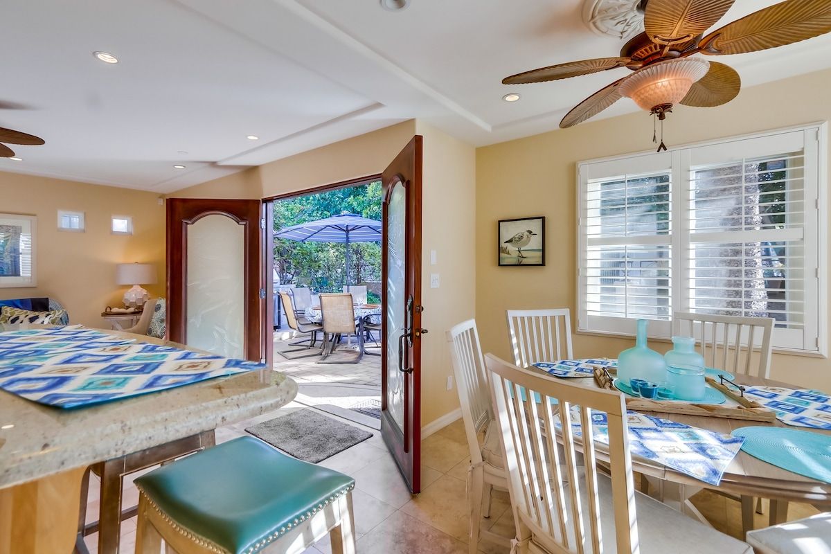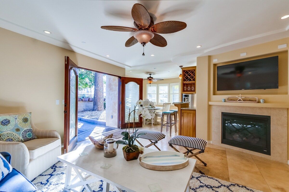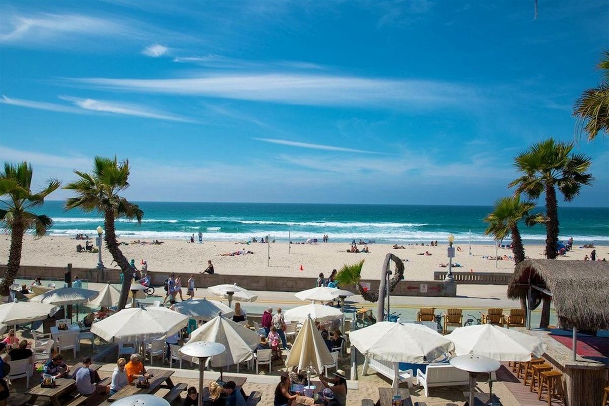 Shaded by towering tropical trees, the best way to start the day is with the salty sea breeze in your hair here. Sun-soaked and earthy, we love the feel of this home. And it gets better. Just a few footsteps take you straight to South Mission Beach, where you have amazing restaurants, bars, and markets at your fingertips. While the beach is hard to tear yourself away from, we'd spare some time to explore nearby golf courses, shops, and the good old Giant Dipper Roller Coaster at the Belmont Amusement Park – all just a short walk away. At the end of the day, you can return to your modern-Victorian home for a soak in the tub and a barbecue in the private courtyard.