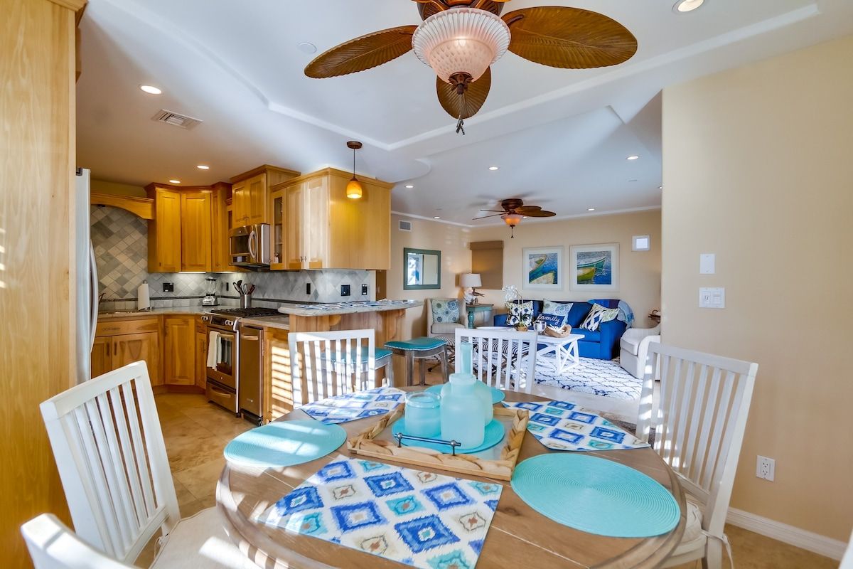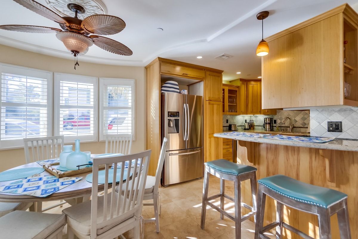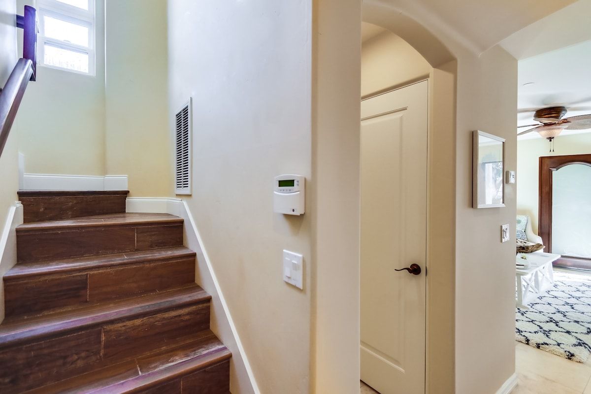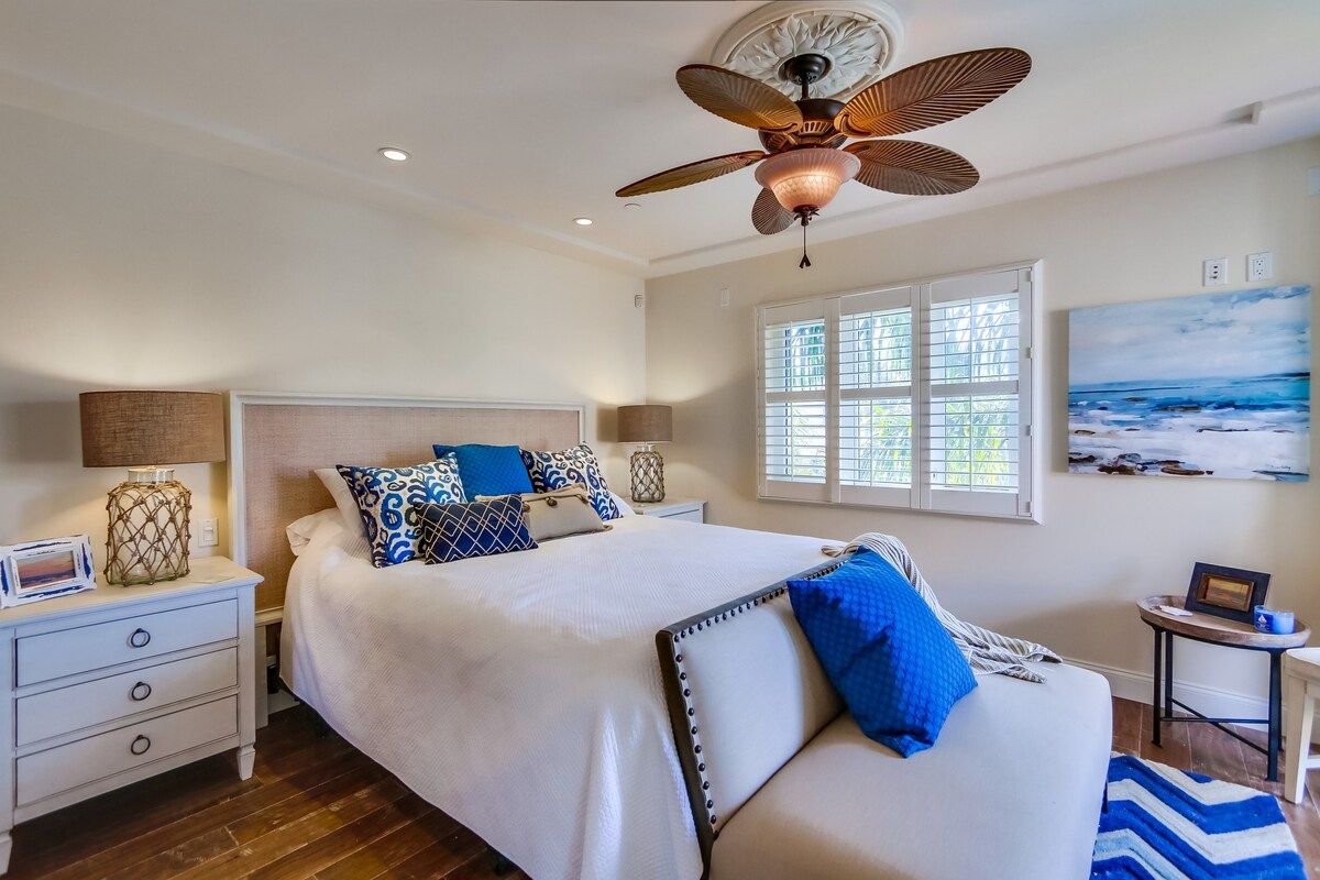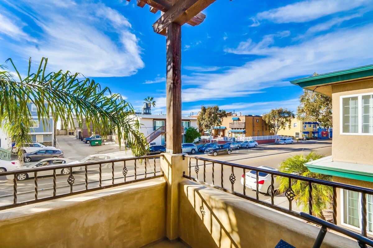 Shaded by towering tropical trees, the best way to start the day is with the salty sea breeze in your hair here. Sun-soaked and earthy, we love the feel of this home. And it gets better. Just a few footsteps take you straight to South Mission Beach, where you have amazing restaurants, bars, and markets at your fingertips. While the beach is hard to tear yourself away from, we'd spare some time to explore nearby golf courses, shops, and the good old Giant Dipper Roller Coaster at the Belmont Amusement Park – all just a short walk away. At the end of the day, you can return to your modern-Victorian home for a soak in the tub and a barbecue in the private courtyard.