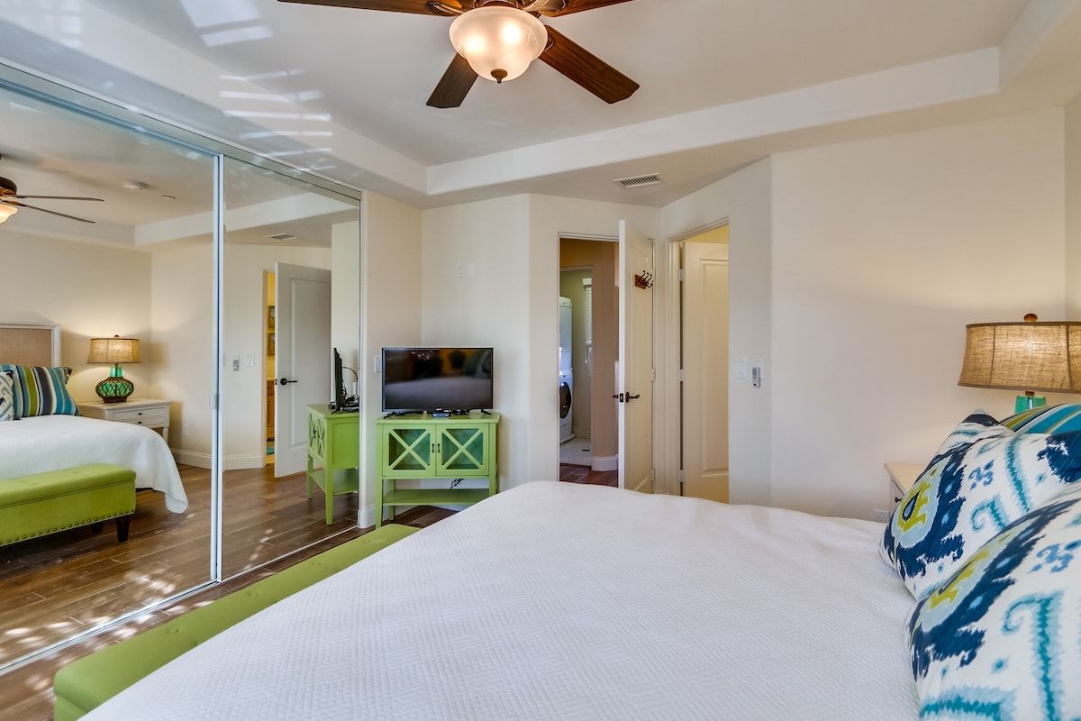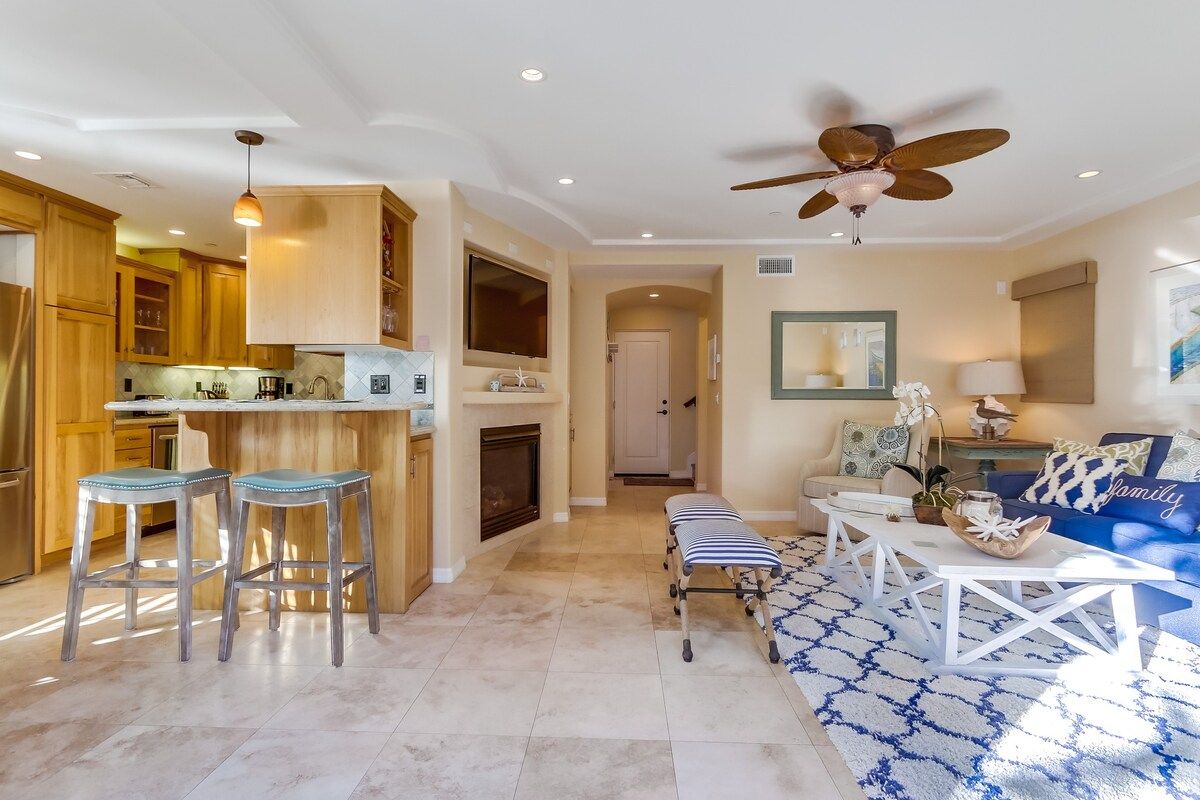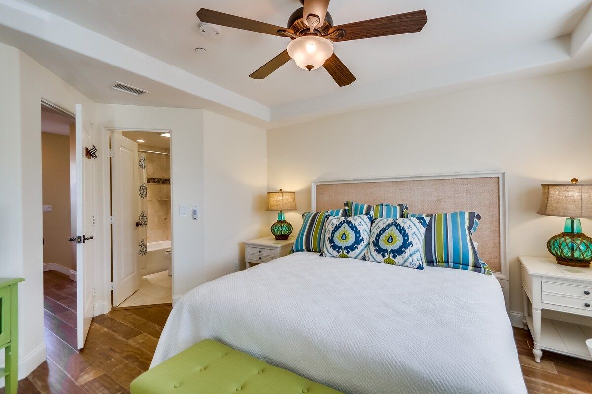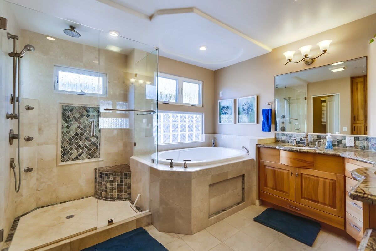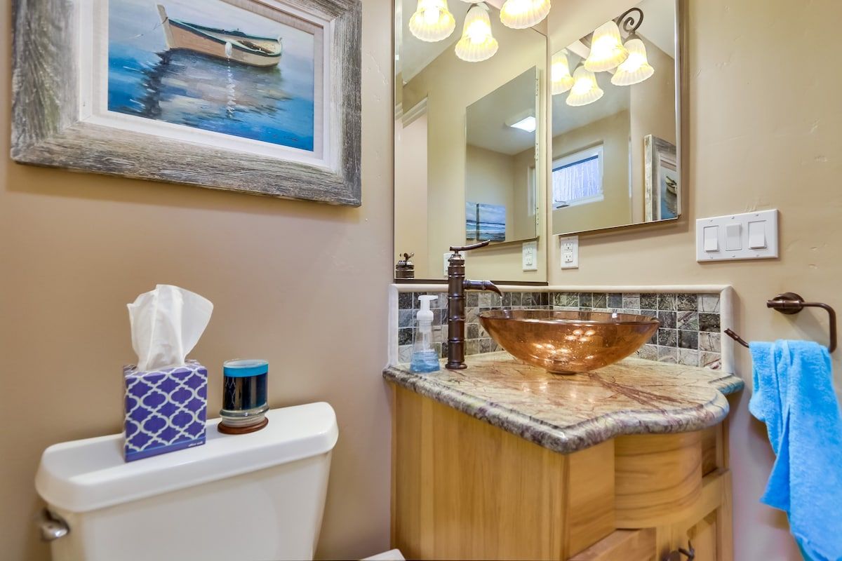 Shaded by towering tropical trees, the best way to start the day is with the salty sea breeze in your hair here. Sun-soaked and earthy, we love the feel of this home. And it gets better. Just a few footsteps take you straight to South Mission Beach, where you have amazing restaurants, bars, and markets at your fingertips. While the beach is hard to tear yourself away from, we'd spare some time to explore nearby golf courses, shops, and the good old Giant Dipper Roller Coaster at the Belmont Amusement Park – all just a short walk away. At the end of the day, you can return to your modern-Victorian home for a soak in the tub and a barbecue in the private courtyard.
