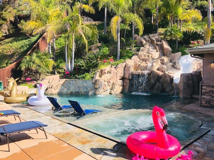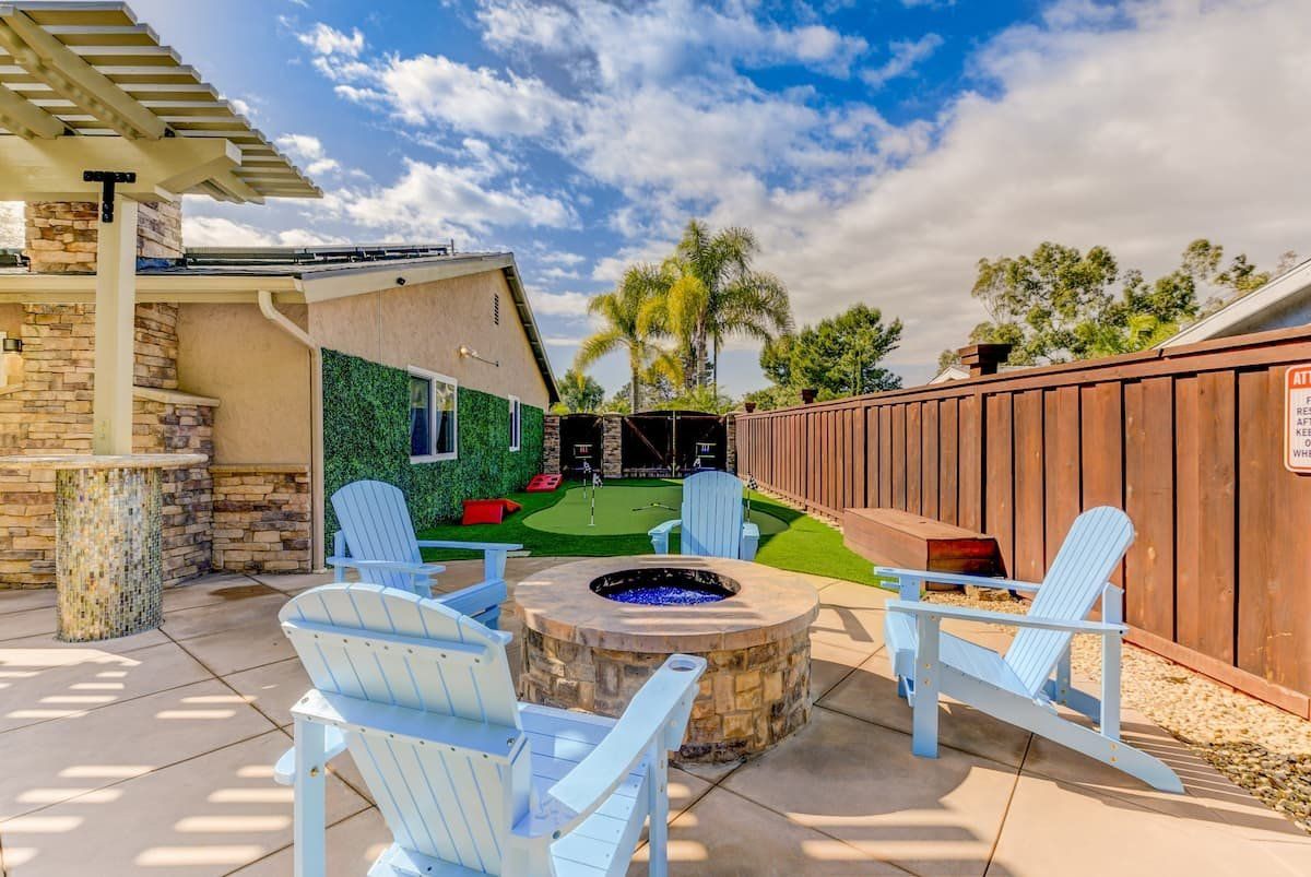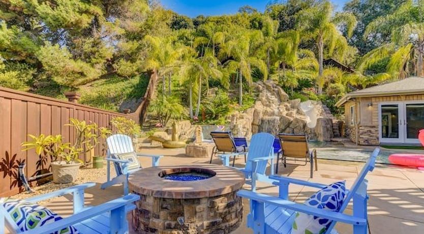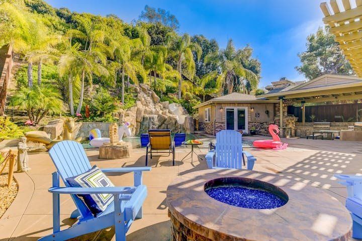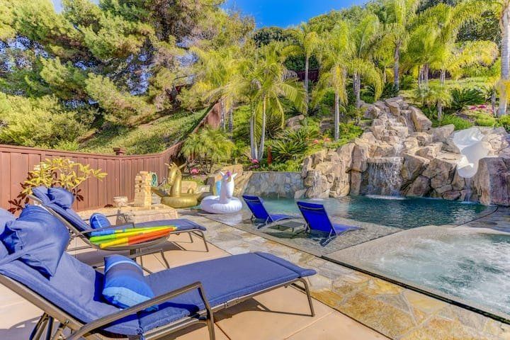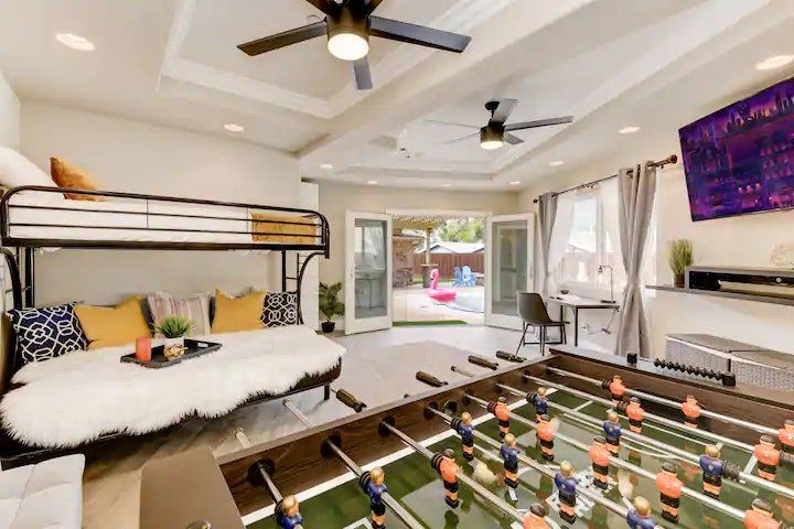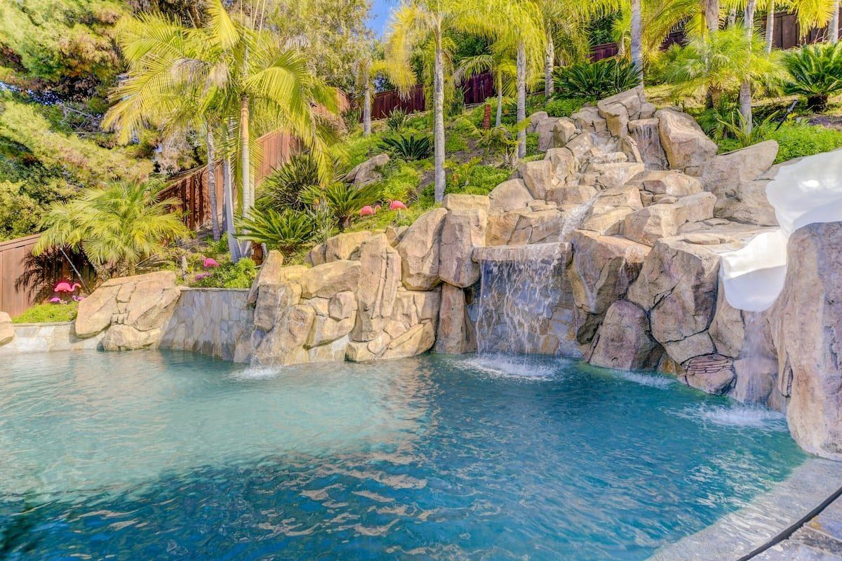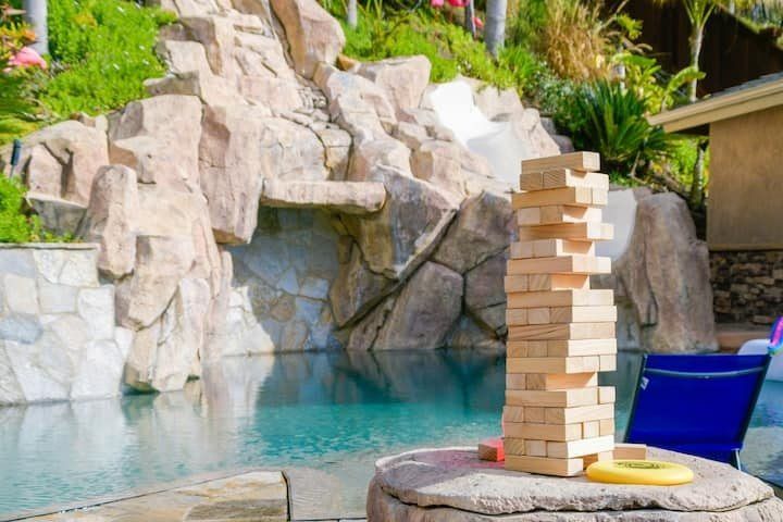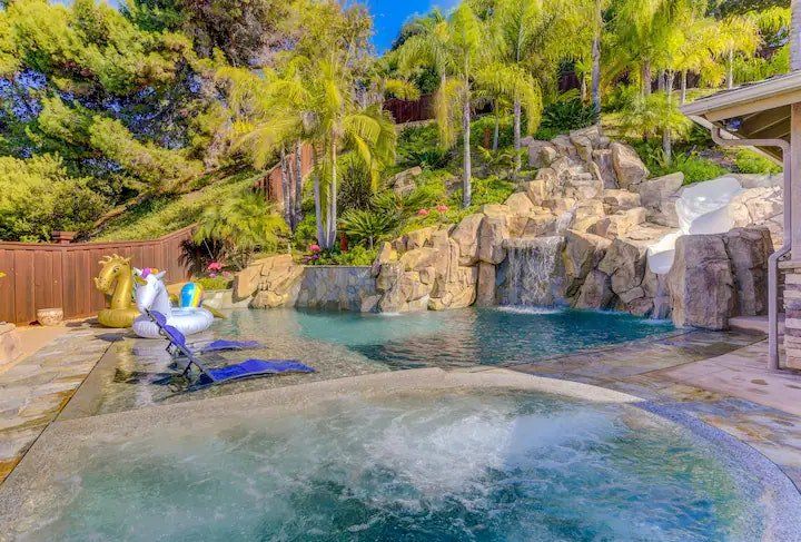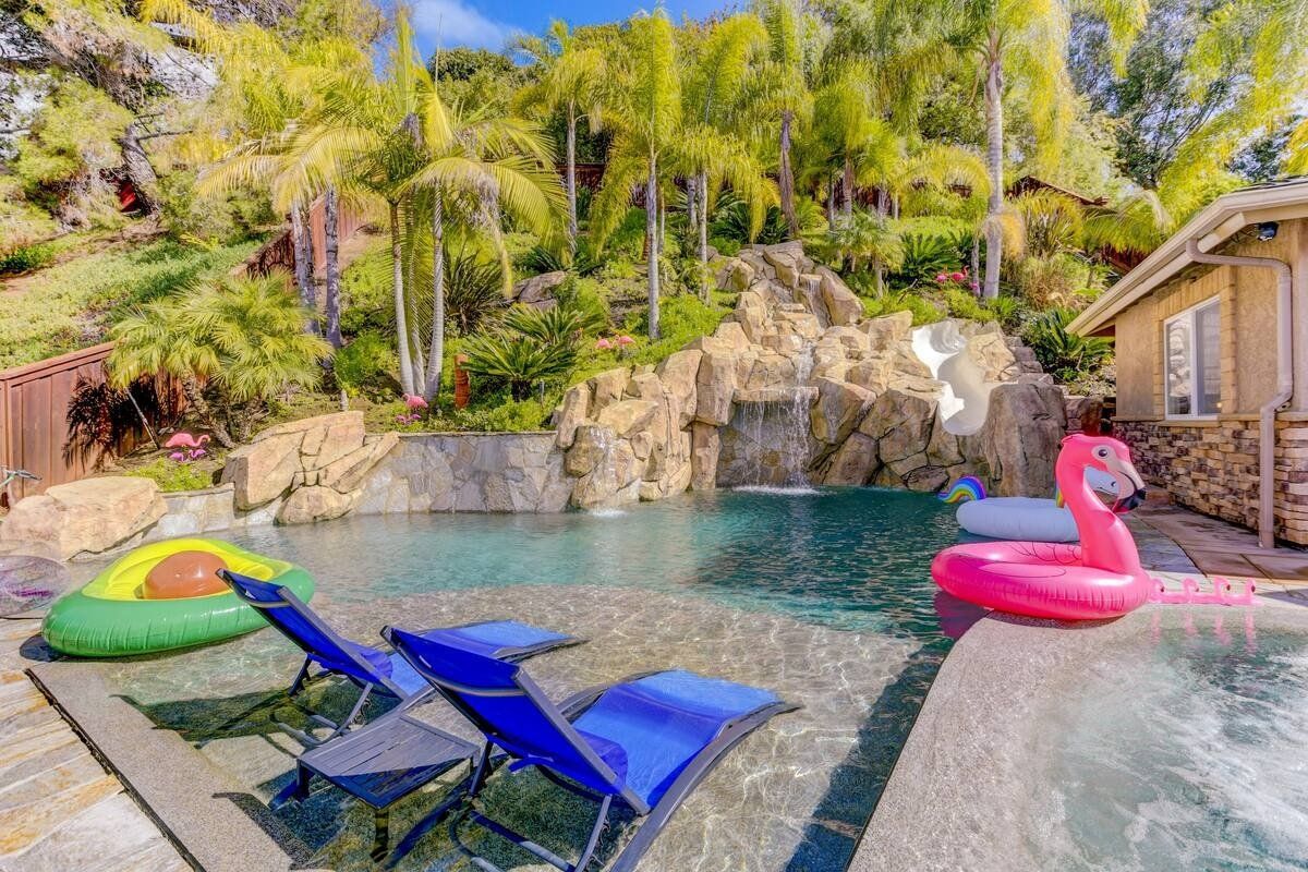 Let’s be clear: this is not a fabulous home, with a great backyard, but a fabulous backyard with a great home. Outside stuns with a waterfall pool, a putting green, fire pit, and luxurious, covered barbecue area. With palm trees and a pink flamingo for company, this is your very own cabana club, minus the beach – and the closest one in Carlsbad is only a short drive away. While the party is undoubtedly underway outdoors, there is certainly no sinking feeling when you step inside. Open plan living keeps the summer air flowing throughout its fresh and modern interior, with wide, glass doors helping to merge spaces together. The living area and bunkbed games room open up right onto the terrace, creating one massive entertainment space. One group might be playing giant Jenga on the patio, while another is splashing about in the warm waters of the sunken jacuzzi, or playing a round of golf, even cheering over a game of foosball. Spoilt for choice of activities, this is a home for an incredible, sociable break and adventure without the need to venture beyond your front drive. In the serene San Diego County, where the West Coast sun shines all day, this is one instance, perhaps, where it’s what’s on the outside, not inside, that really counts.
