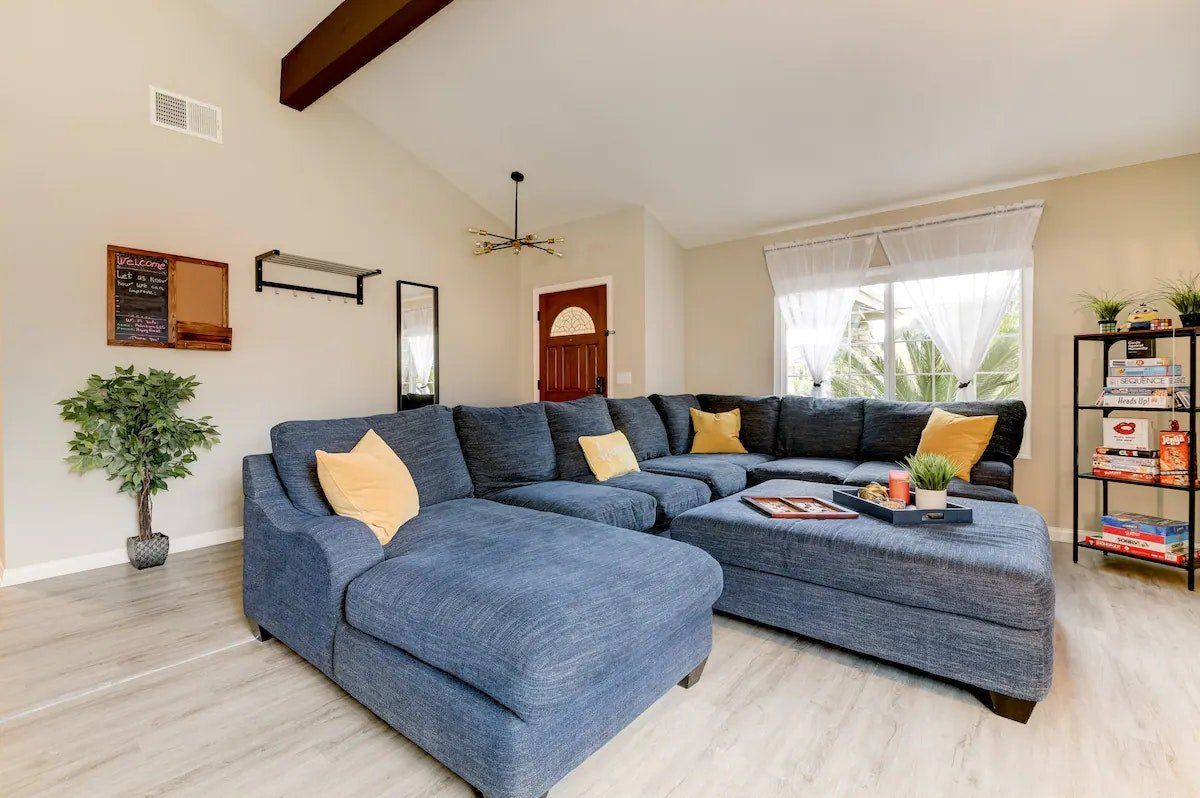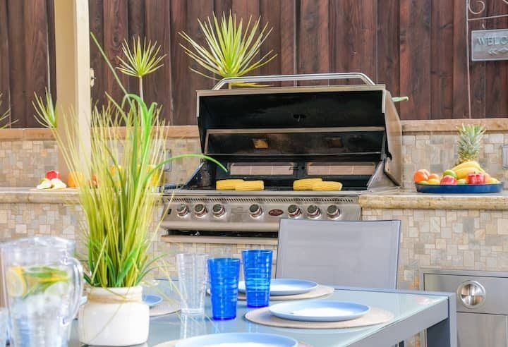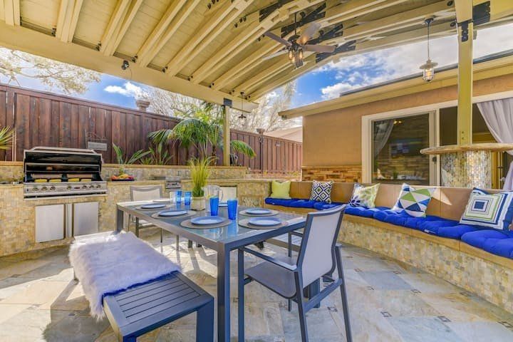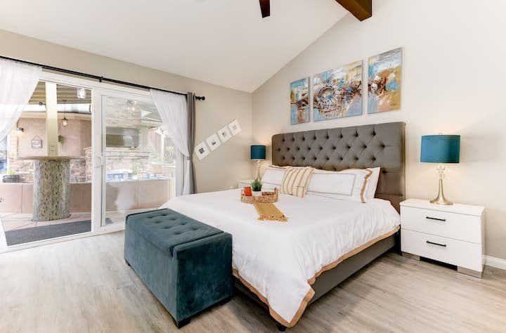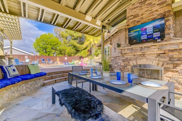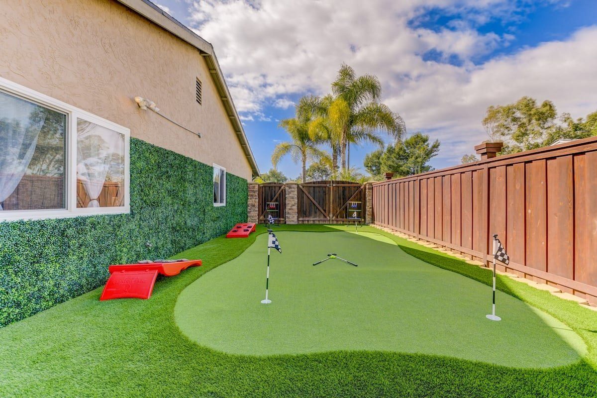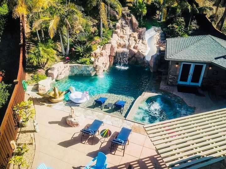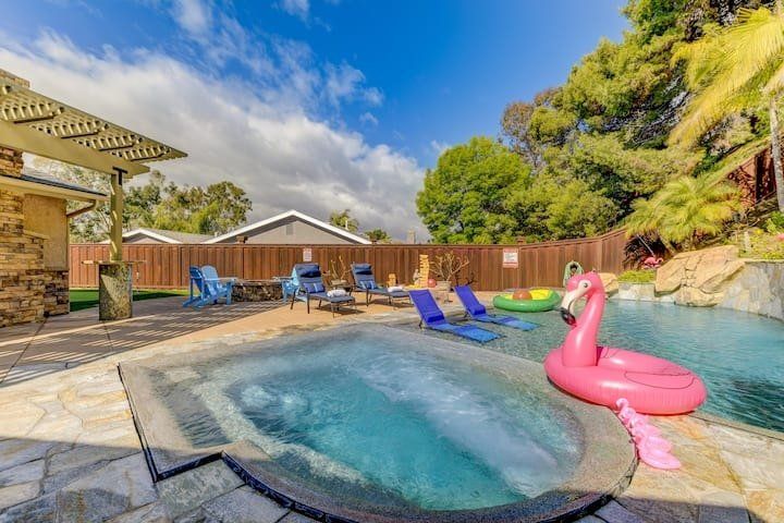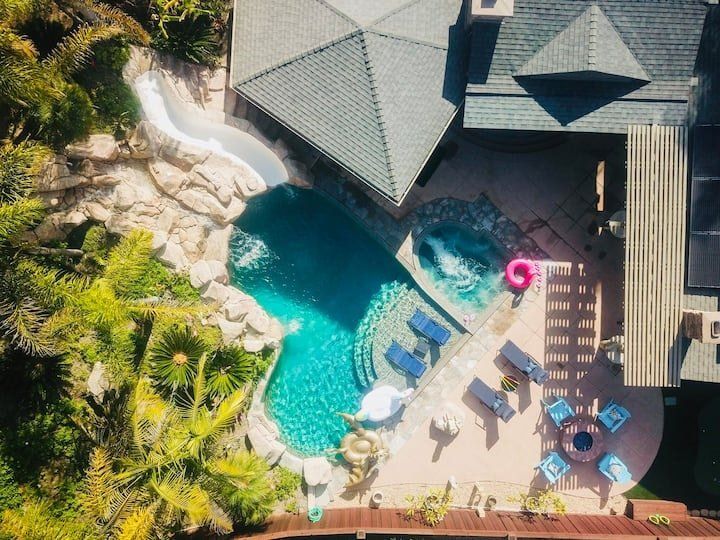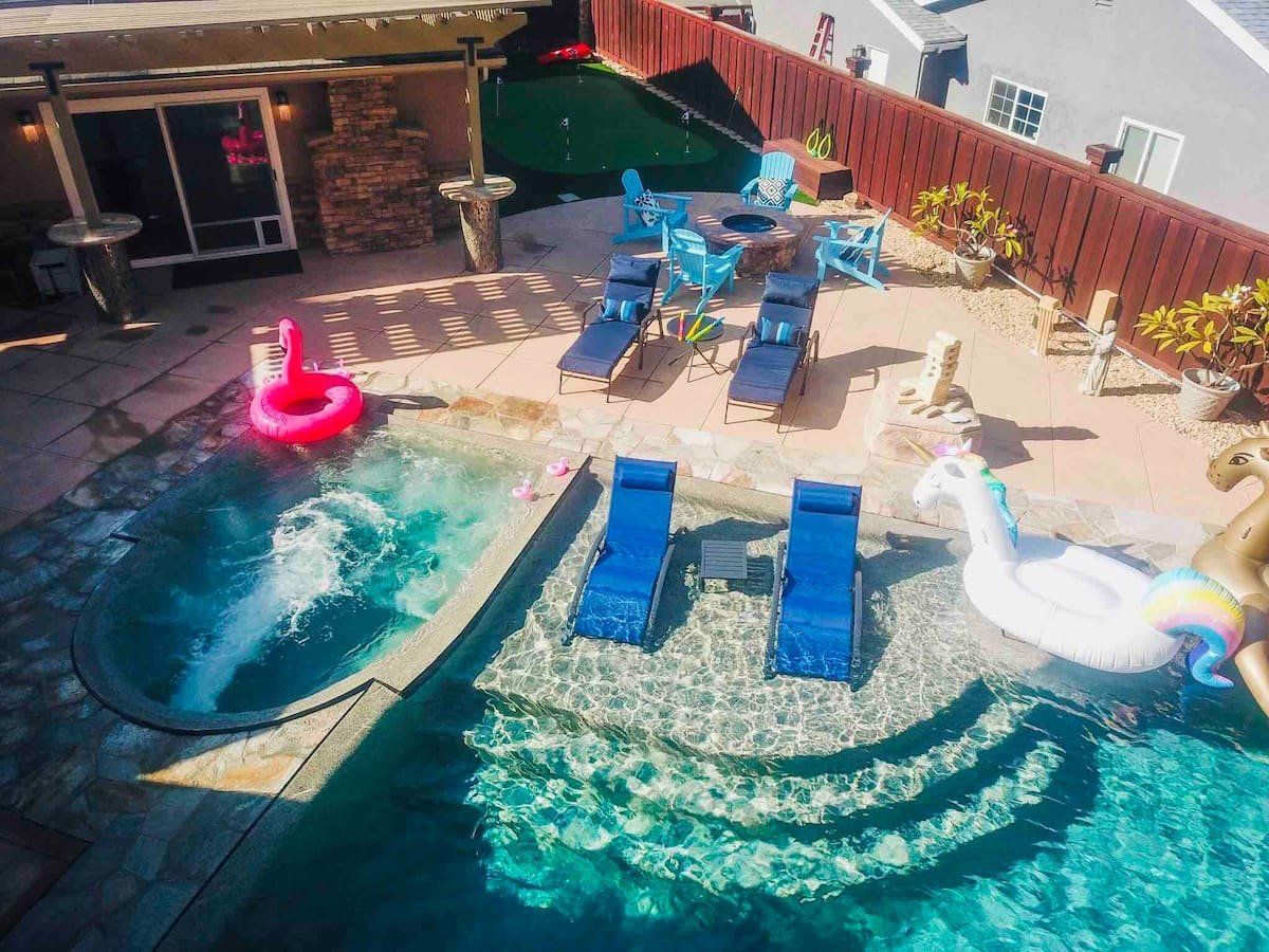 Let’s be clear: this is not a fabulous home, with a great backyard, but a fabulous backyard with a great home. Outside stuns with a waterfall pool, a putting green, fire pit, and luxurious, covered barbecue area. With palm trees and a pink flamingo for company, this is your very own cabana club, minus the beach – and the closest one in Carlsbad is only a short drive away. While the party is undoubtedly underway outdoors, there is certainly no sinking feeling when you step inside. Open plan living keeps the summer air flowing throughout its fresh and modern interior, with wide, glass doors helping to merge spaces together. The living area and bunkbed games room open up right onto the terrace, creating one massive entertainment space. One group might be playing giant Jenga on the patio, while another is splashing about in the warm waters of the sunken jacuzzi, or playing a round of golf, even cheering over a game of foosball. Spoilt for choice of activities, this is a home for an incredible, sociable break and adventure without the need to venture beyond your front drive. In the serene San Diego County, where the West Coast sun shines all day, this is one instance, perhaps, where it’s what’s on the outside, not inside, that really counts.