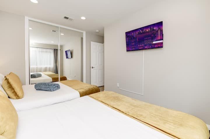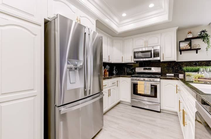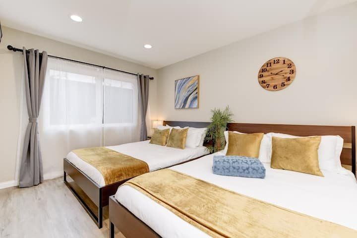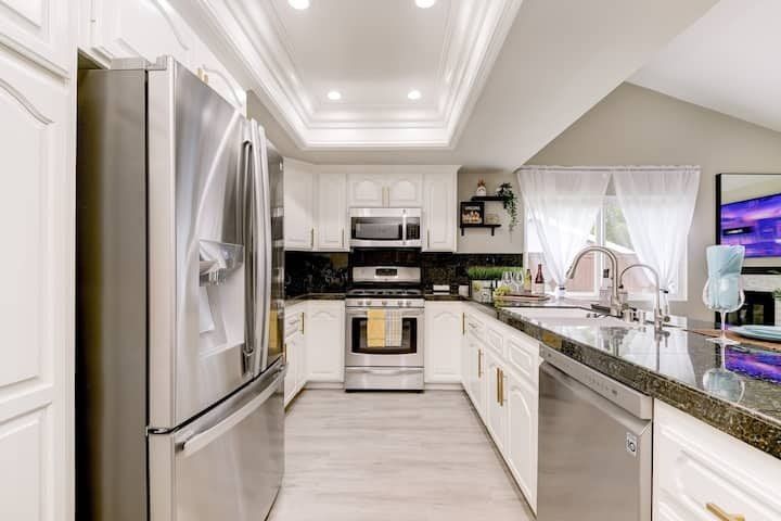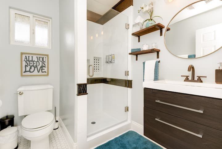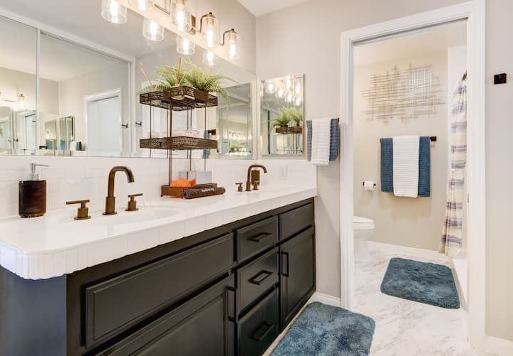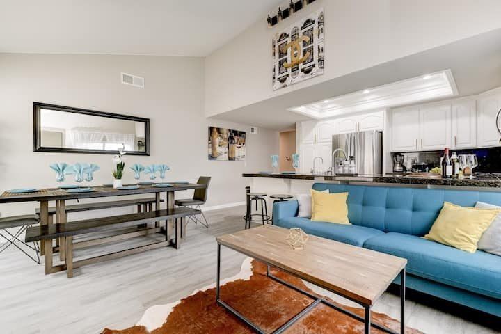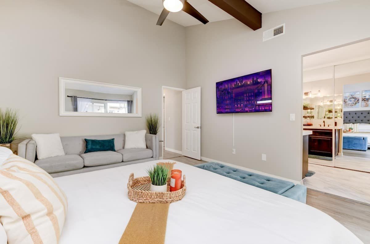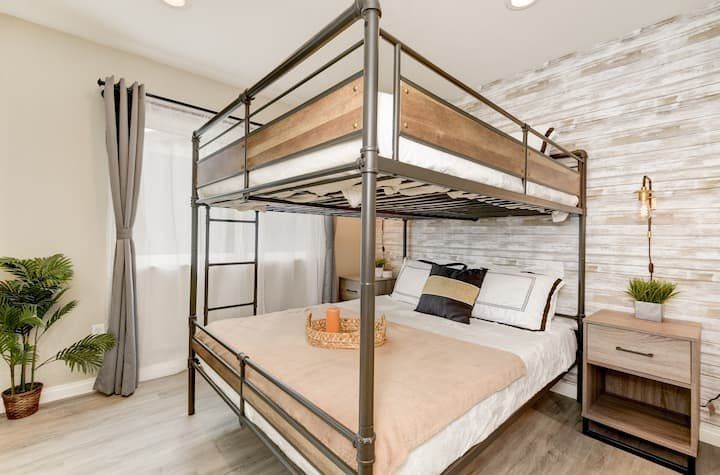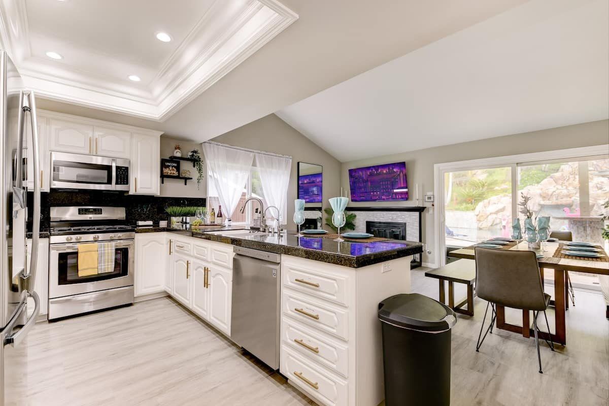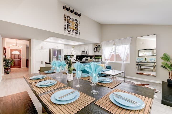Let’s be clear: this is not a fabulous home, with a great backyard, but a fabulous backyard with a great home. Outside stuns with a waterfall pool, a putting green, fire pit, and luxurious, covered barbecue area. With palm trees and a pink flamingo for company, this is your very own cabana club, minus the beach – and the closest one in Carlsbad is only a short drive away. While the party is undoubtedly underway outdoors, there is certainly no sinking feeling when you step inside. Open plan living keeps the summer air flowing throughout its fresh and modern interior, with wide, glass doors helping to merge spaces together. The living area and bunkbed games room open up right onto the terrace, creating one massive entertainment space. One group might be playing giant Jenga on the patio, while another is splashing about in the warm waters of the sunken jacuzzi, or playing a round of golf, even cheering over a game of foosball. Spoilt for choice of activities, this is a home for an incredible, sociable break and adventure without the need to venture beyond your front drive. In the serene San Diego County, where the West Coast sun shines all day, this is one instance, perhaps, where it’s what’s on the outside, not inside, that really counts.