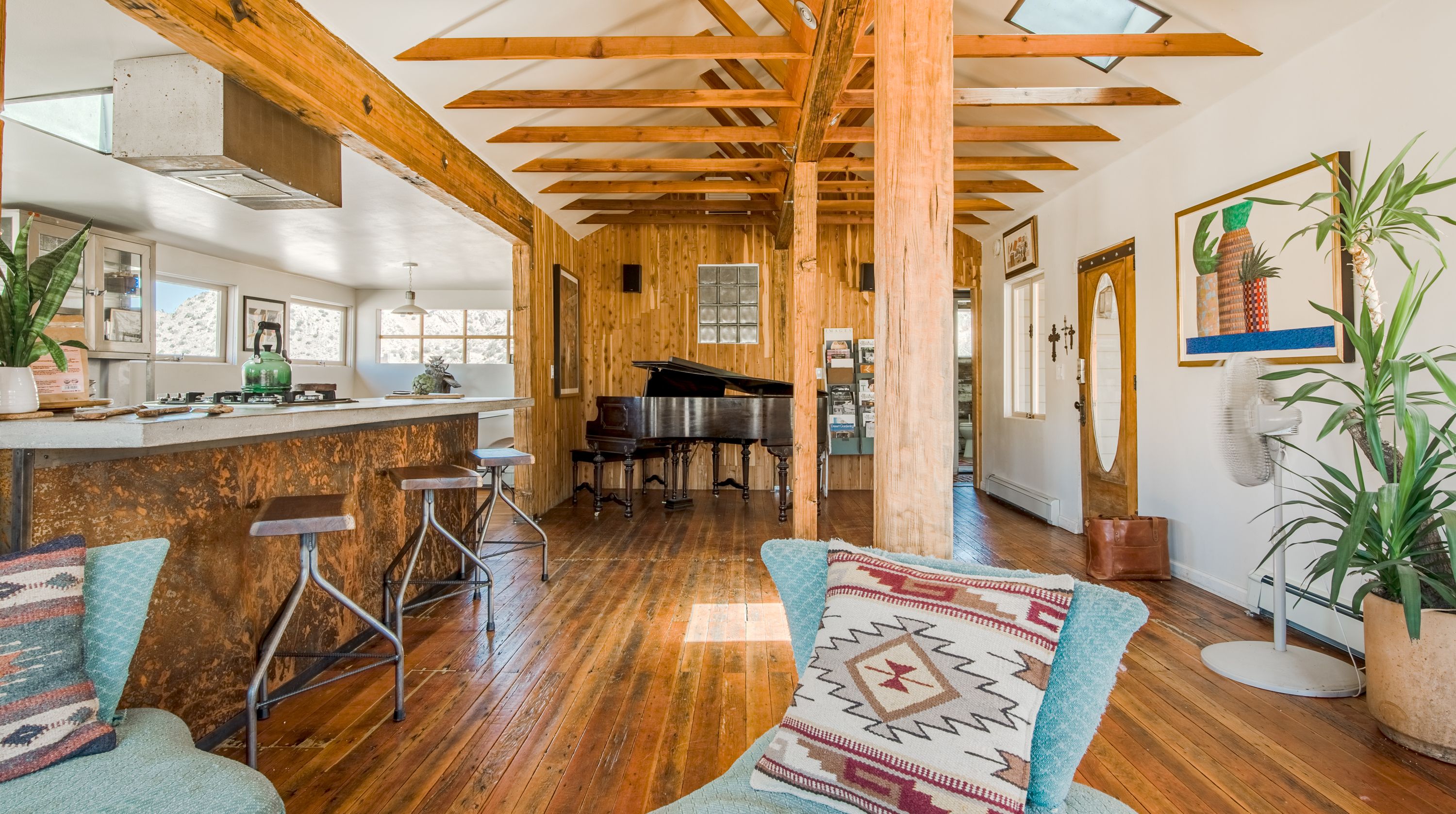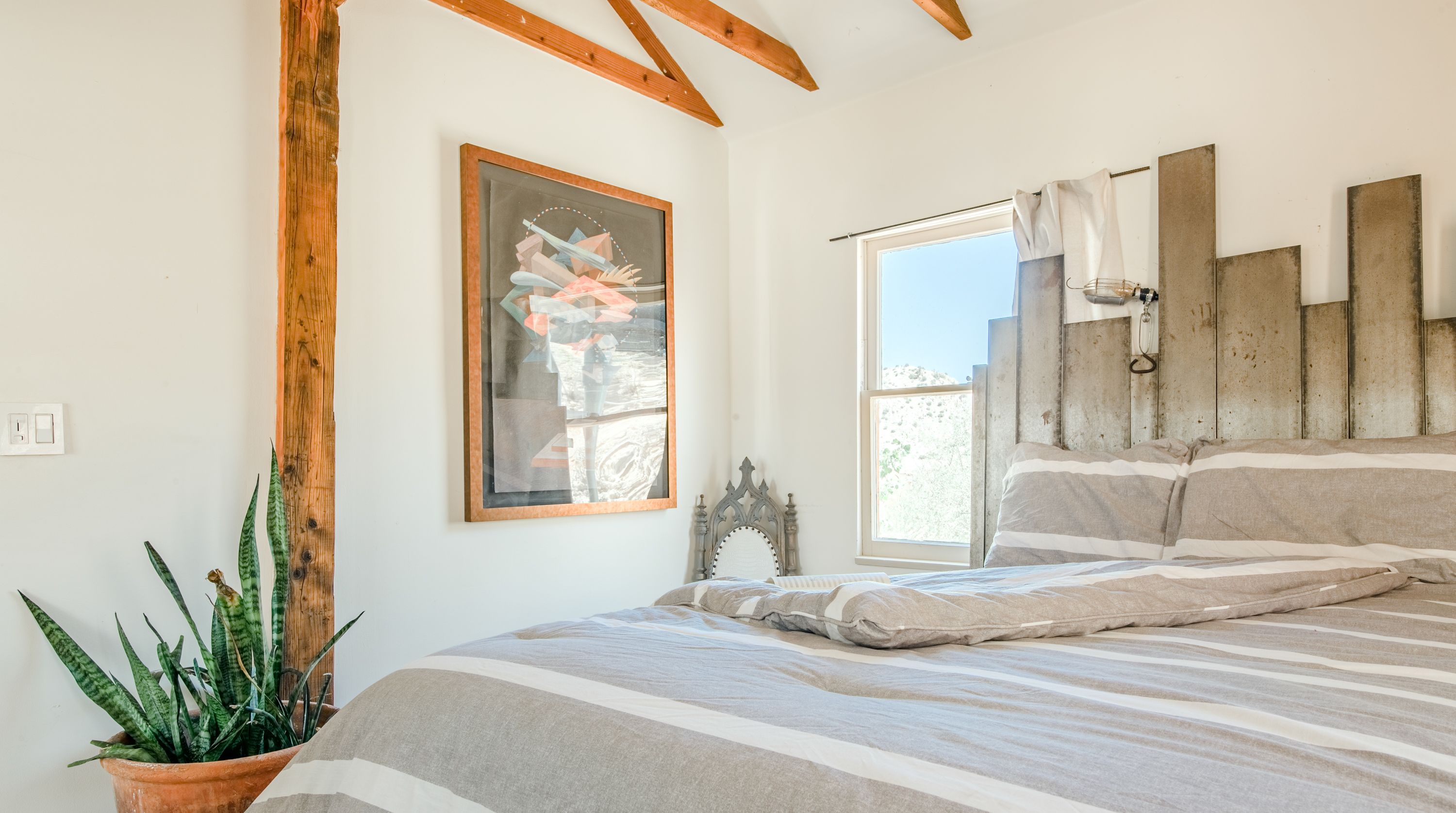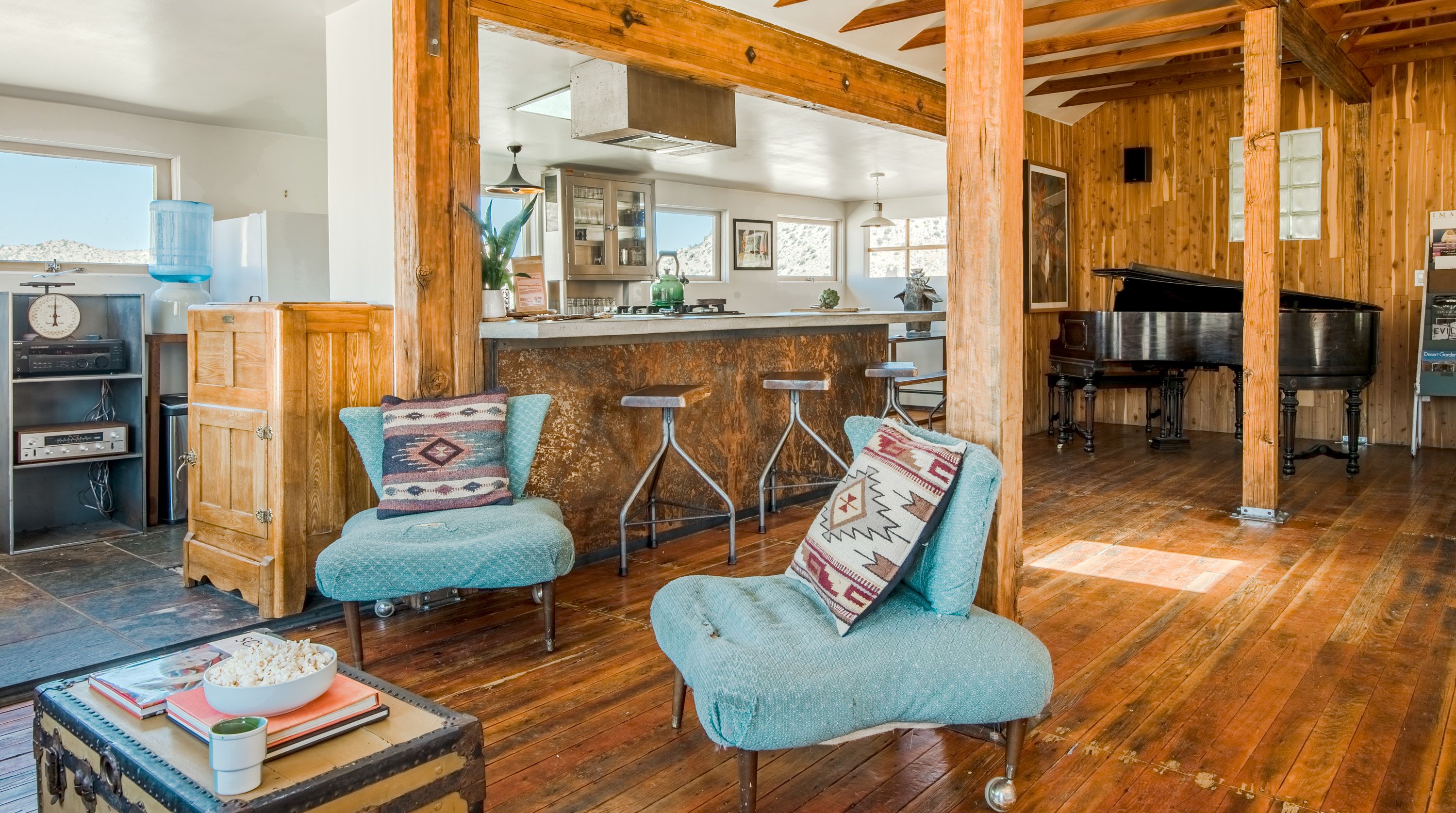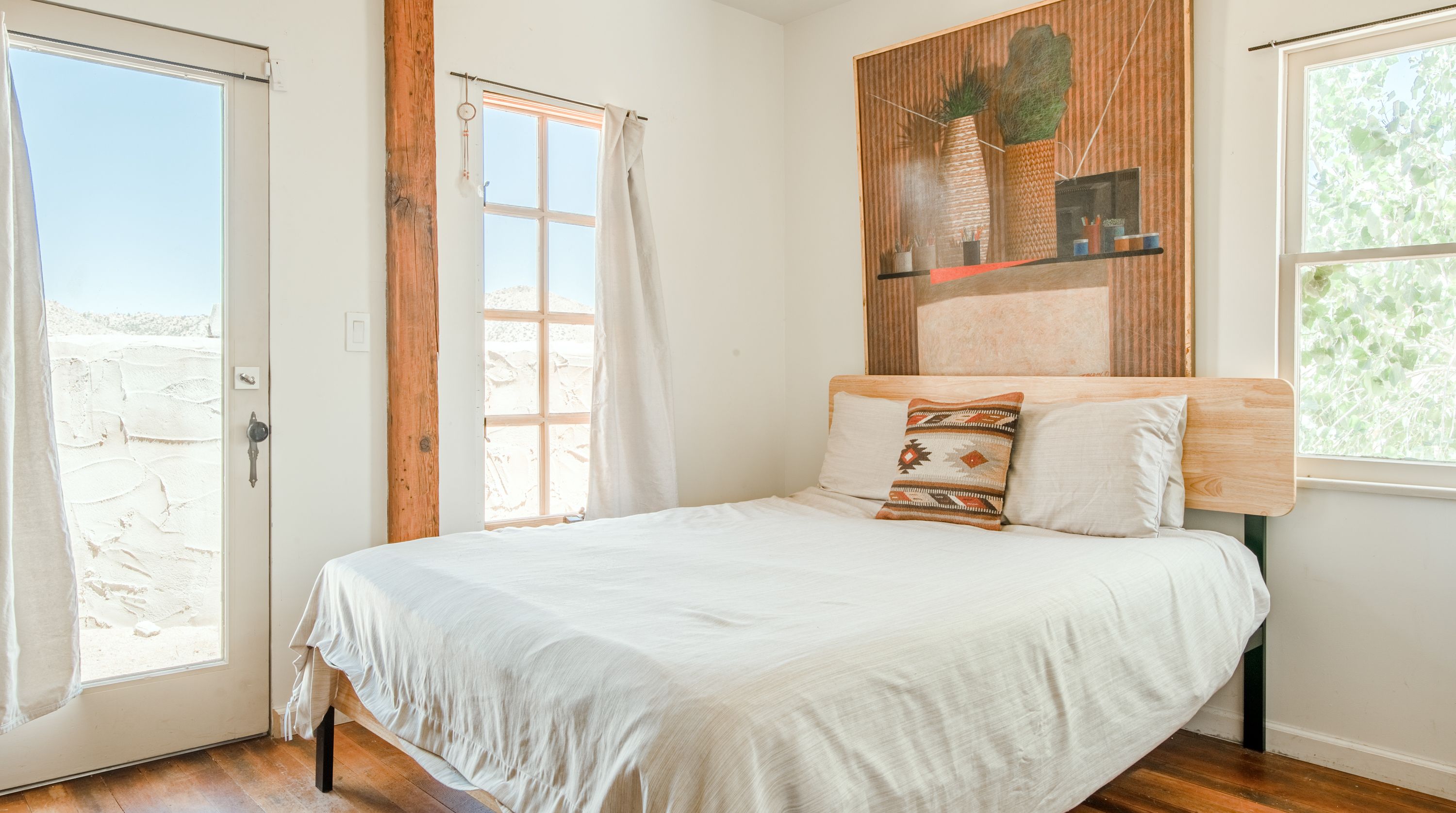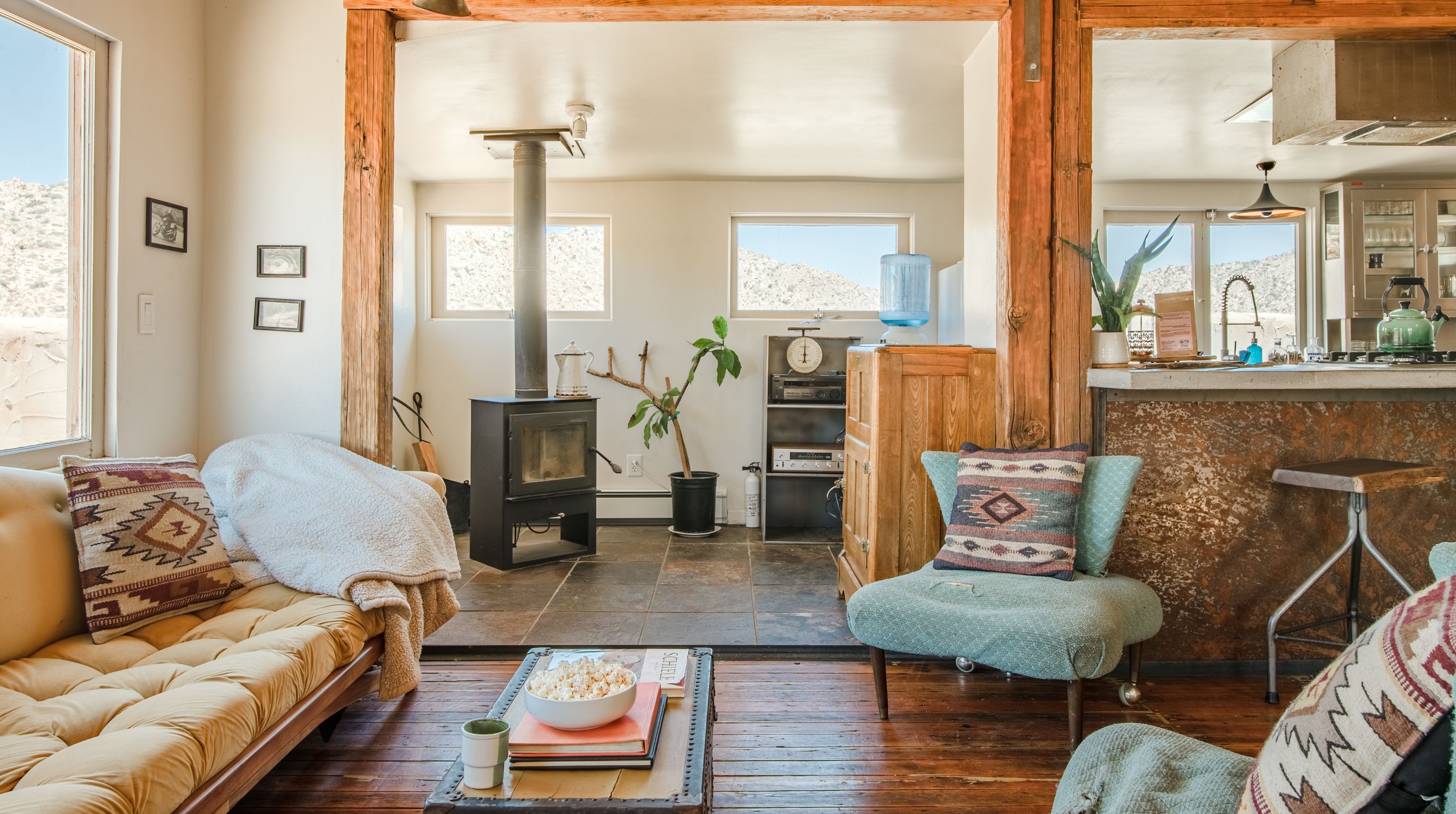 There’s a wood-burning stove to keep you warm on those chill nights, while one of your musically talented friends can play a tune on the grand piano (though there’s also a Bluetooth sound system, for convenience). On the walls, you’ll find original art by the late Gerald Zeldin, and an interior so impressive it was featured in the NY Times fashion section. You can feel the history of this old mining cabin in the wood-beamed ceiling and clapboard (yet modern) bathroom. Picture-frame windows let the sunlight stream into this boho-chic interior and let you gaze out over the endless desert before you.