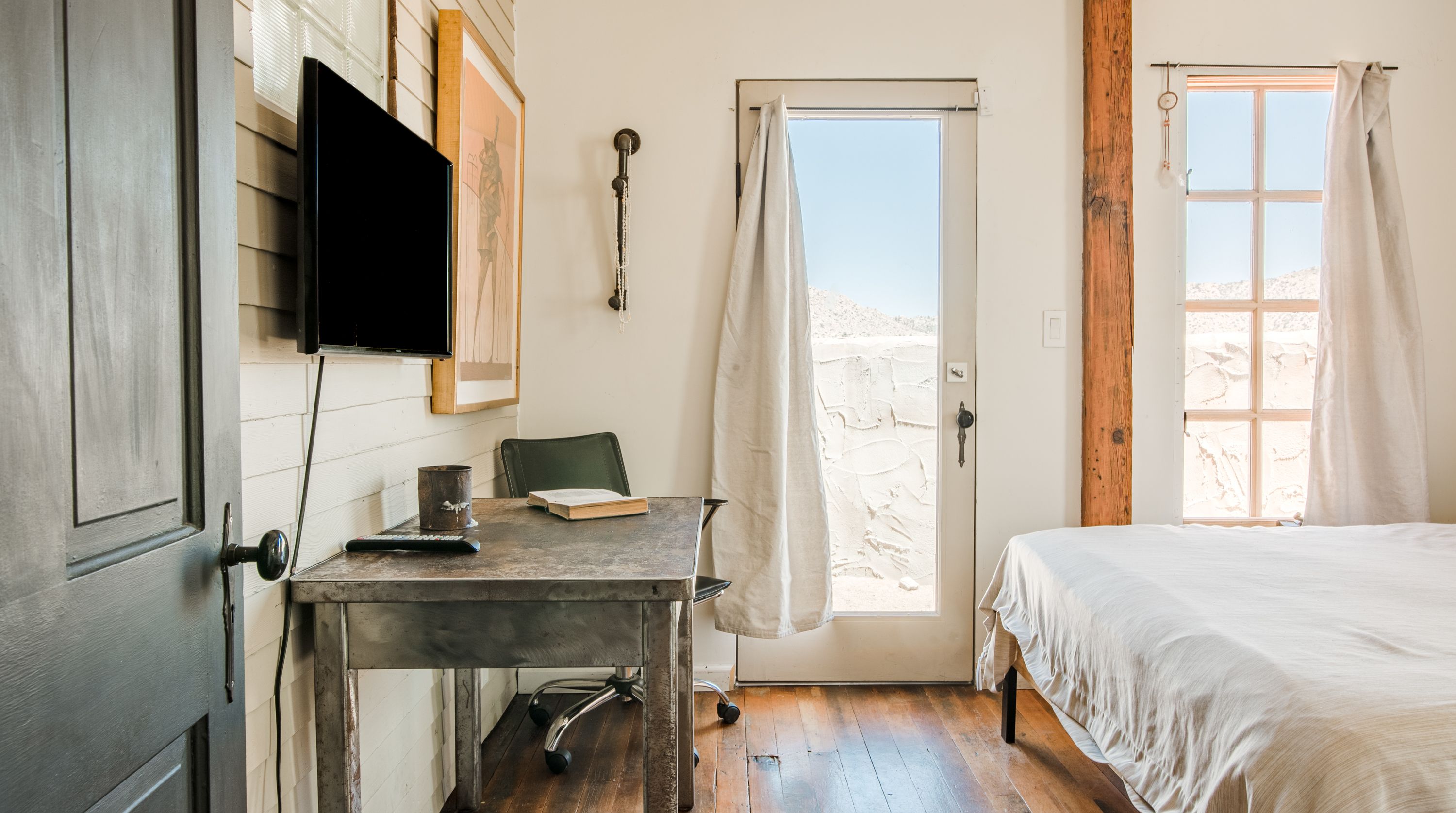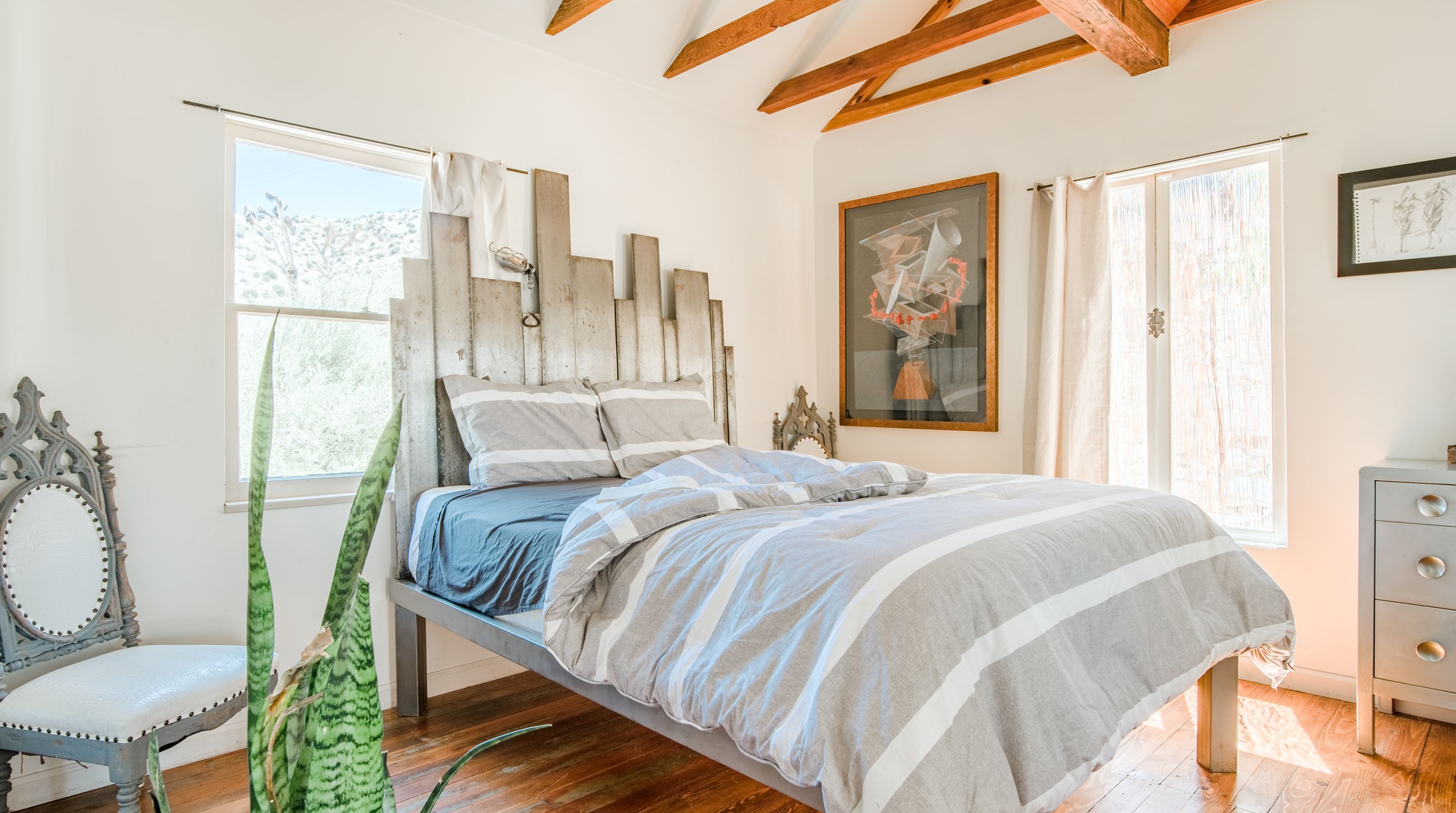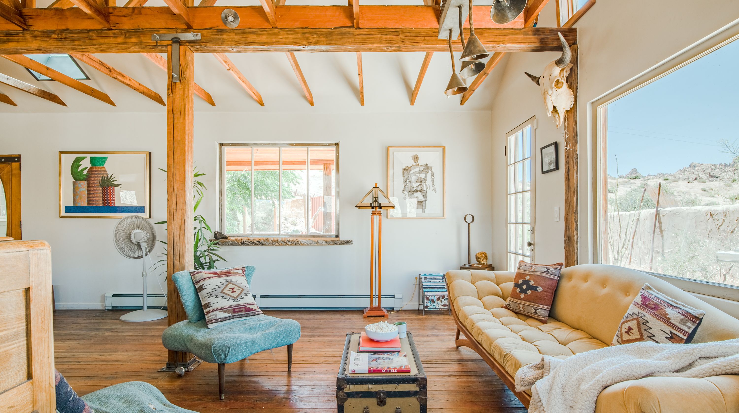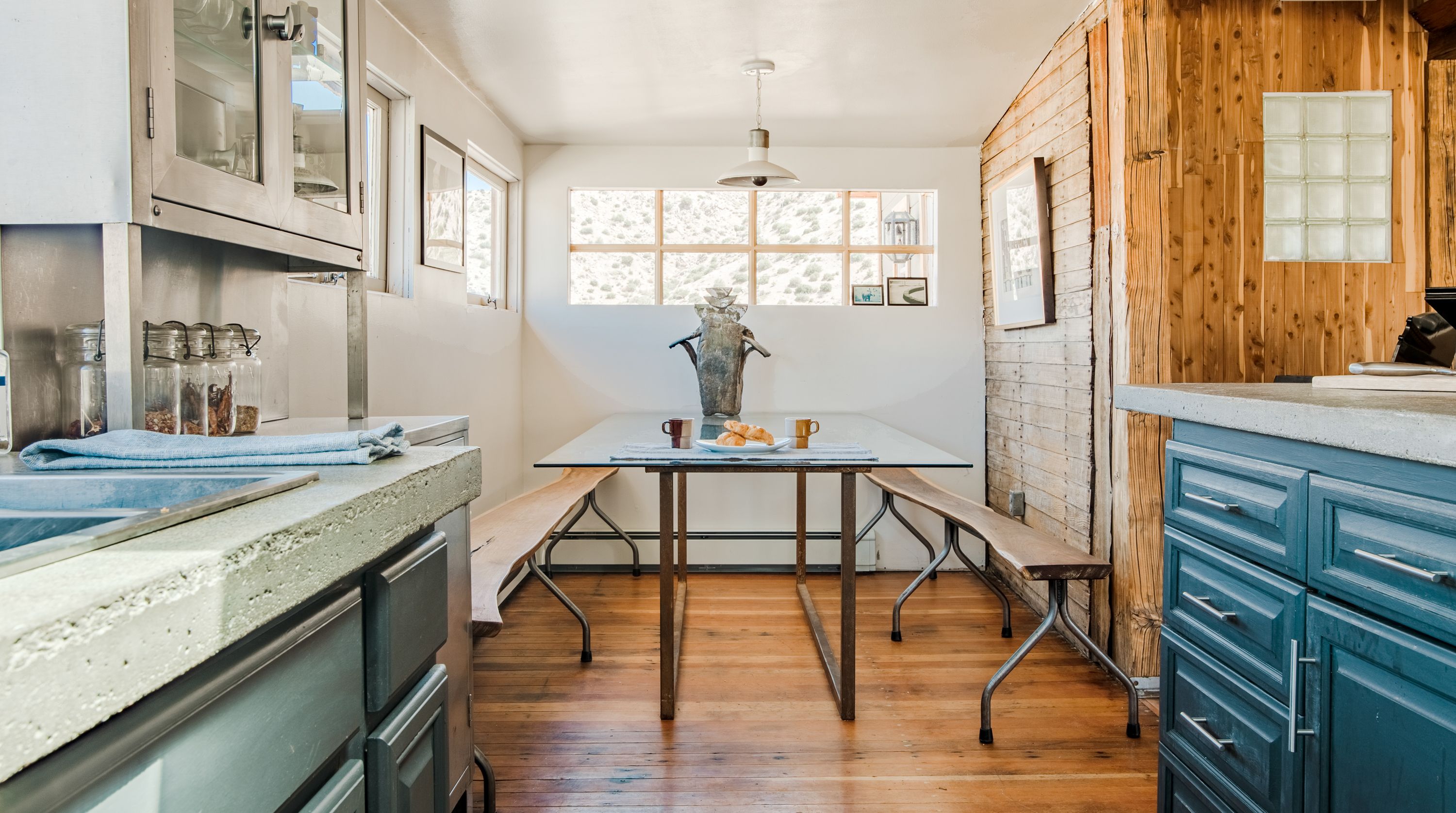 There’s a wood-burning stove to keep you warm on those chill nights, while one of your musically talented friends can play a tune on the grand piano (though there’s also a Bluetooth sound system, for convenience). On the walls, you’ll find original art by the late Gerald Zeldin, and an interior so impressive it was featured in the NY Times fashion section. You can feel the history of this old mining cabin in the wood-beamed ceiling and clapboard (yet modern) bathroom. Picture-frame windows let the sunlight stream into this boho-chic interior and let you gaze out over the endless desert before you.