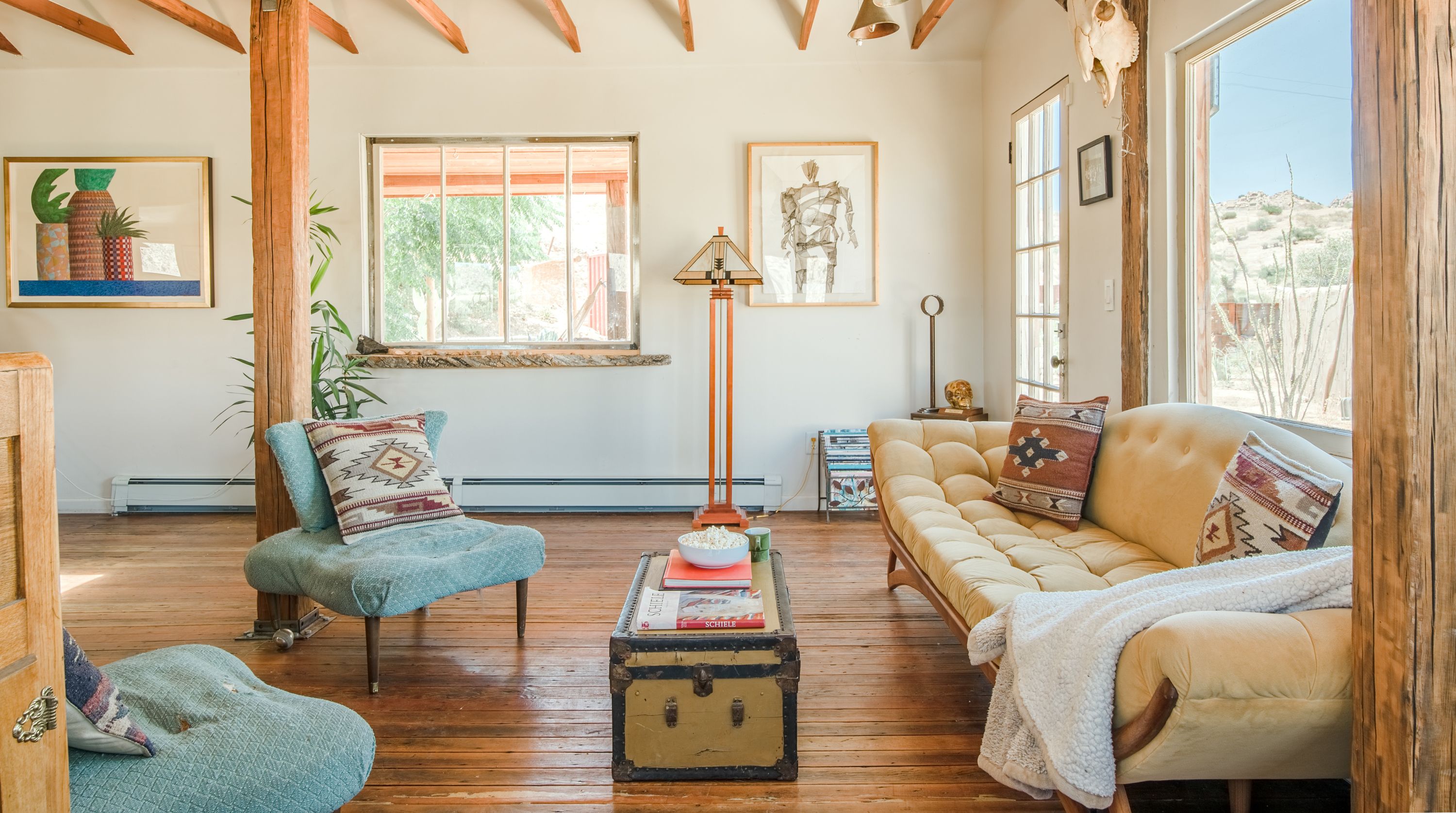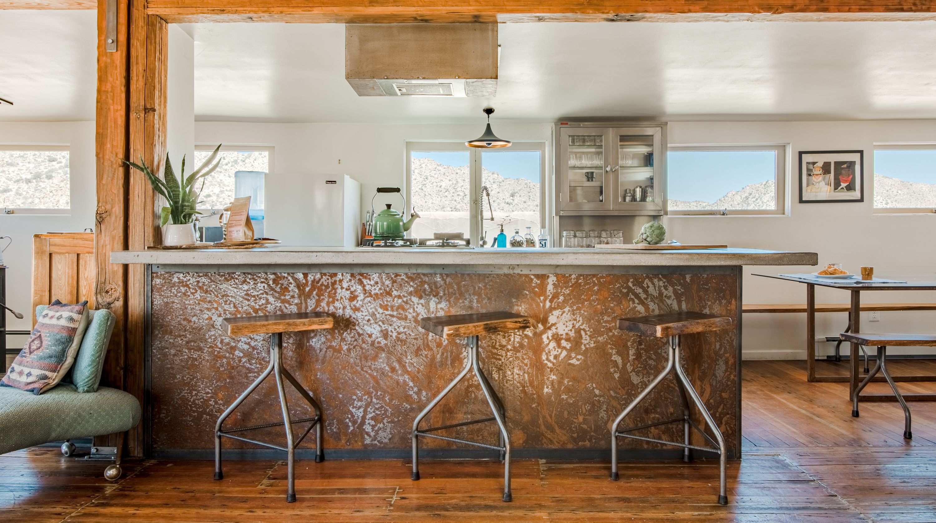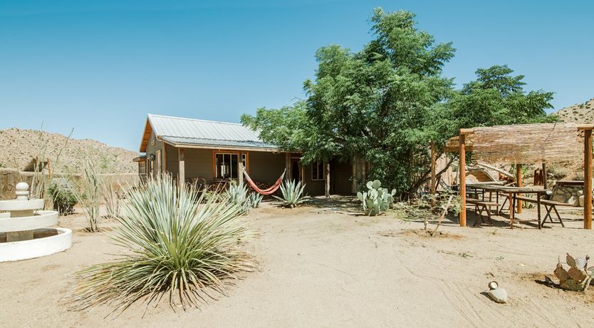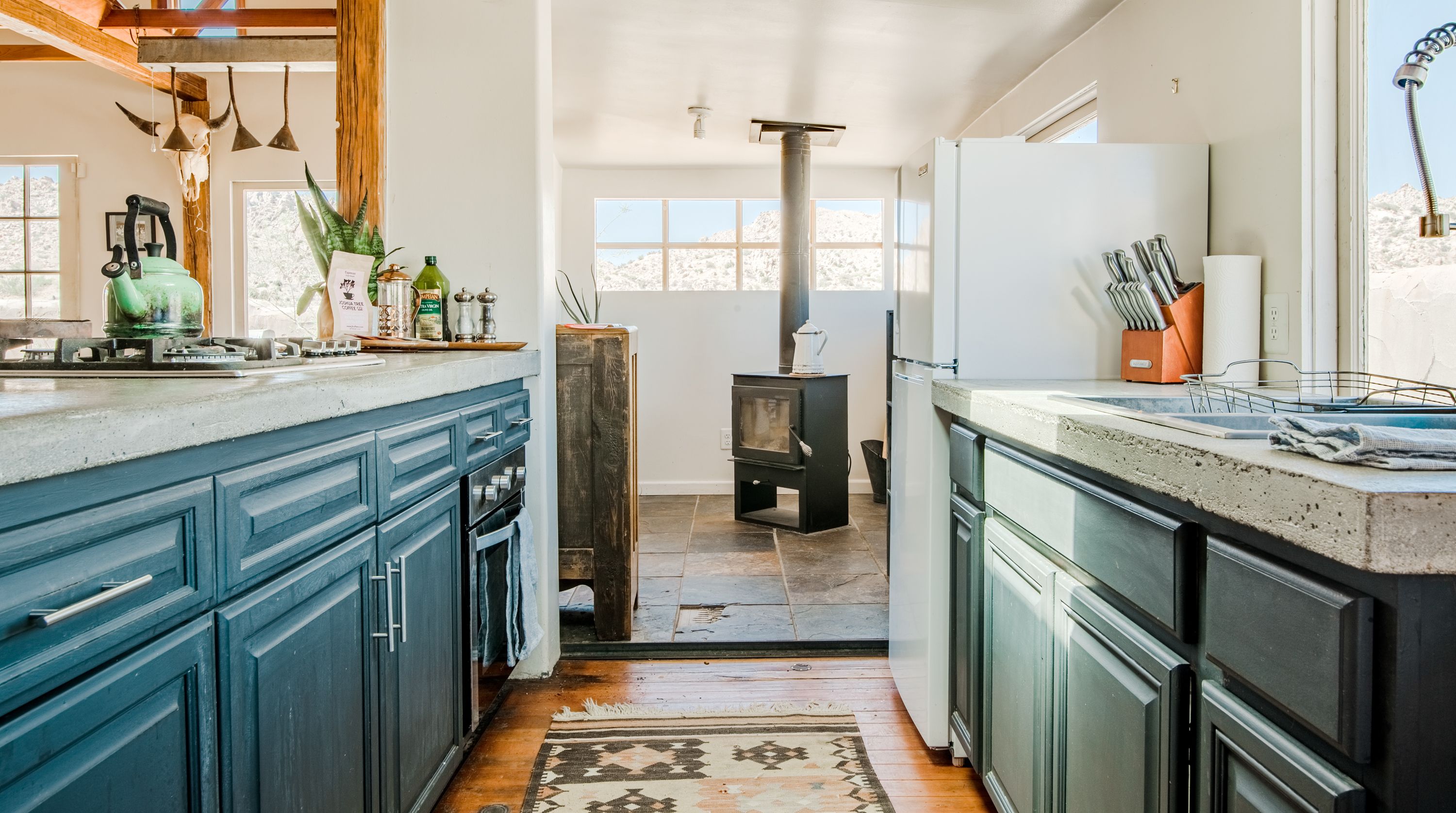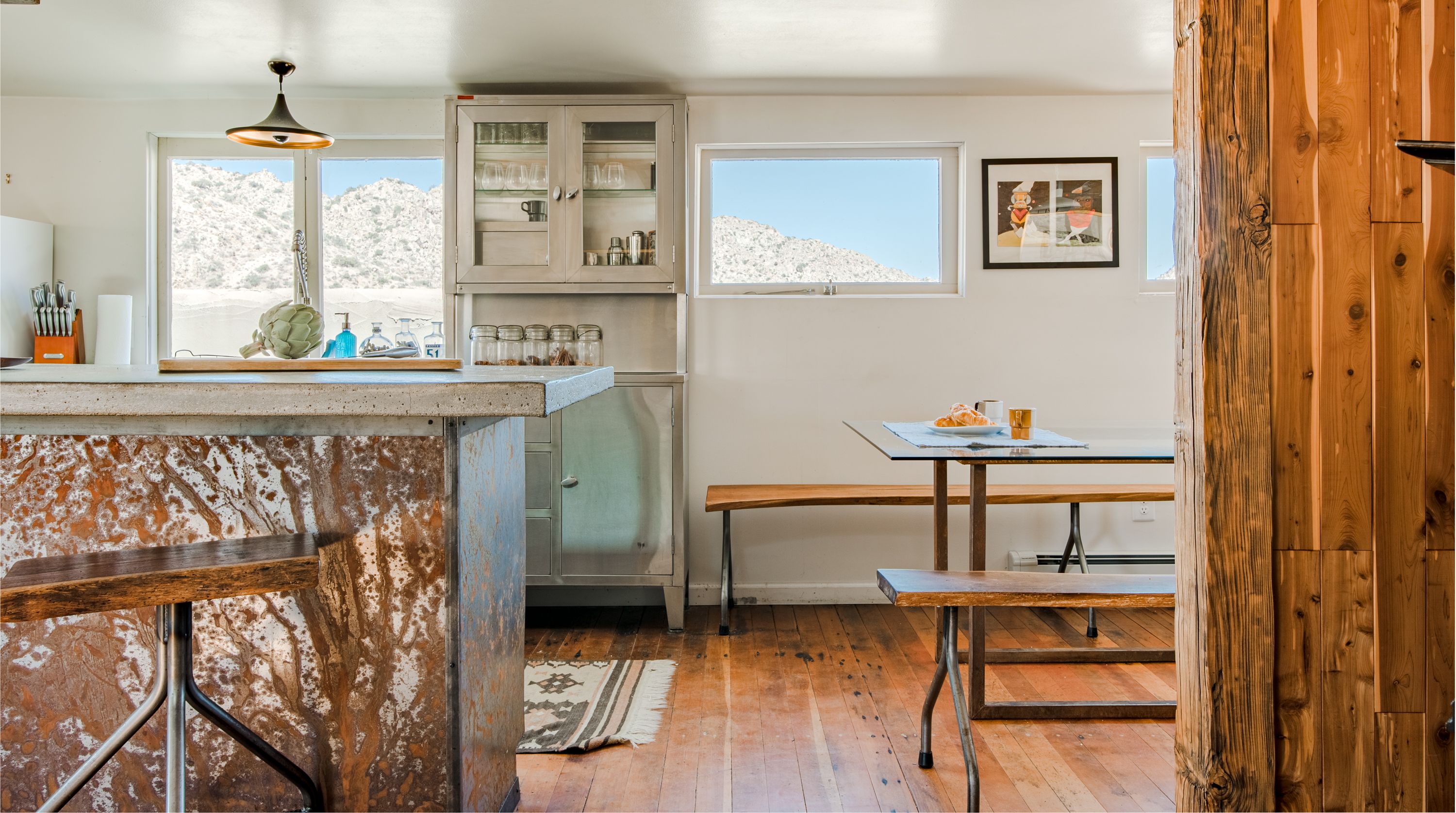There’s a wood-burning stove to keep you warm on those chill nights, while one of your musically talented friends can play a tune on the grand piano (though there’s also a Bluetooth sound system, for convenience). On the walls, you’ll find original art by the late Gerald Zeldin, and an interior so impressive it was featured in the NY Times fashion section. You can feel the history of this old mining cabin in the wood-beamed ceiling and clapboard (yet modern) bathroom. Picture-frame windows let the sunlight stream into this boho-chic interior and let you gaze out over the endless desert before you.
